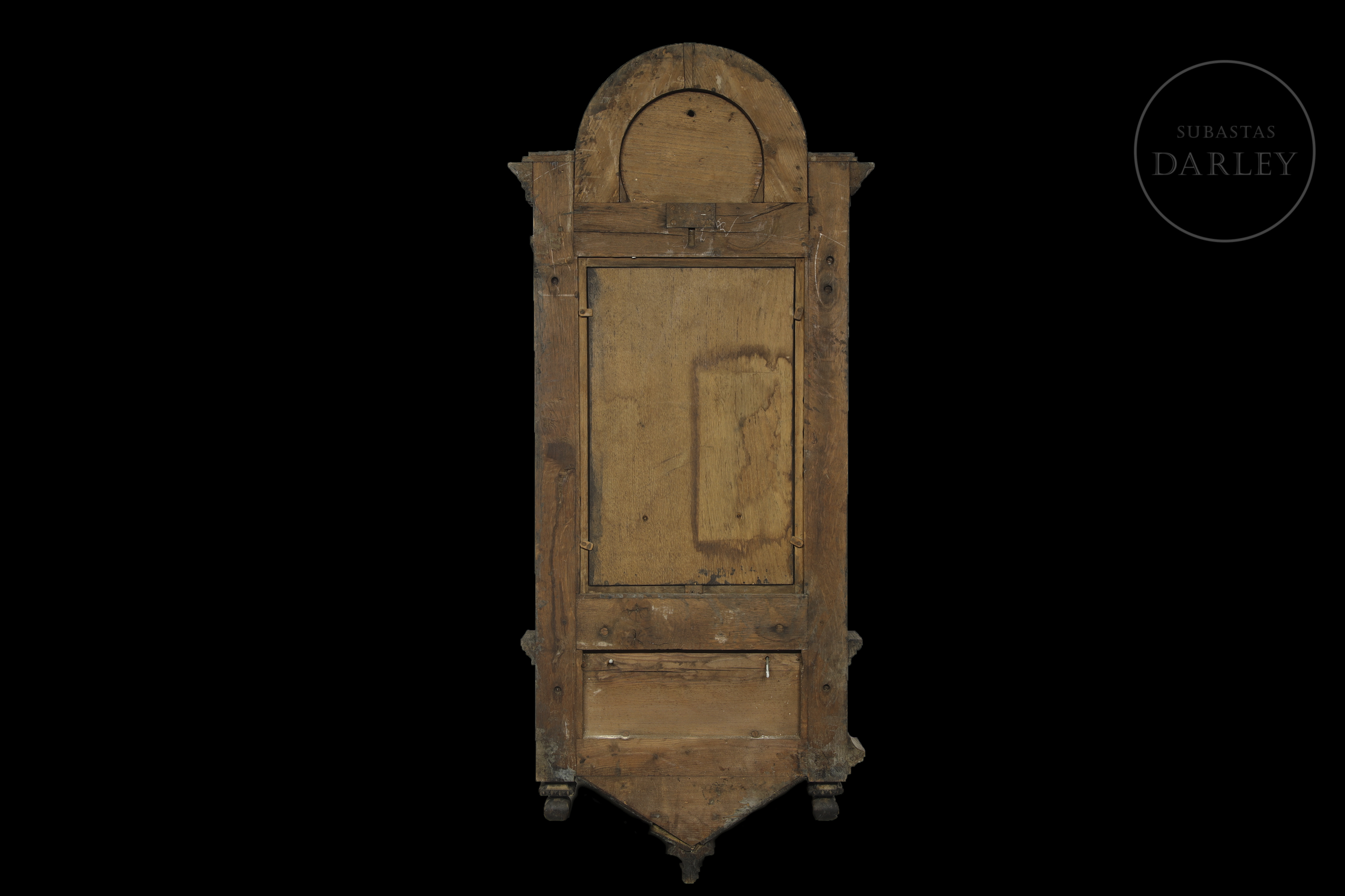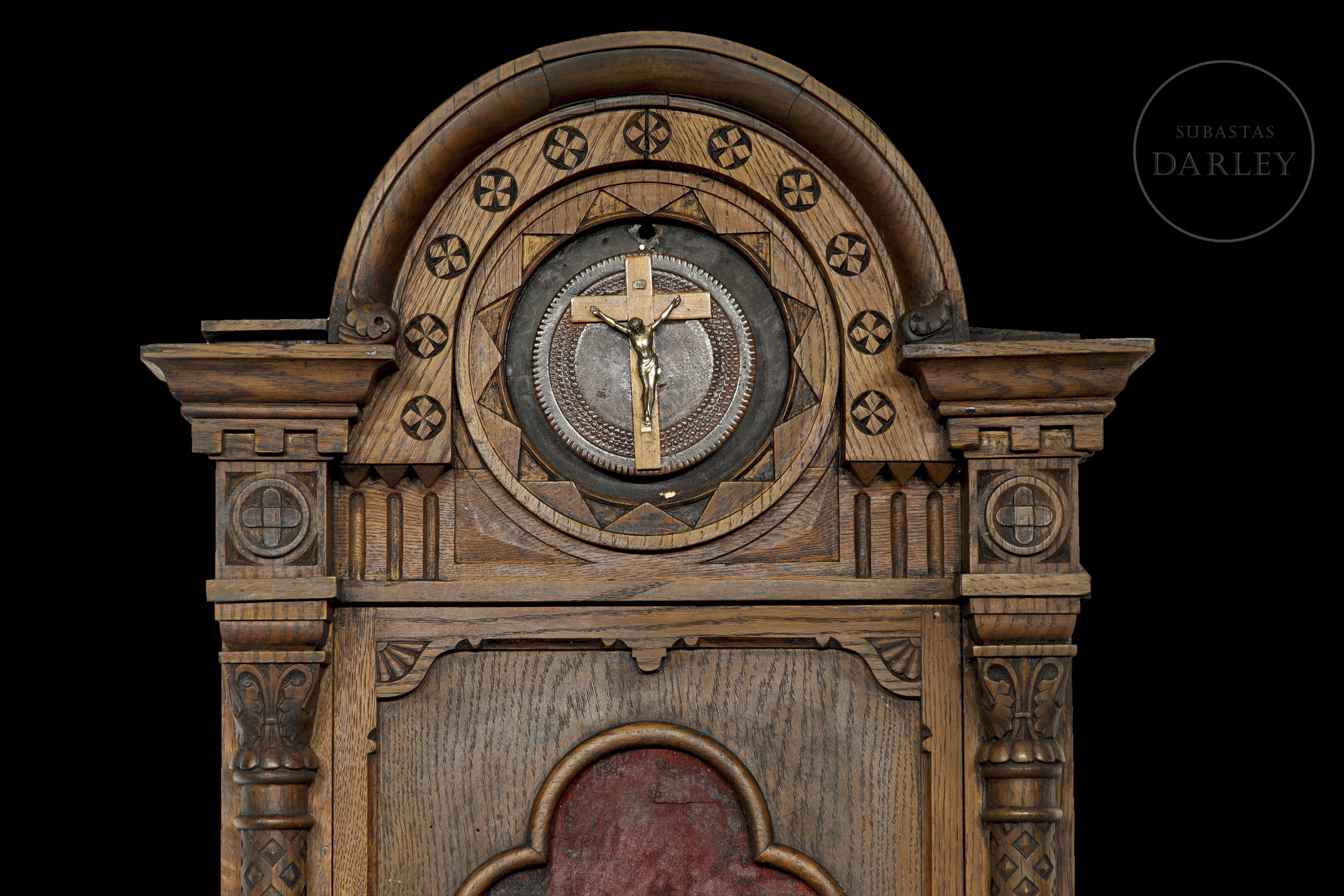 La parte superior se remata con un arco de medio punto decorado con una sucesión de motivos circulares tallados. En el centro, se distingue un medallón de madera sobre el que se dispone la segunda representación de Cristo en la cruz, esta vez en metal dorado.El conjunto presenta un diseño sobrio pero ornamental, característico del trabajo artesanal en madera maciza.