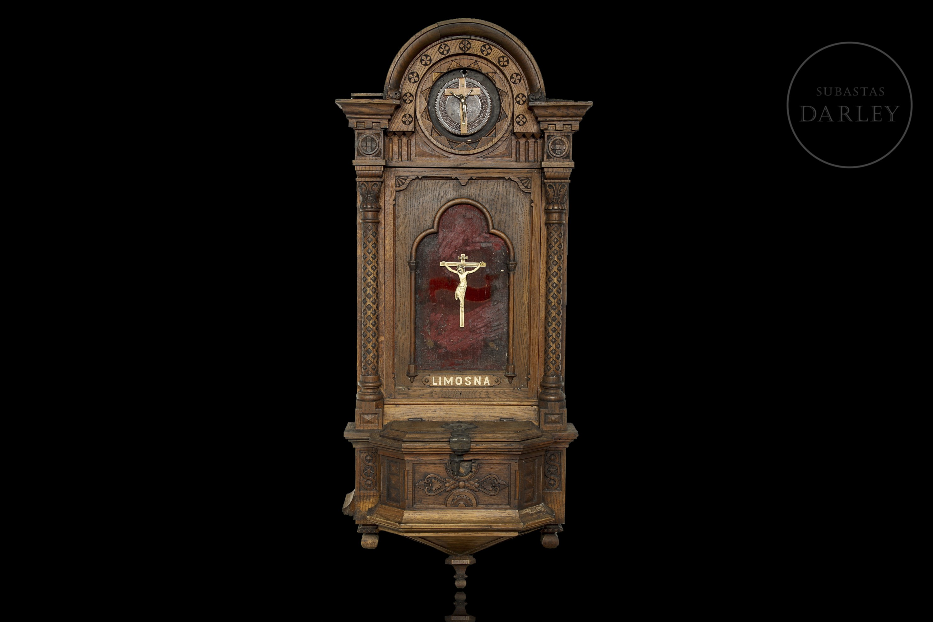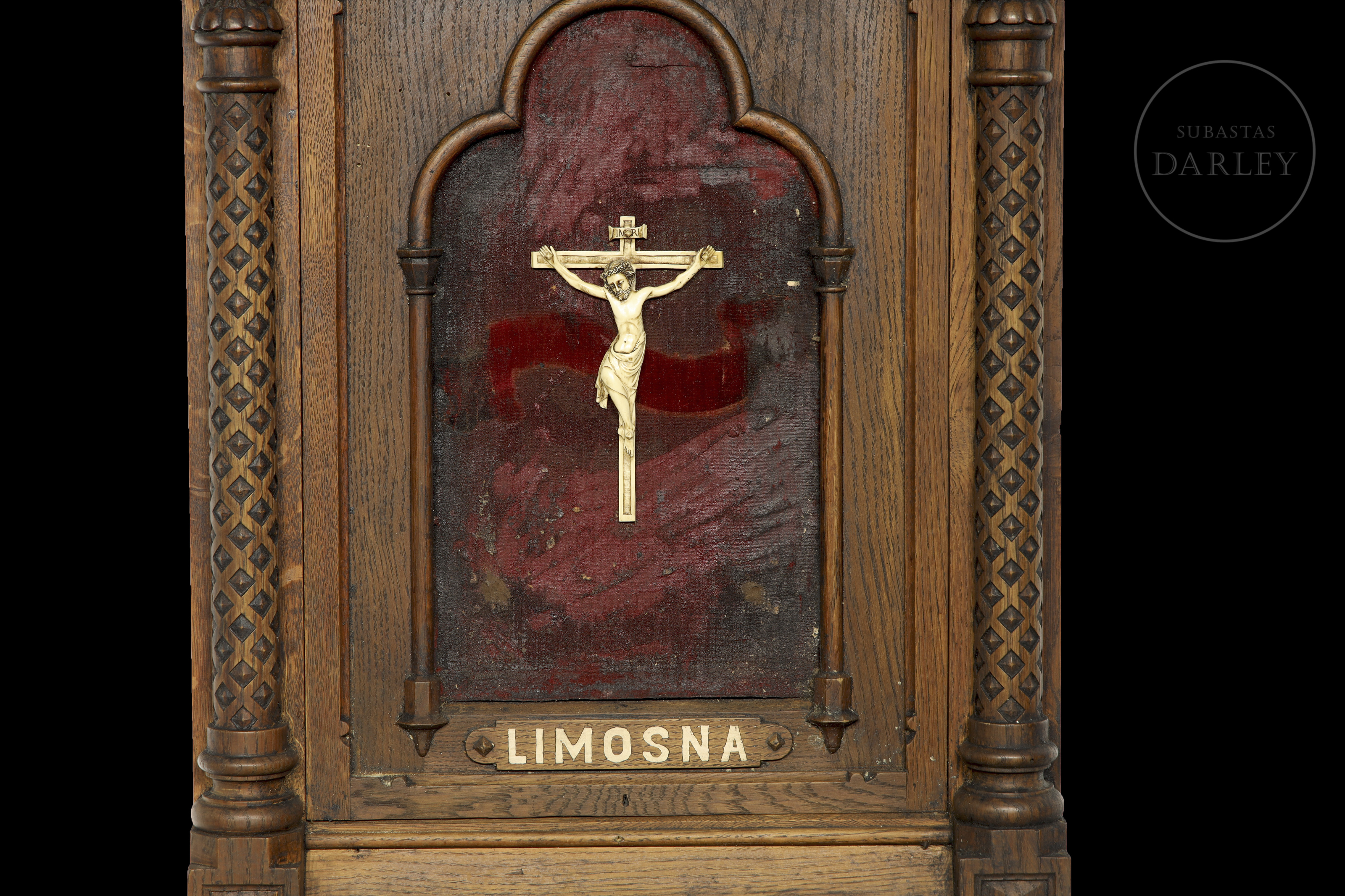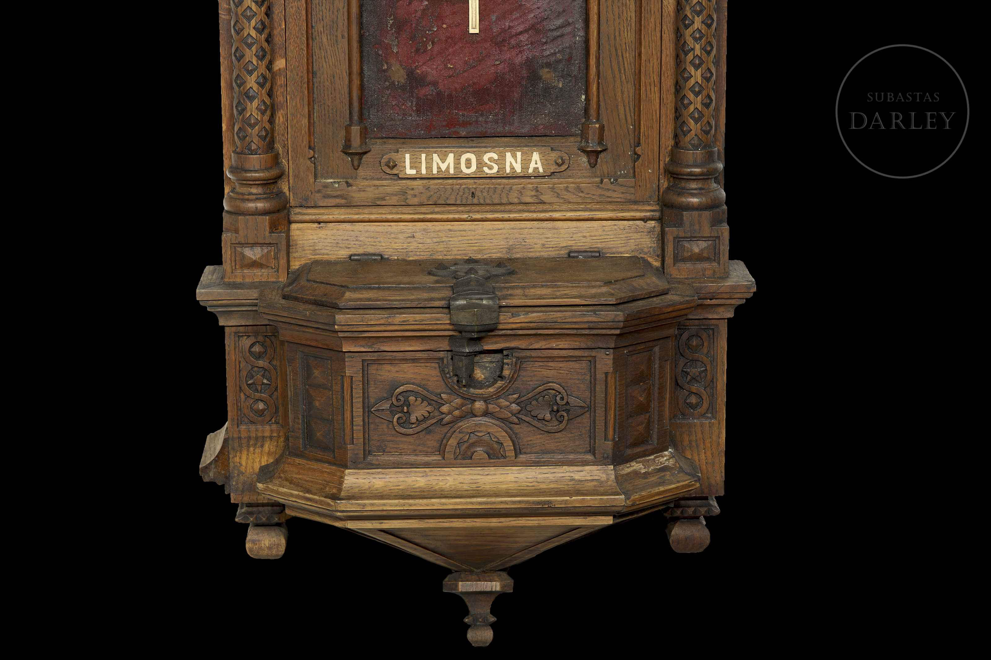 Antiguo recipiente para limosnas con representaciones de Cristo crucificado. La pieza se compone de un recipiente inferior destinado a las donaciones, con una rendija para introducirlas y un sistema de apertura clásico que permite acceder al interior. Sobre esta zona aparece la palabra “Limosna”, pintada sobre madera.