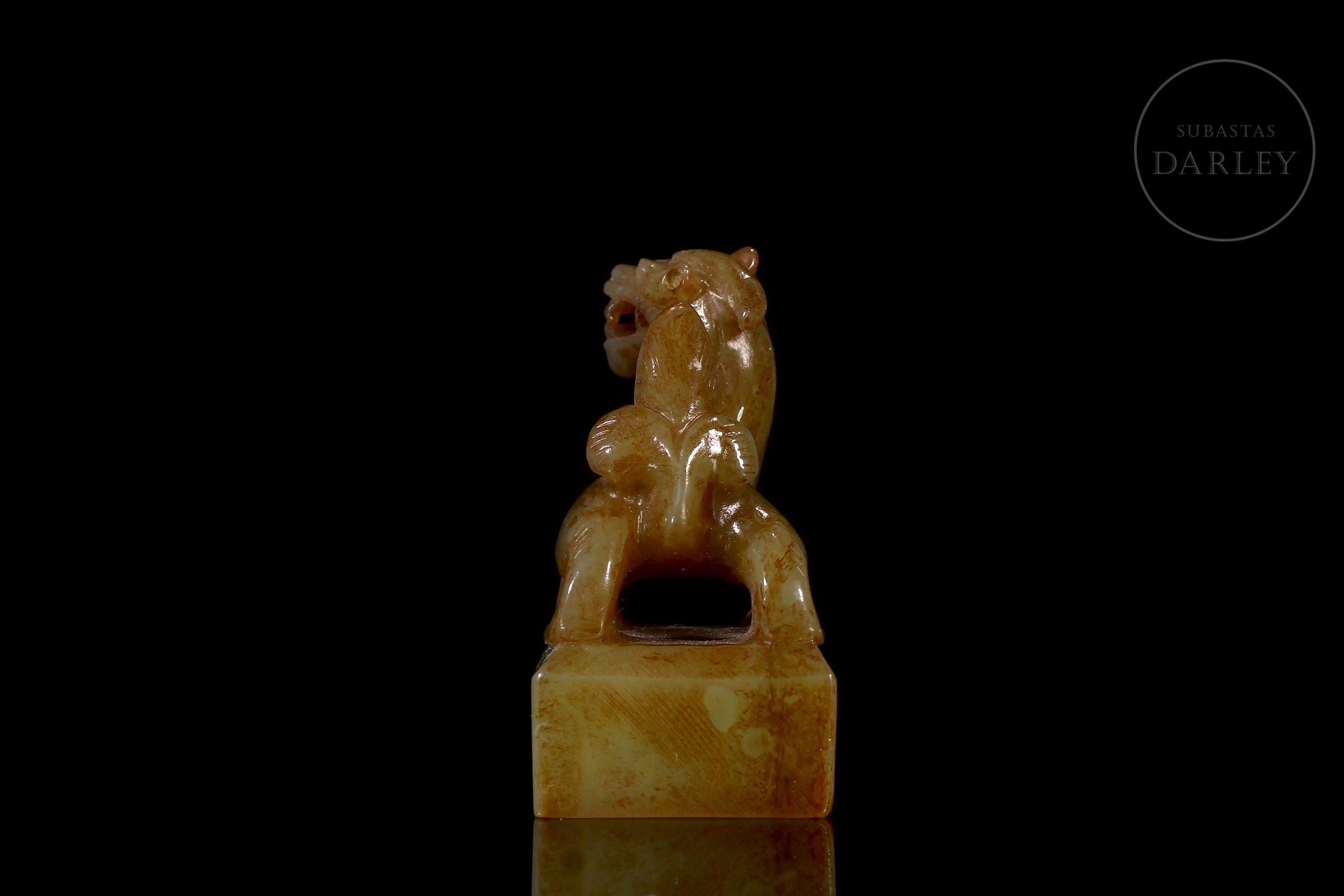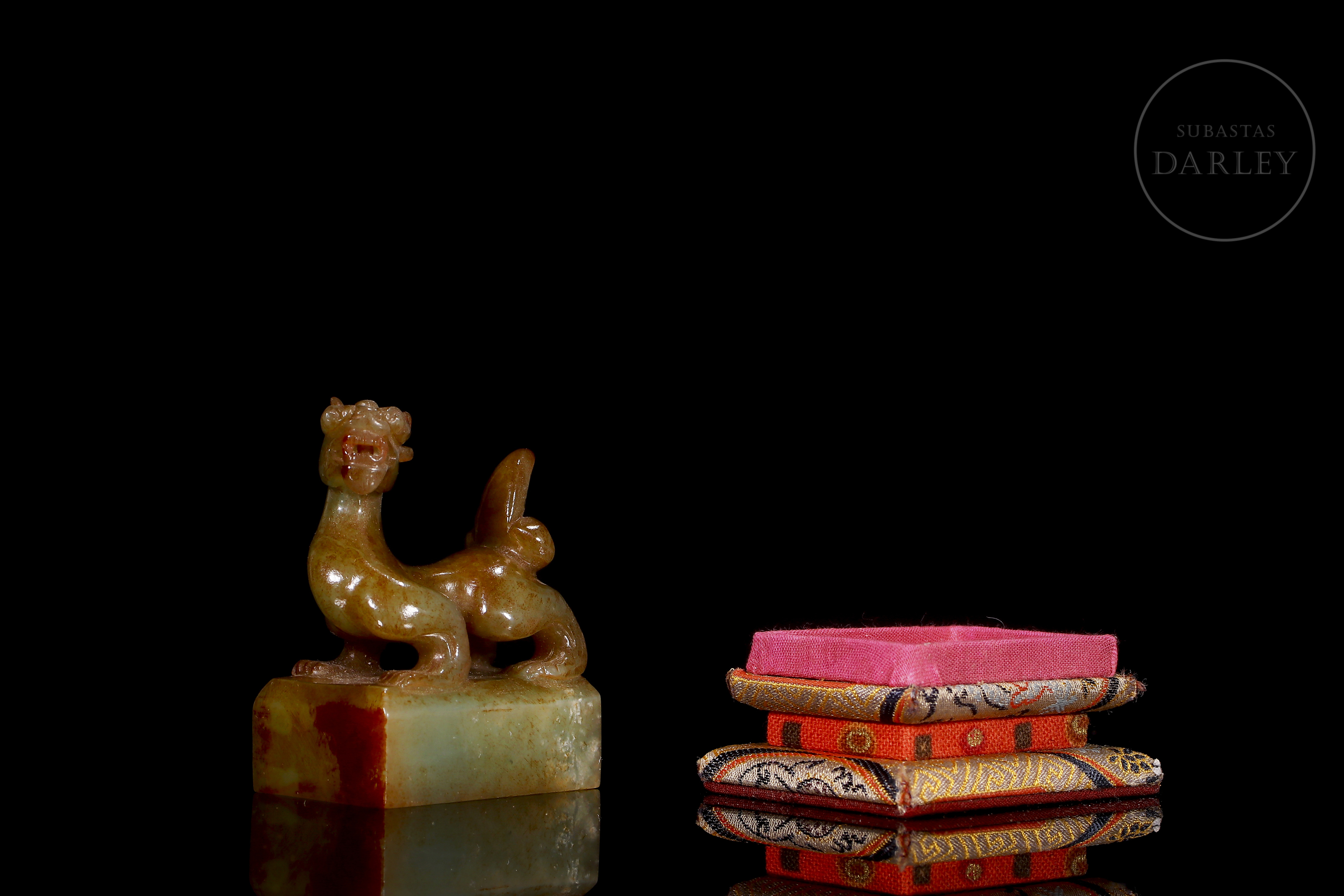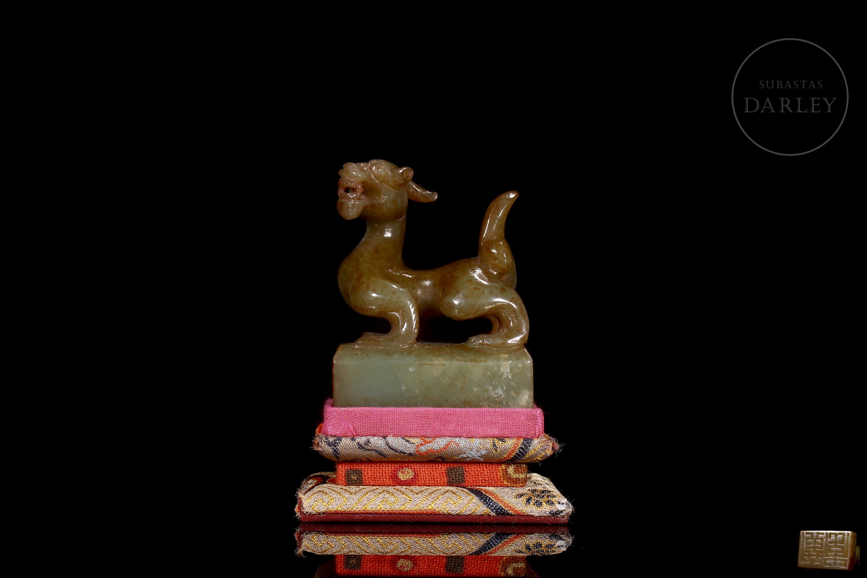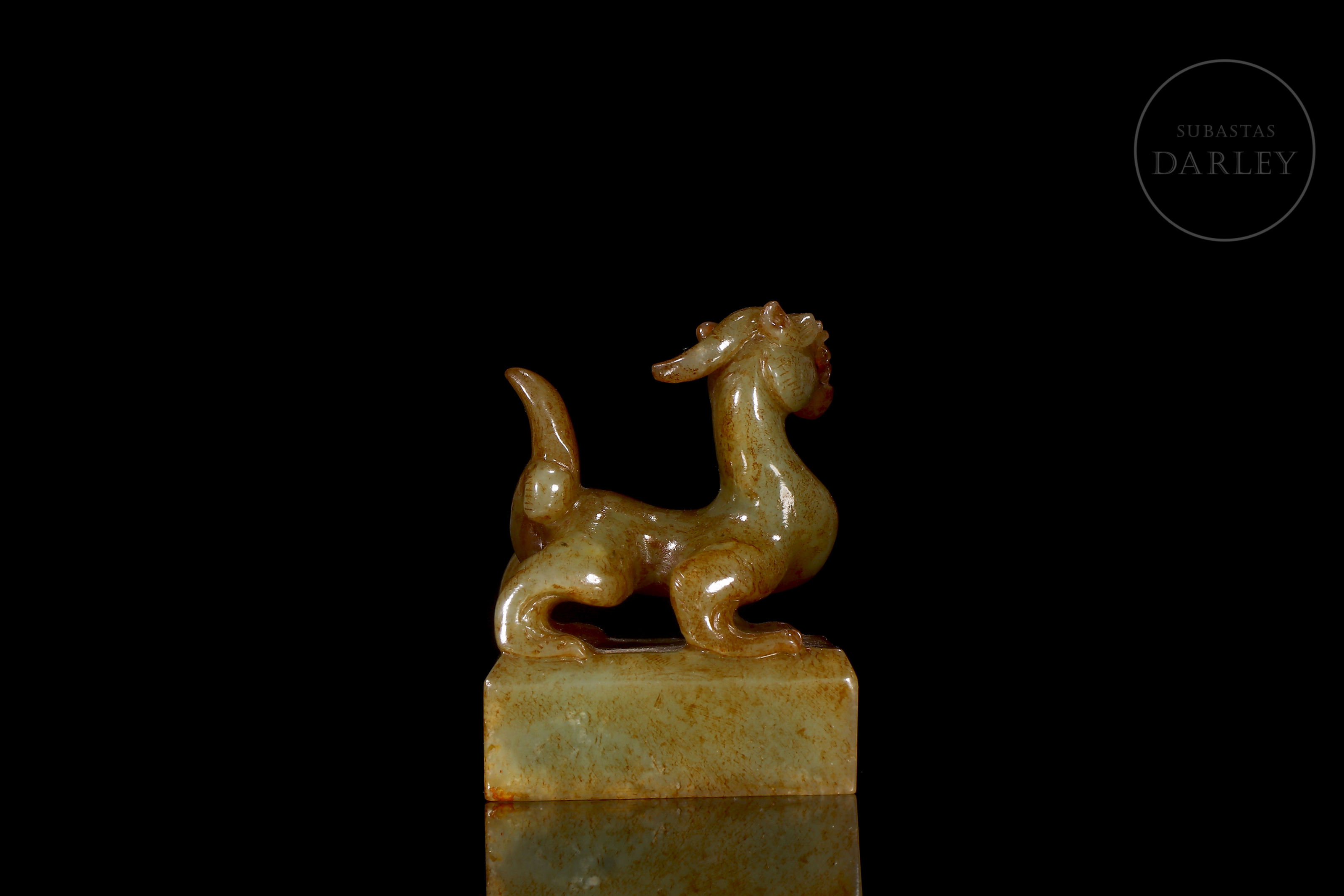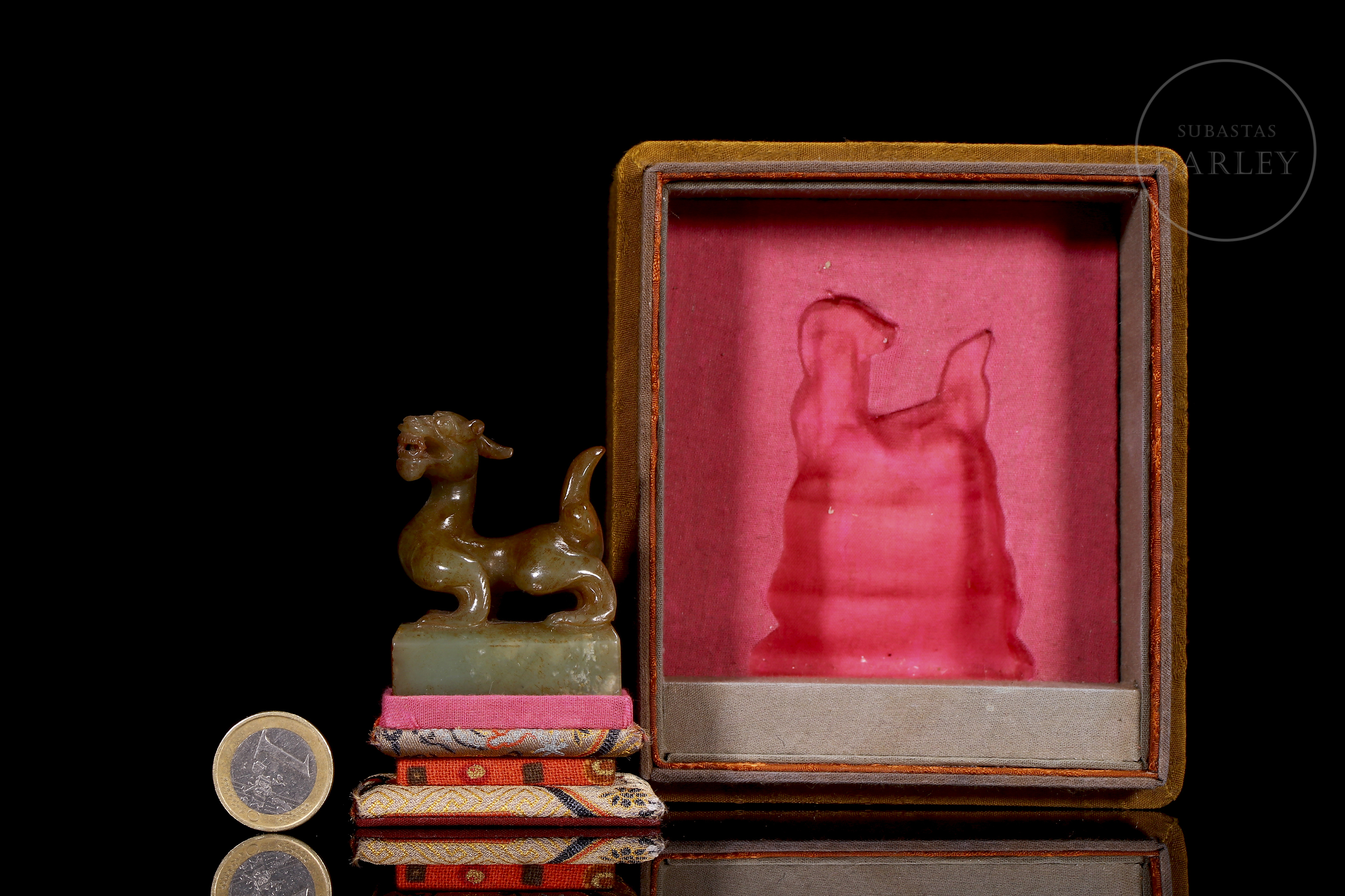 Jade de una tonalidad celadón con áreas marrón rojizo que cubren la superficie. La pieza posee una base rectangular, coronada por la imagen de una criatura mítica. La bestia se dispone erguida, con la cabeza alzada y las fauces abiertas mostrando los afilados colmillos. La musculatura y el pelaje se muestran detallados mediante finas líneas incisas. La base posee caracteres incisos para su uso como sello. Se acompaña de una peana y una caja a medida forradas con tejidos tradicionales. Dinastía Qing (1644–1911).