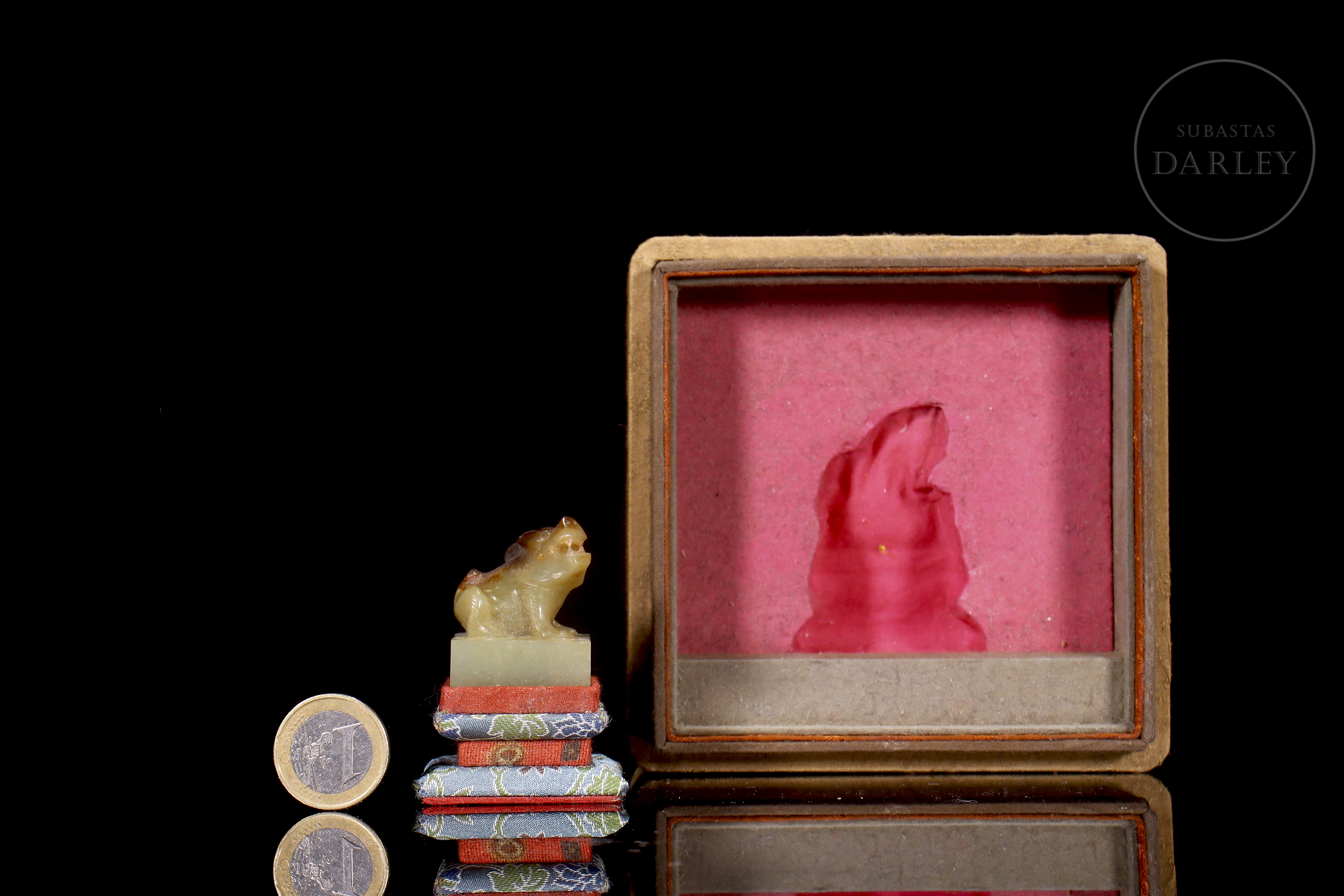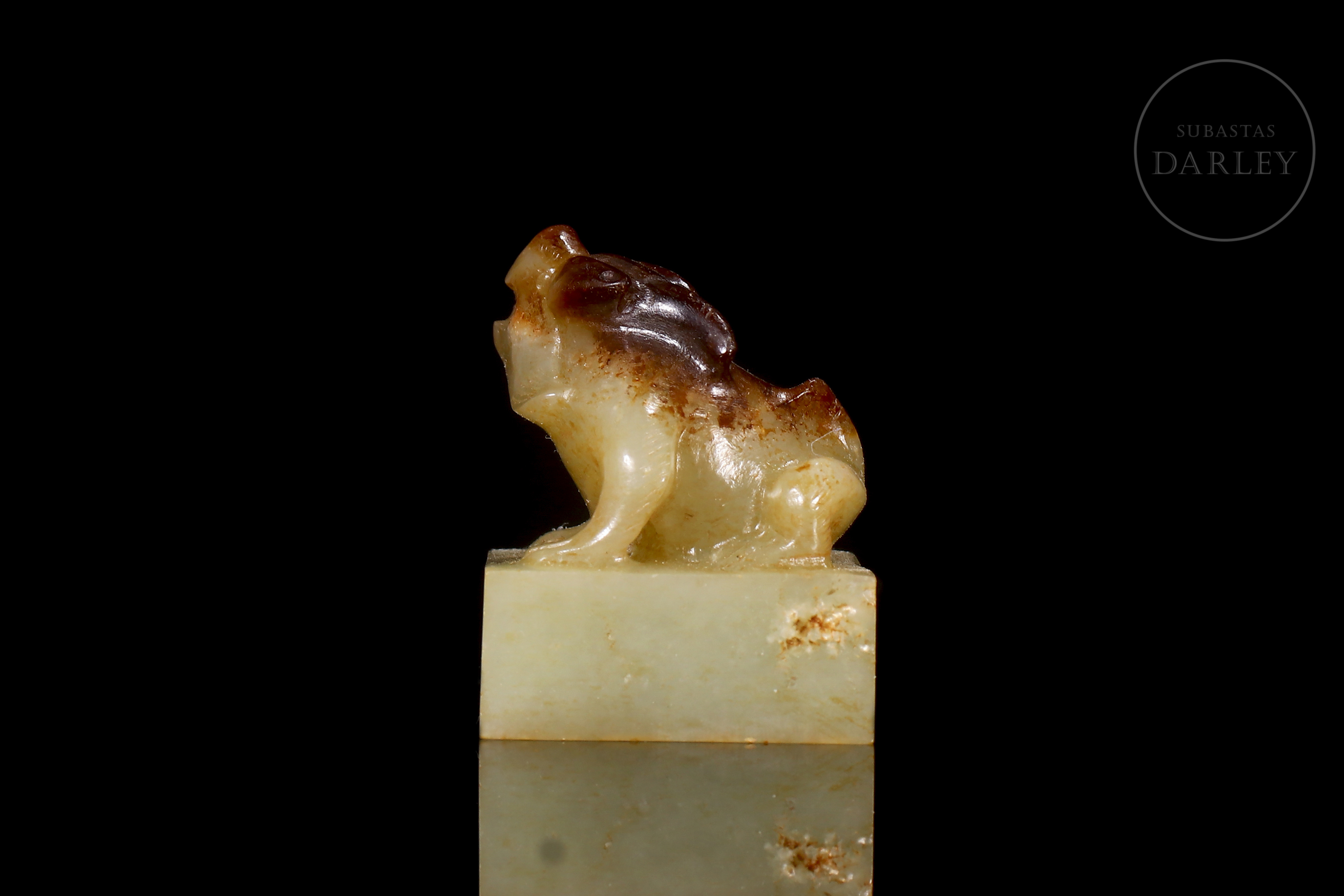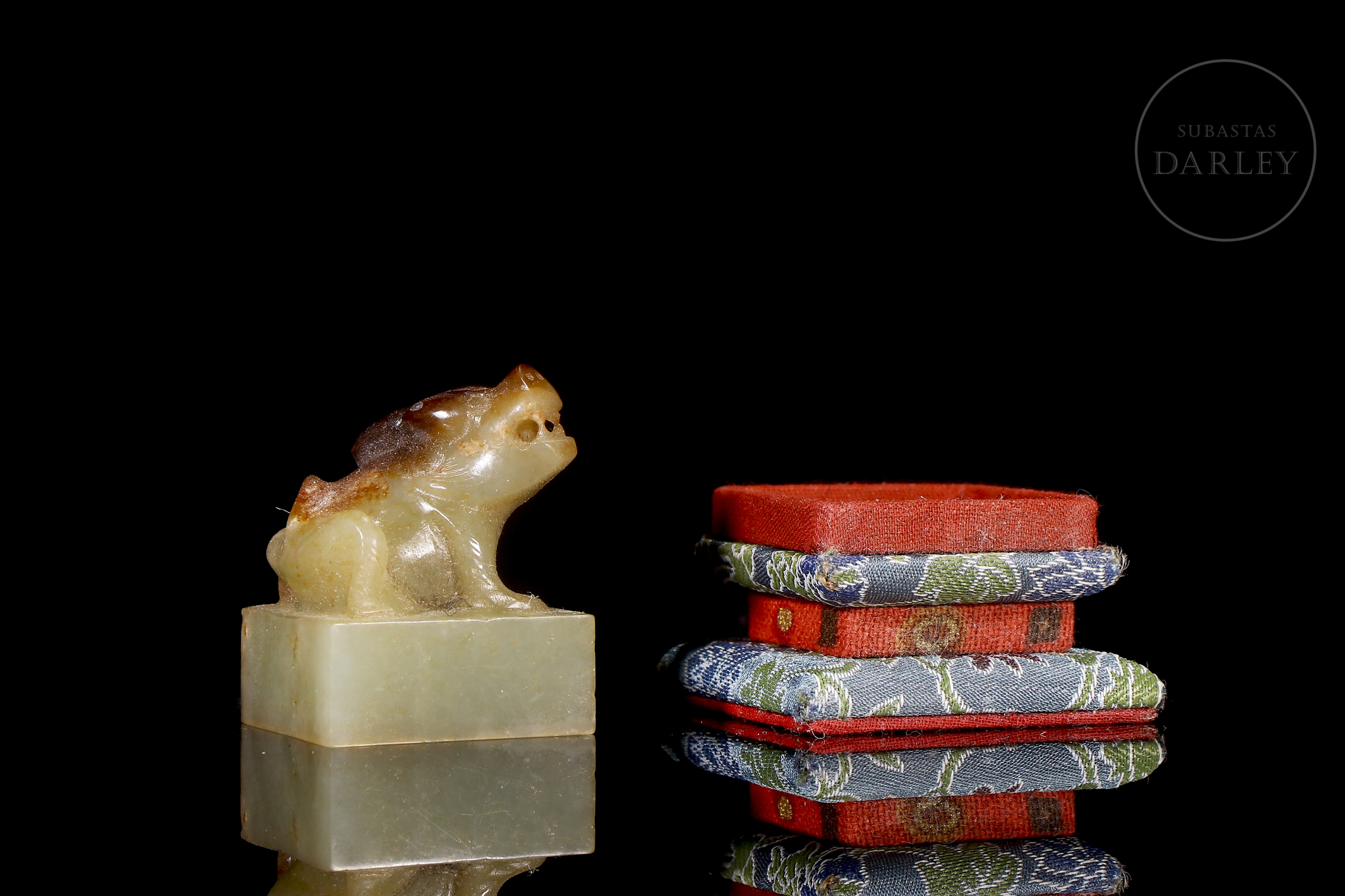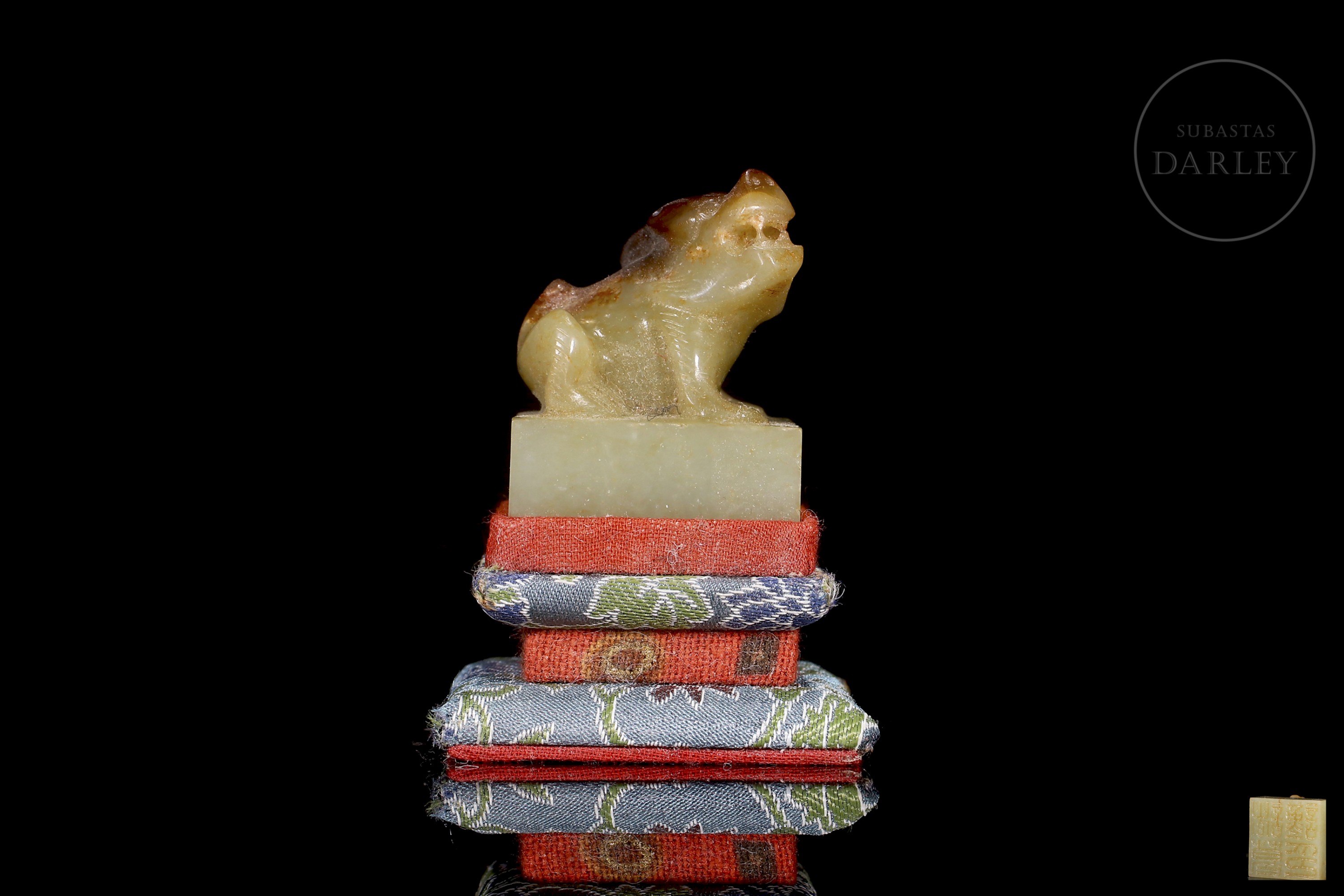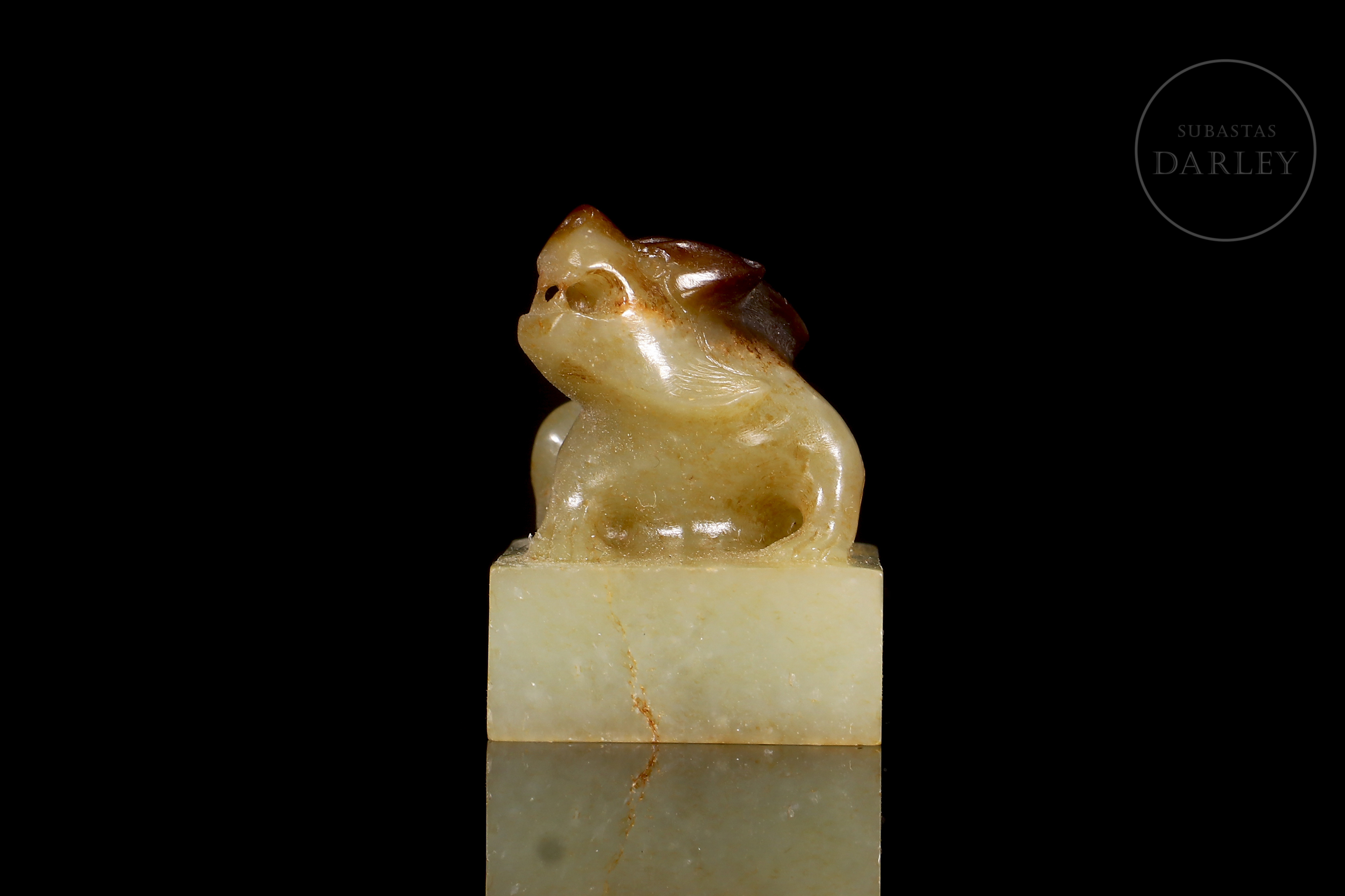 Jade de tonalidad blanquecina, con pátina en tonos ocre y rojizo. Posee una base cuadrada, coronada por la talla de una bestia mítica, con fauces abiertas y musculatura en tensión. La figura se muestra con un trabajo de talla vigoroso, destacando el relieve de las extremidades y la expresión de ferocidad. La base posee caracteres caligráficos incisos para su estampado. Con peana y caja a medida, forradas con tejidos de colores. Dinastía Qing (1644–1911).