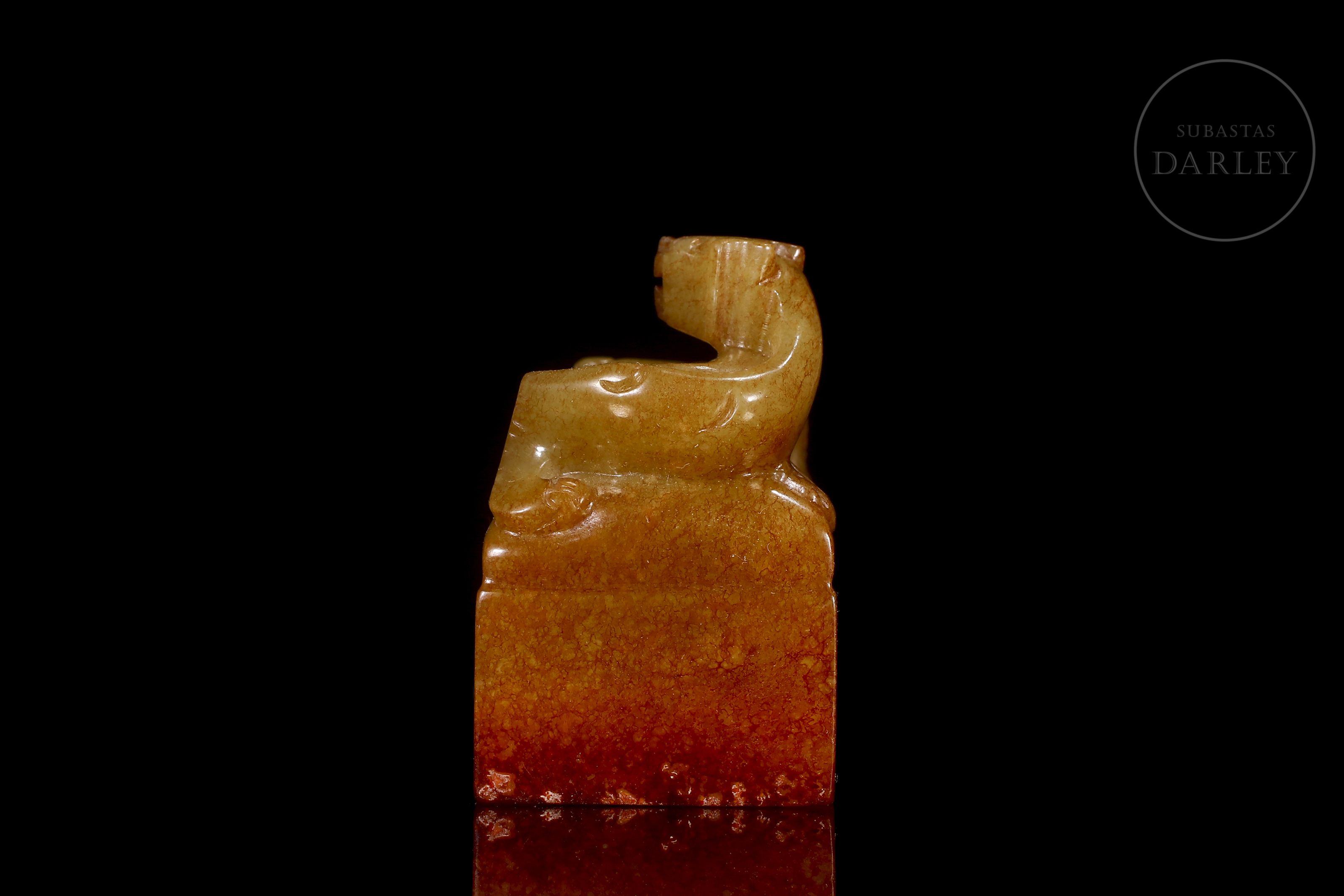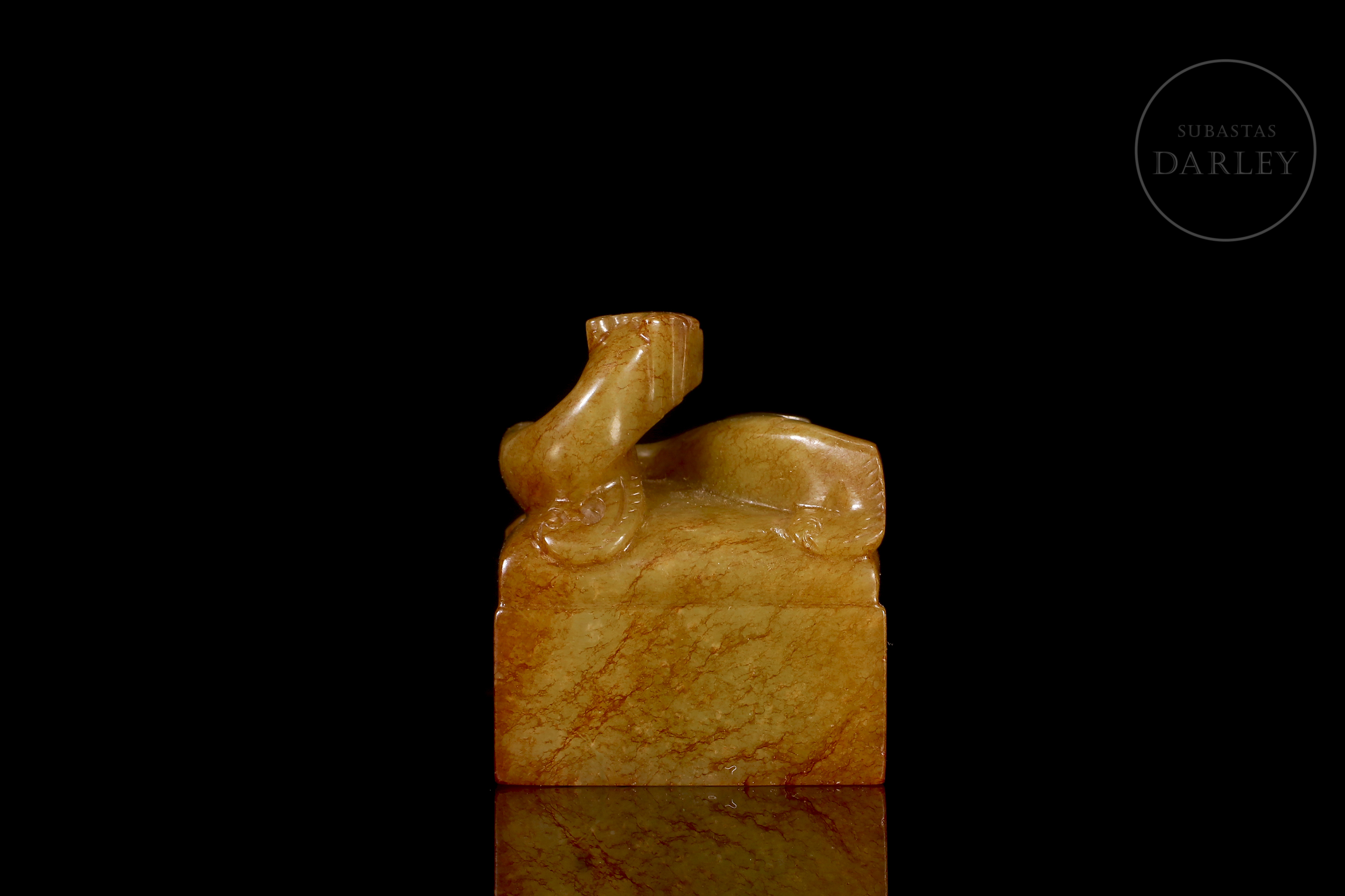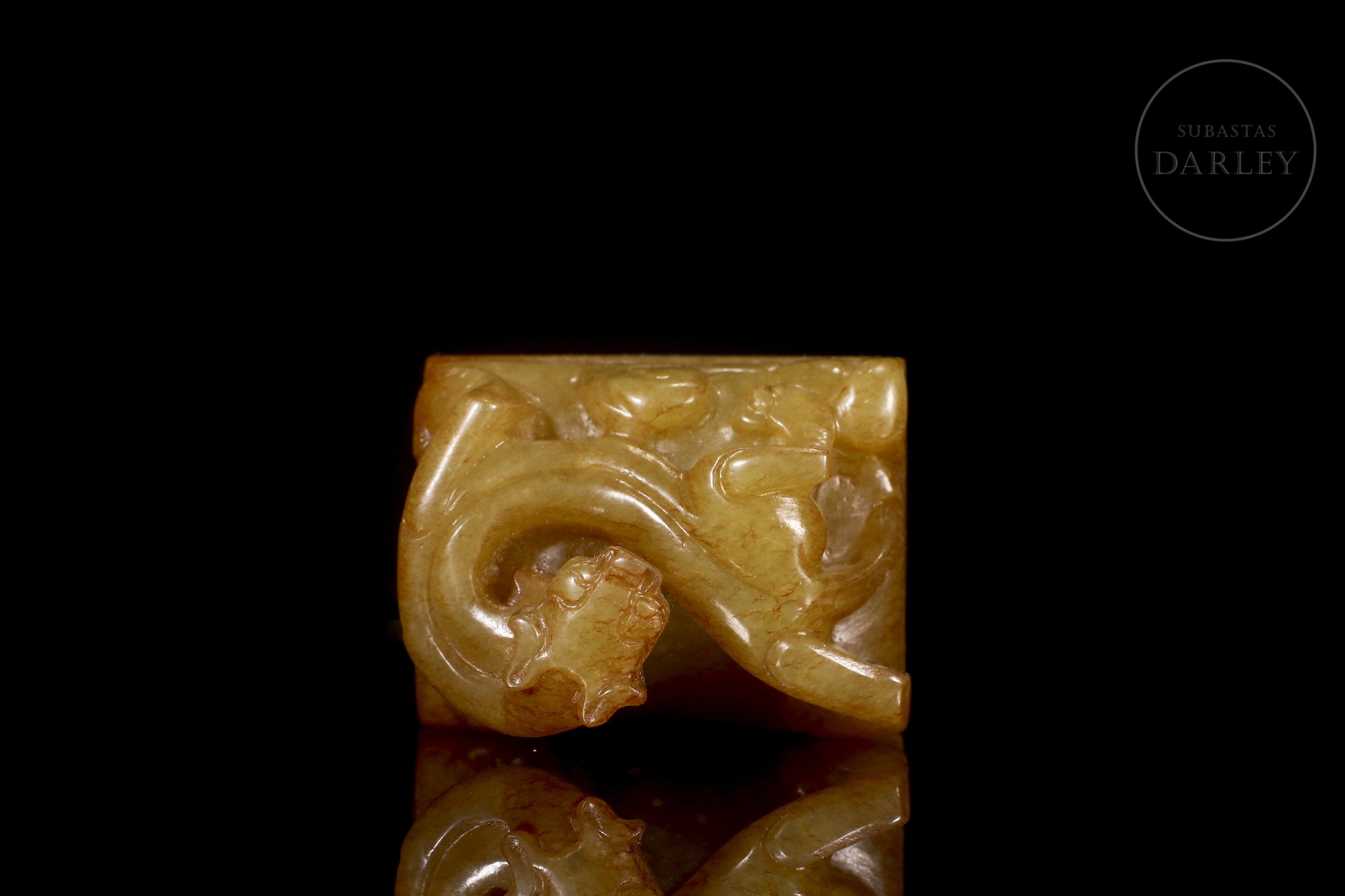 Jade amarillo con áreas de pátina rojiza de tonalidad miel. La pieza presenta un formato de sello de base rectangular, coronado por la figura de un dragón chilong tallado en bulto redondo, representado con el cuerpo sinuoso y la cola enroscada sobre la parte superior del sello. La figura se muestra con una expresión vigorosa y alerta, destacando el trabajo detallado en la musculatura y la columna. La base del sello conserva su superficie grabada con caracteres caligráficos en estilo sigilar. Se acompaña de una peana de madera tallada y una caja de presentación a medida. Dinastía Qing (1644–1911).