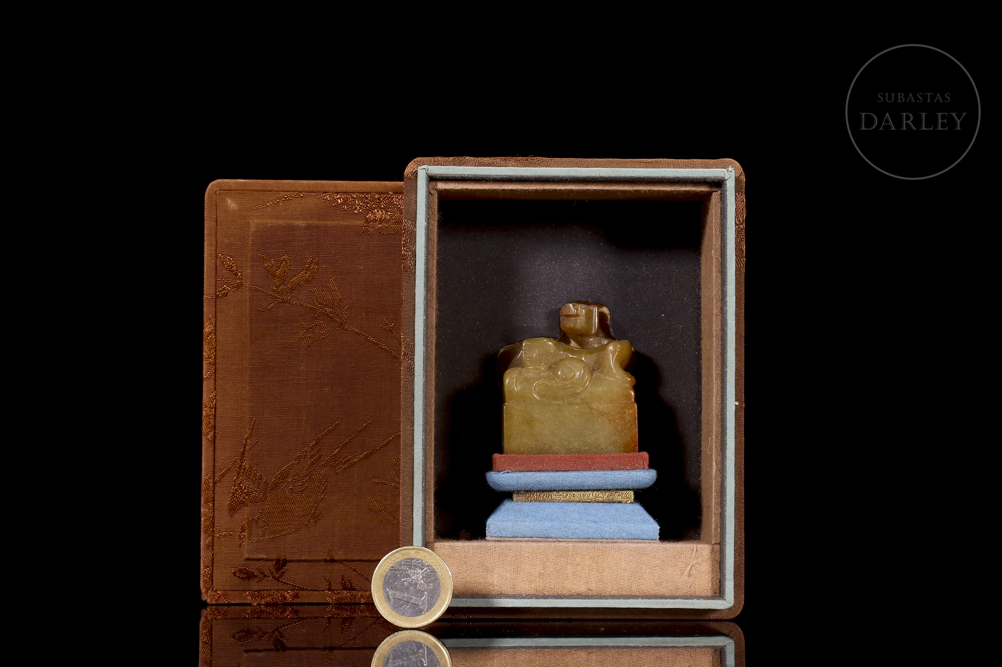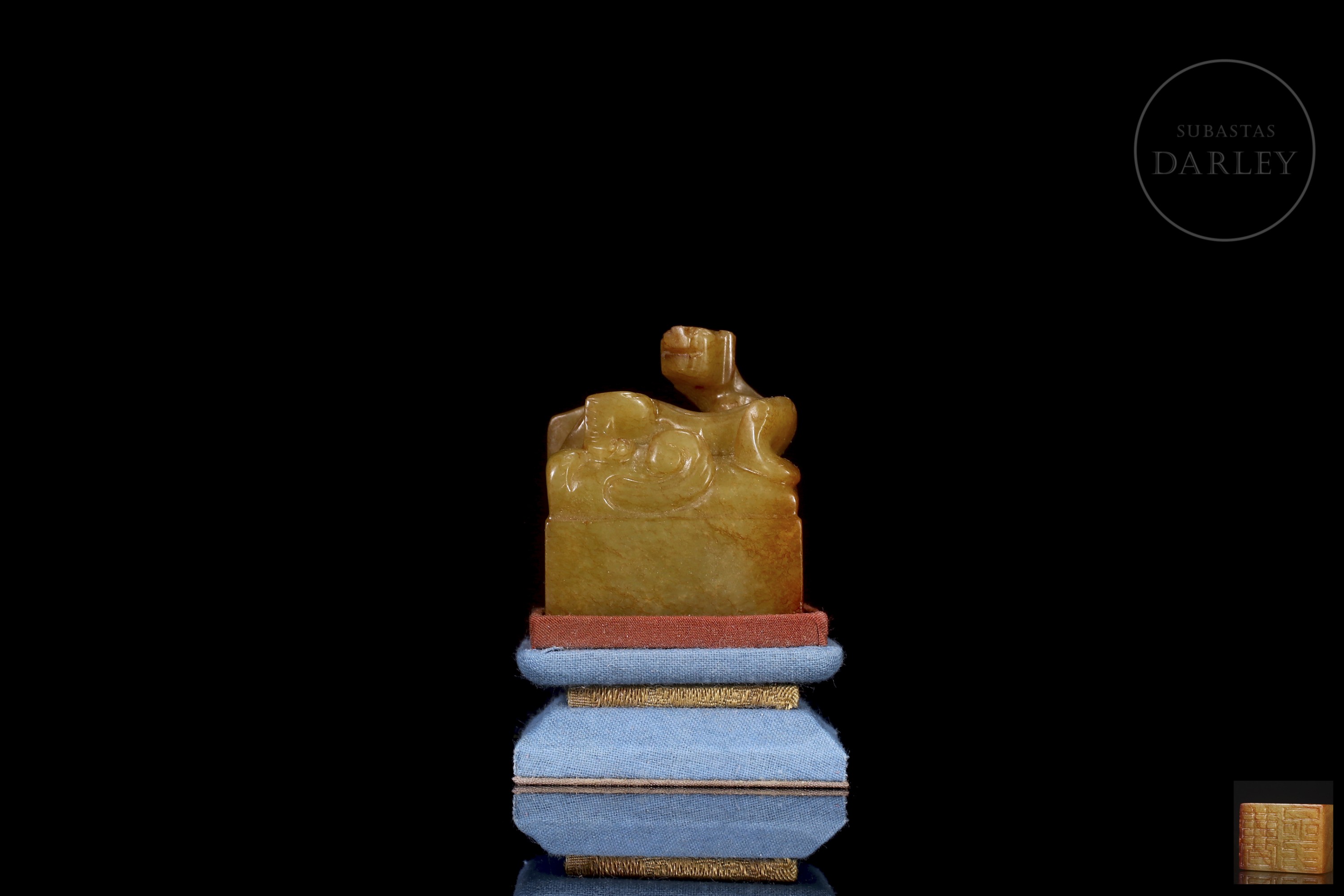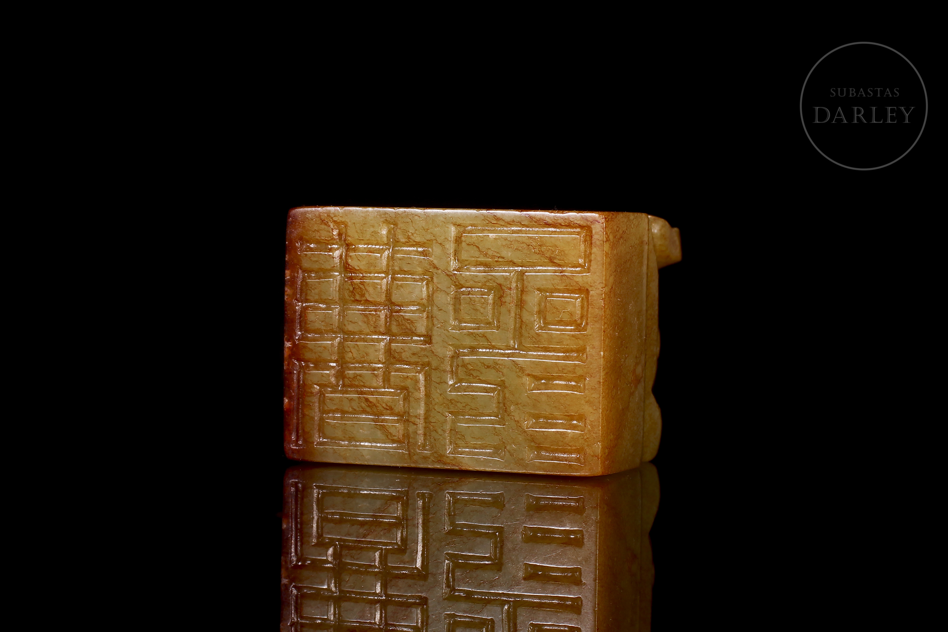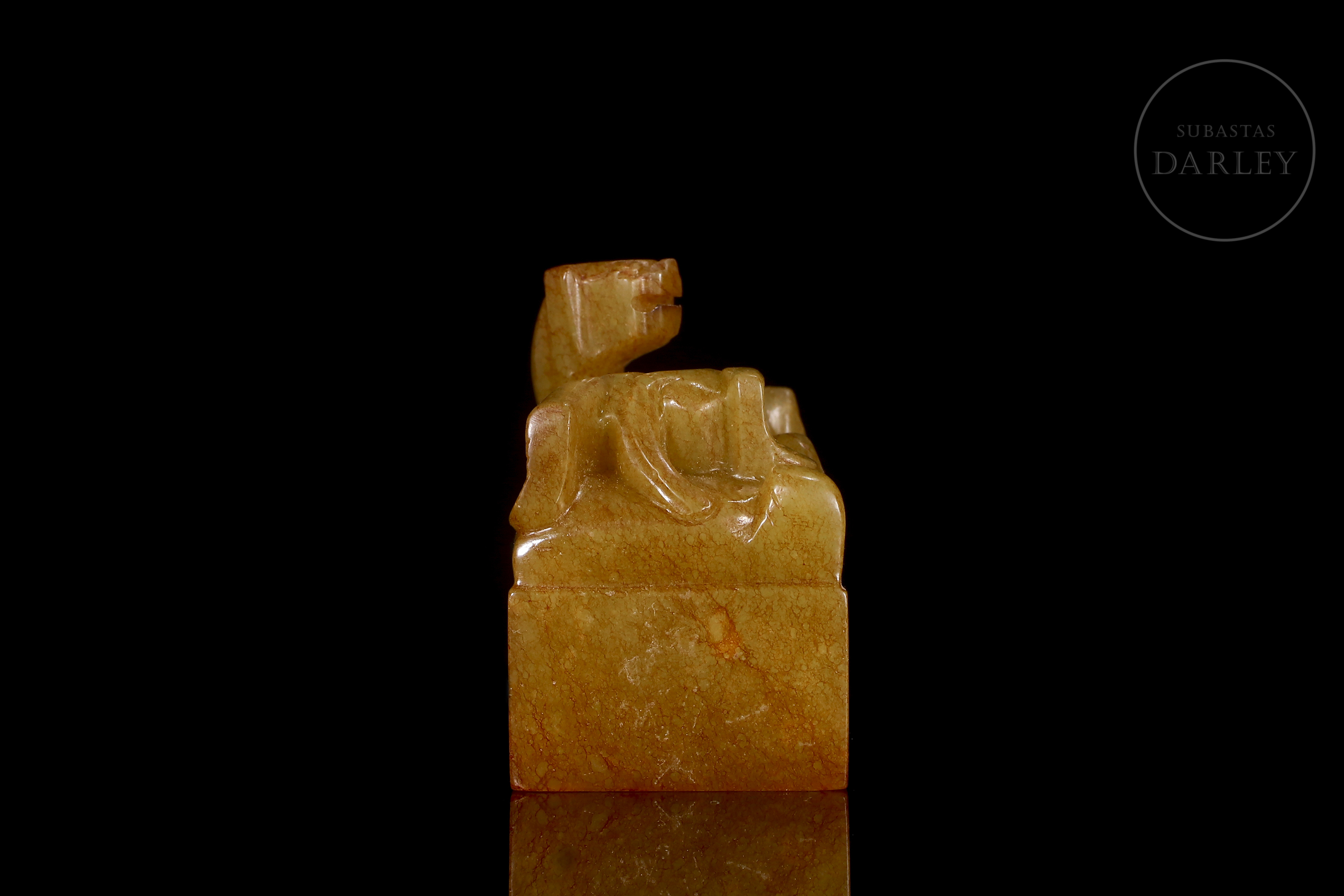 Jade amarillo con áreas de pátina rojiza de tonalidad miel. La pieza presenta un formato de sello de base rectangular, coronado por la figura de un dragón chilong tallado en bulto redondo, representado con el cuerpo sinuoso y la cola enroscada sobre la parte superior del sello. La figura se muestra con una expresión vigorosa y alerta, destacando el trabajo detallado en la musculatura y la columna. La base del sello conserva su superficie grabada con caracteres caligráficos en estilo sigilar. Se acompaña de una peana de madera tallada y una caja de presentación a medida. Dinastía Qing (1644–1911).