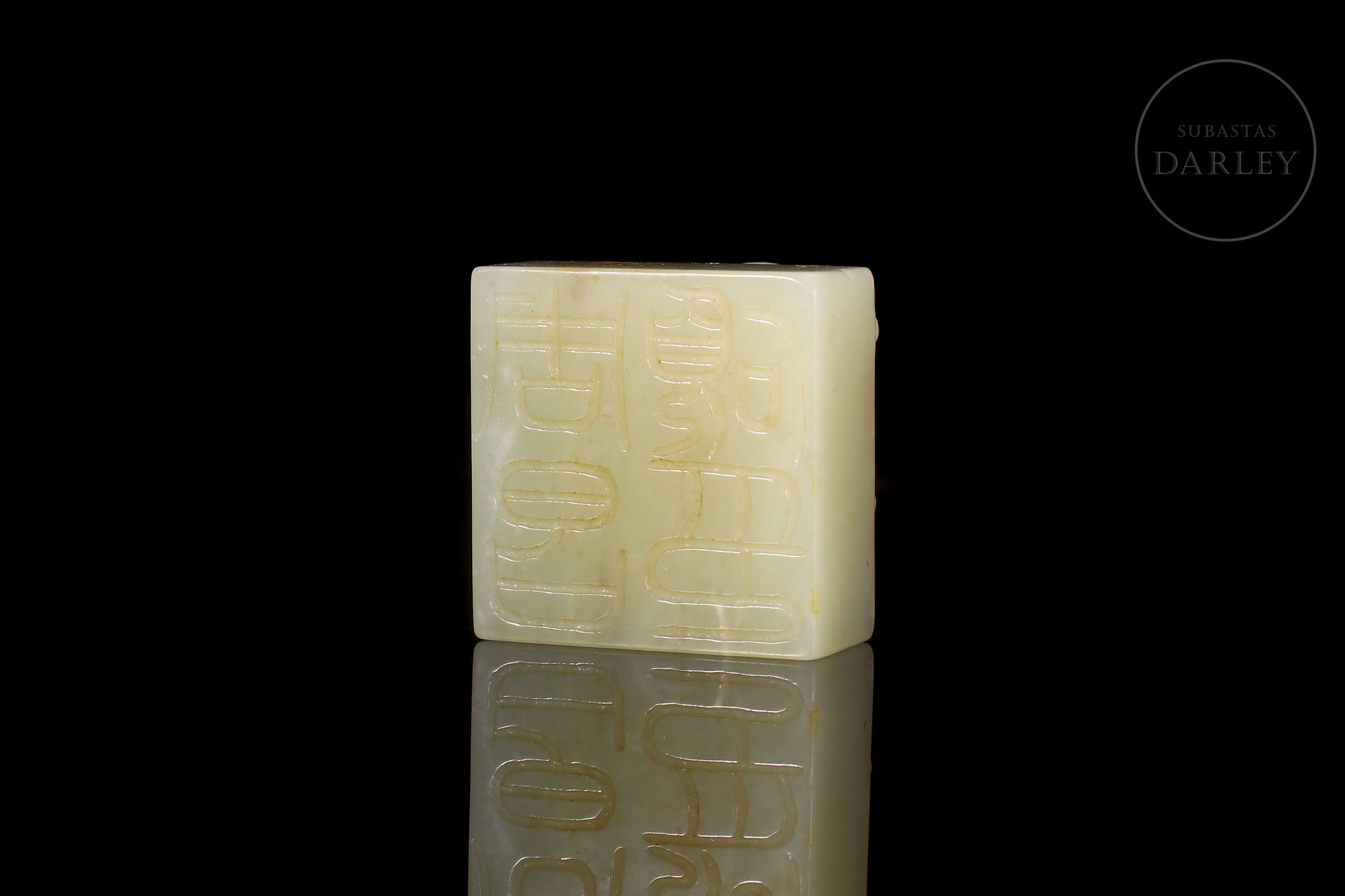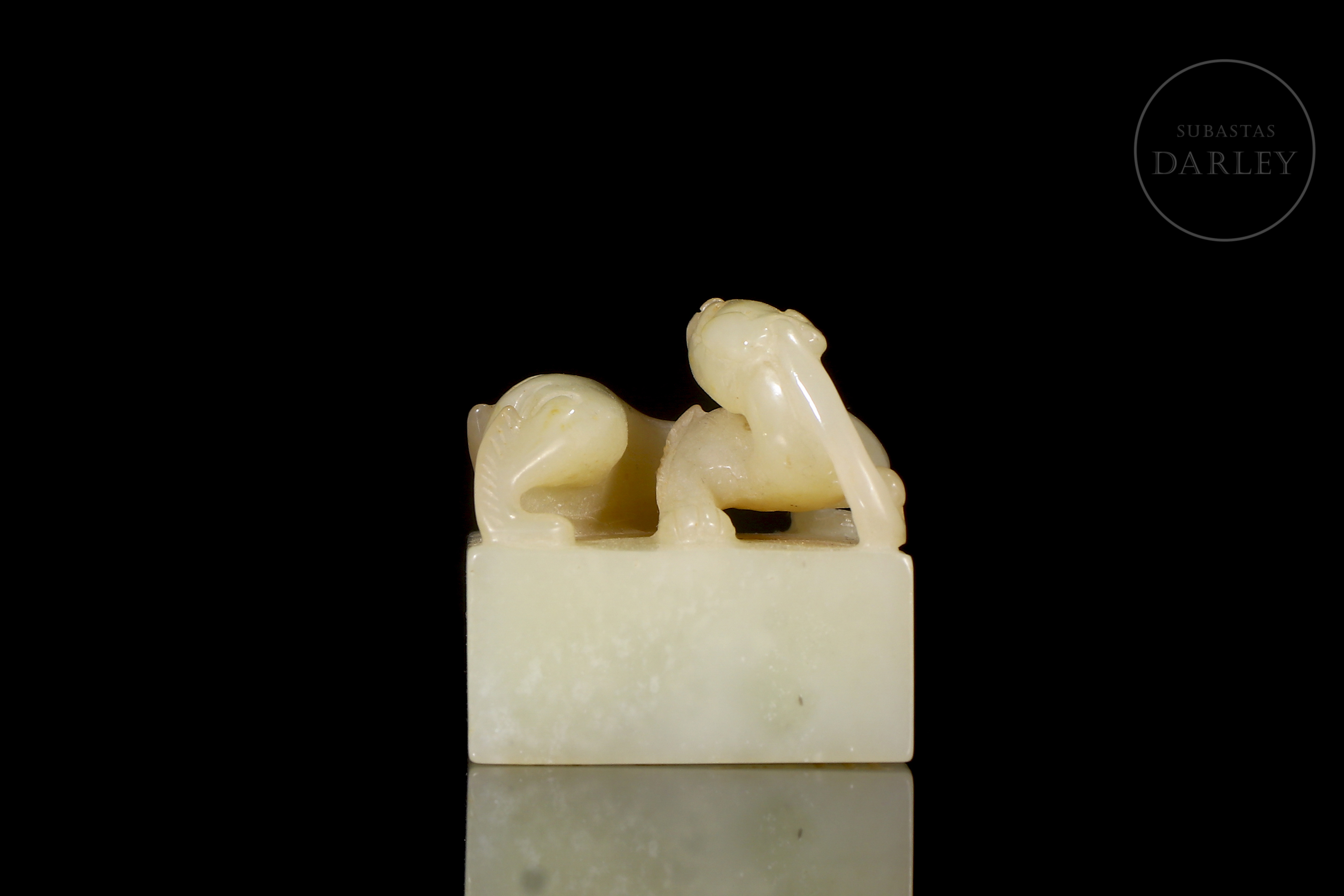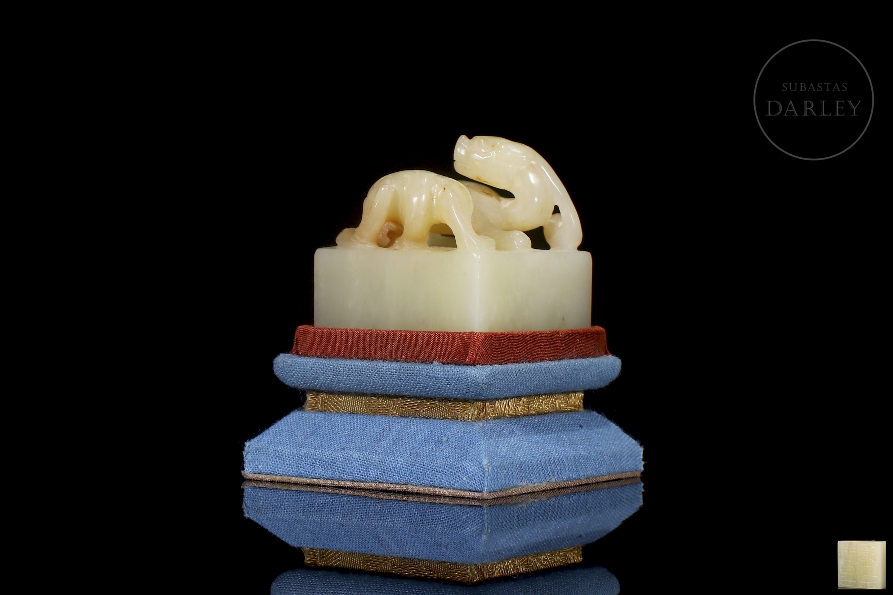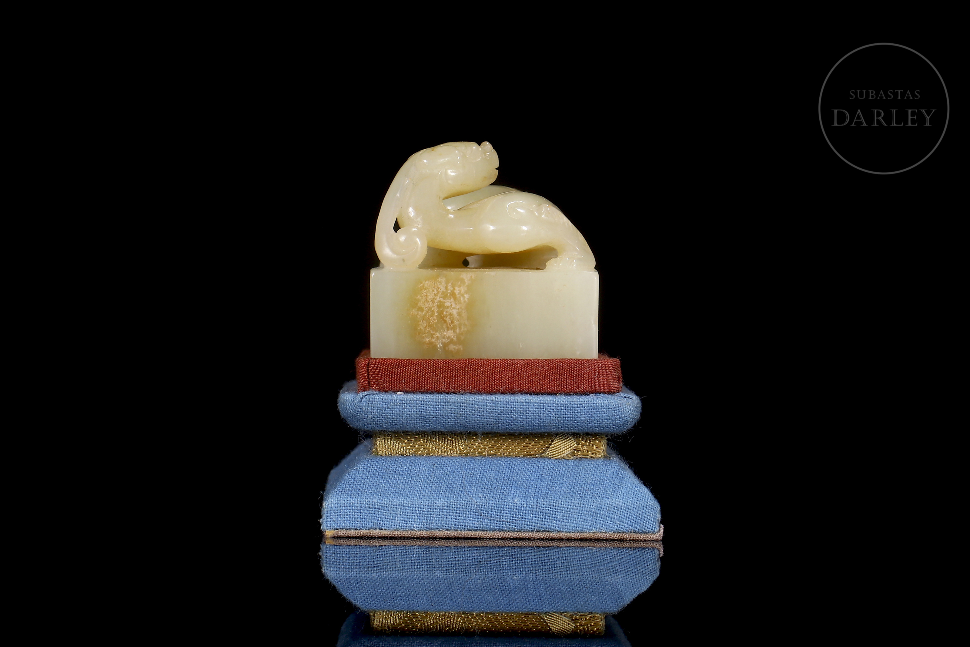 Jade blanco de una tonalidad con áreas de pátina rojiza y miel. La pieza presenta un formato de sello de base cuadrangular, coronado por la talla en bulto redondo de un dragón, con la cabeza erguida y volteada, y la cola sinuosa. La figura se muestra con un minucioso trabajo de talla en las escamas, la melena y los rasgos faciales, que le otorgan una expresión de gran autoridad y vigor espiritual. La base del sello se encuentra grabada con caracteres caligráficos en estilo sigilar. La pieza se acompaña de una peana y una caja, realizada a medida, ambas forradas con tejidos coloridos. Dinastía Qing (1644–1911).