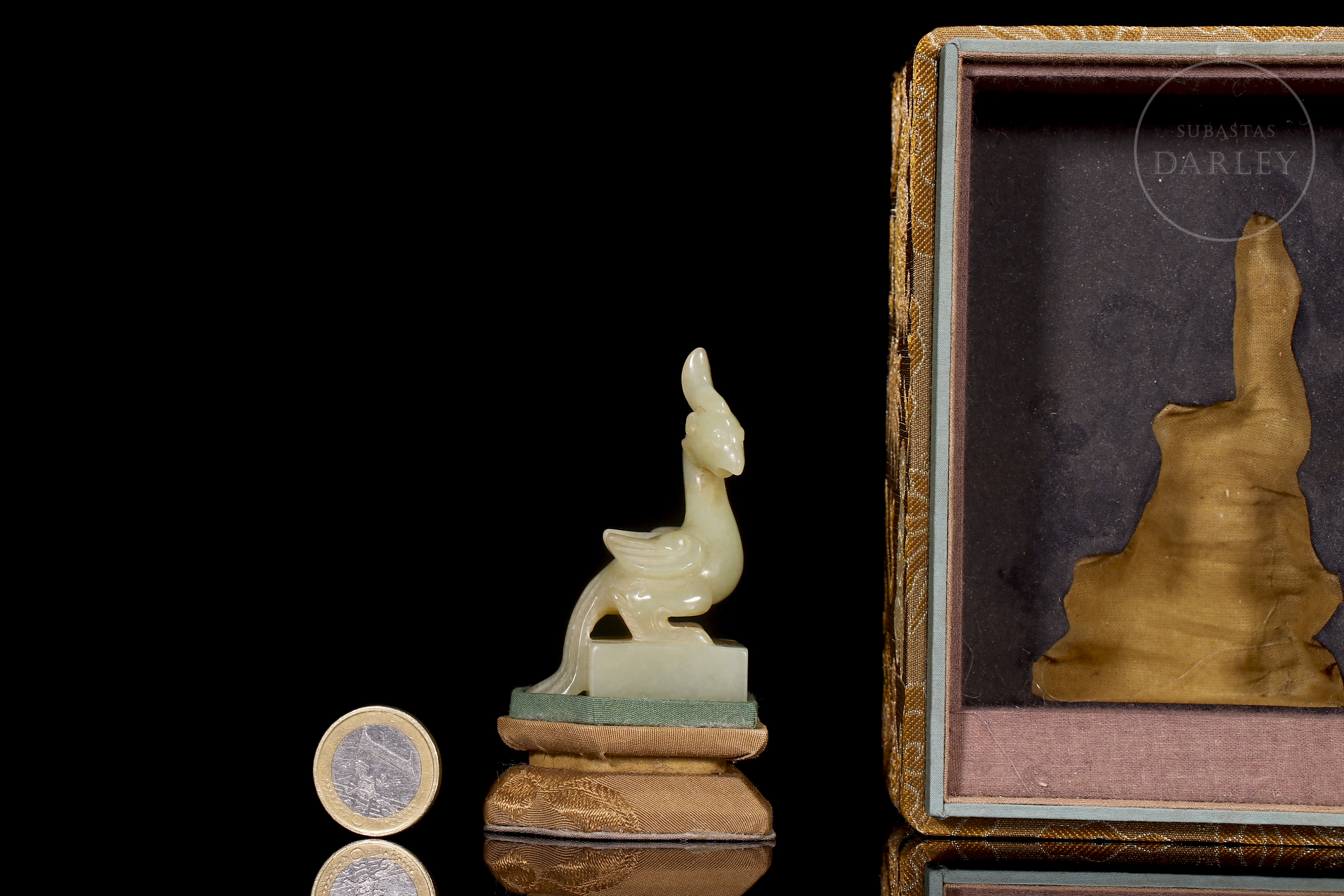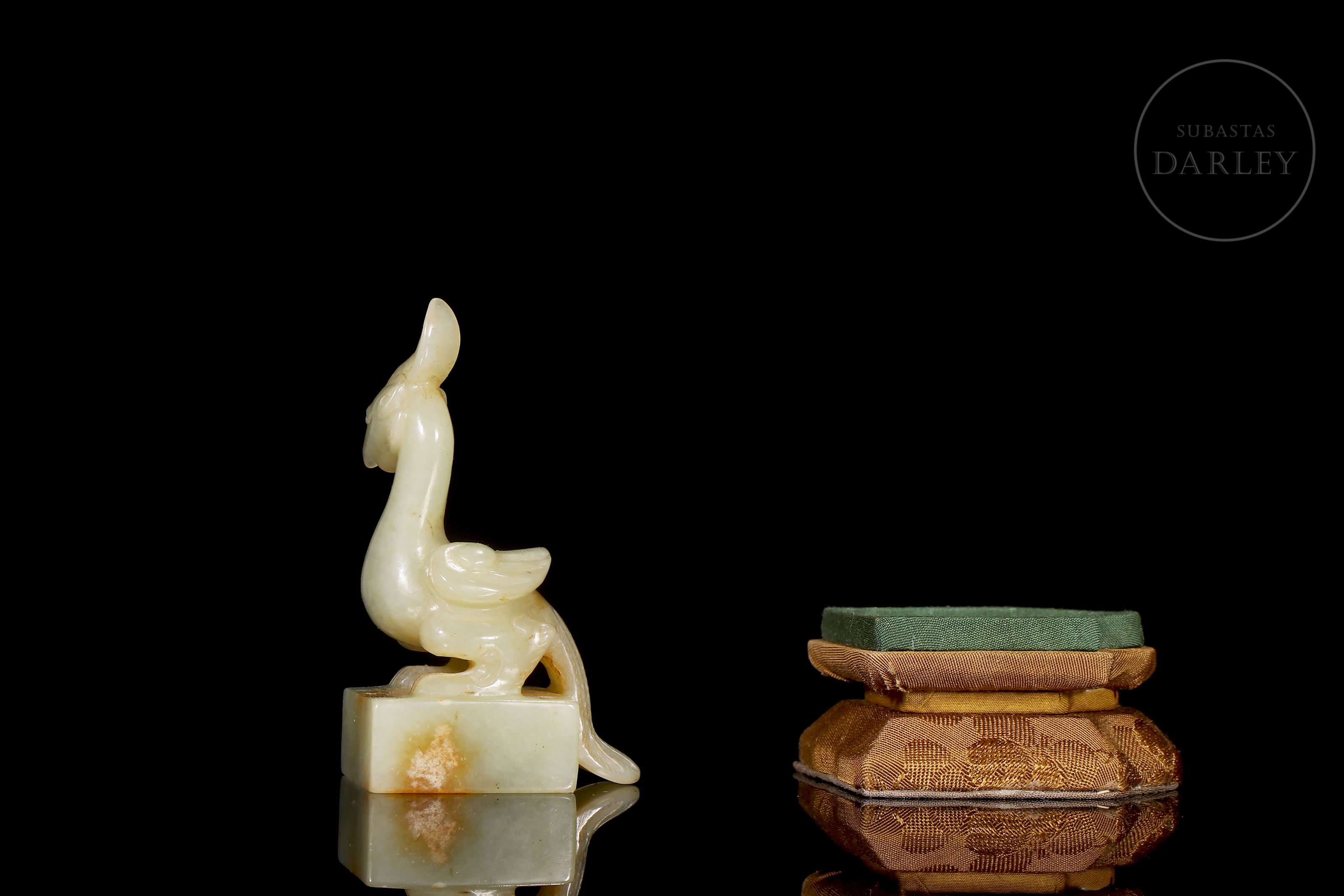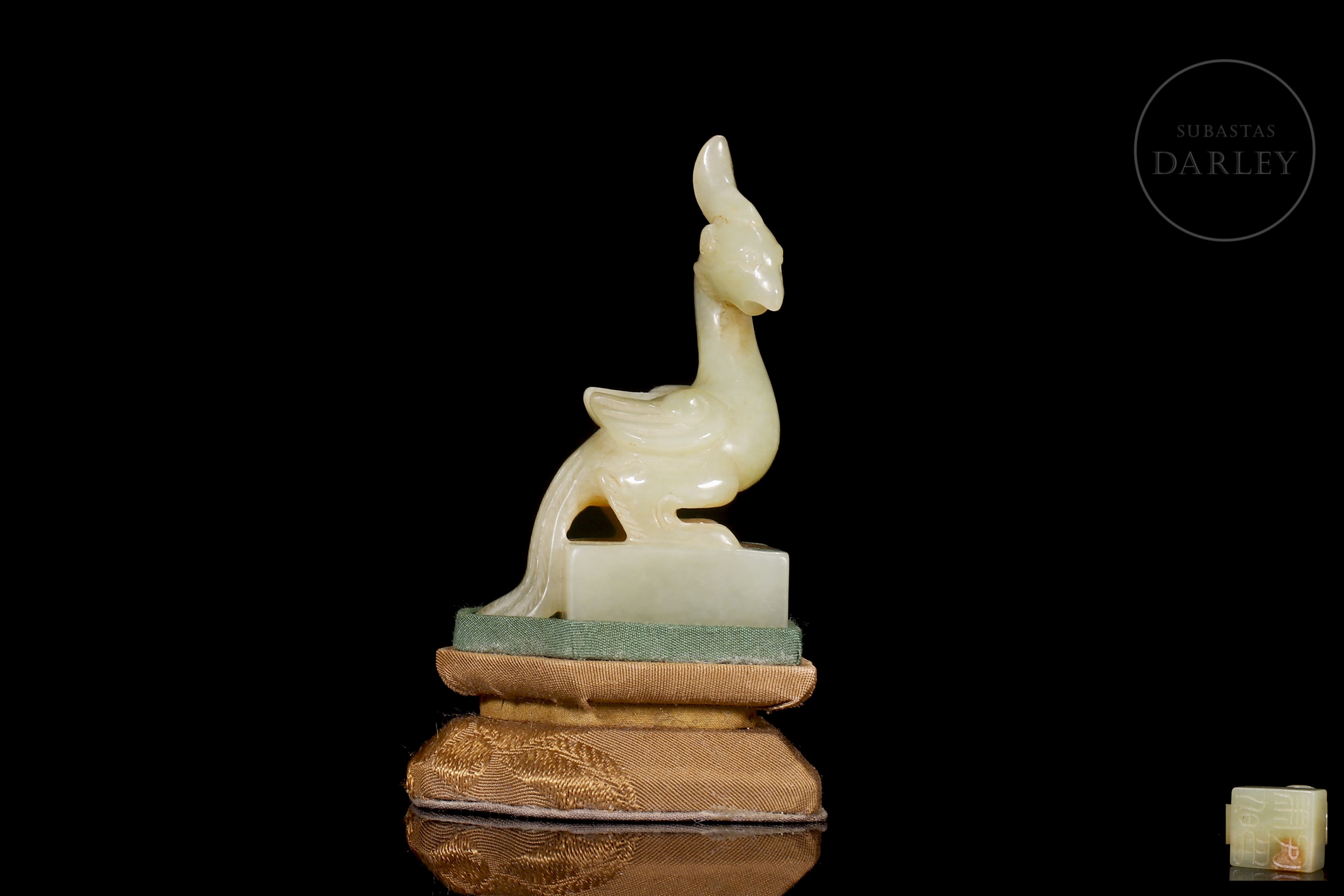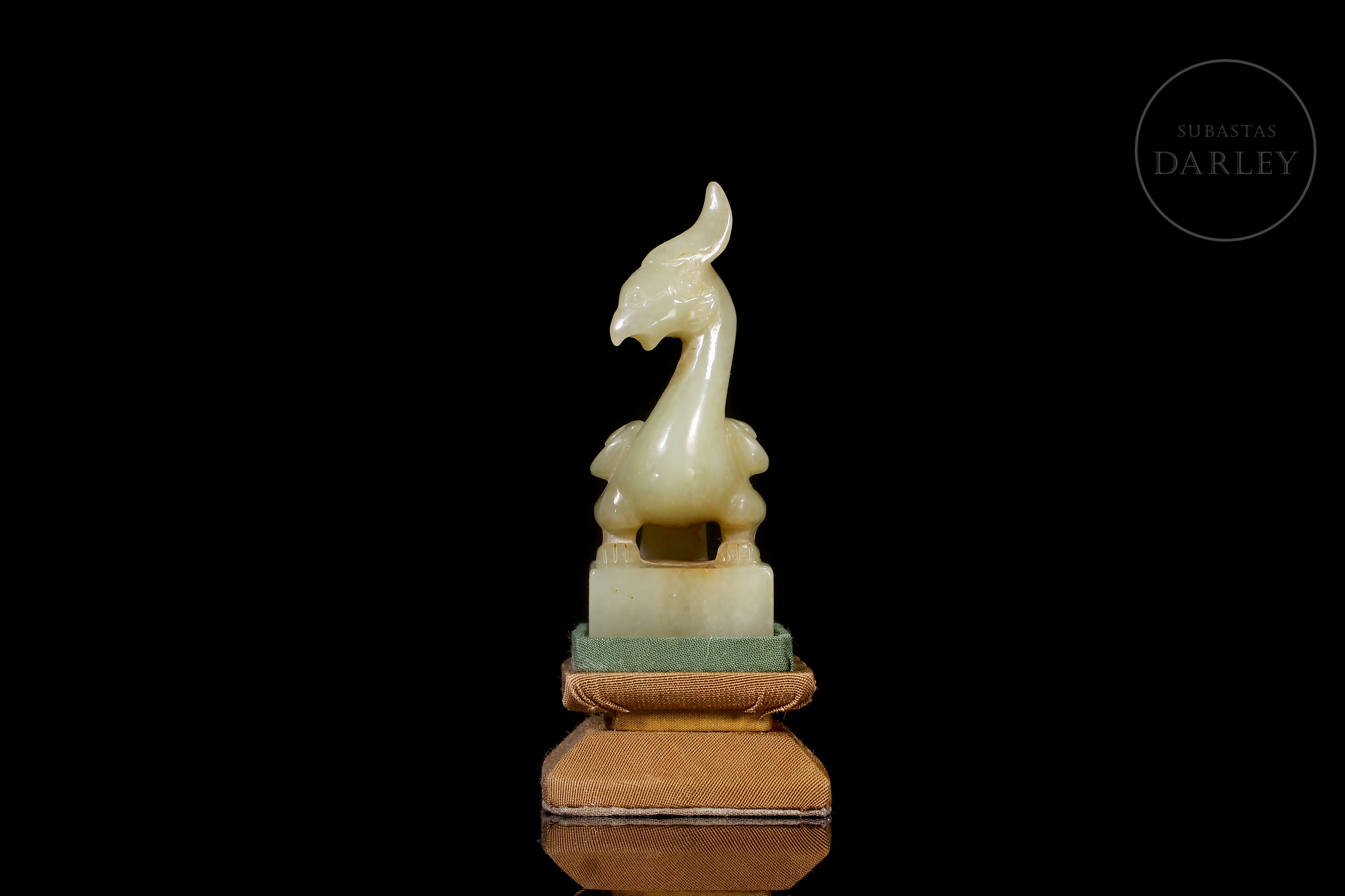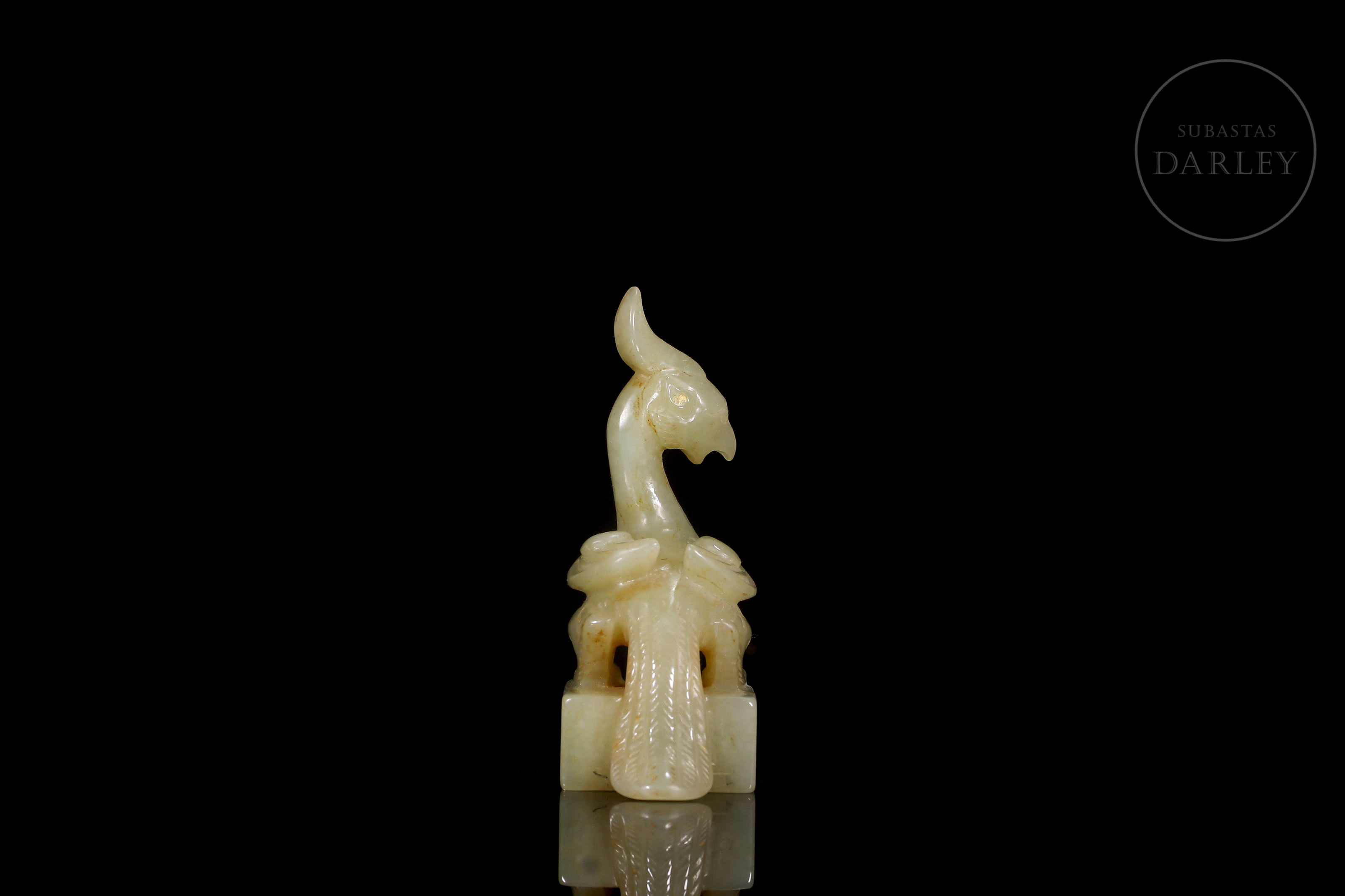 Jade blanco con sutiles áreas de tonalidad ocre. Posee una base rectangular, coronada por un ave fénix. Se dispone erguida, con la cabeza alzada y el pico entreabierto, mostrando una cresta prominente y un cuello esbelto. El plumaje de las alas y cola se muestra detallado mediante finas líneas incisas que denotan una gran maestría técnica en la talla. Posee caracteres incisos en estilo sigilar para su uso funcional. Con peana y una caja a medida forradas con tejidos tradicionales. Dinastía Qing (1644–1911).