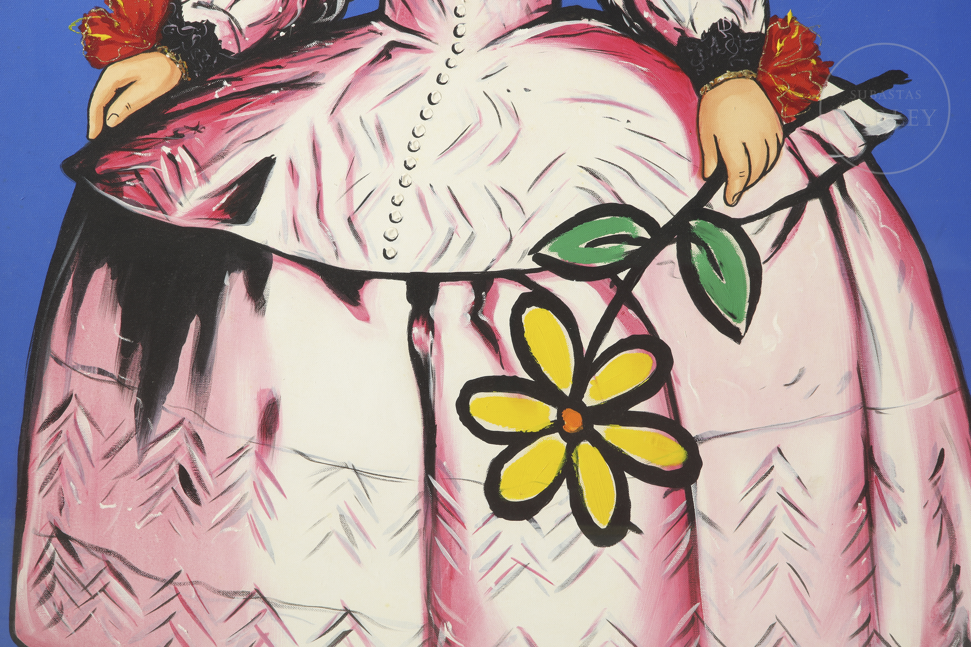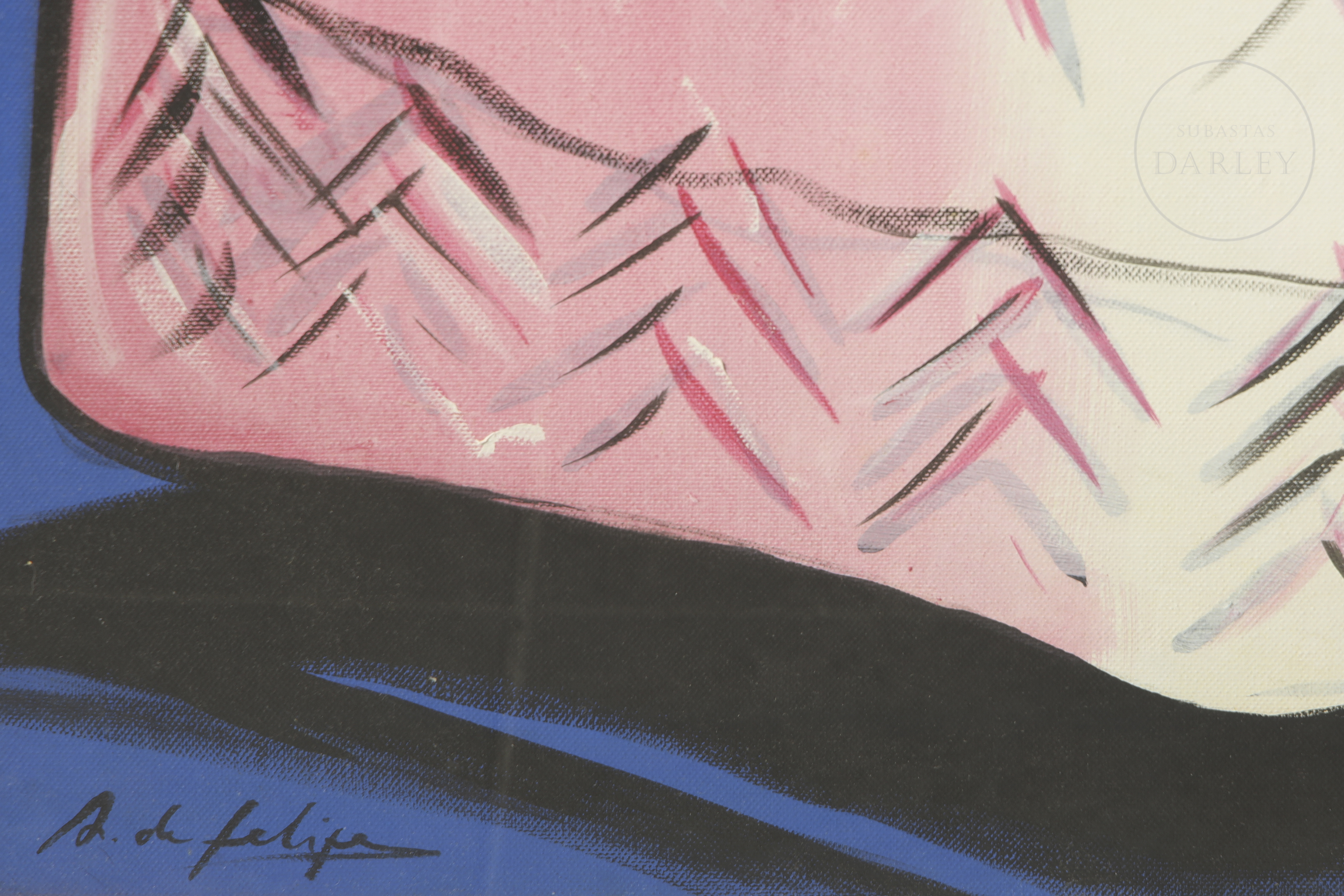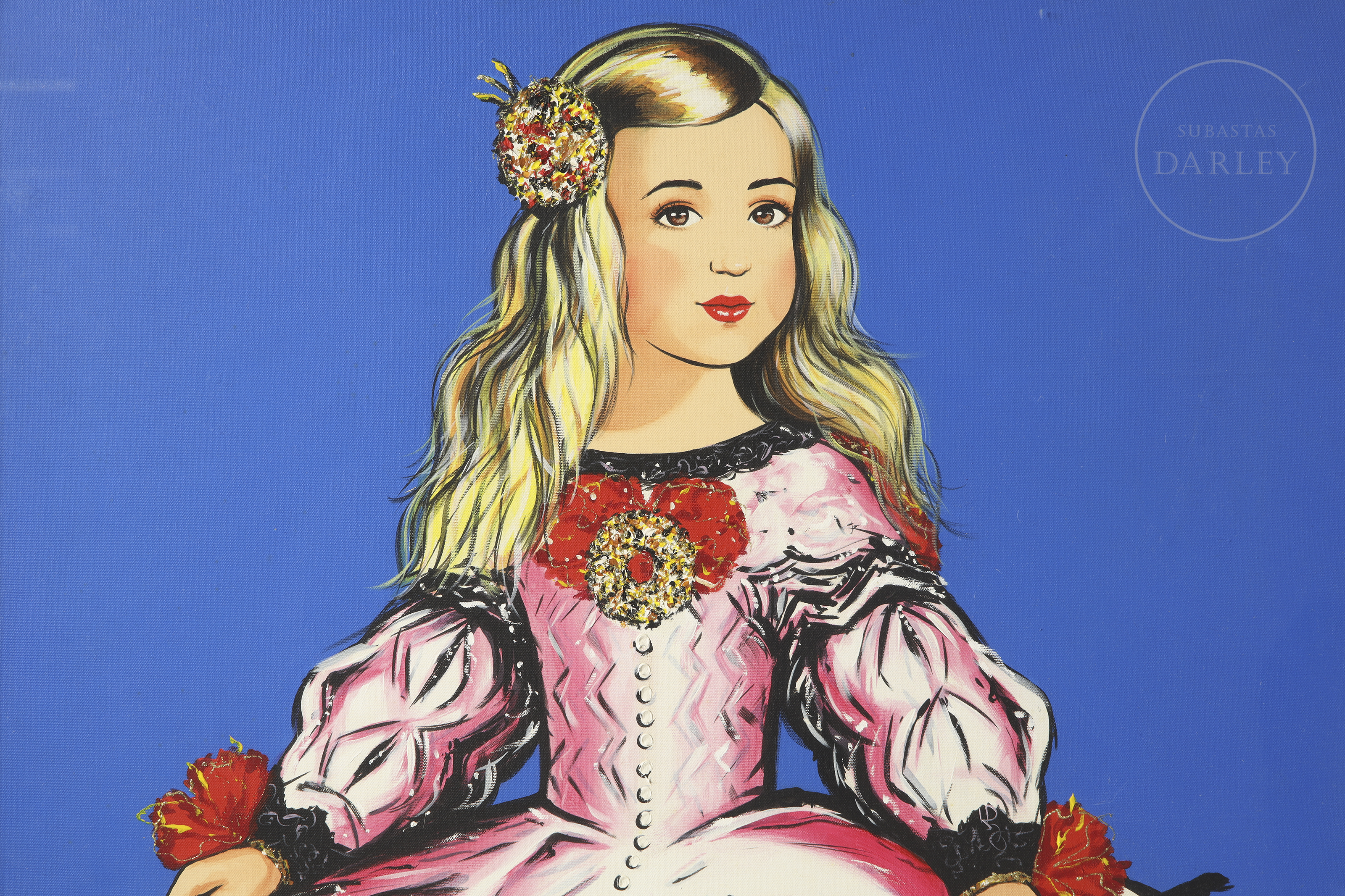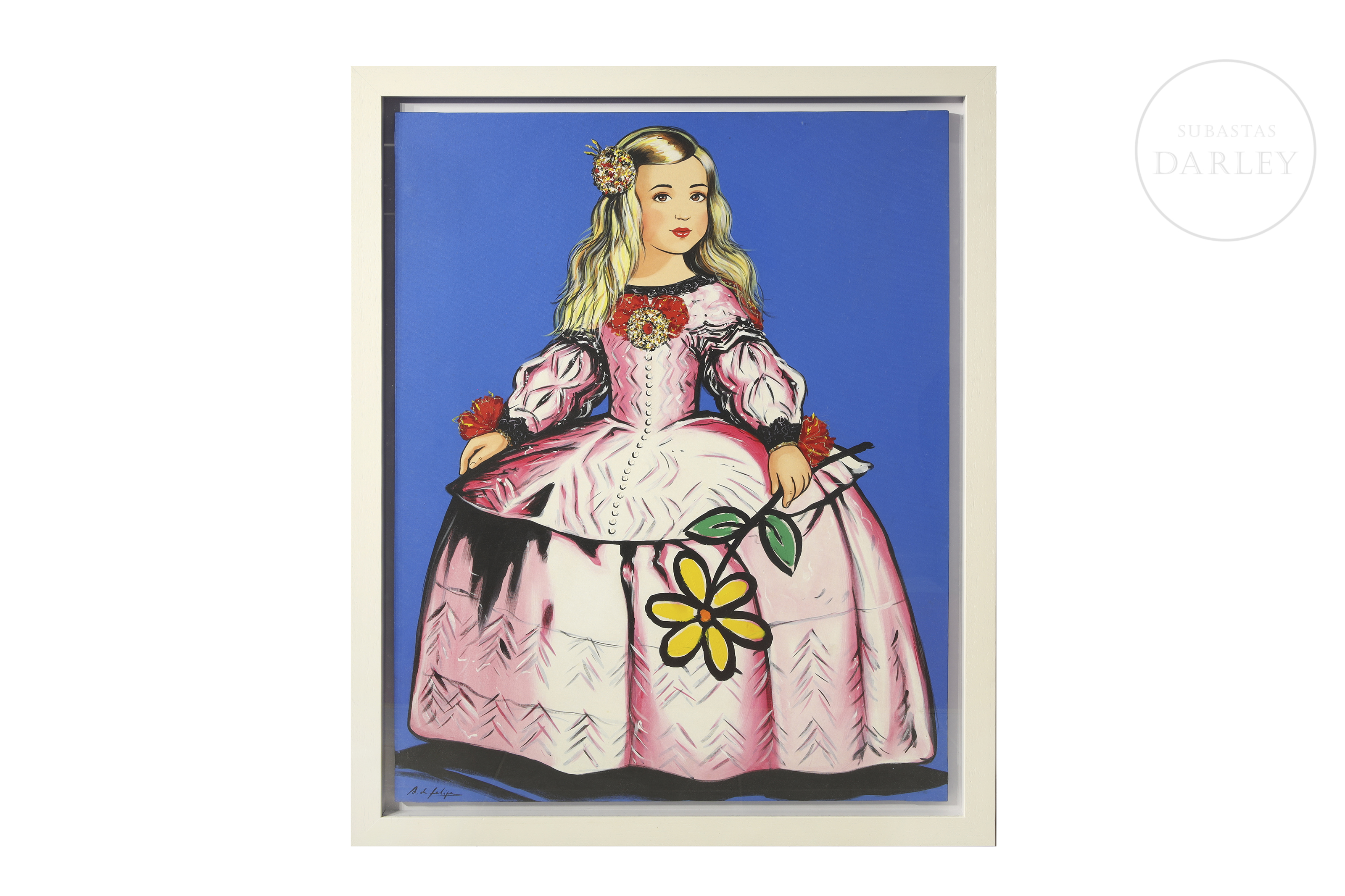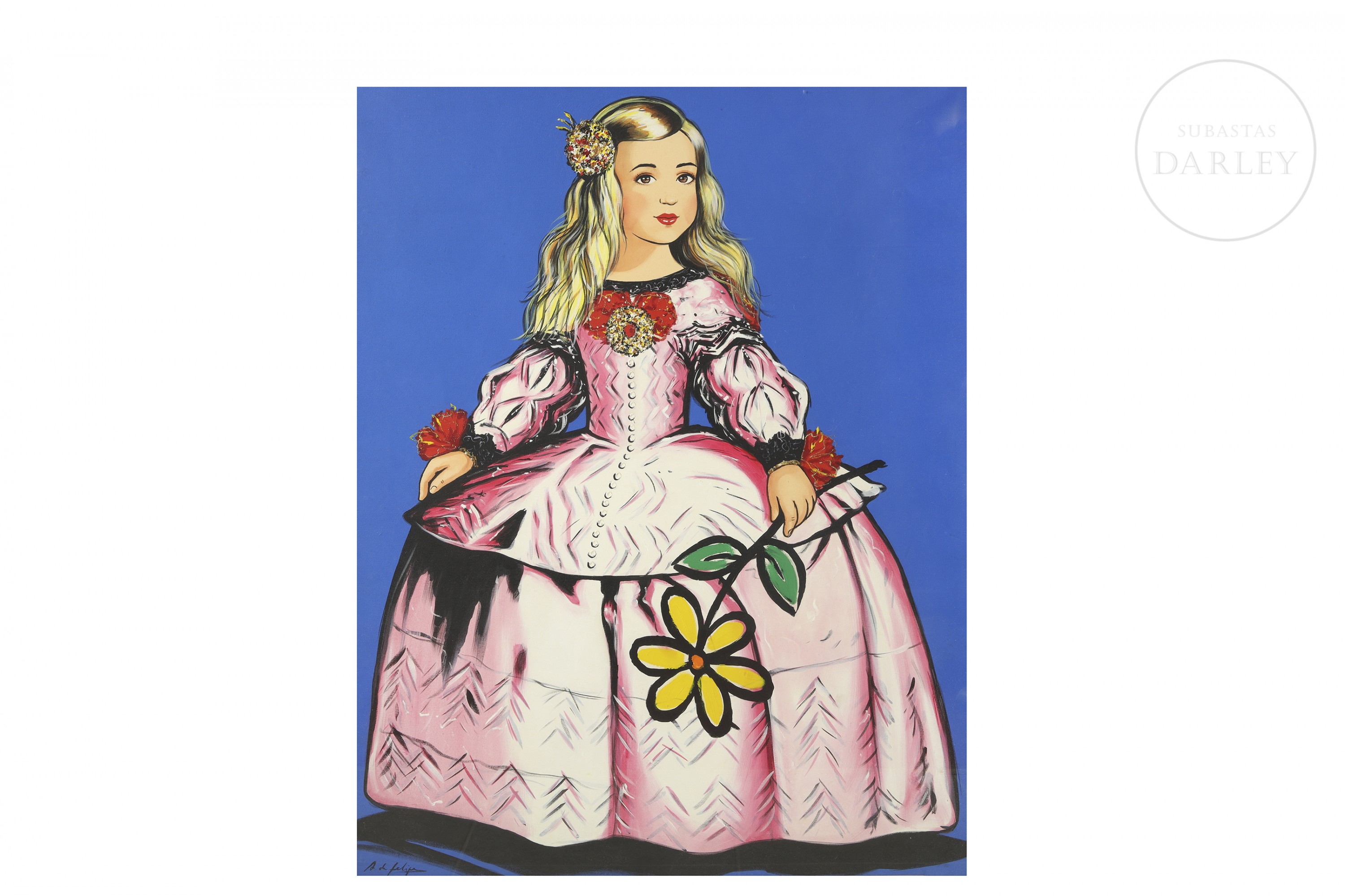 Acrílico sobre lienzo. Retrato de la infanta Margarita Teresa, de estilo pop sobre fondo liso azul. Firmado "A. de Felipe" en la esquina inferior izquierda.