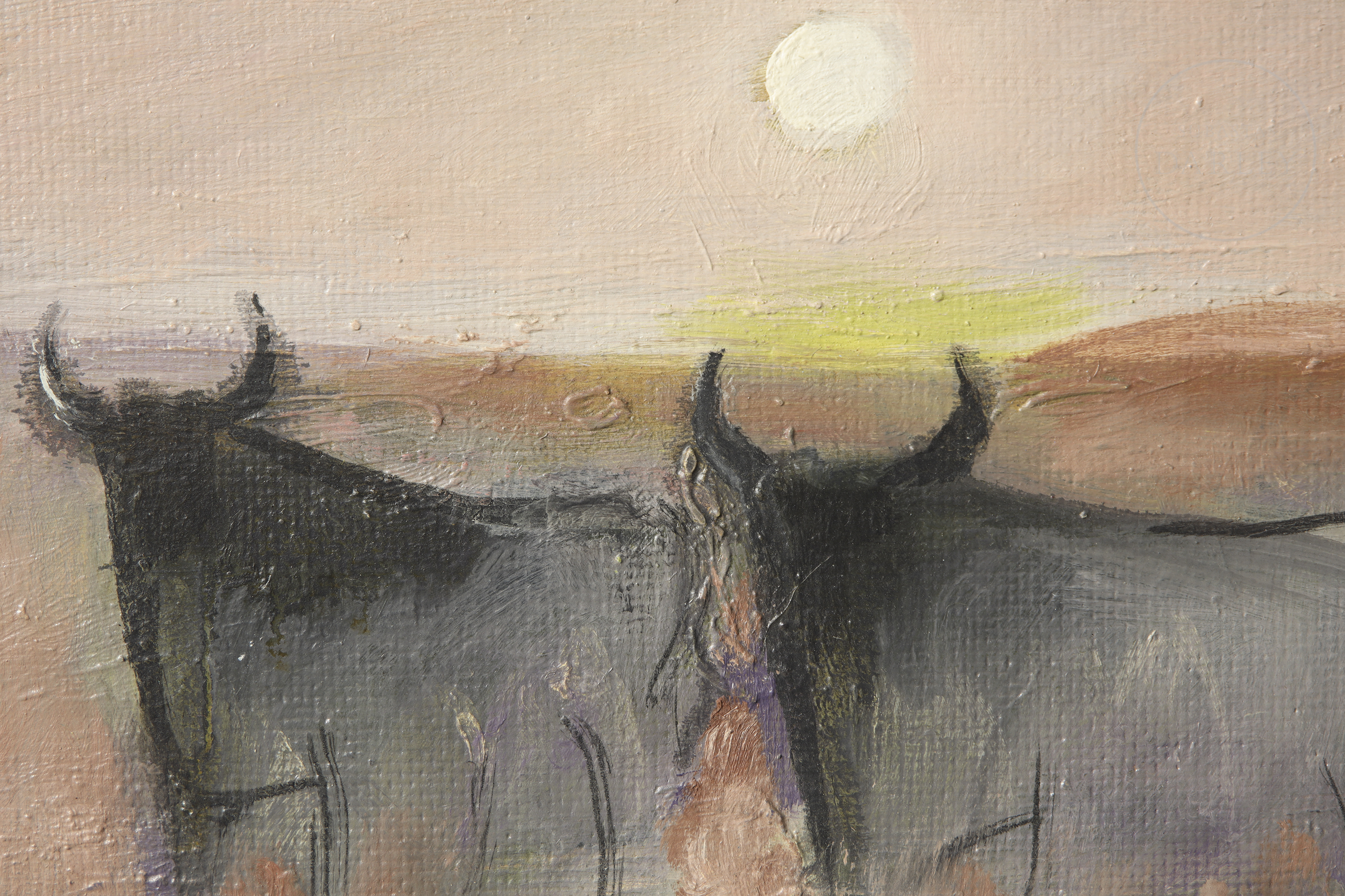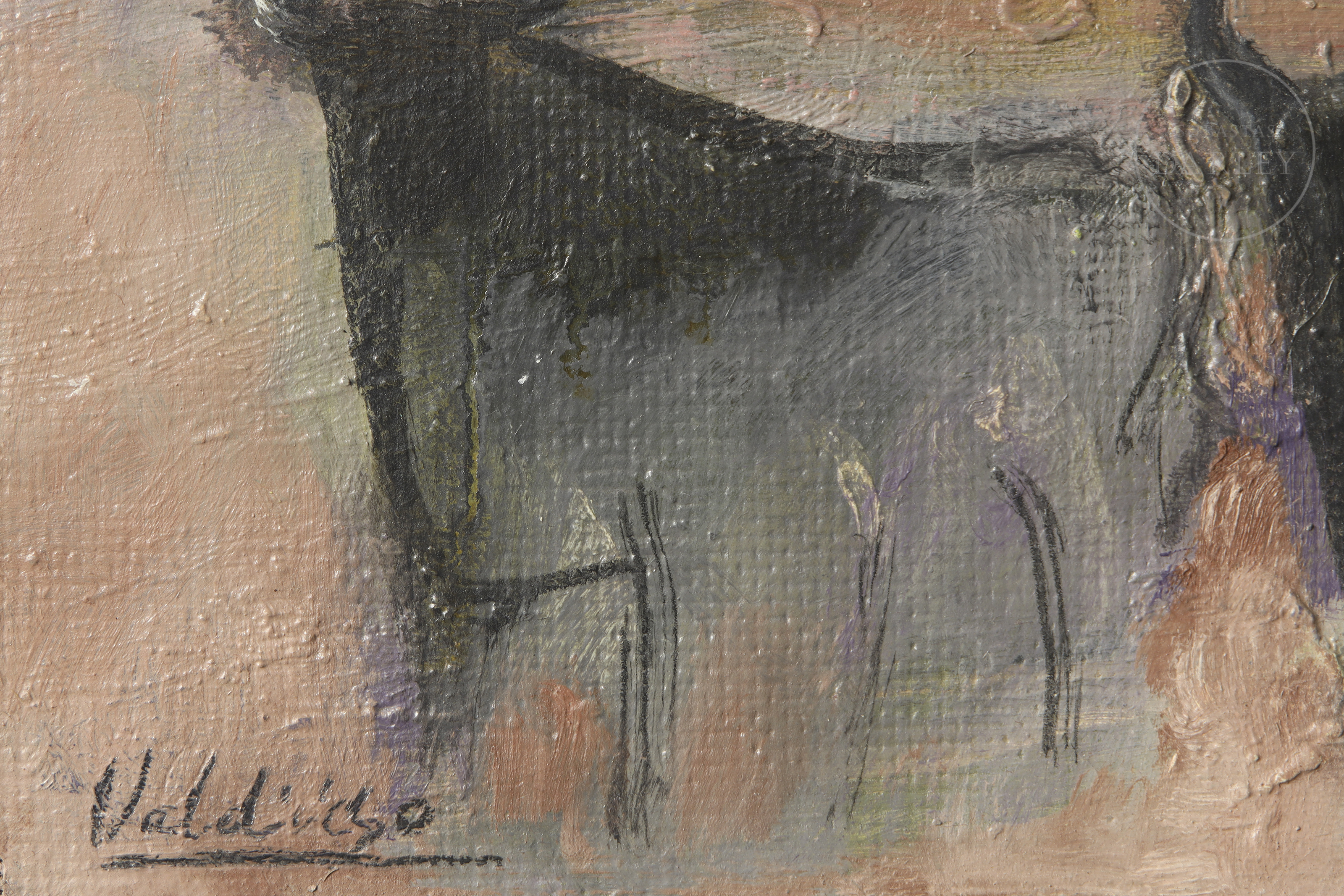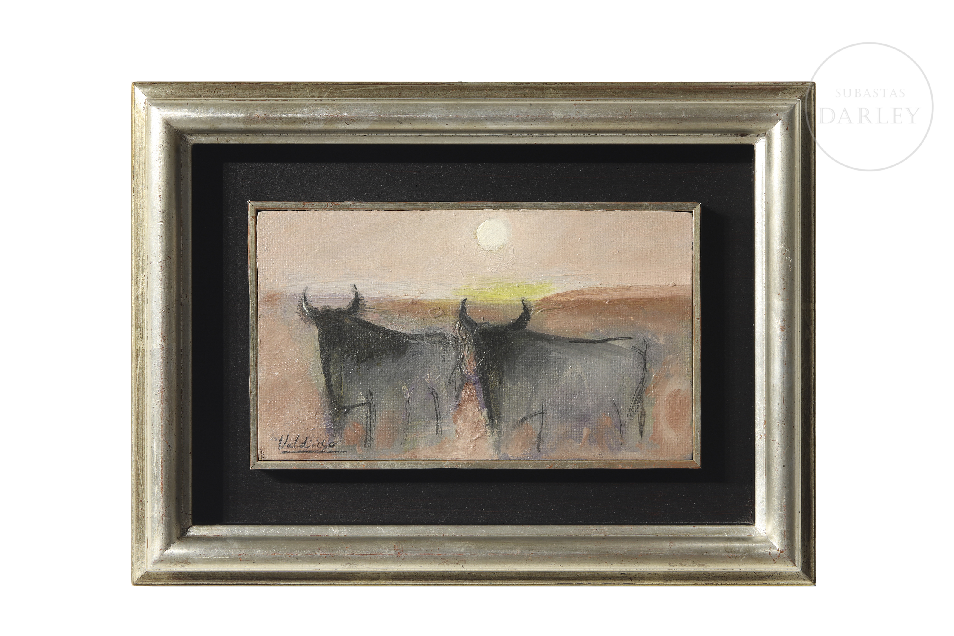 Óleo sobre tabla. Escena taurina esquemática que representa dos toros en primer plano, contra un paisaje crepuscular de tonos rosáceos con un sol blanco en el horizonte. Firmado "Valdivieso" en el ángulo inferior izquierdo.
