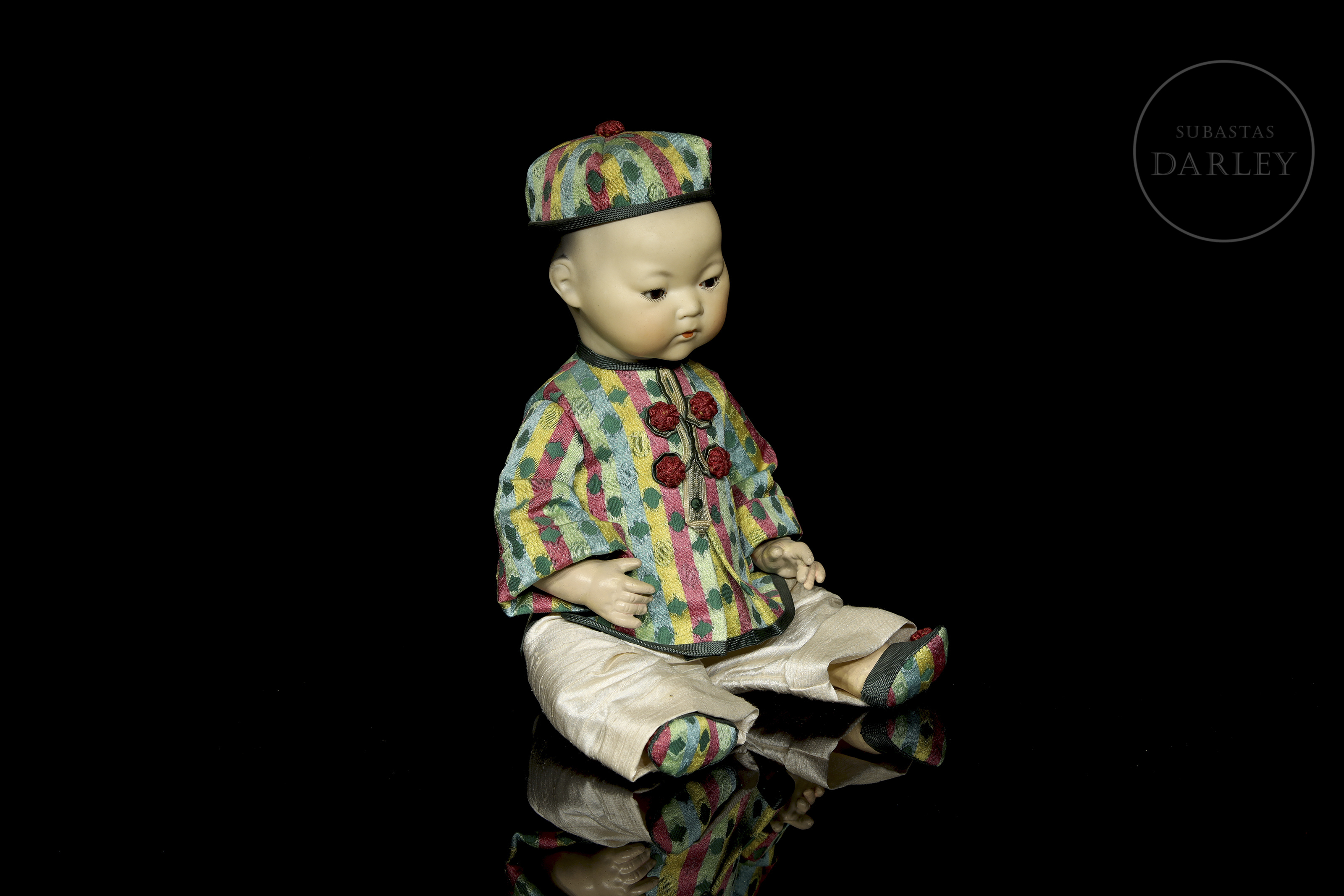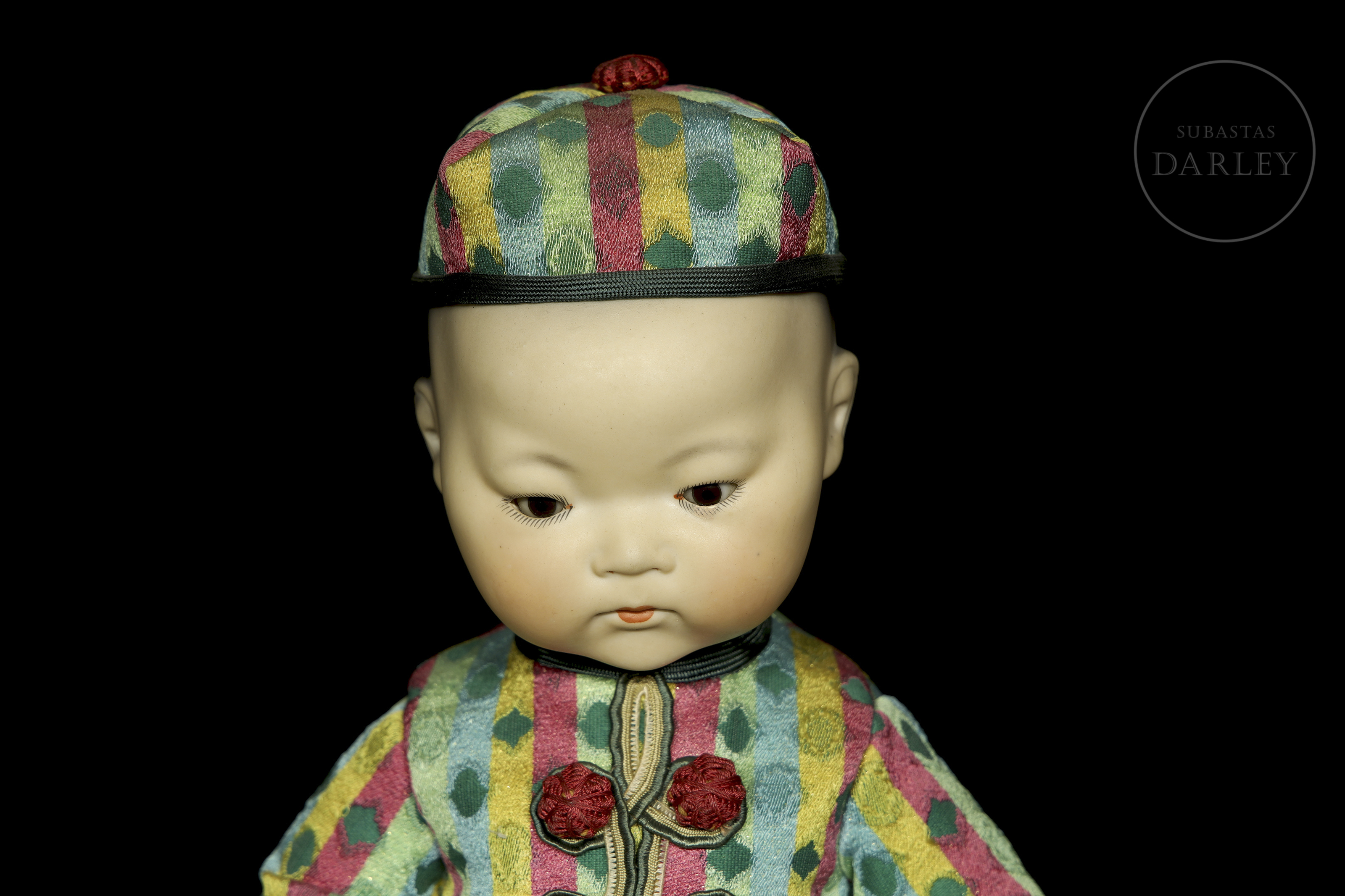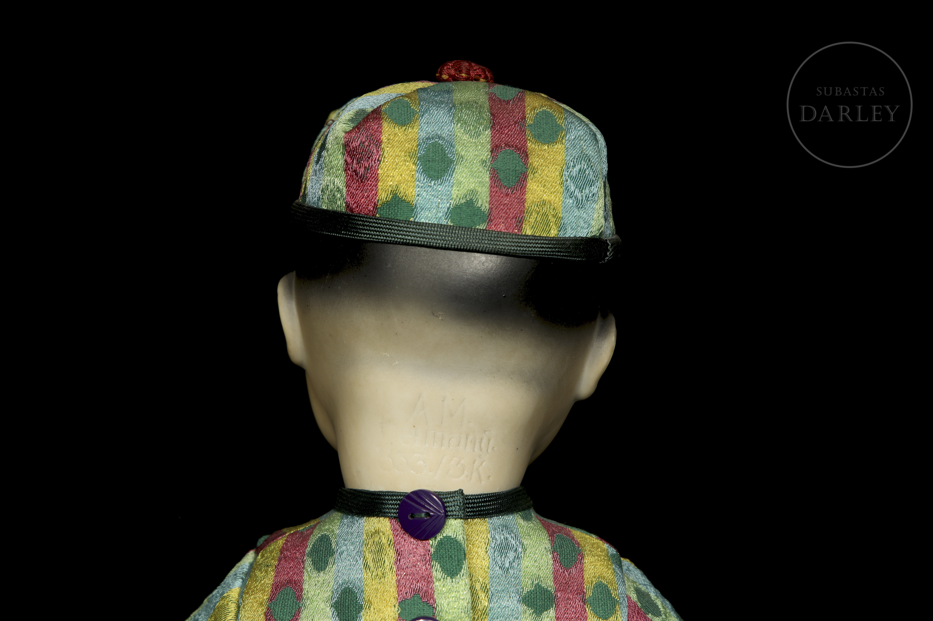 Muñeco antiguo tipo "bebé oriental" con cabeza de biscuit de boca cerrada y cuerpo articulado de composición. Presenta rasgos realistas de gran expresividad pintados a mano, ojos de cristal fijos y peluca de mohair negro. Con traje no original. Marcas incisas en la nuca: "A.M. / Germany / 353 / 3 1/2 K".