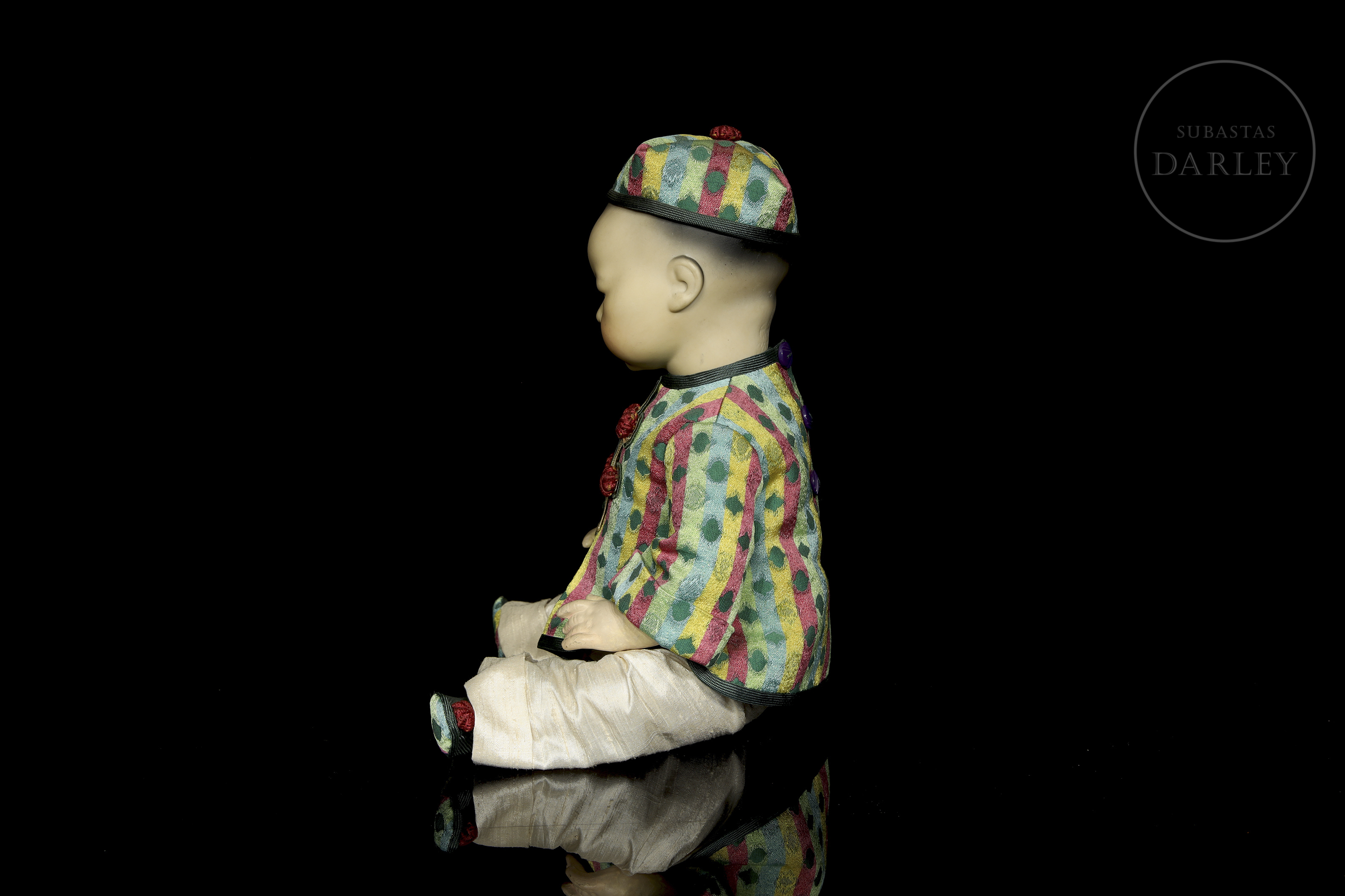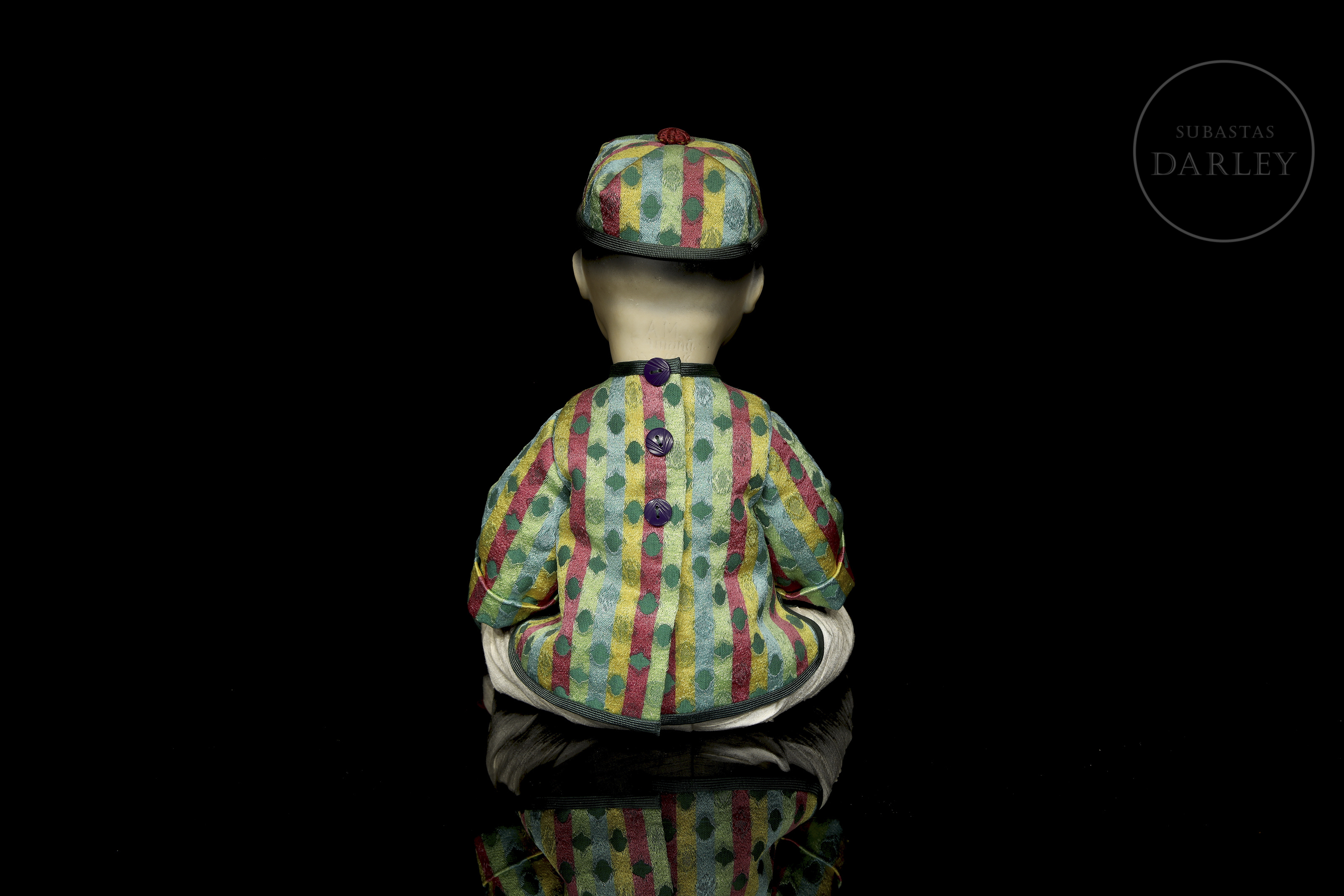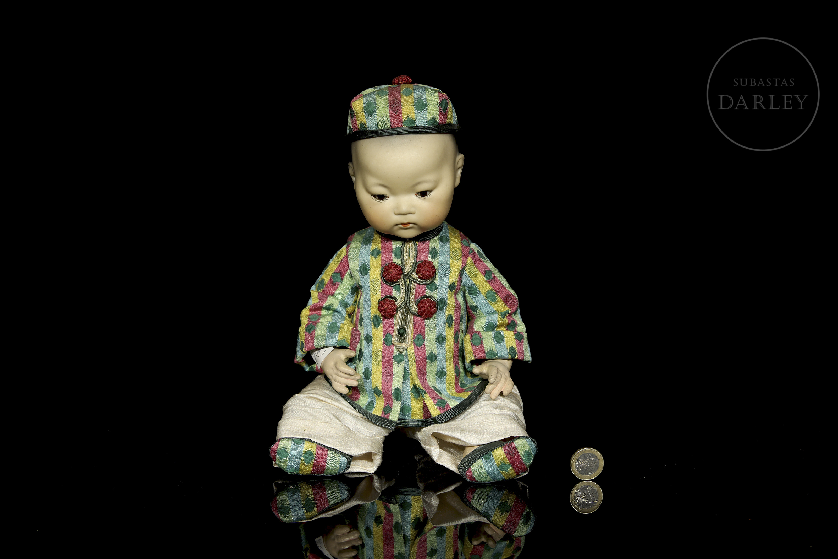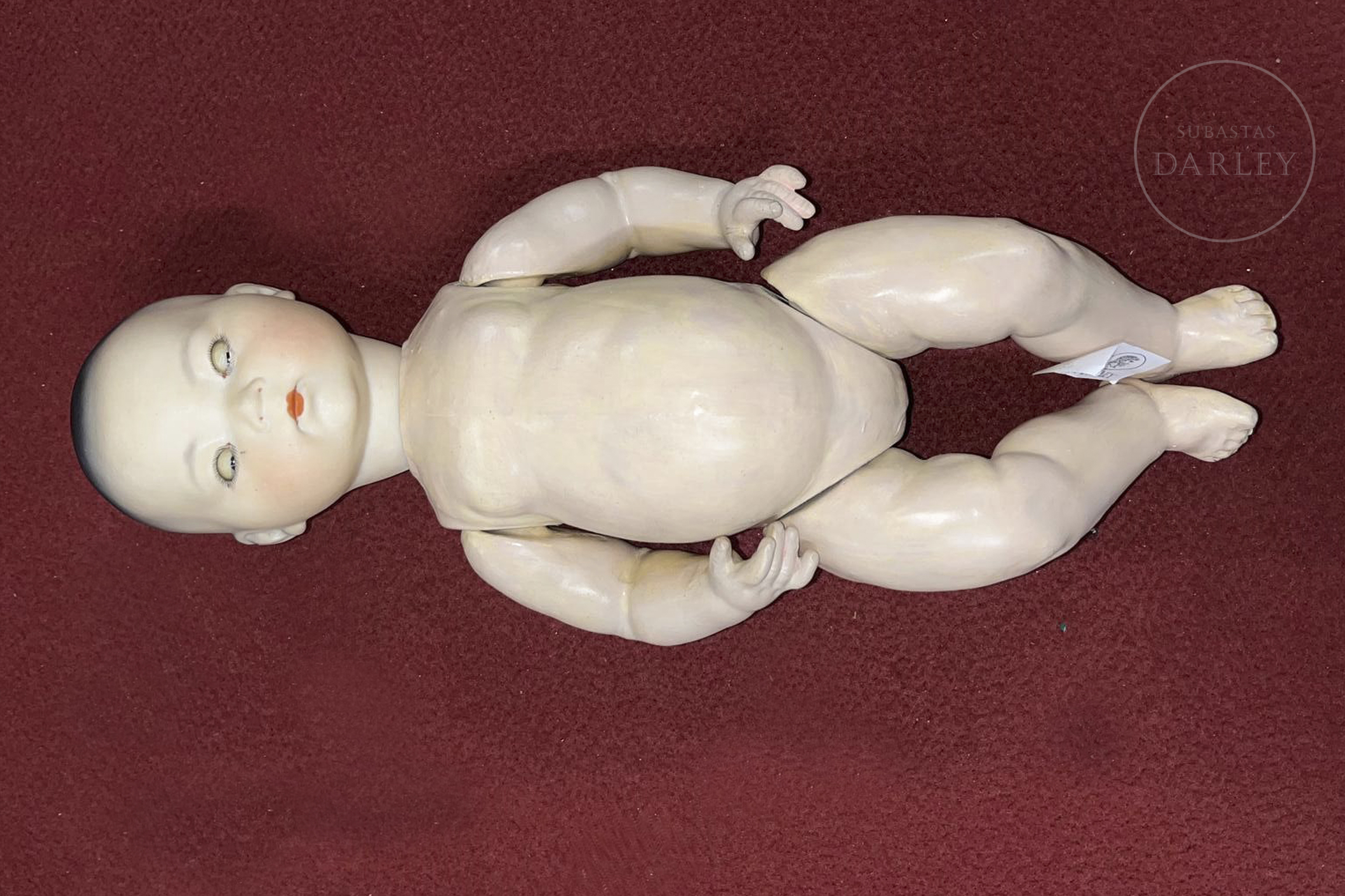Muñeco antiguo tipo "bebé oriental" con cabeza de biscuit de boca cerrada y cuerpo articulado de composición. Presenta rasgos realistas de gran expresividad pintados a mano, ojos de cristal fijos y peluca de mohair negro. Con traje no original. Marcas incisas en la nuca: "A.M. / Germany / 353 / 3 1/2 K".