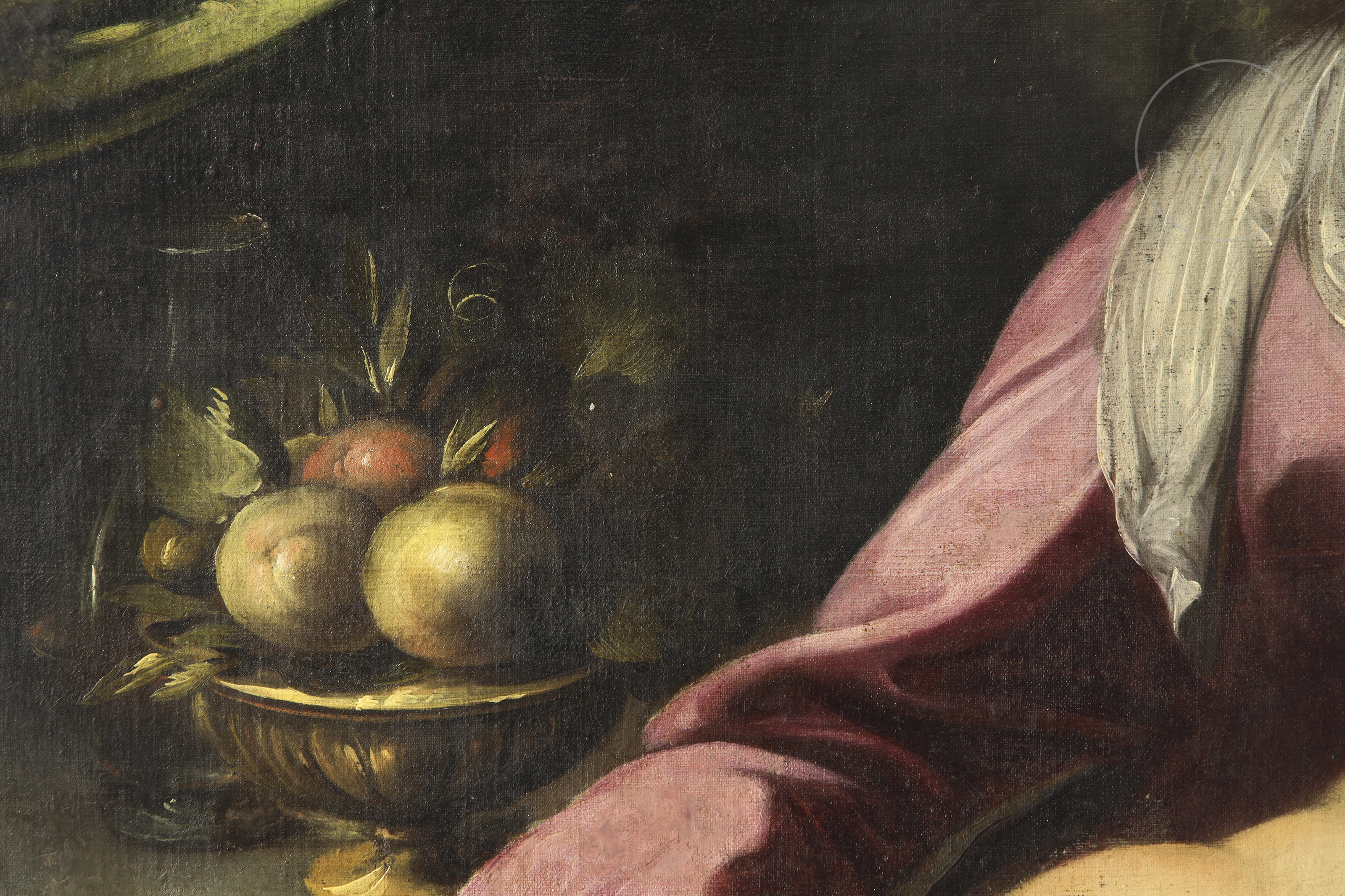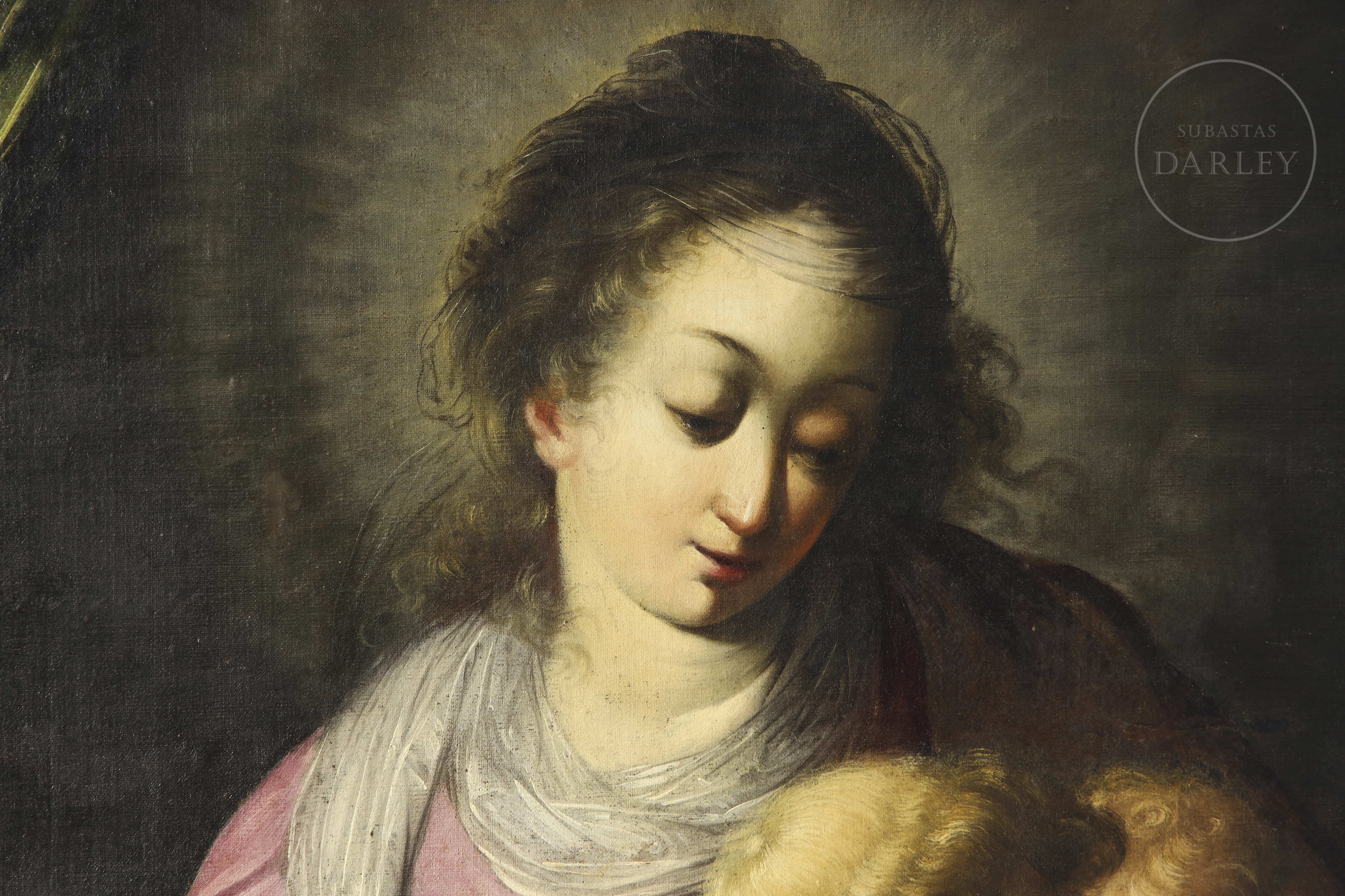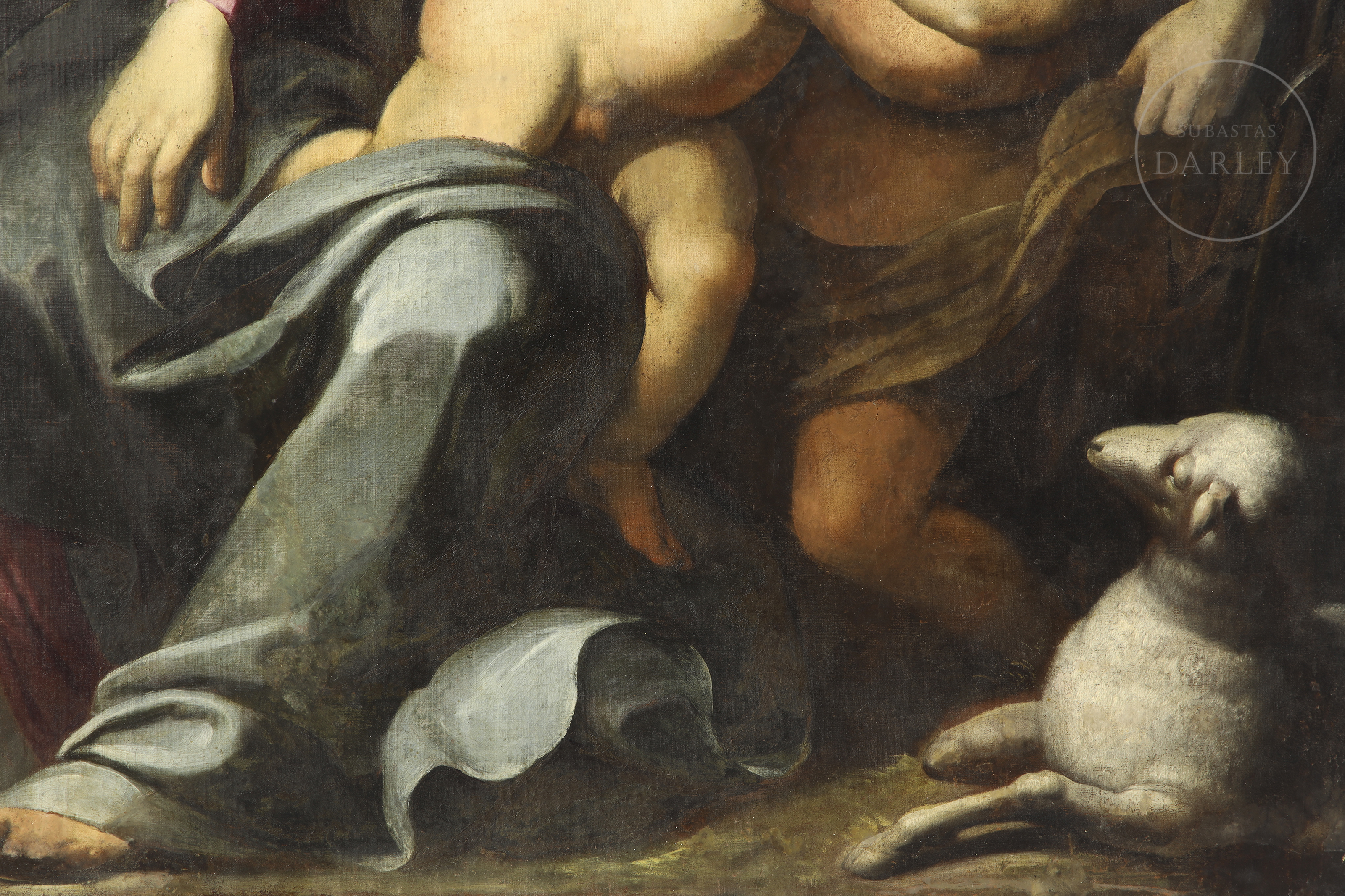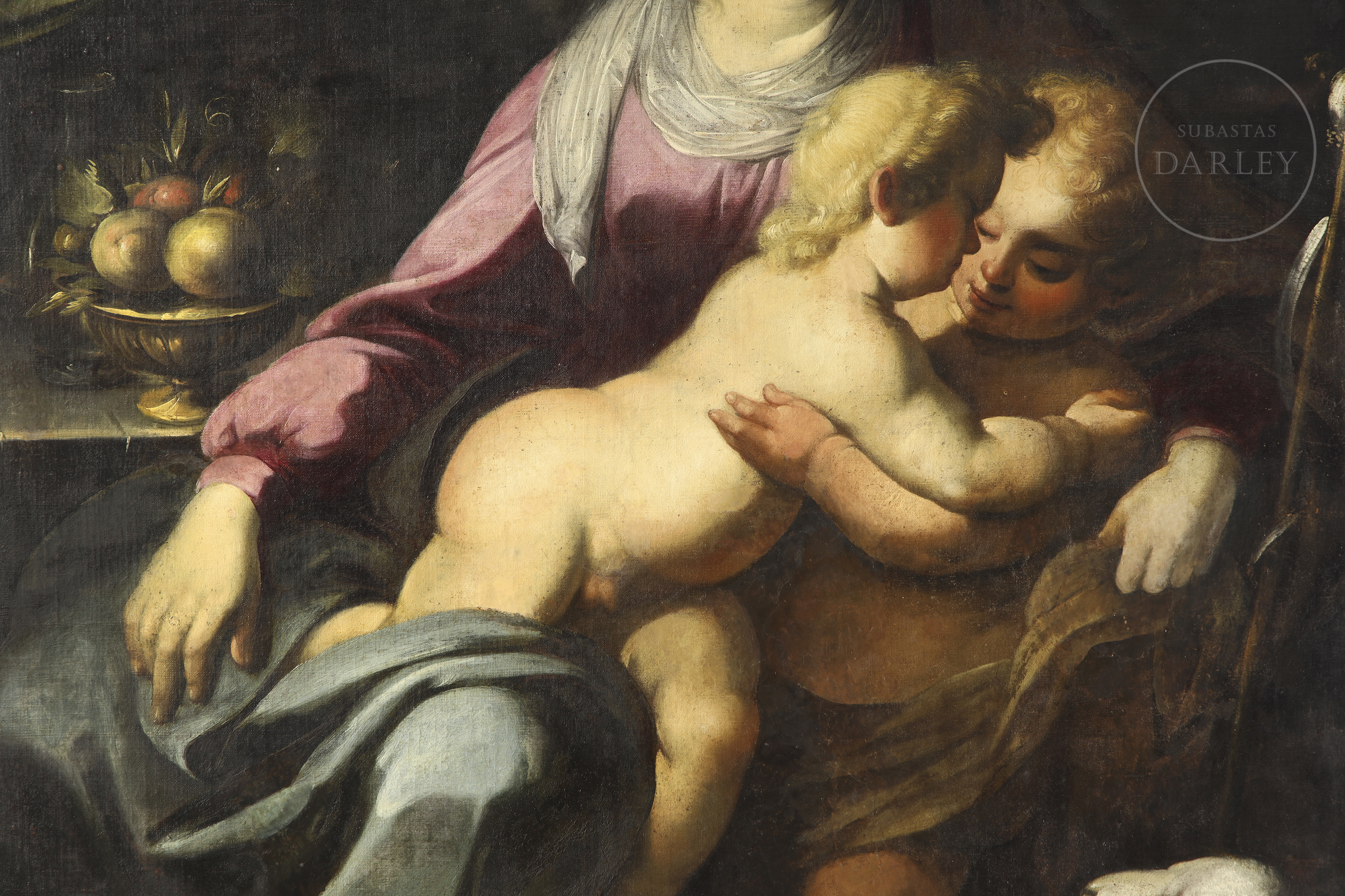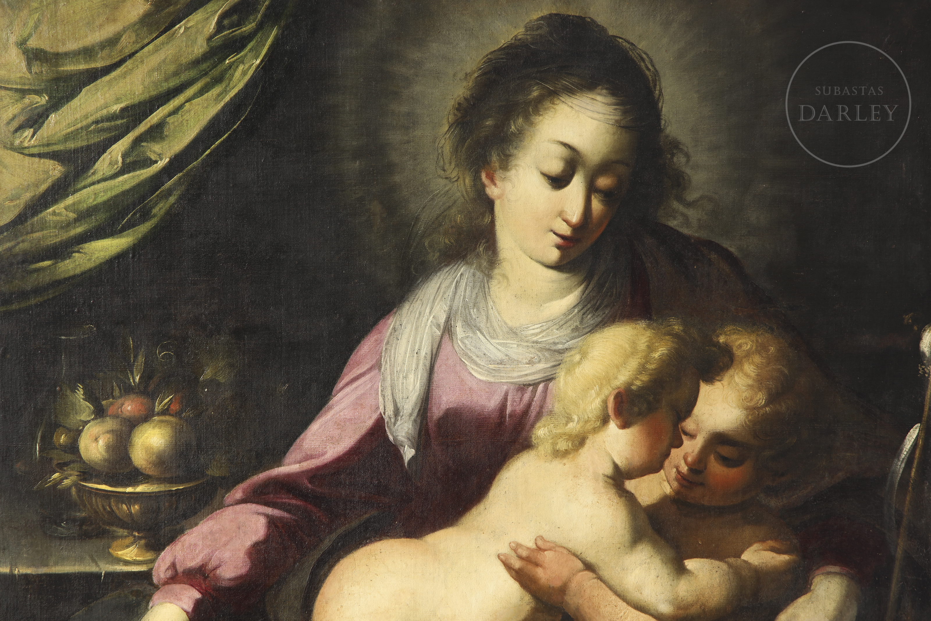 Óleo sobre lienzo. Pieza devocional, atribuida al maestro barroco genovés Simone Barabino. La composición piramidal sitúa a la Virgen María en el centro, ataviada, cuya mirada serena se dirige hacia los infantes. El Niño Jesús, representado con una fisonomía naturalista y carnaciones nacaradas, abraza cariñosamente a San Juanito, acompañado por el cordero místico a sus pies. La obra ha sido sometida a un riguroso proceso de restauración en el año 2009 por Julie de Robillard.