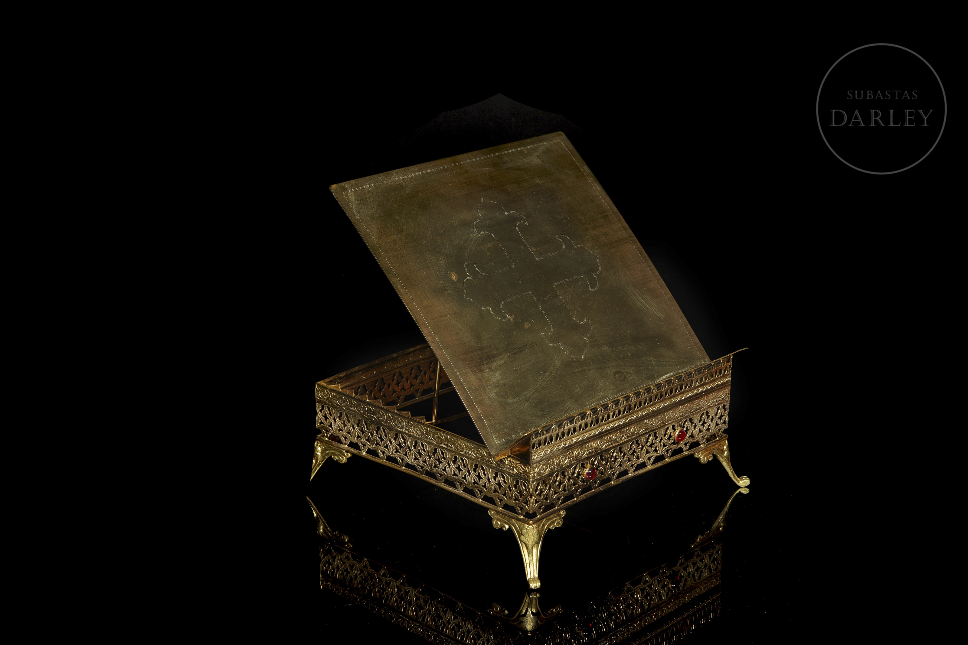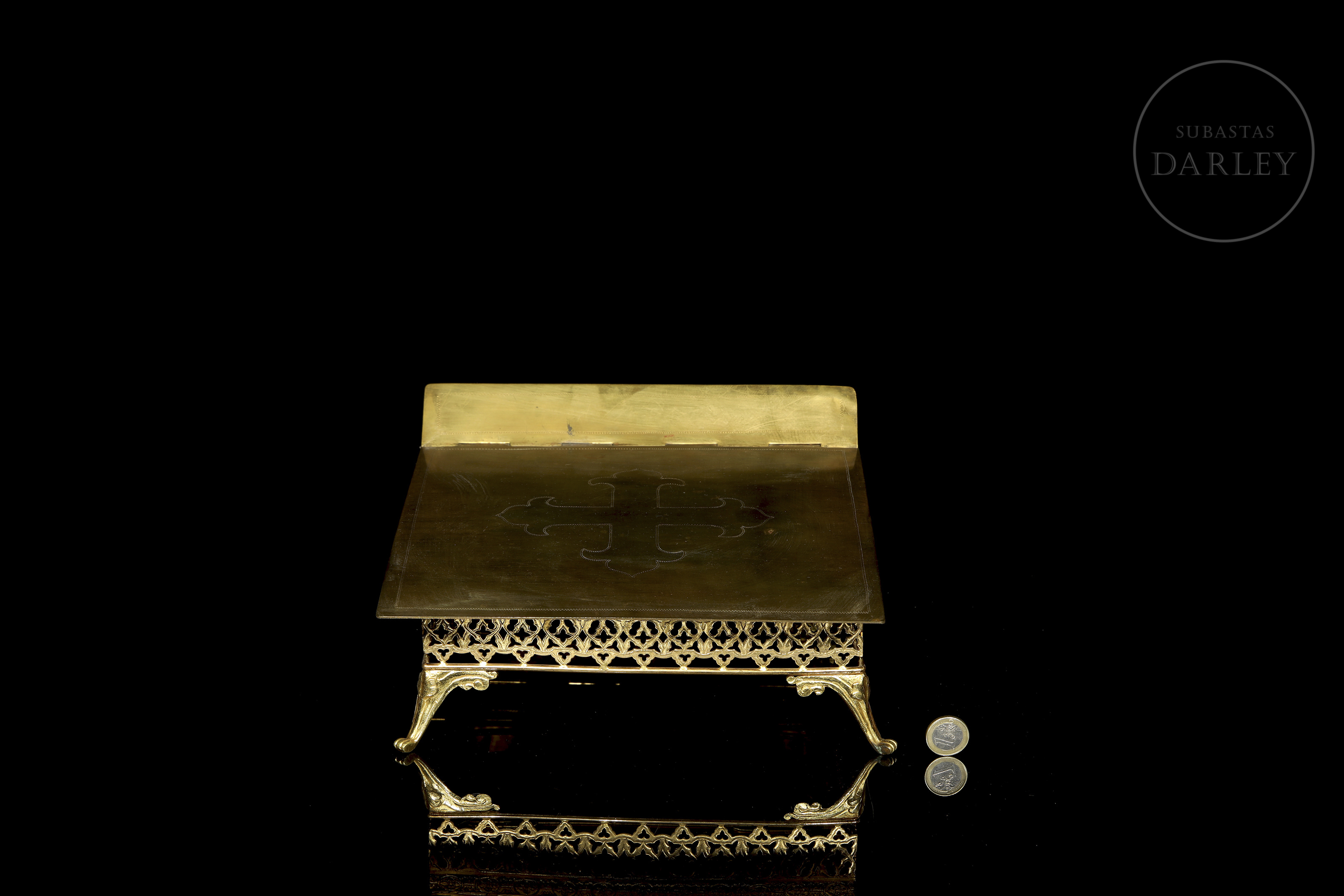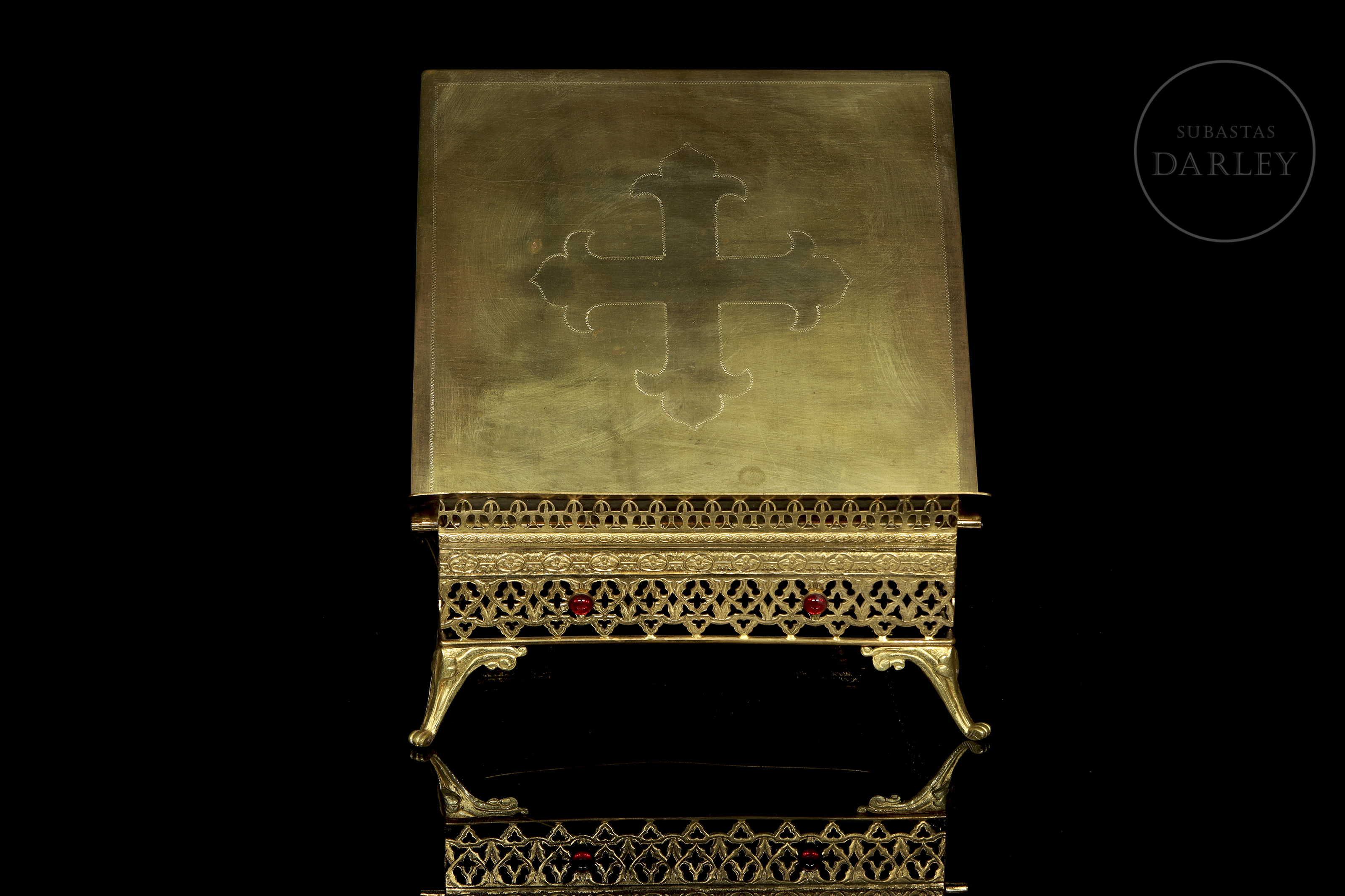 Pieza de orfebrería religiosa diseñada para el soporte de misales u otros textos sagrados en el altar. El diseño destaca por su base calada con motivos neogóticos y un tablero central decorado con una cruz grabada.