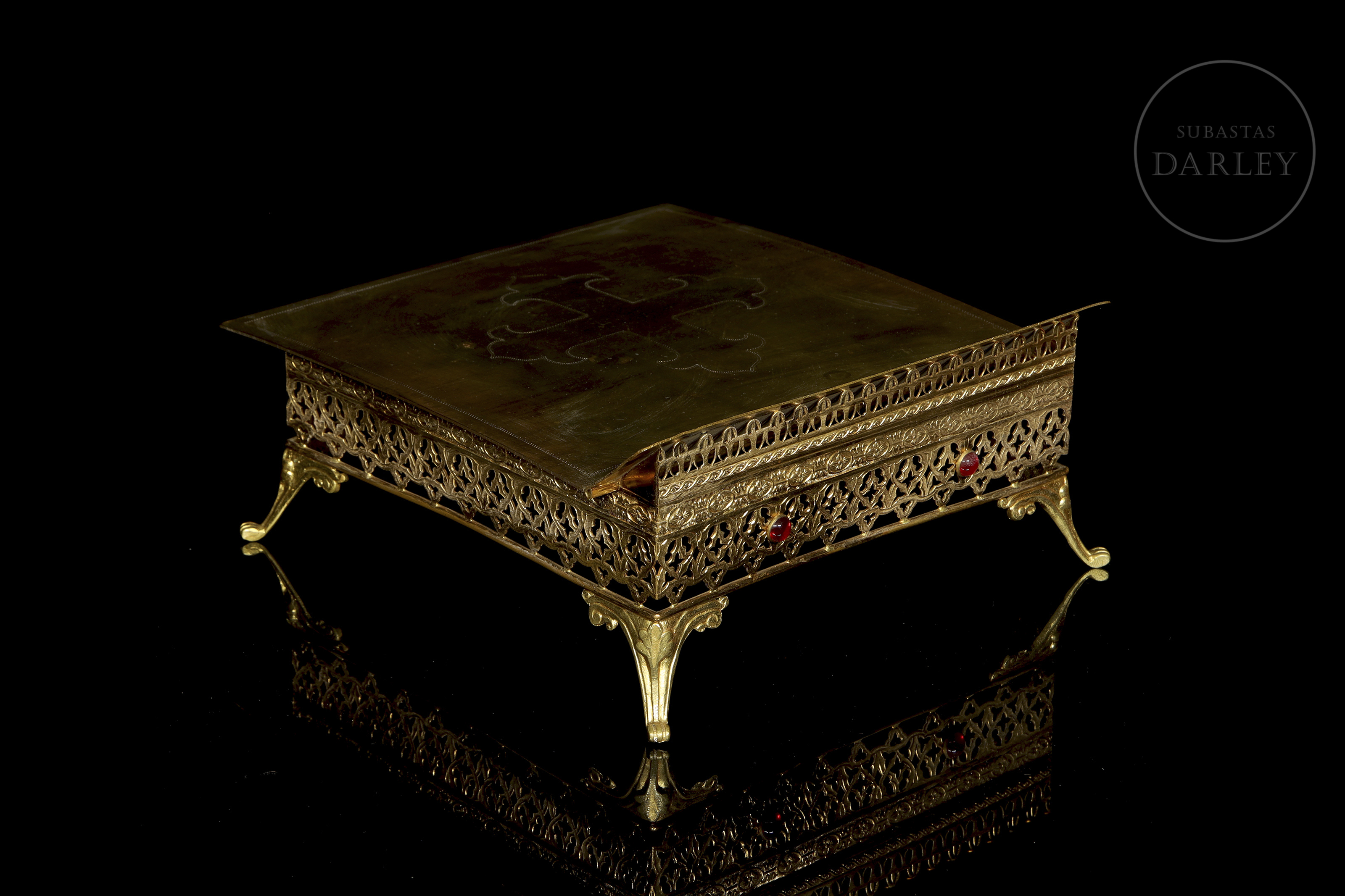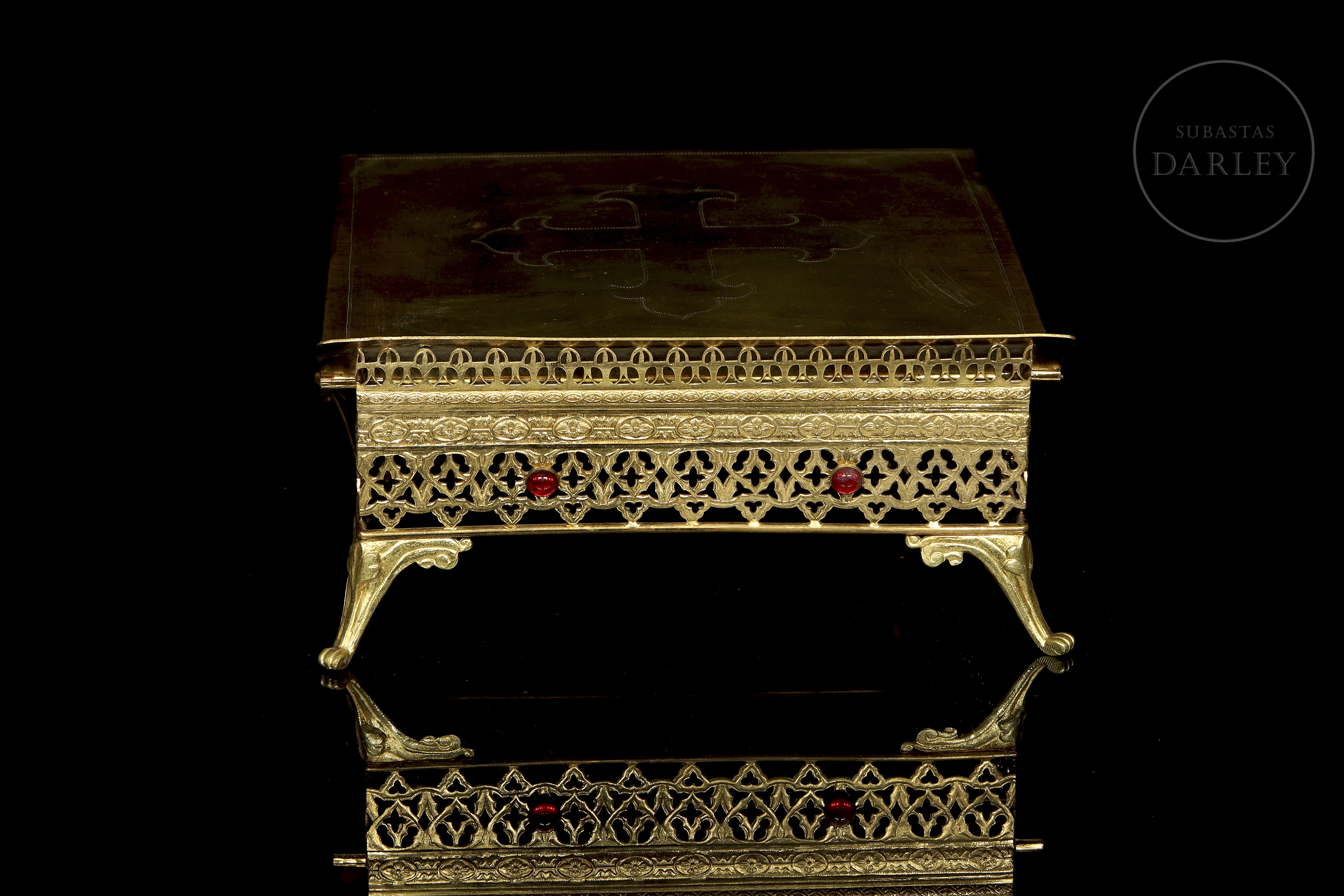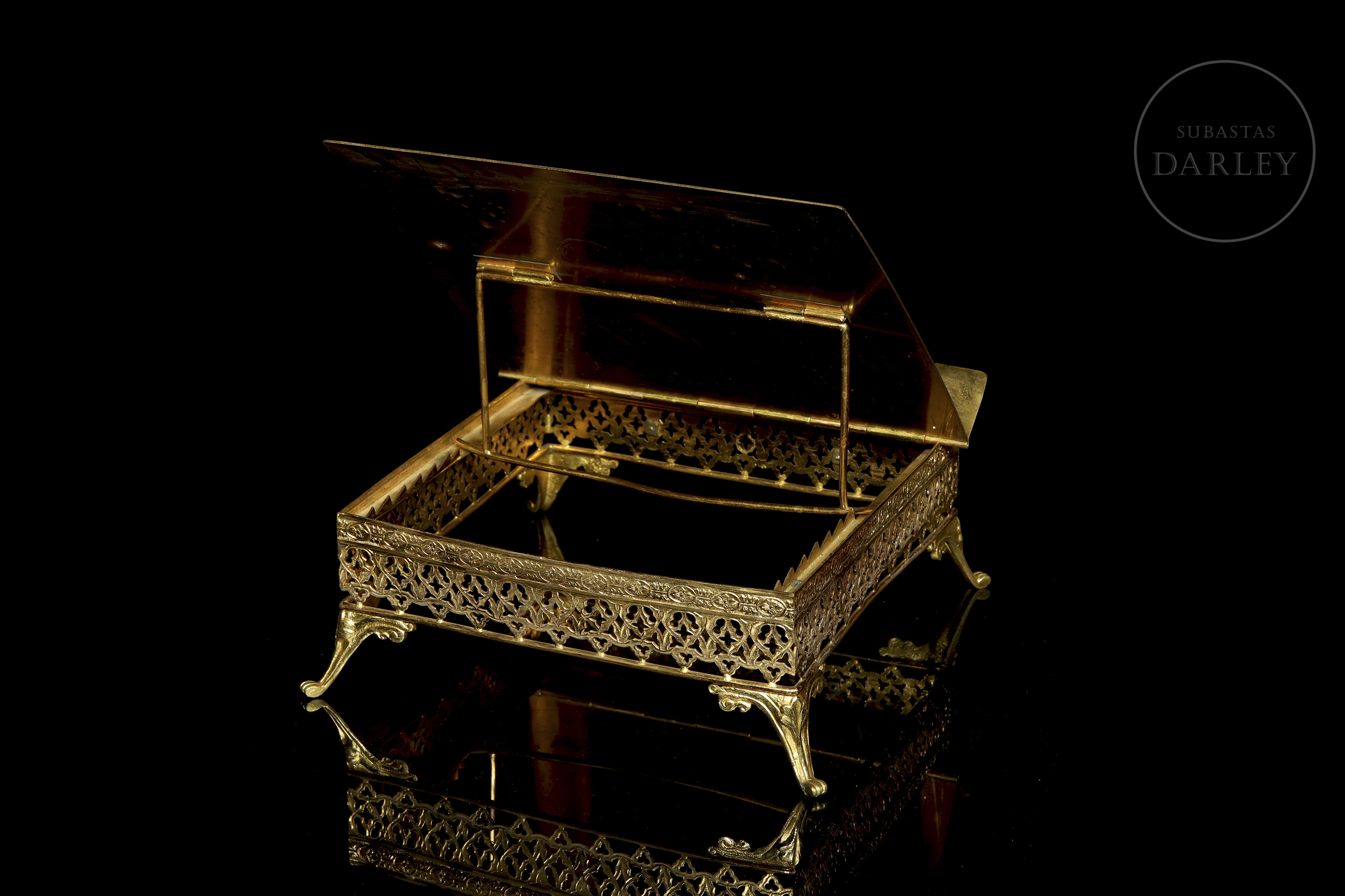 Pieza de orfebrería religiosa diseñada para el soporte de misales u otros textos sagrados en el altar. El diseño destaca por su base calada con motivos neogóticos y un tablero central decorado con una cruz grabada.