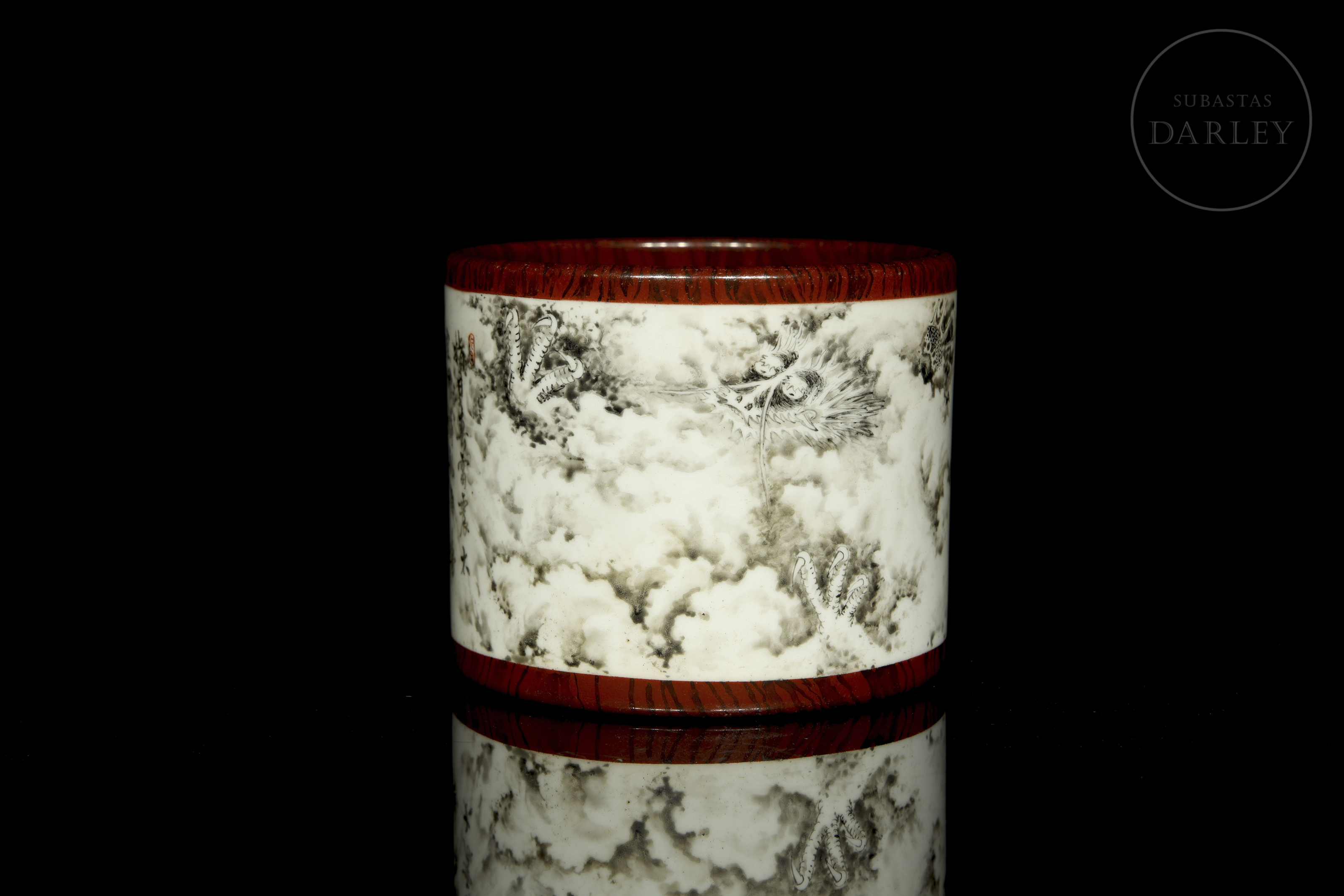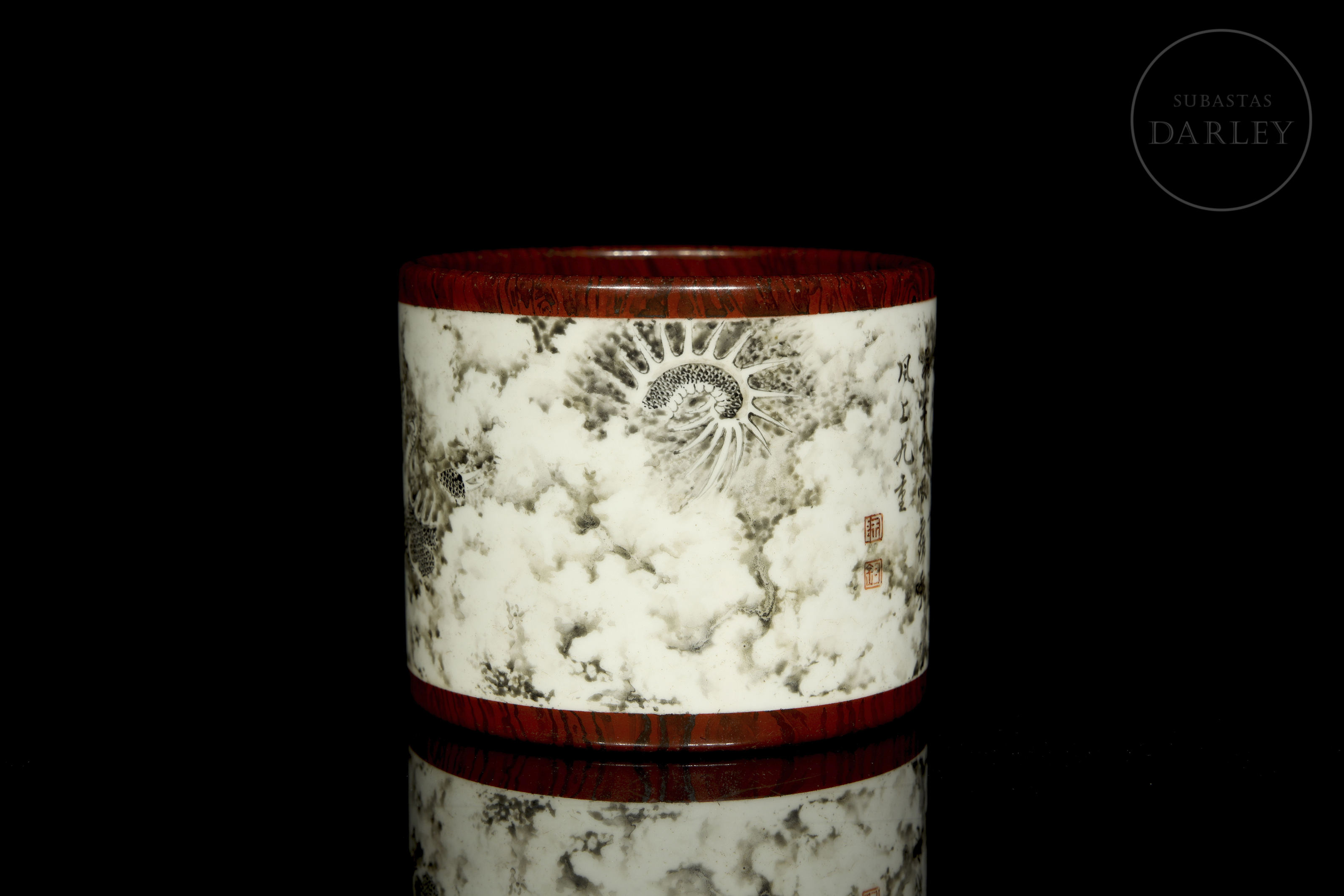 Bote de porcelana para pinceles "bitong" de base cilíndrica y paredes rectas. Está decorado con esmaltes policromados, sobre y bajo vidriado. El interior, base y boca, muestran un sinuoso patrón de vetas sobre fondo marrón, que imitan la textura de la madera natural; mientras que el exterior posee un fondo blanco, cubierto por sutiles nubes entre las que asoman afiladas garras y el escamado cuerpo de un feroz dragón, que recorre el perímetro y enmarca un largo poema. En la base se dispone un sello bajo vidriado "大清乾隆年制".