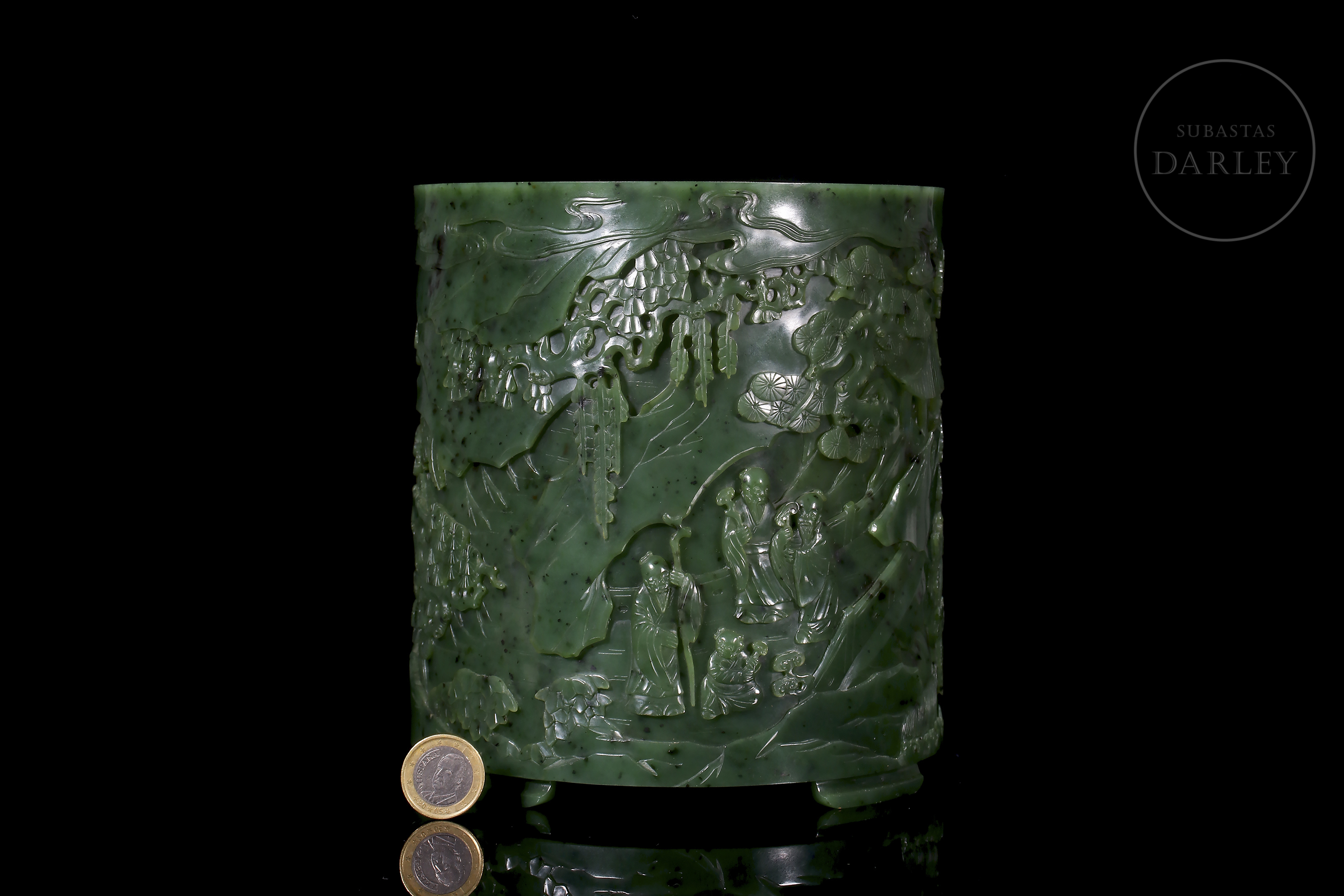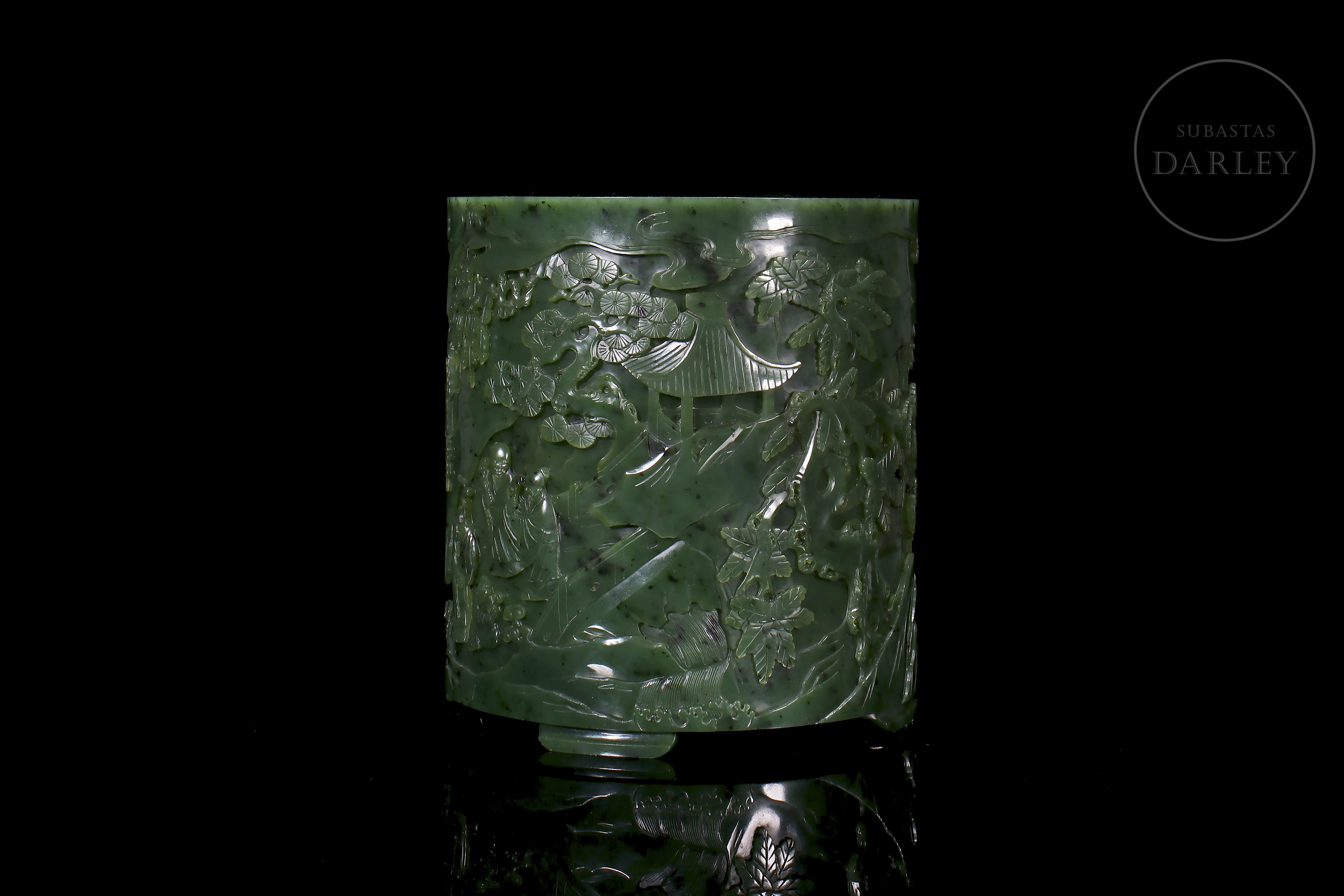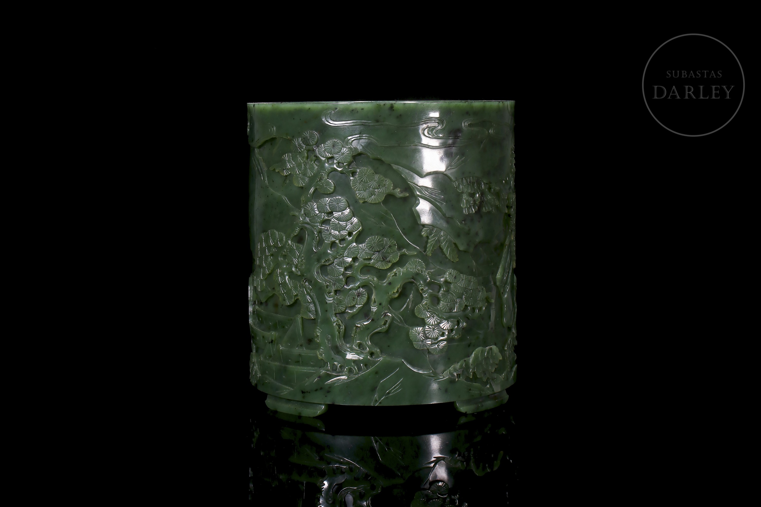 Bote para pinceles de jade verde espinaca de Hetian "Paisaje", dinastía Qing