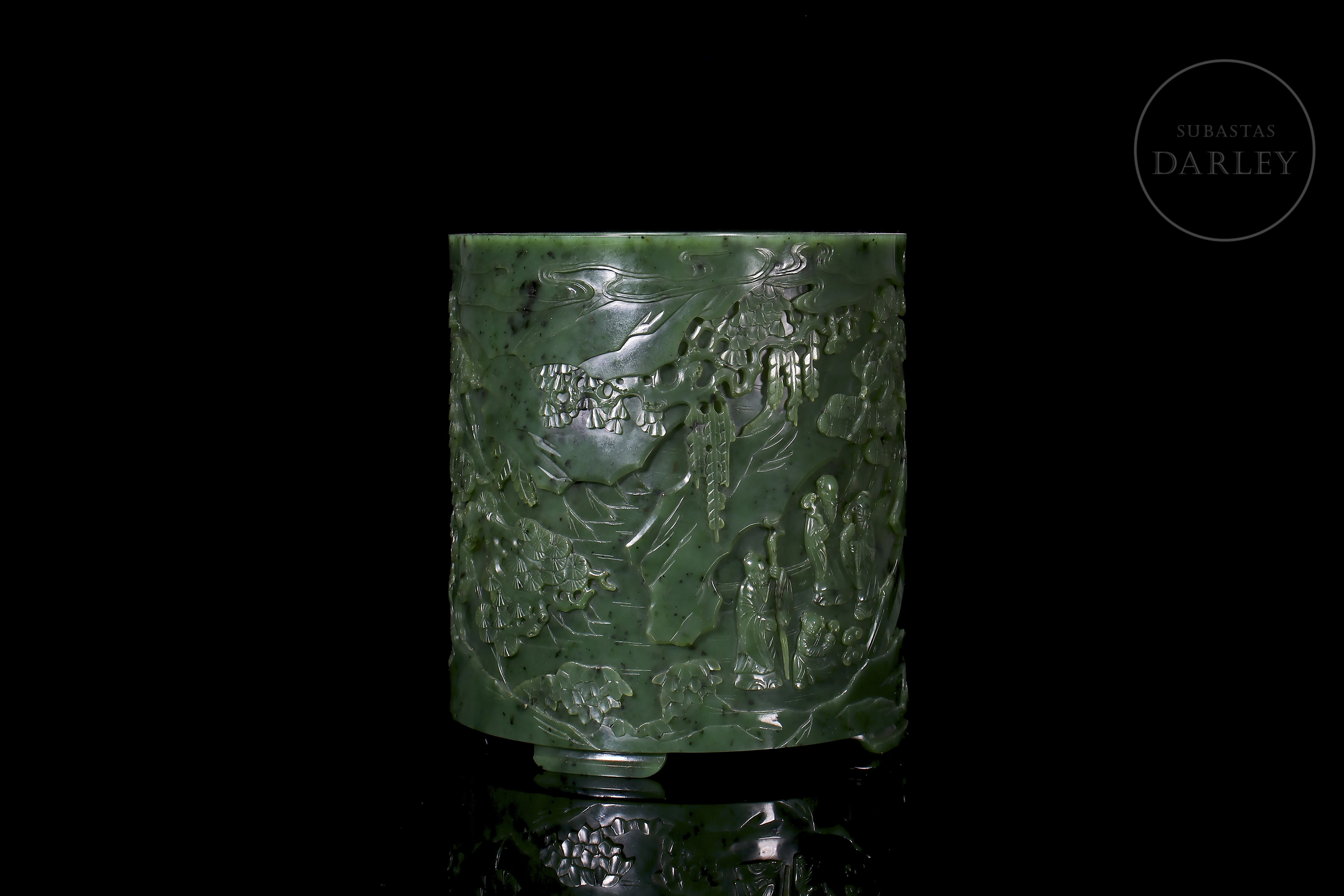 Bote para pinceles (bitong) tallado de jade de intenso color verde espinaca procedente de Hetian. Posee forma cilíndrica, con un cuerpo macizo y paredes lisas en el interior. Se encuentra adornado por una compleja escena de paisaje continuo, tallada en alto relieve, que envuelve la superficie. Representa un paisaje montañoso poblado por eruditos, sirvientes y niños que caminan entre pinos, ciruelos en flor, pabellones y puentes. La base está esculpida con pequeñas patas de soporte. Dinastía Qing (1644–1912).