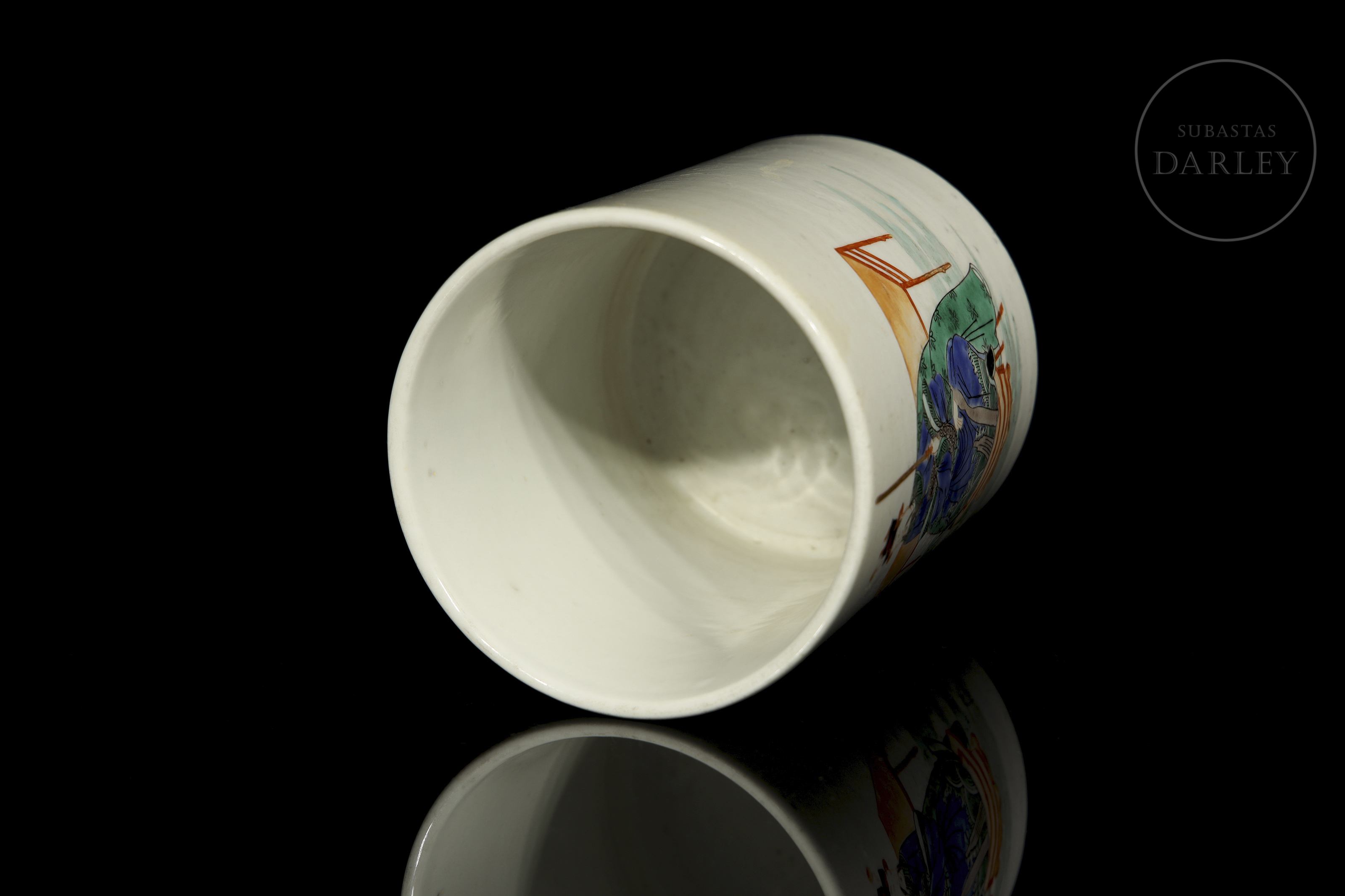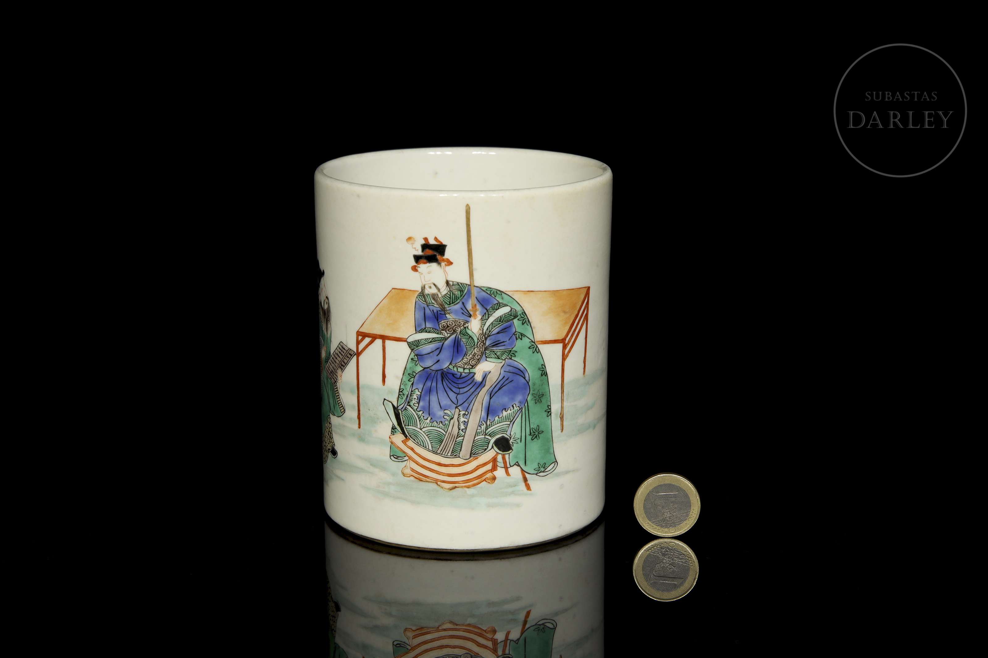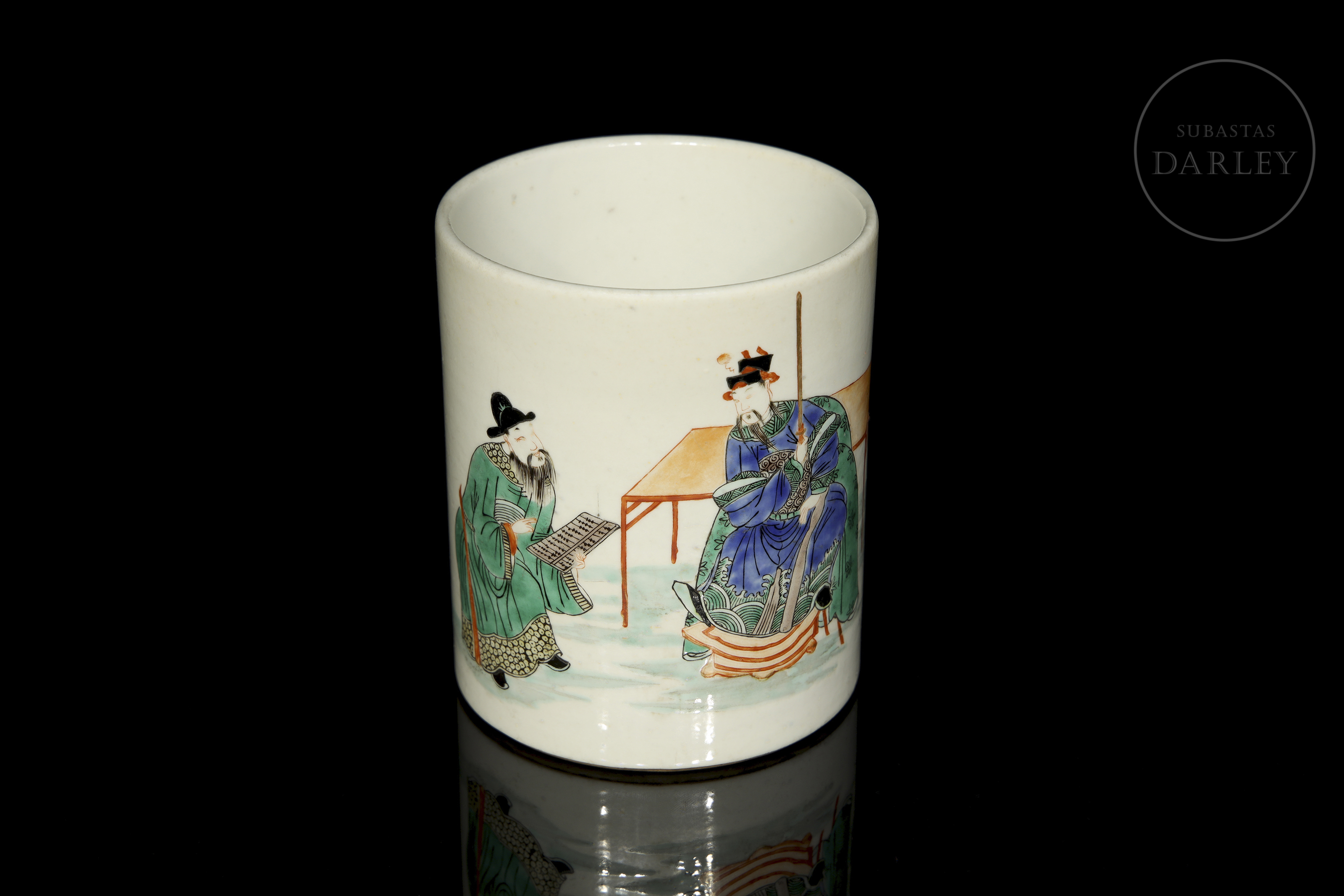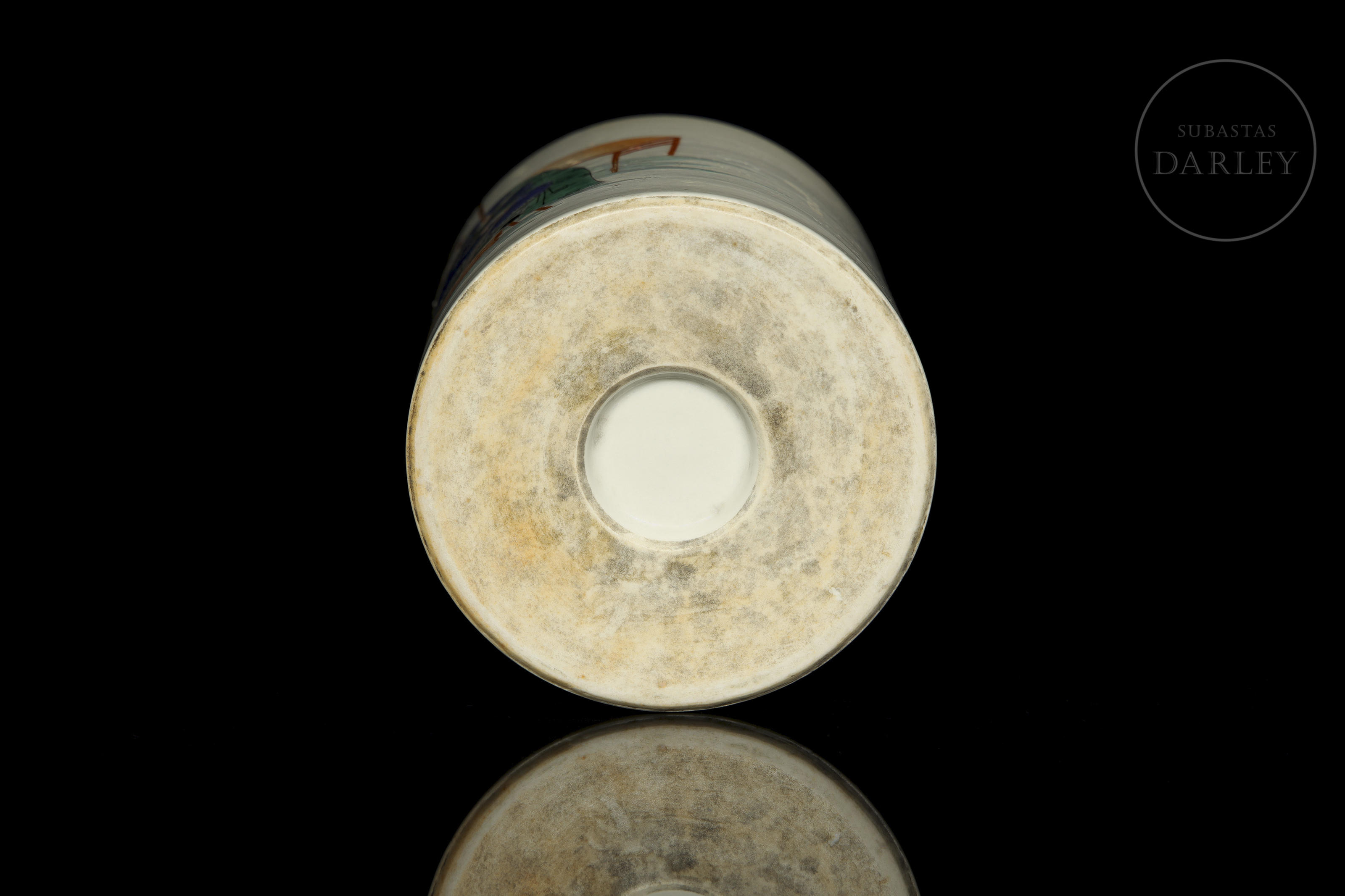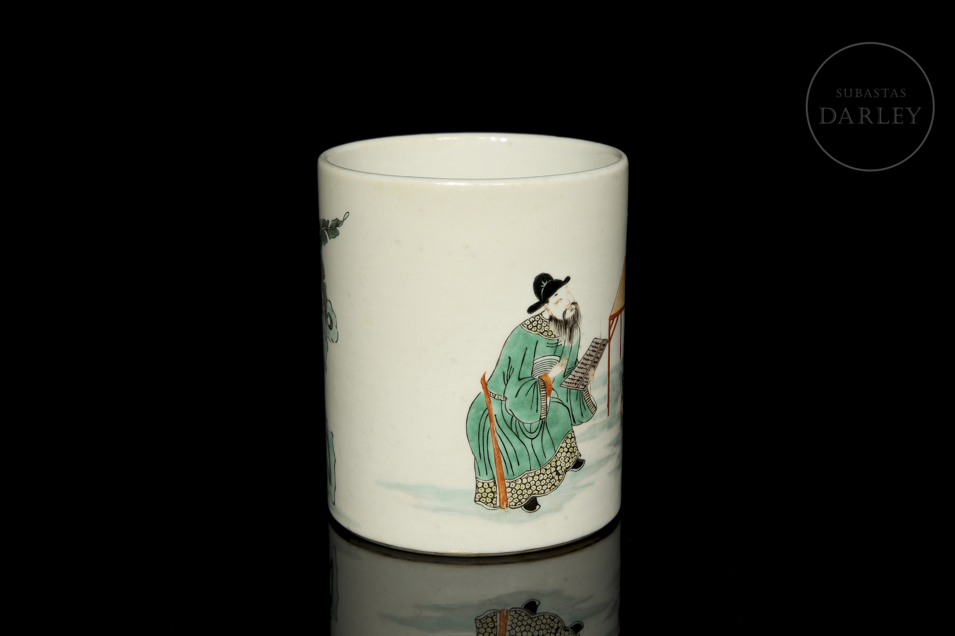 Bote para pinceles de porcelana "Escena", dinastía Qing