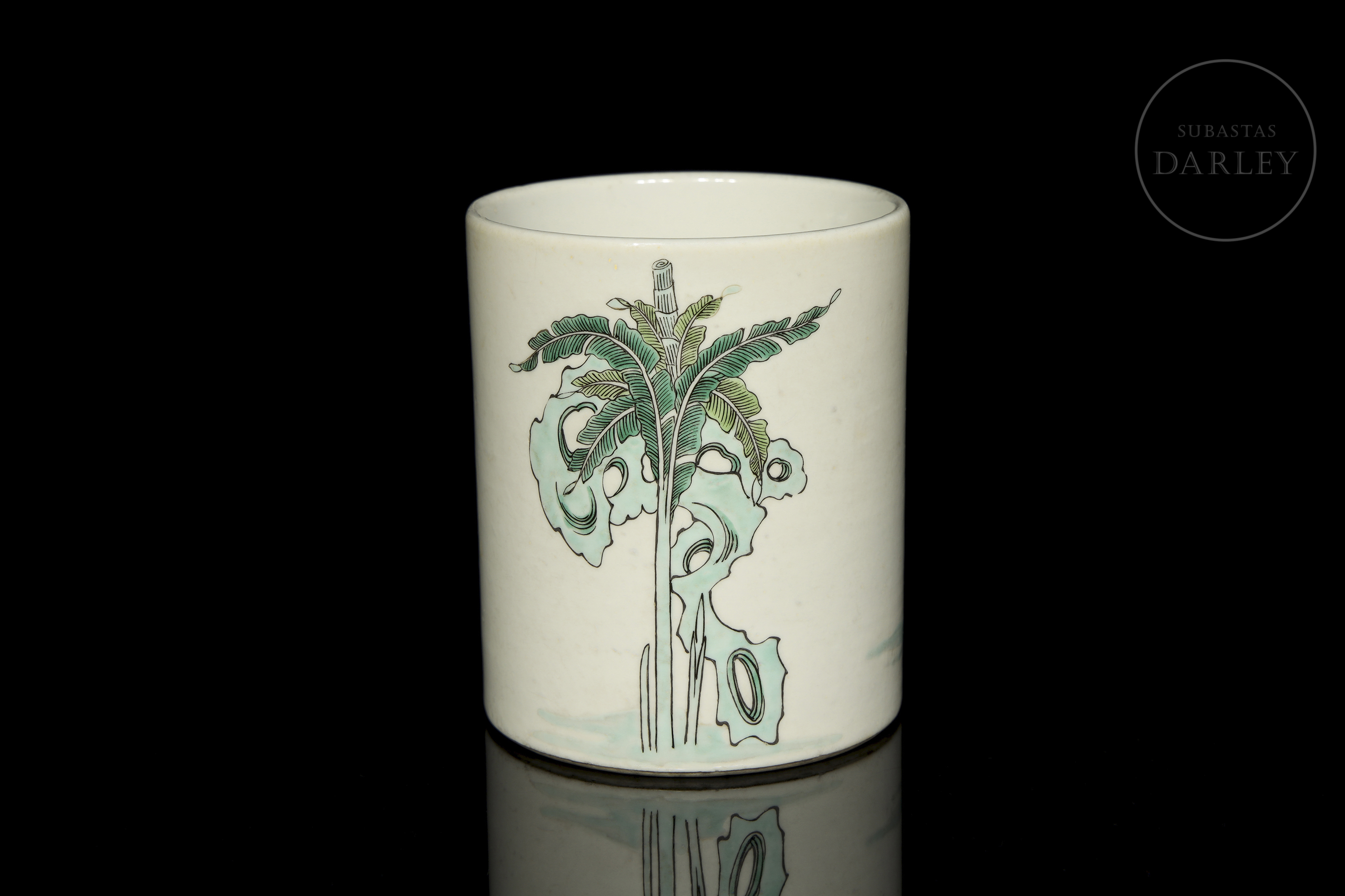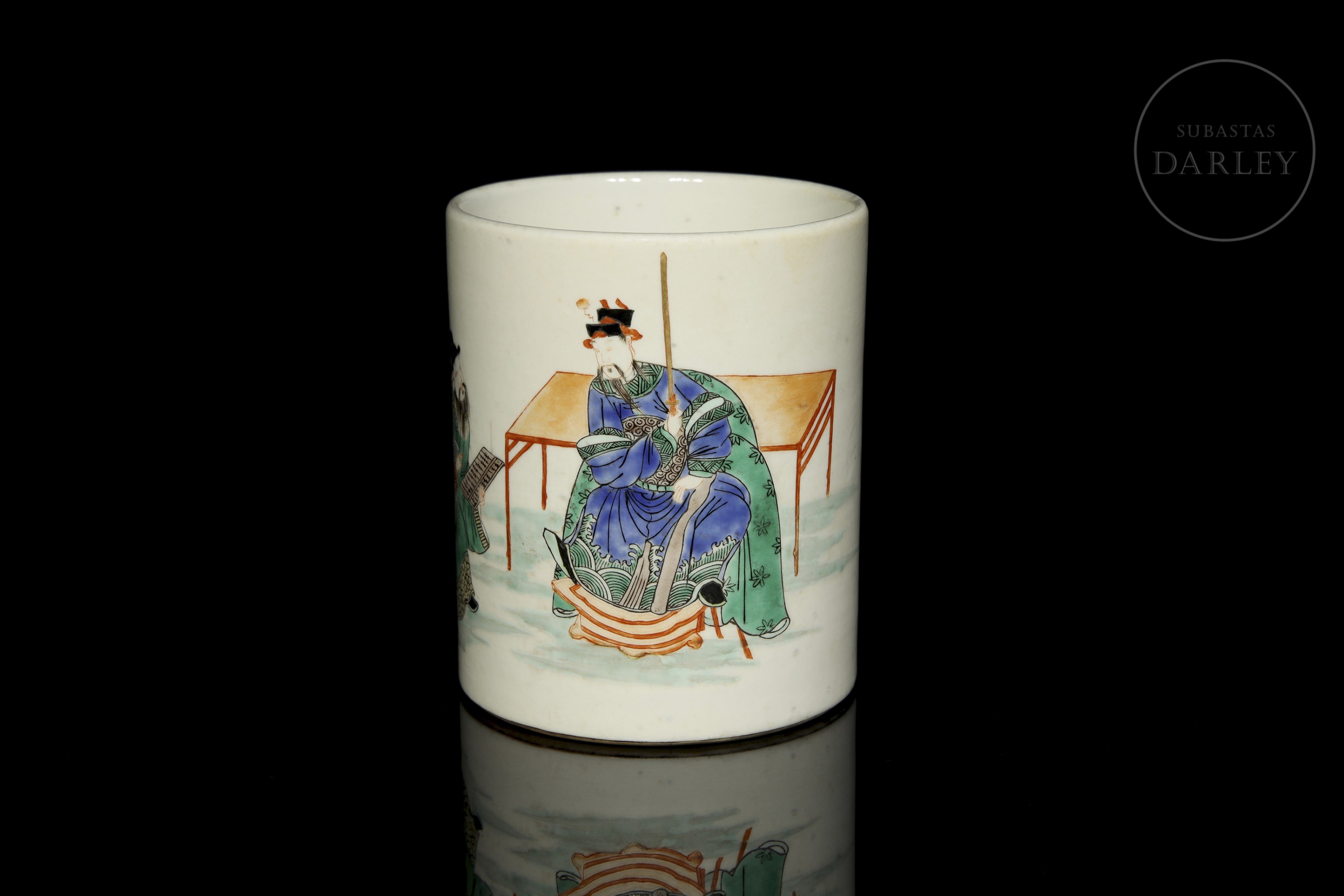 Recipiente para pinceles de porcelana, conocido como Bitong, de cuerpo cilíndrico y cubierto por un esmalte blanco. El exterior se encuentra decorado por una escena continua que envuelve la pieza, pintada con esmaltes polícromos sobre vidriado. La escena representa a dos personajes, un noble y su contable en un entorno de jardín. Dinastía Qing (1644-1912) o posterior.