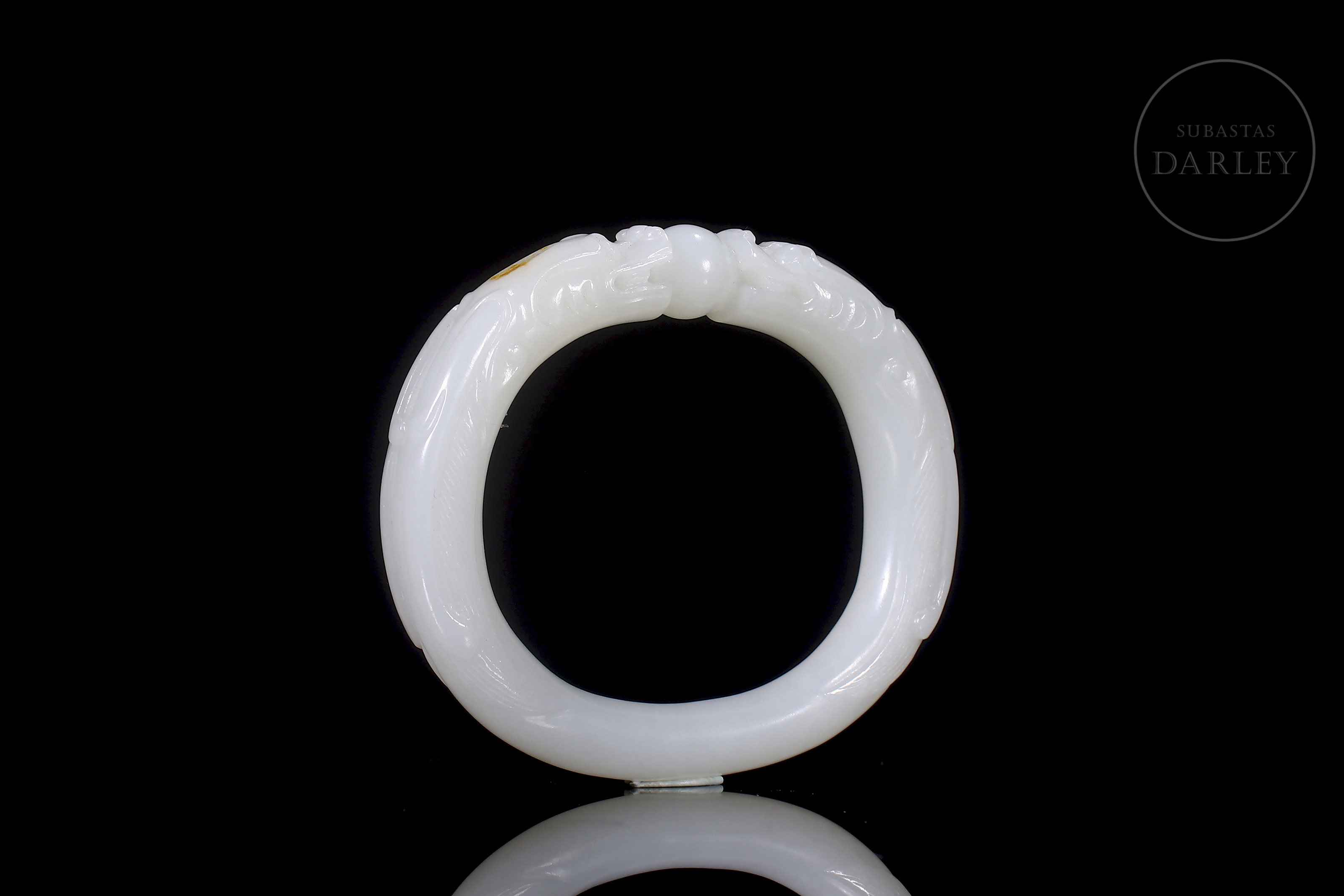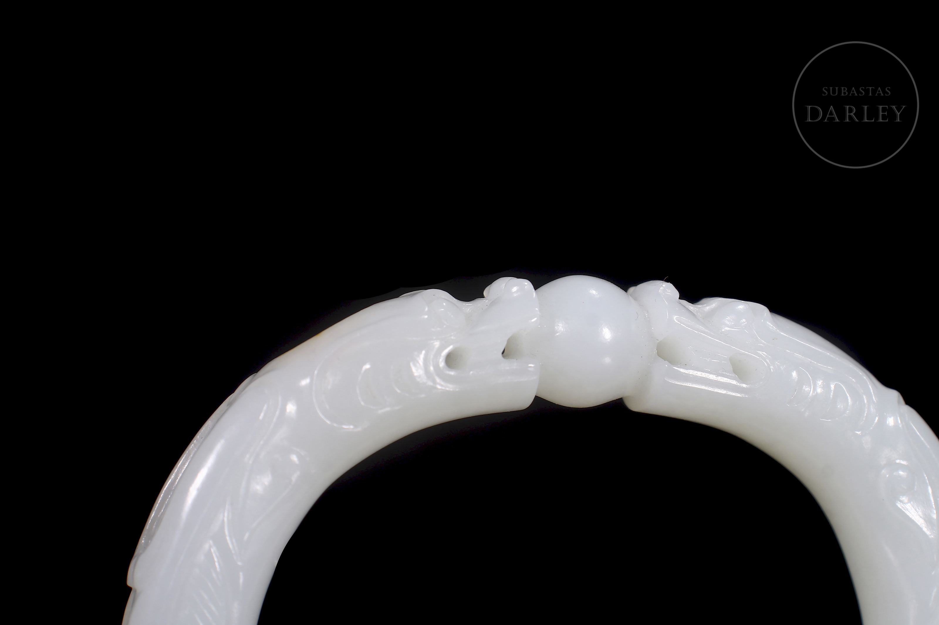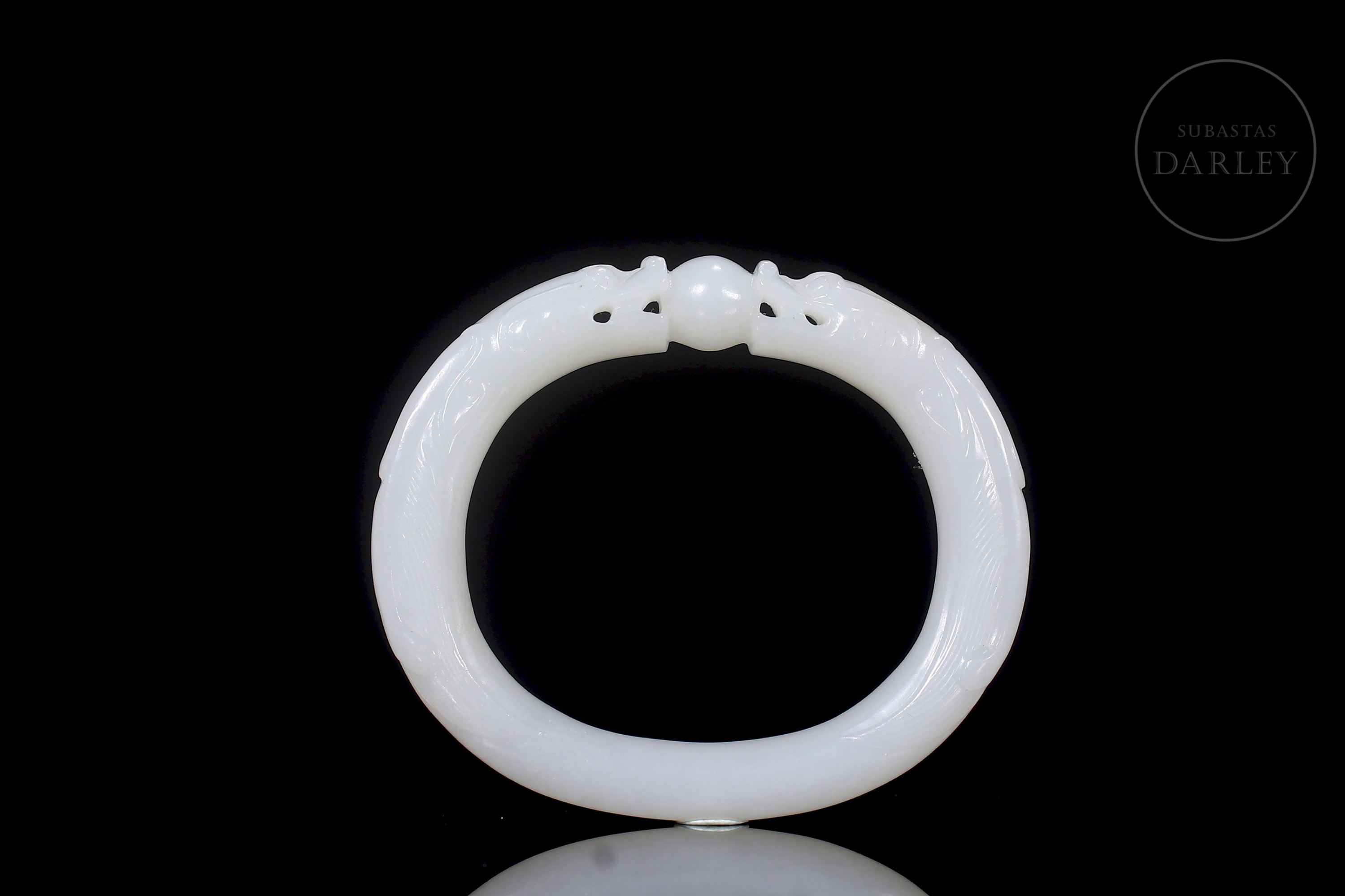 Brazalete tallado de jade de forma elíptica y perfil redondeado, de color blanco puro y lechoso. Tallado para simular dos dragones cuyas cabezas están talladas en altorrelieve y se encuentran sobre una perla, mirándola fijamente. Los cuerpos de los dragones forman la estructura del brazalete. Con caja forrada a medida. Dinastía Qing (1644–1912).