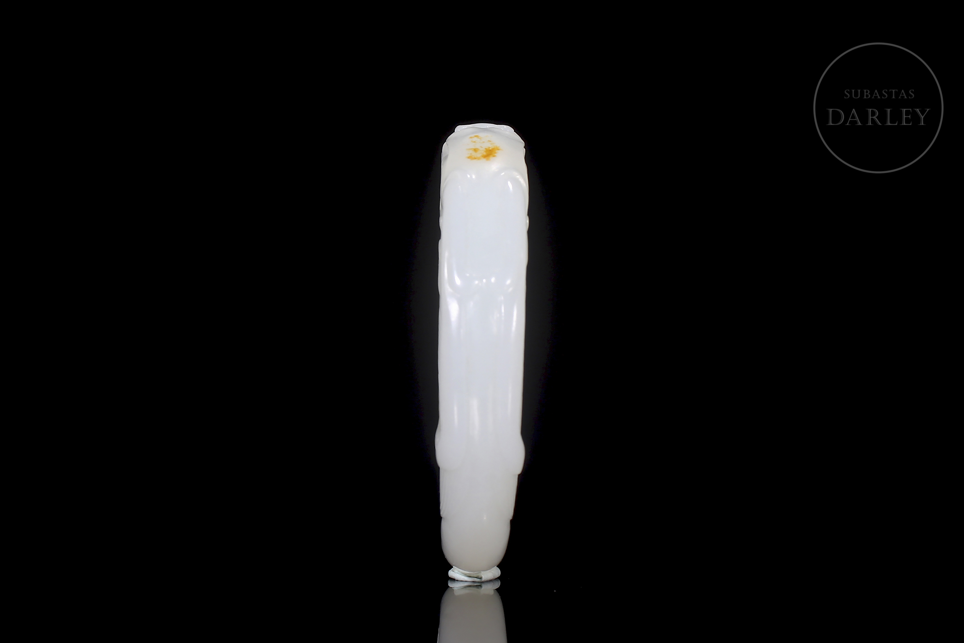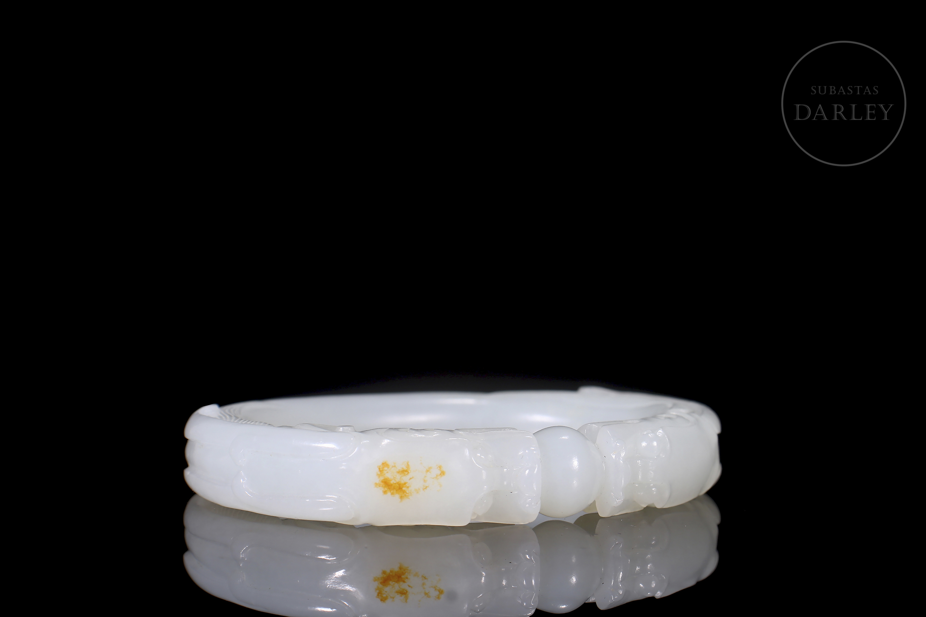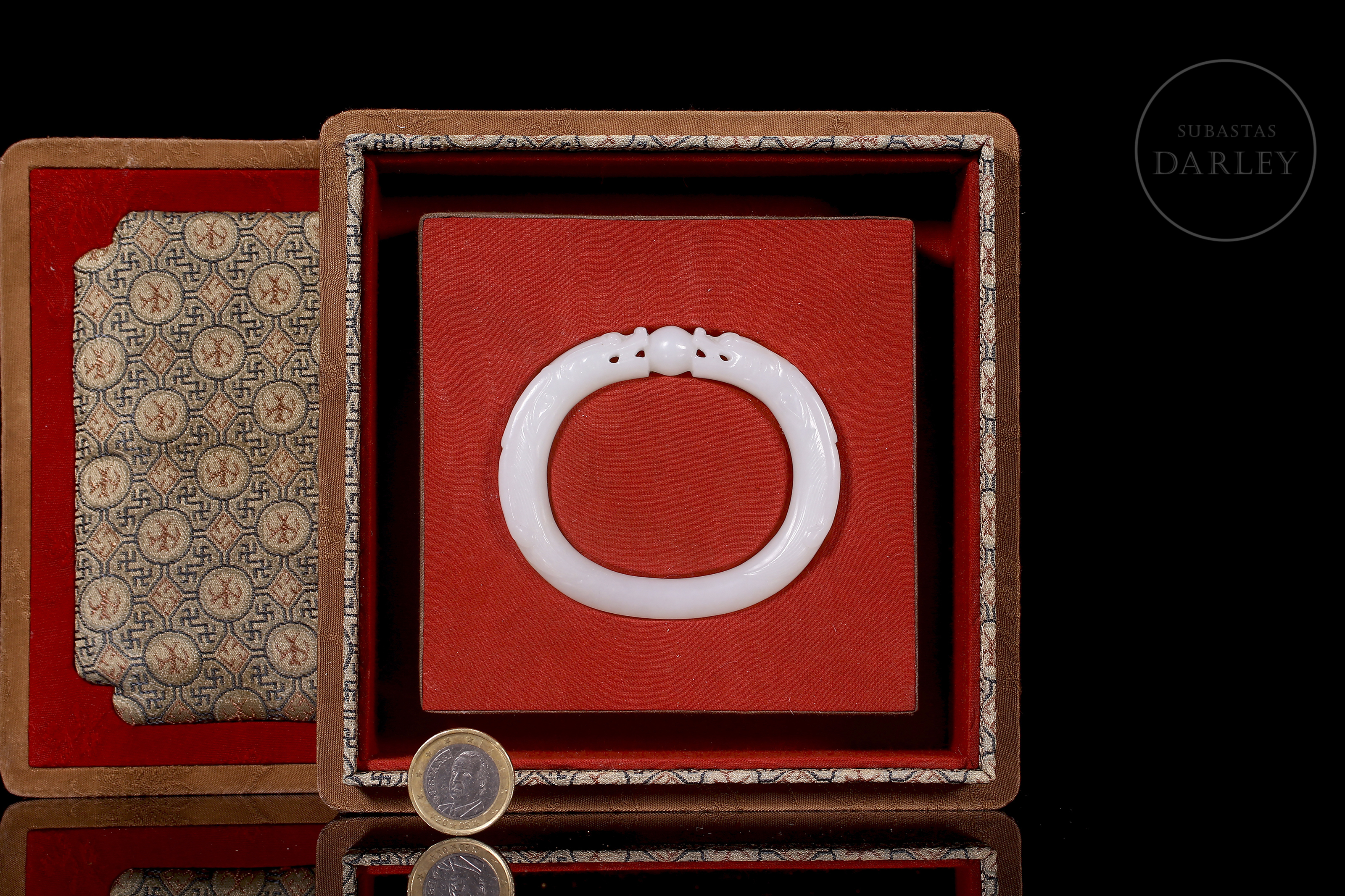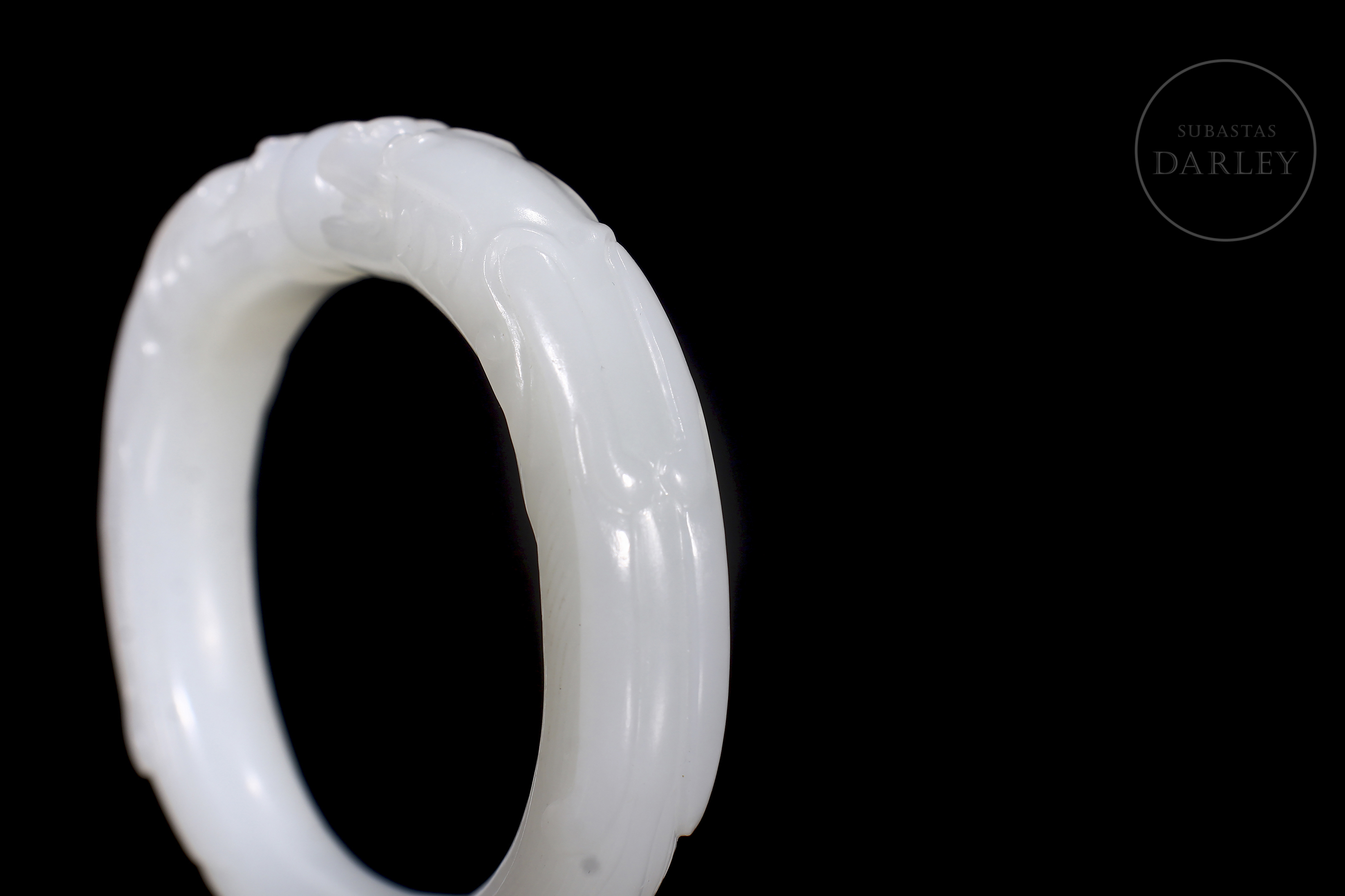 Brazalete tallado de jade de forma elíptica y perfil redondeado, de color blanco puro y lechoso. Tallado para simular dos dragones cuyas cabezas están talladas en altorrelieve y se encuentran sobre una perla, mirándola fijamente. Los cuerpos de los dragones forman la estructura del brazalete. Con caja forrada a medida. Dinastía Qing (1644–1912).