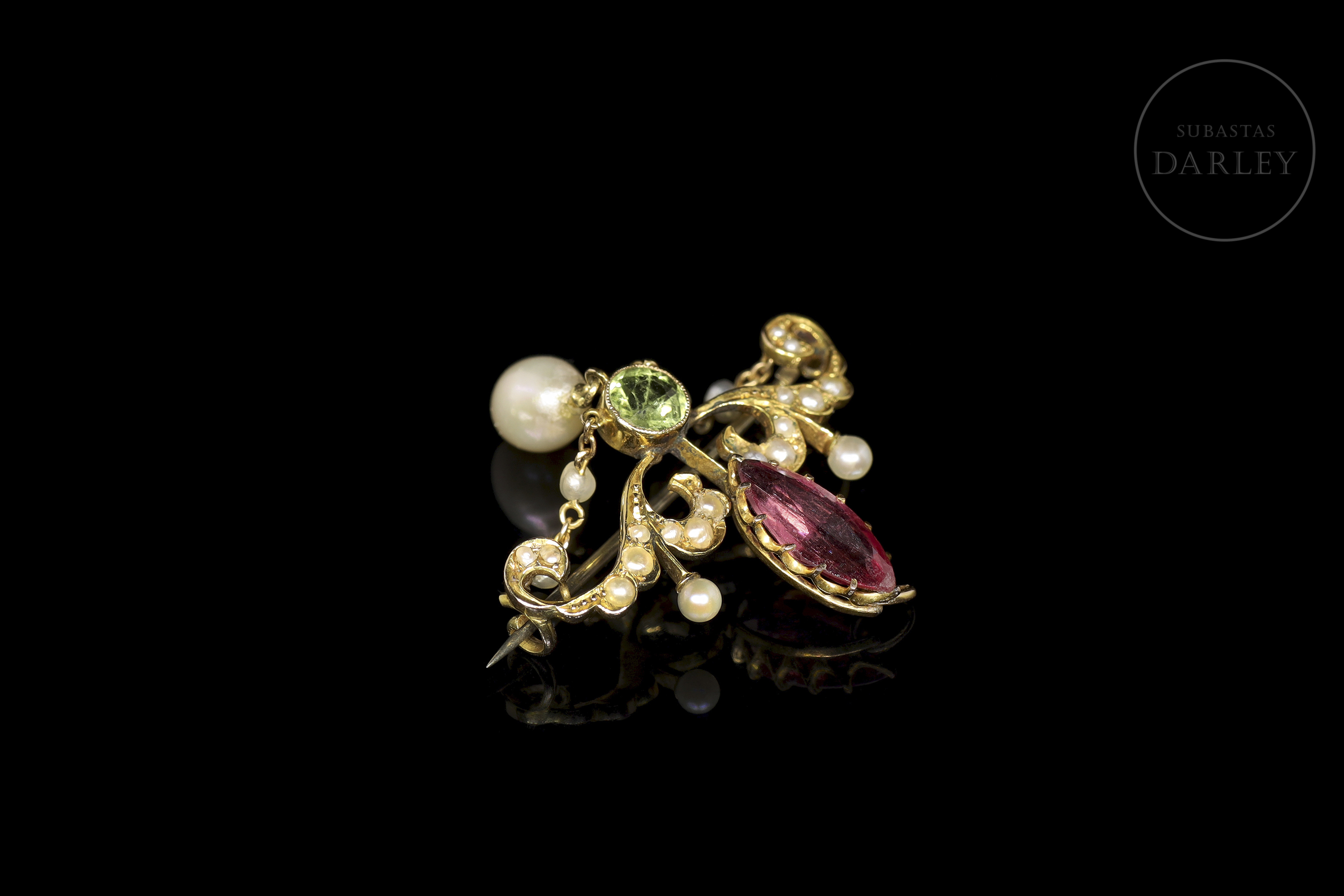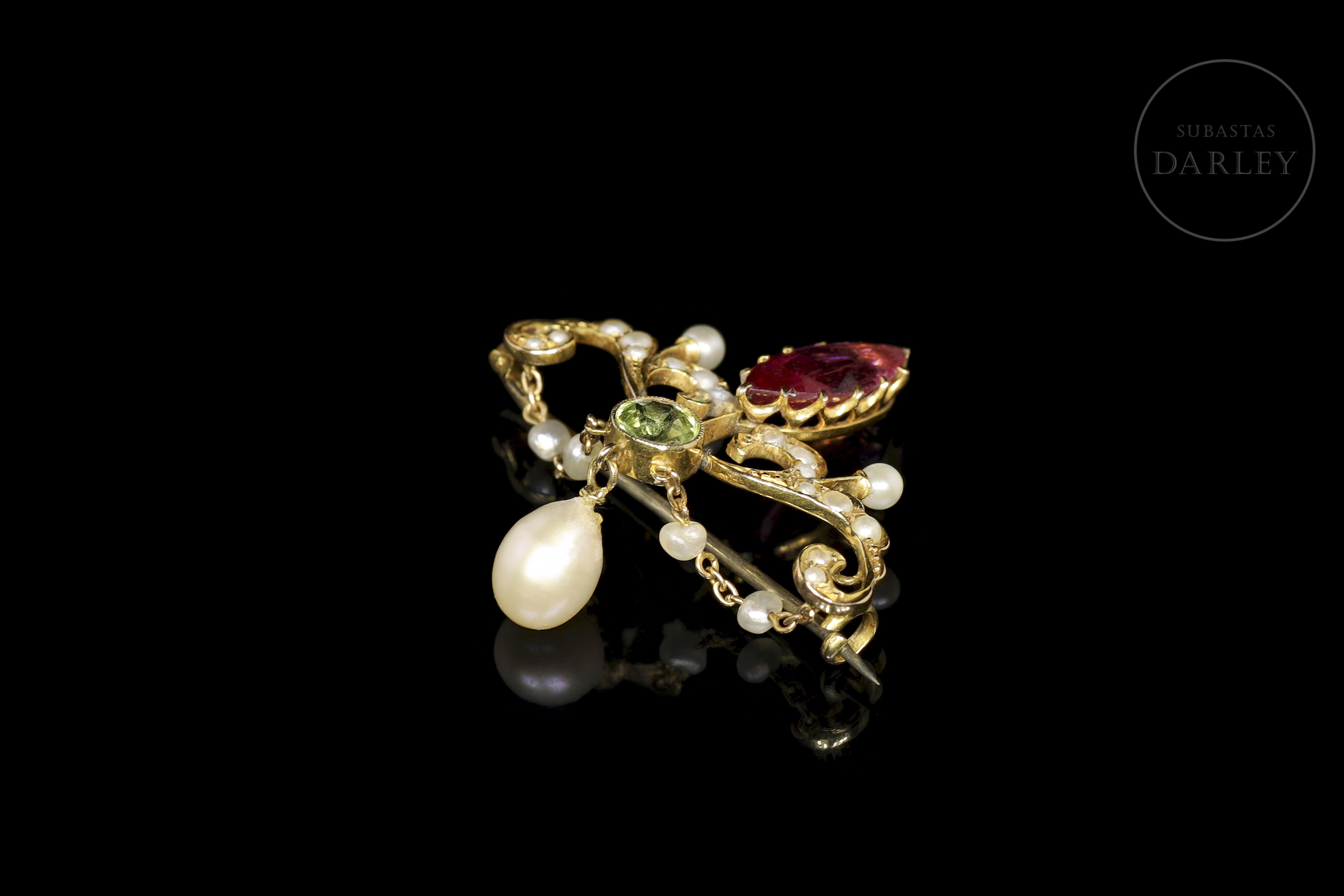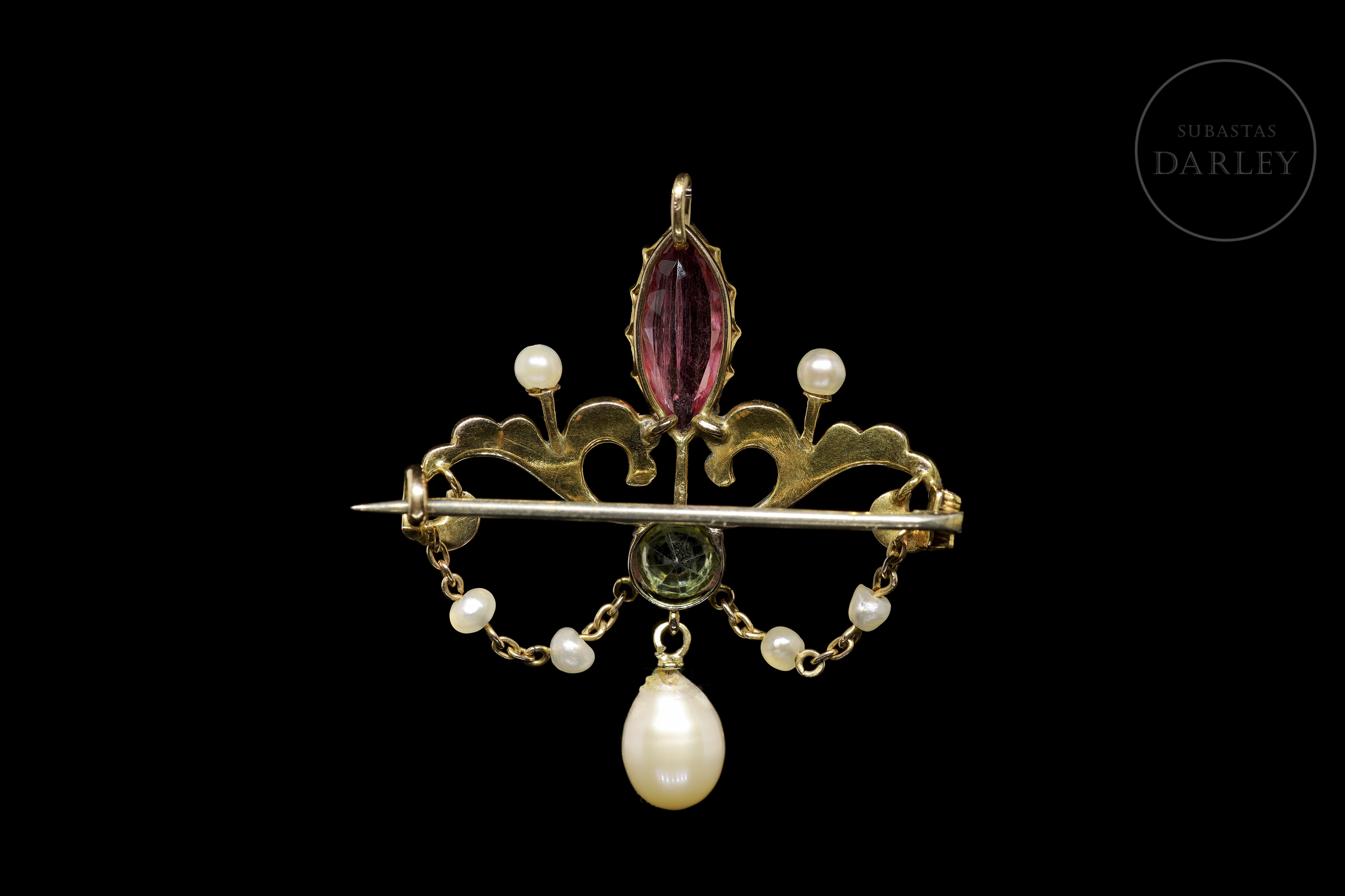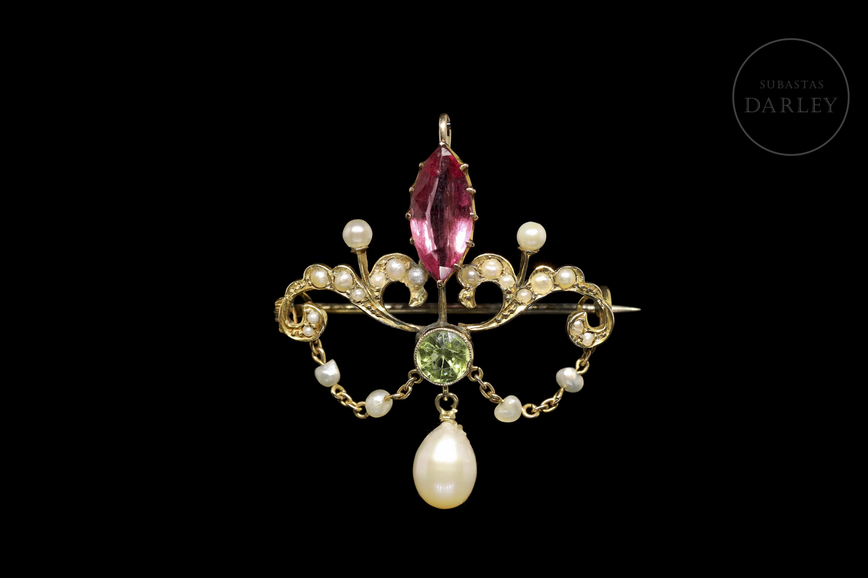 Broche-colgante de oro amarillo con turmalina, peridoto y perlas