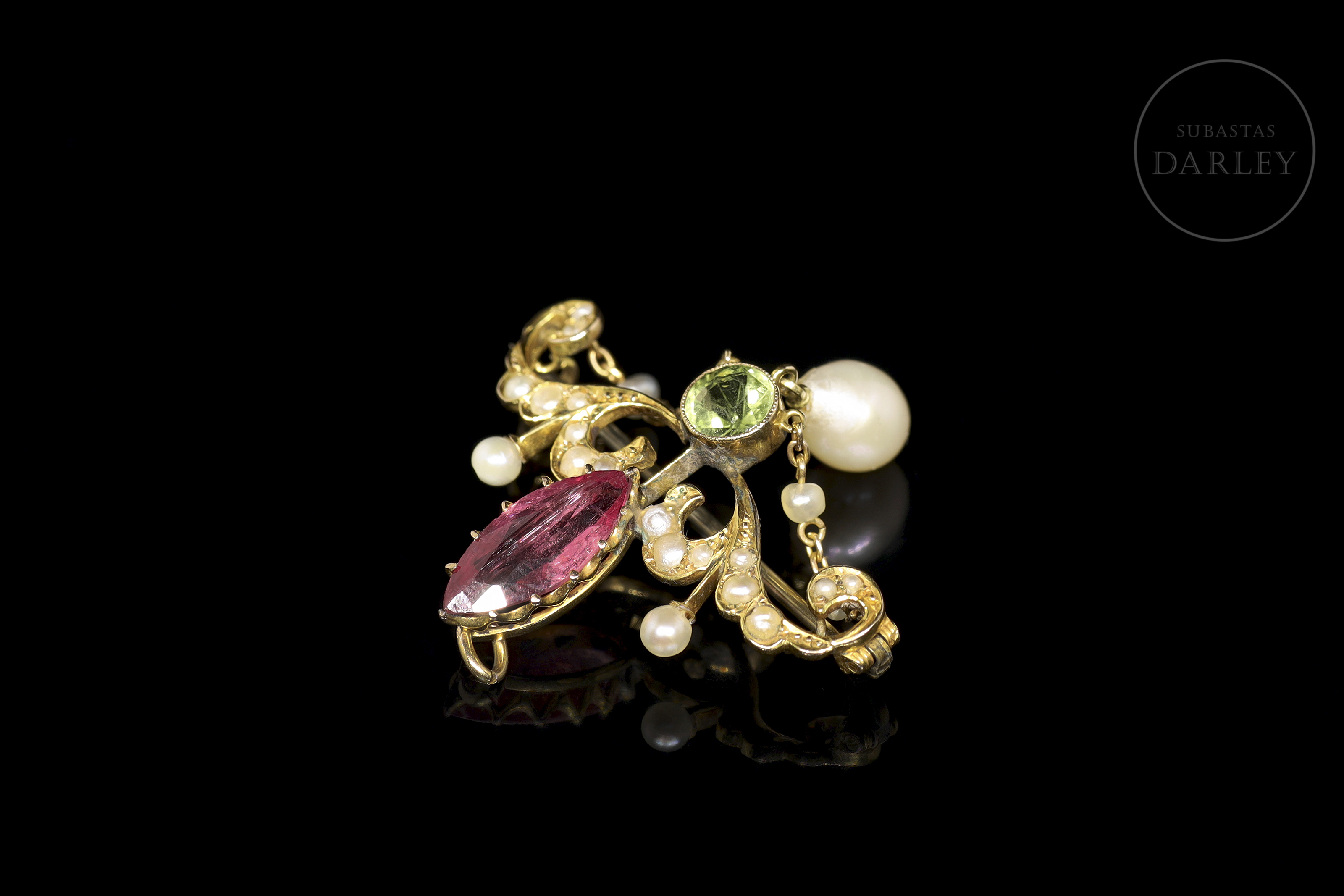 Oro amarillo de 15 kt, de diseño calado con volutas y motivos vegetales estilizados, decorado con una turmalina rosada talla marquesa en la parte superior y un peridoto verde circular en el centro. El conjunto se adorna con una sucesión de pequeñas perlas engastadas que acentúan la sinuosidad de las líneas, de las que pende una perla en forma de gota, suspendida mediante cadena articulada. Estilo Art Nouveau.