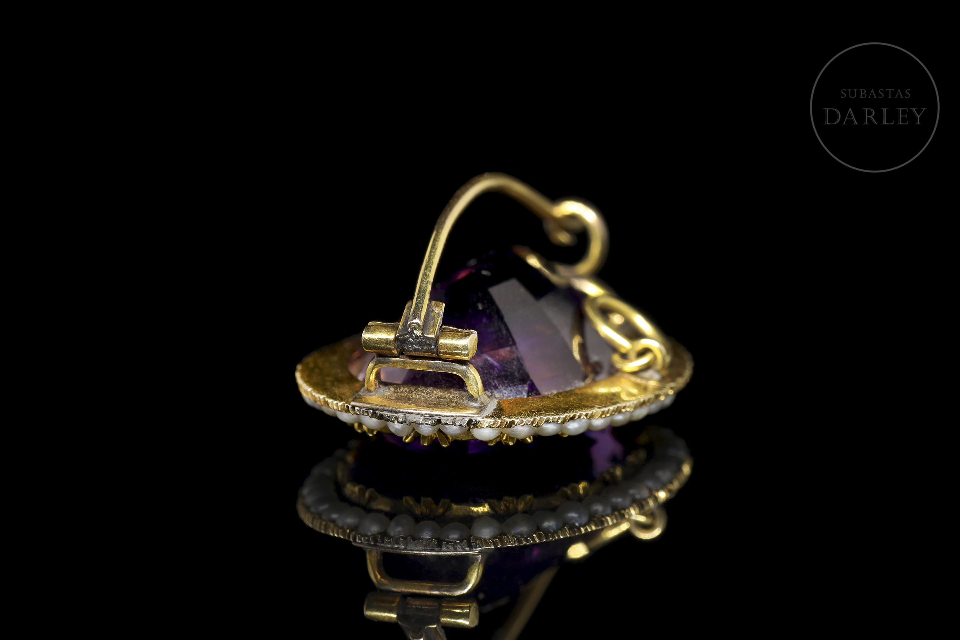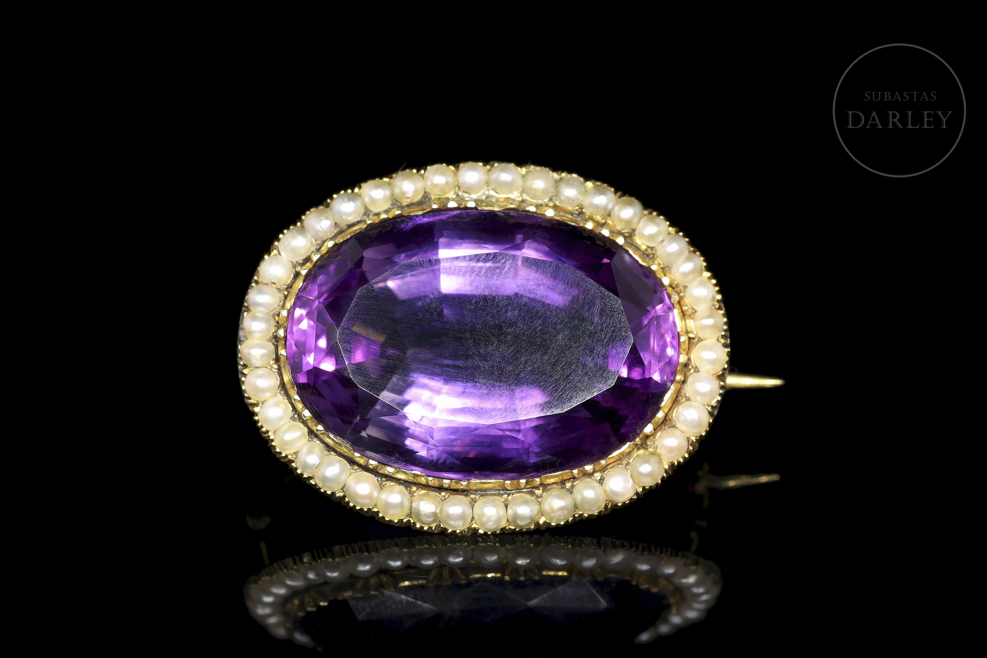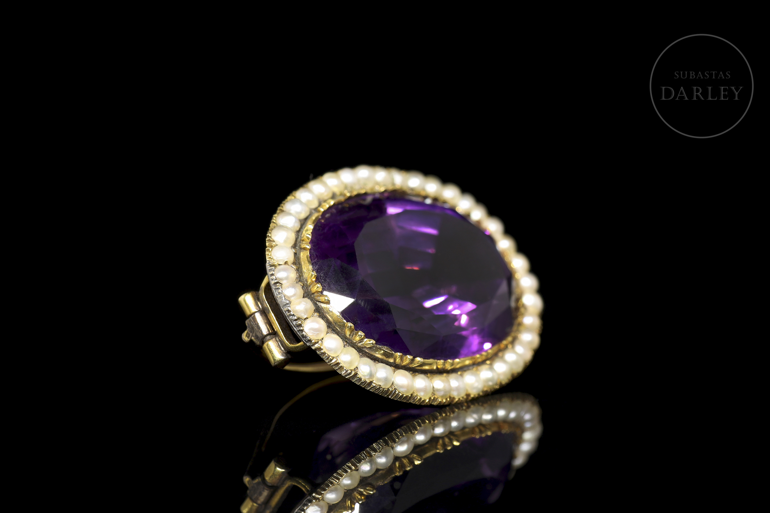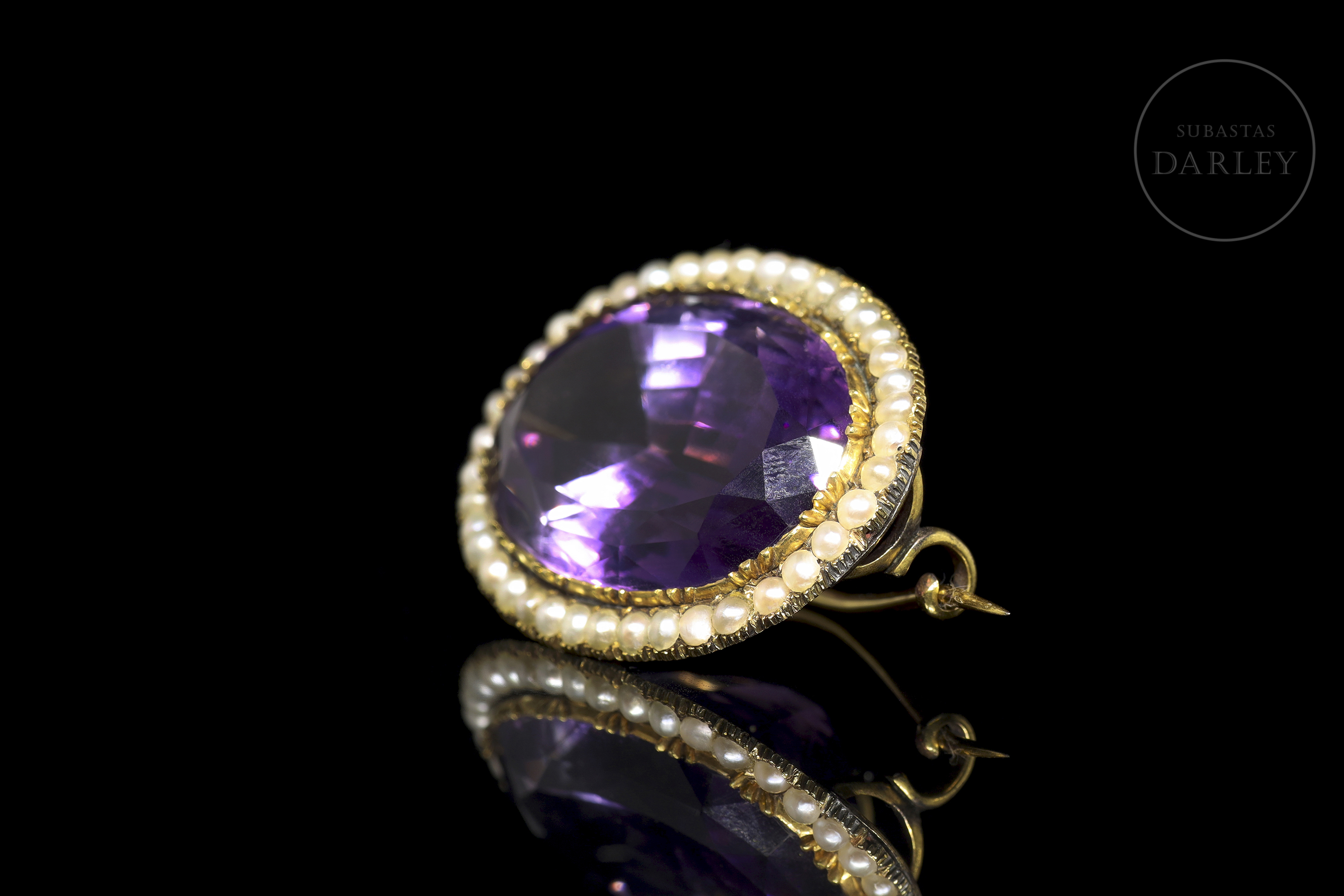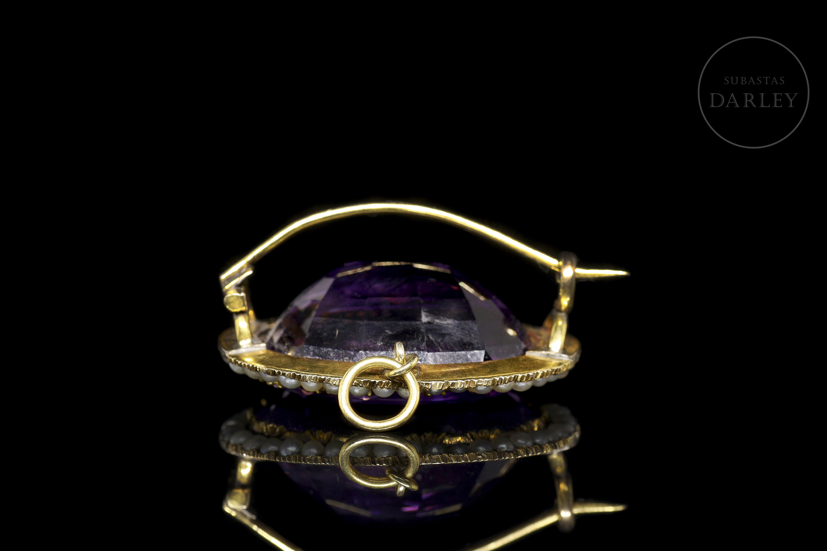 Colgante-broche realizado en oro amarillo de 14 k, centrado por una amatista oval tallada en facetas. La piedra está engastada en bisel liso y rodeada por un fino orlado de pequeñas perlas uniformemente dispuestas, que aportan luminosidad y contraste a la composición. Cierre de aguja con bisagra y gancho, además de una anilla superior que permite su uso como colgante.