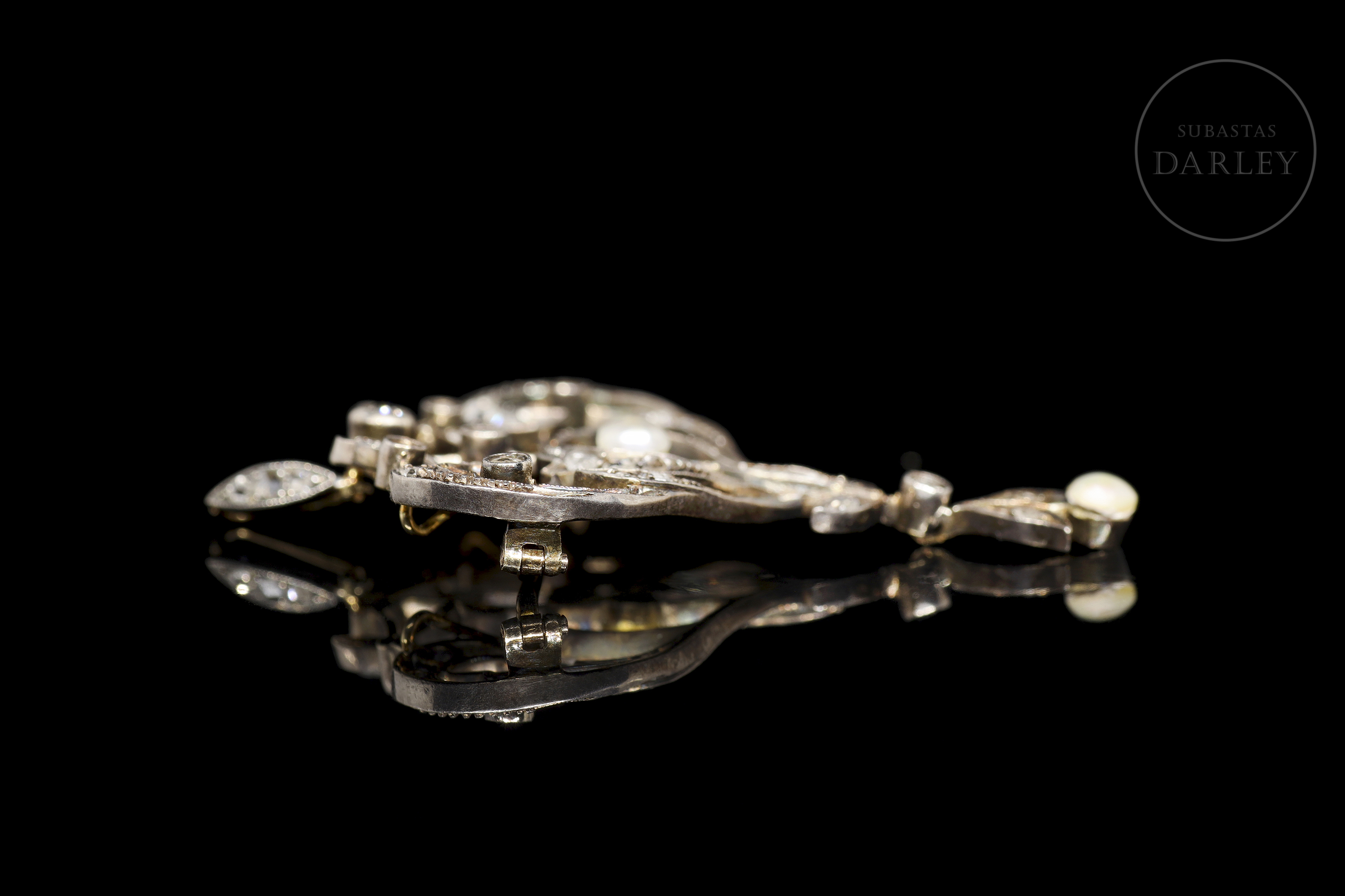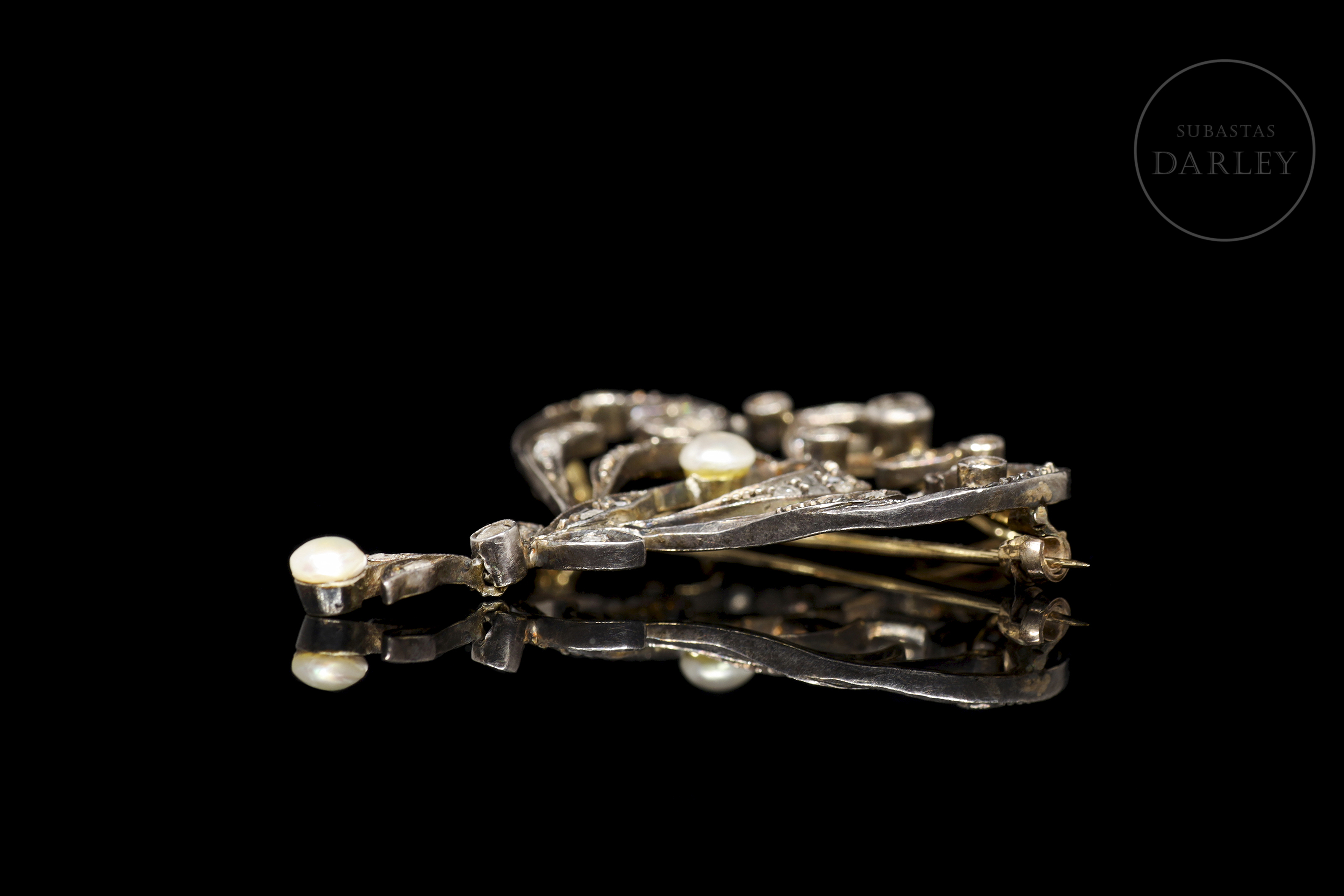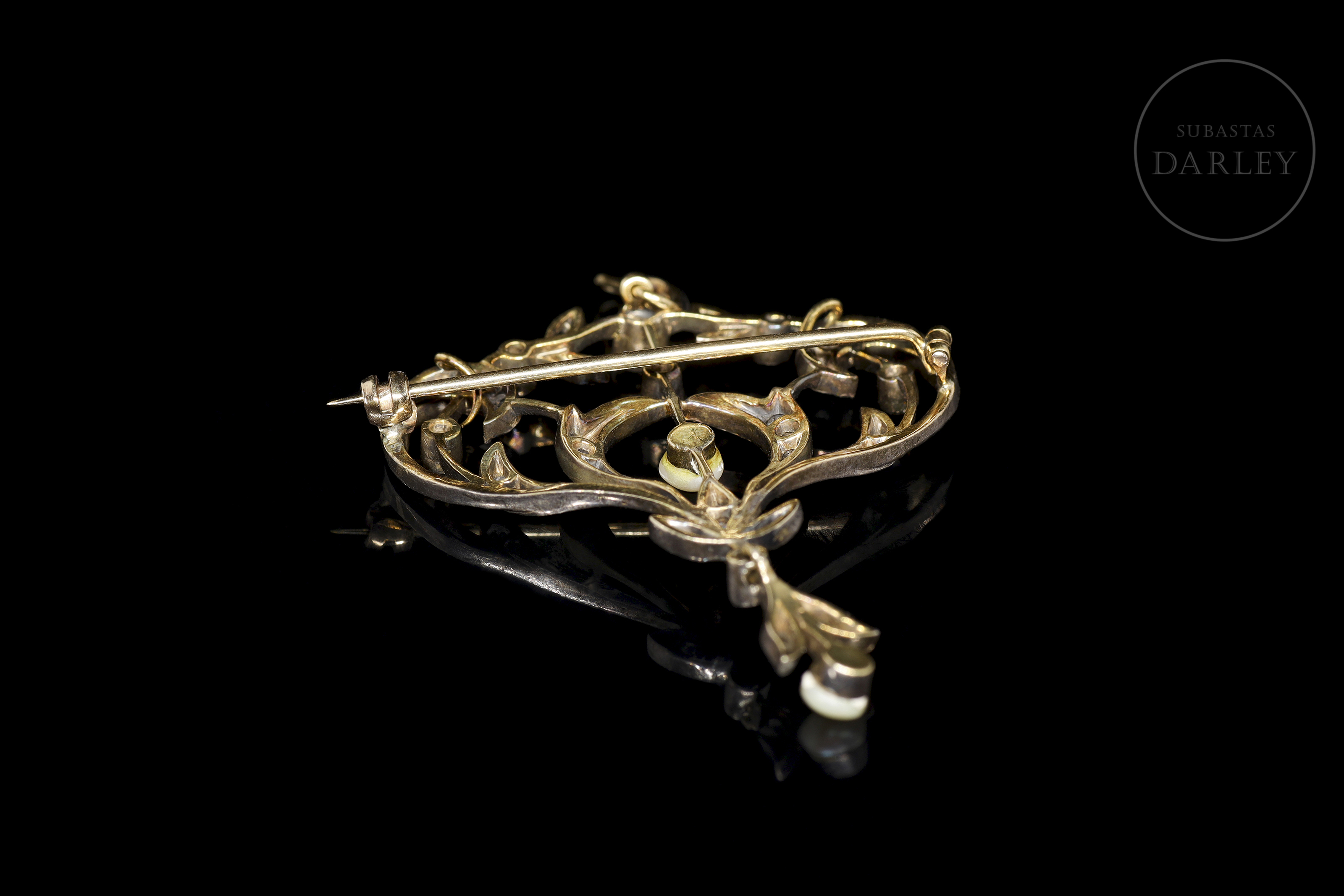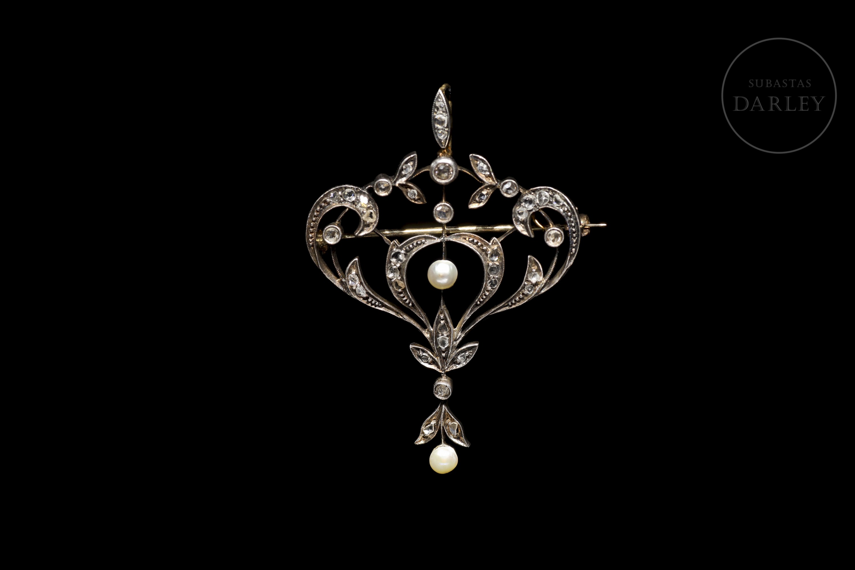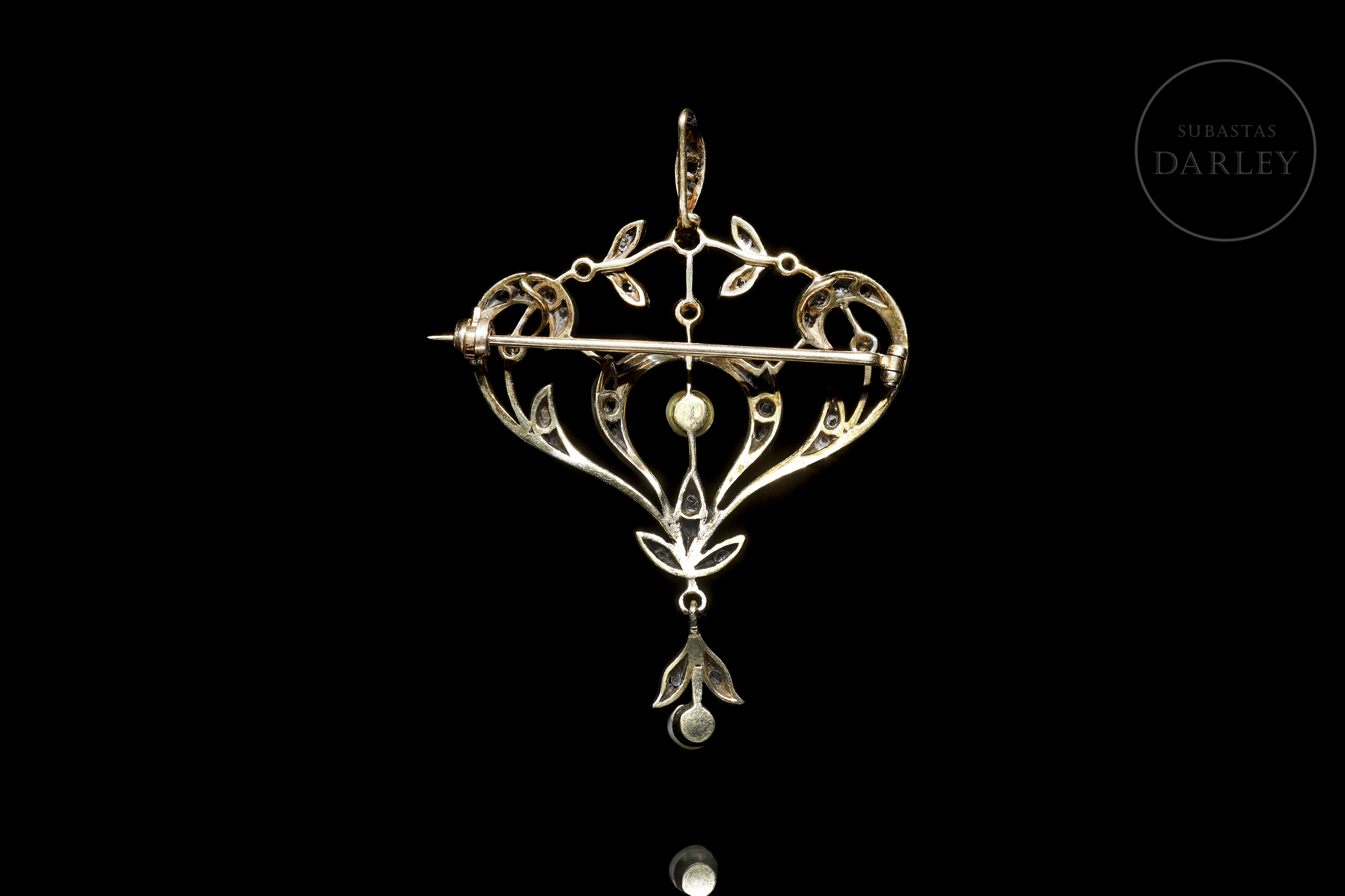 Broche realizado en oro 18Kt y plata amarillo, decorado con diamantes talla antigua montados sobre estructura calada, formando un motivo simétrico de inspiración vegetal con hojas, roleos y delicados arabescos. En el centro, una perla cultivada suspendida, acompañada por otra en el extremo inferior como colgante móvil. Cierre de aguja con bisagra posterior.