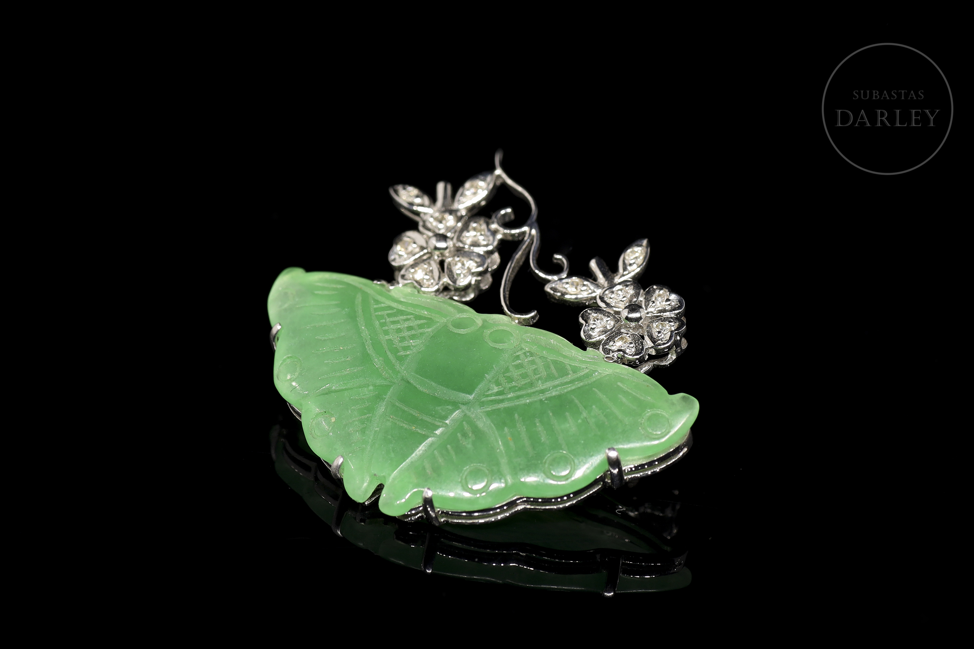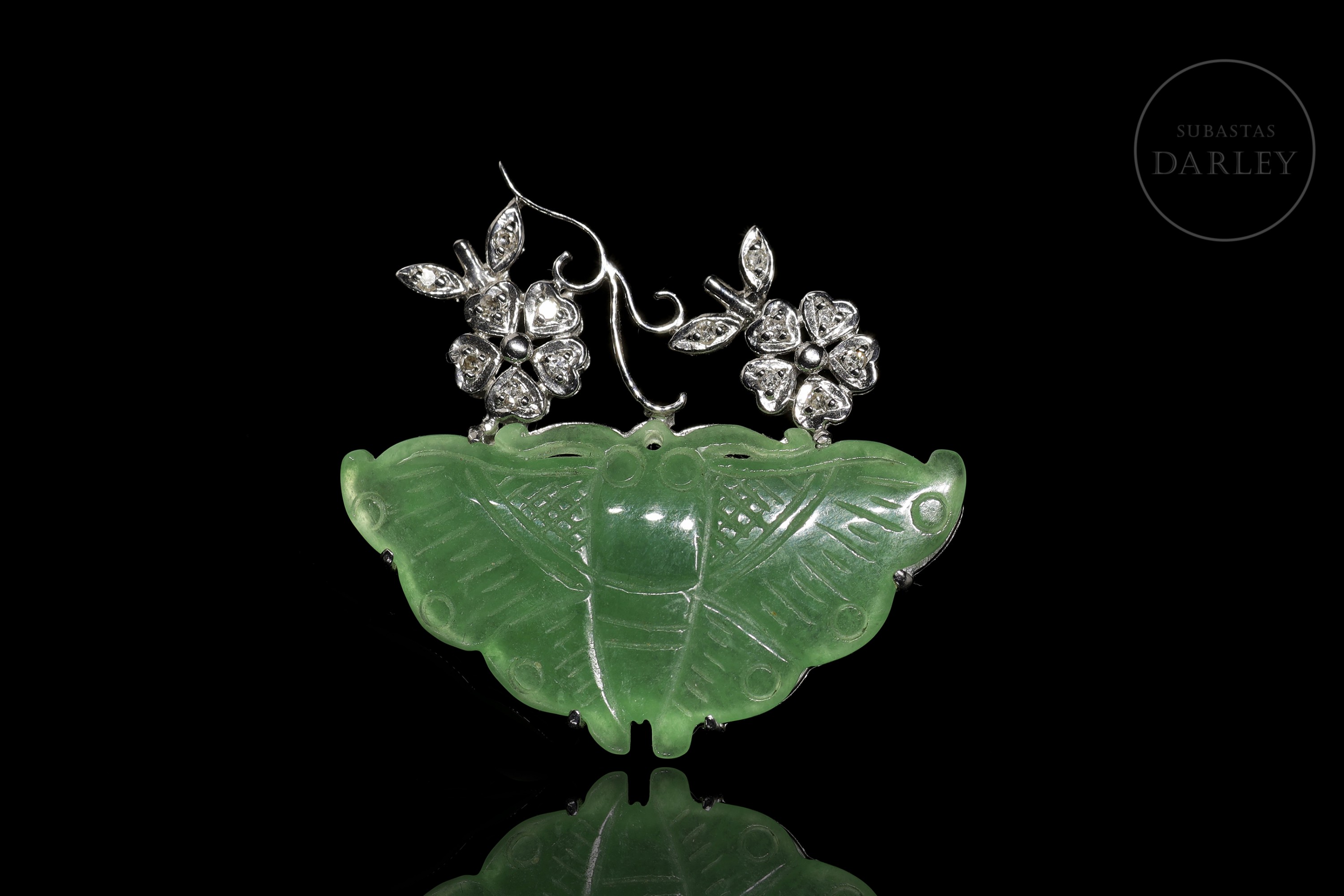 Elaborado en oro blanco de 18k, decorado con un motivo central de jade tallado en forma de mariposa, de tonalidad verde intensa. La pieza se completa con un diseño floral en la parte superior, compuesto por dos flores y hojas decoradas con 14 diamantes talla brillante.