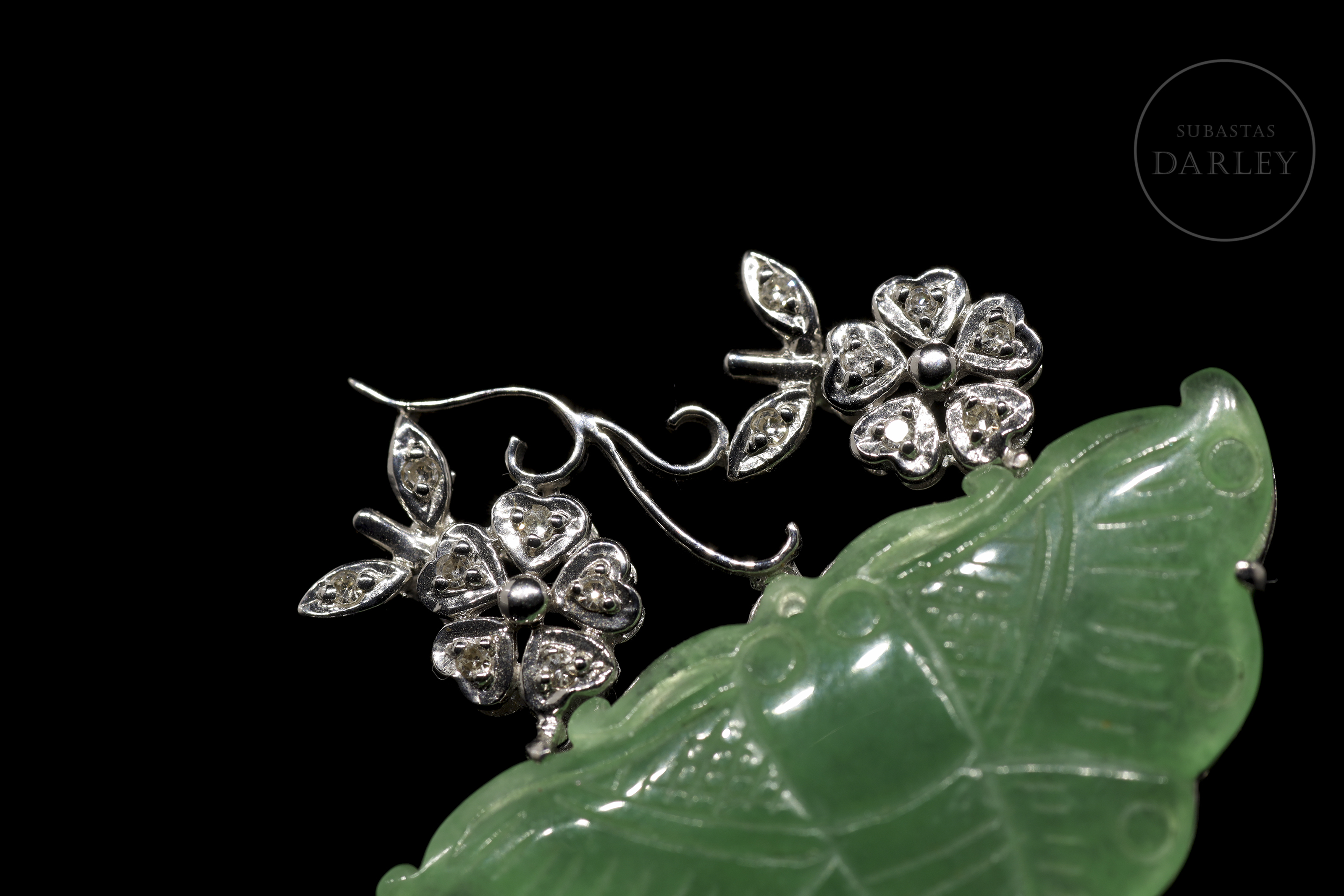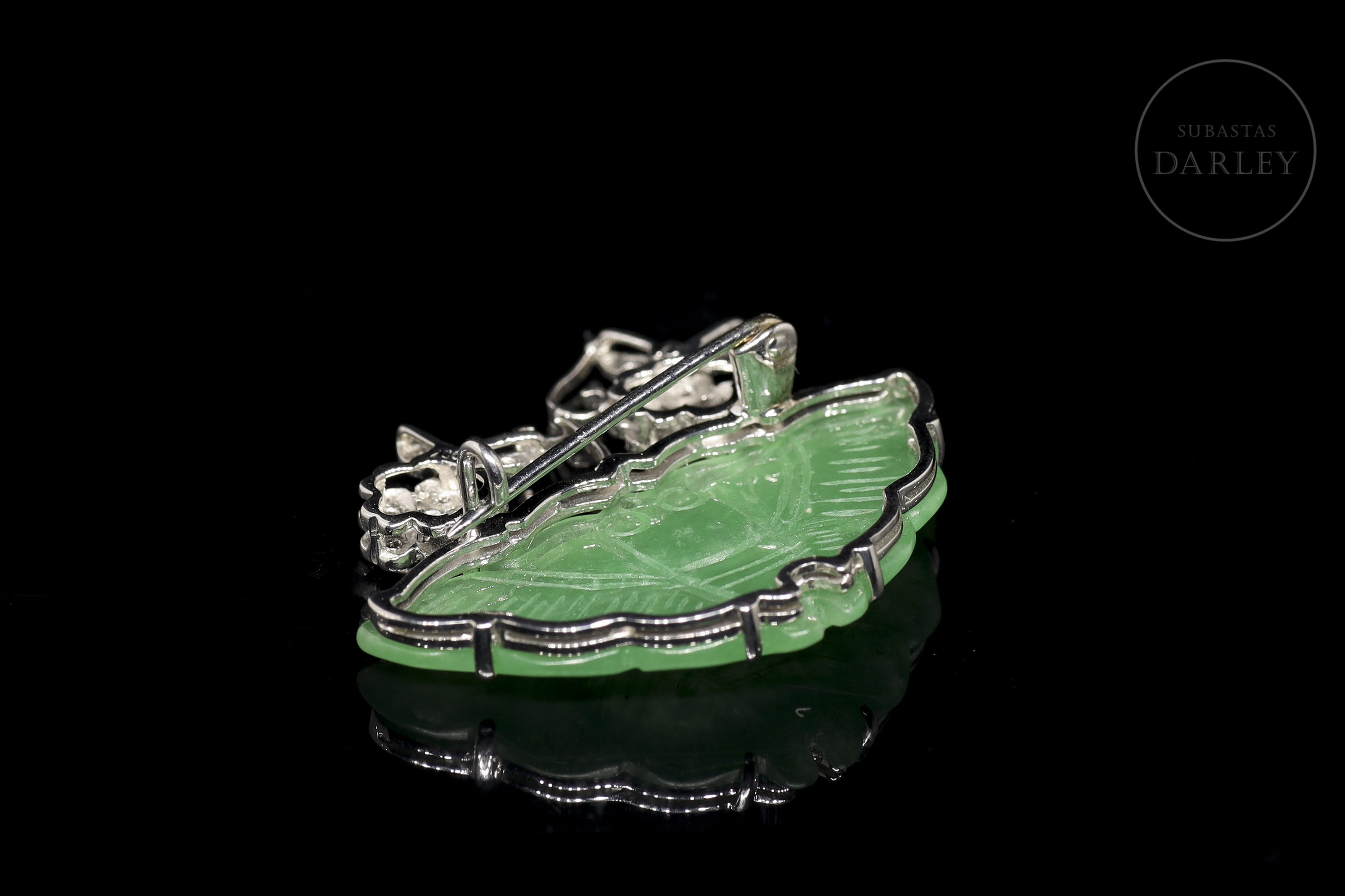 Broche en oro blanco de 18k con jade y diamantes