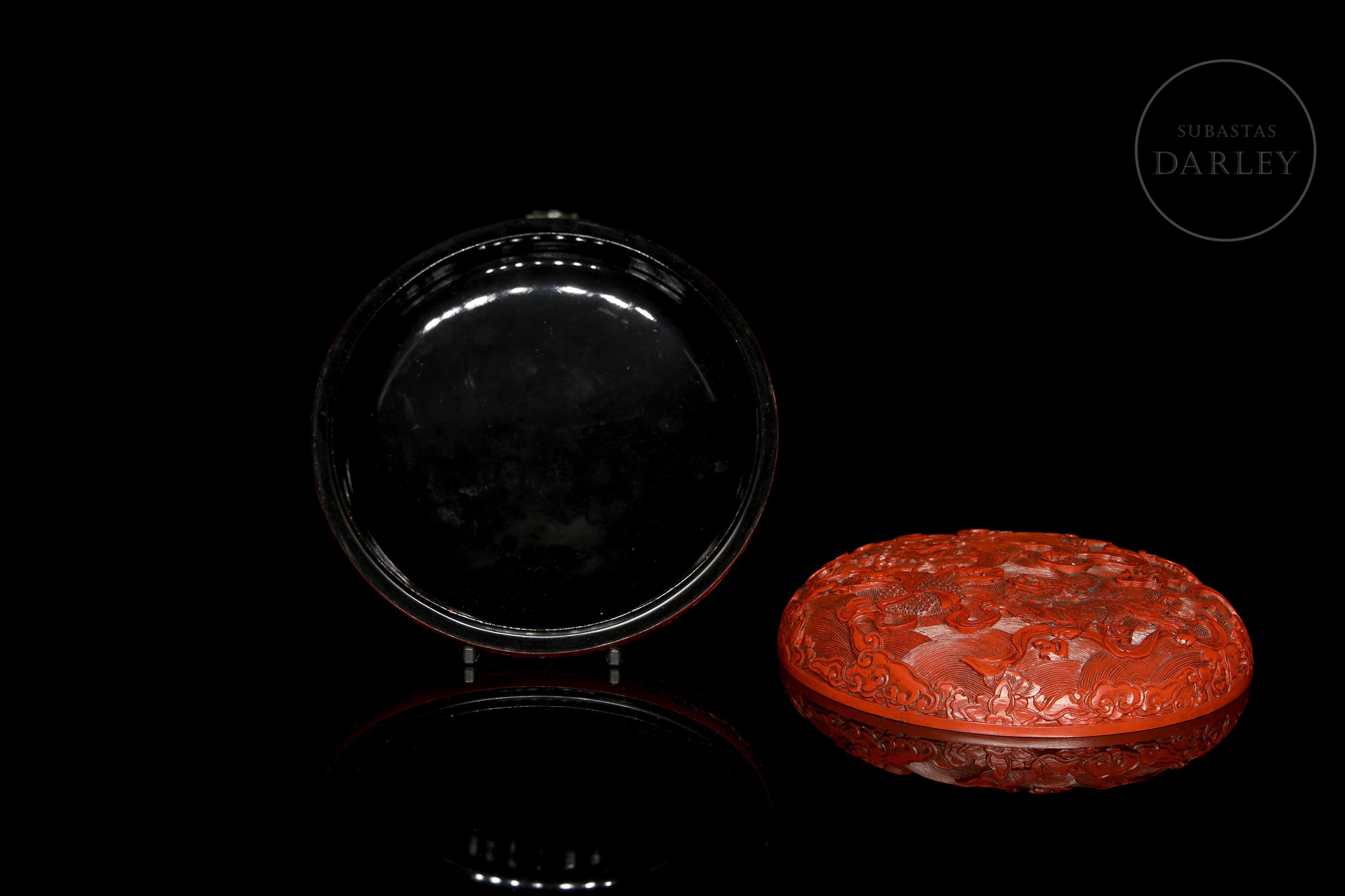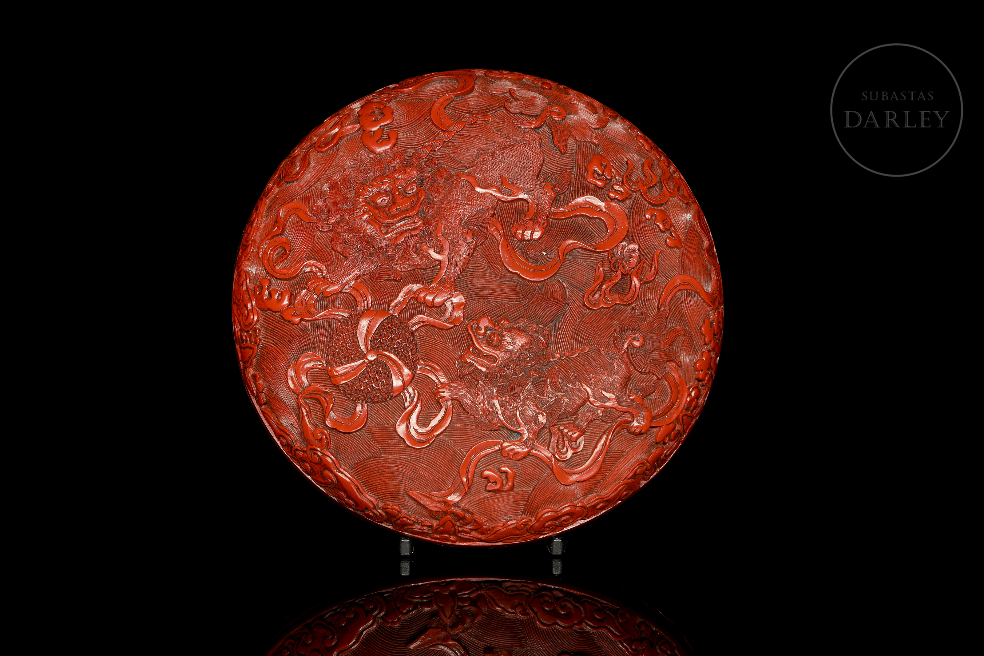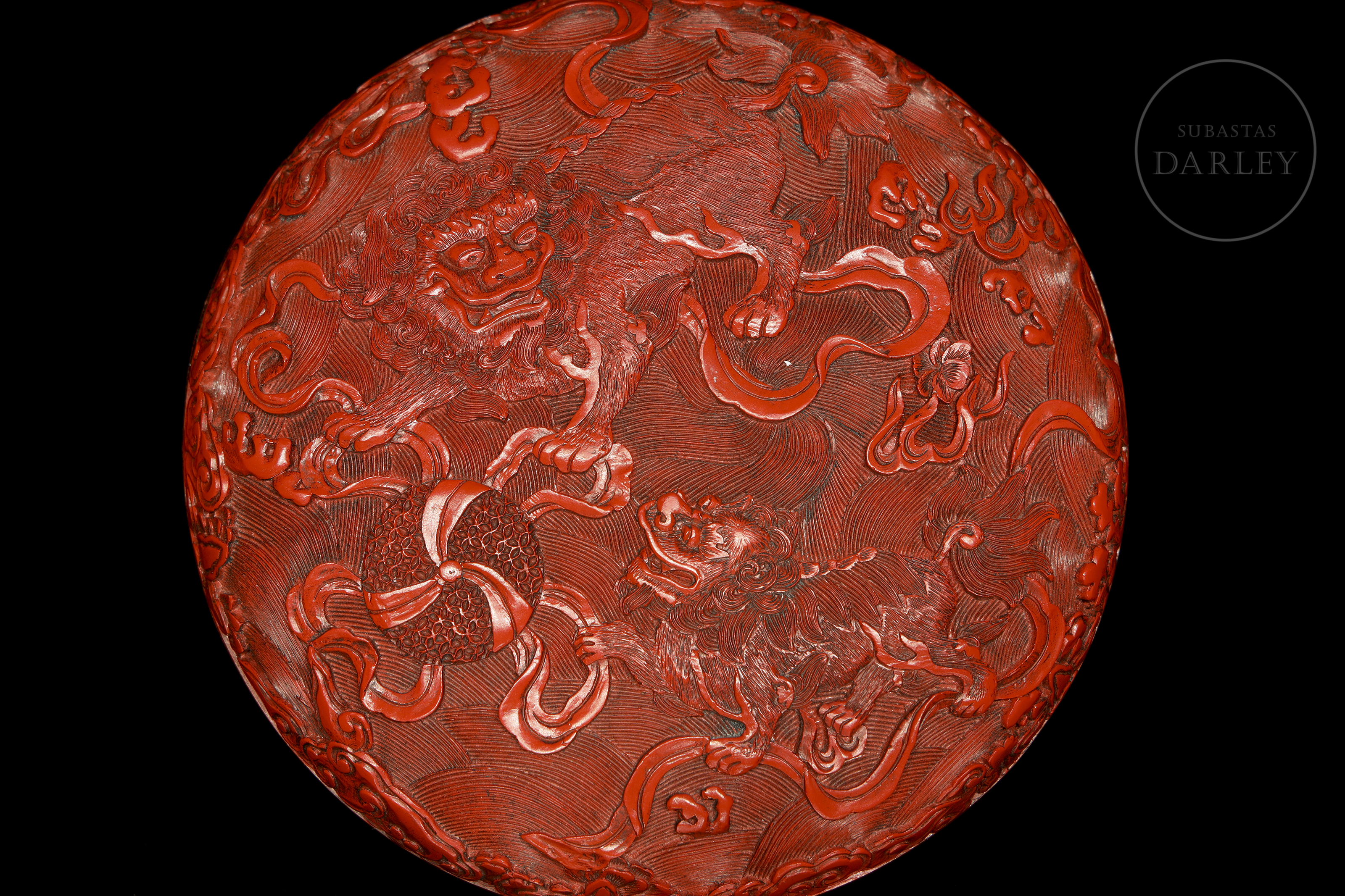 Caja circular con tapa de madera. Realizada mediante la técnica de lacado cinabrio tallado. Ambas caras están magistralmente decoradas; una de ellas con una escena de dos feroces leones que persiguen una esfera con brocados y cintas, en medio de un mar embravecido, rodeado de nubes y pequeñas flores. La otra muestra un feroz Qilin de imponente mirada rodeado de peces y frutos que forman un marco a su alrededor. El interior y la base contrastan por su acabado en laca negra lisa y brillante. Dinastía Qing (1644-1912), s. XVIII o posterior.