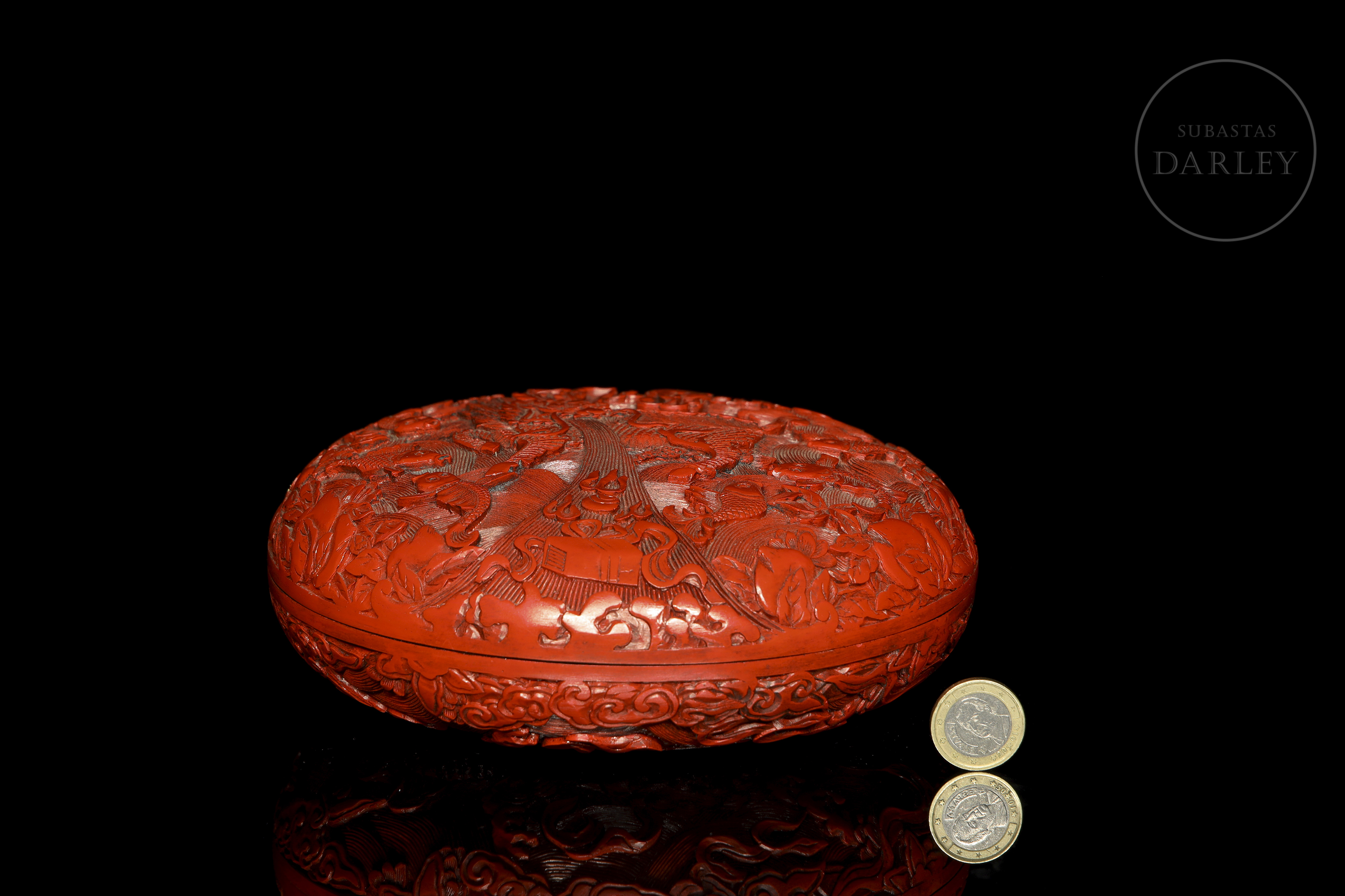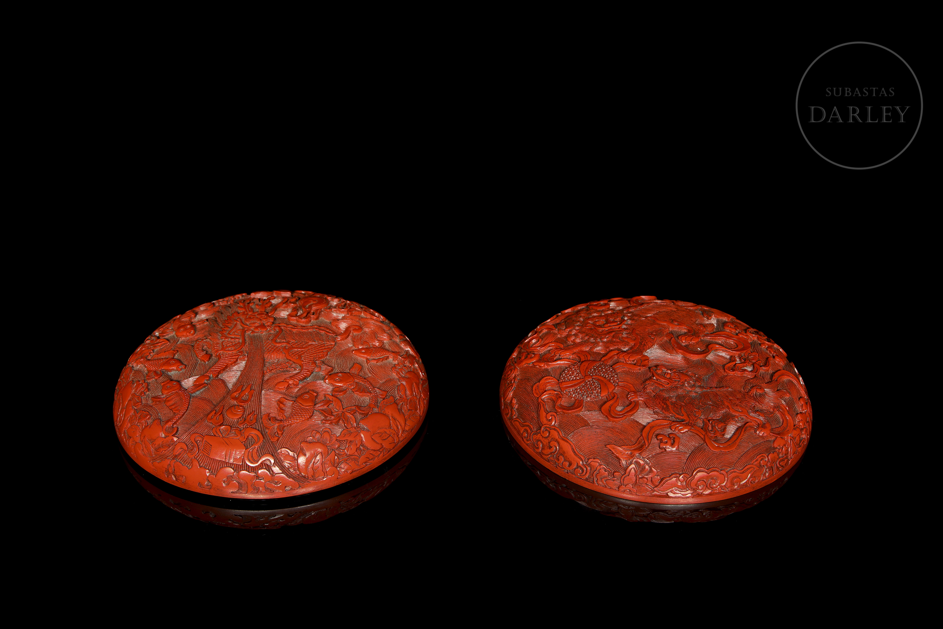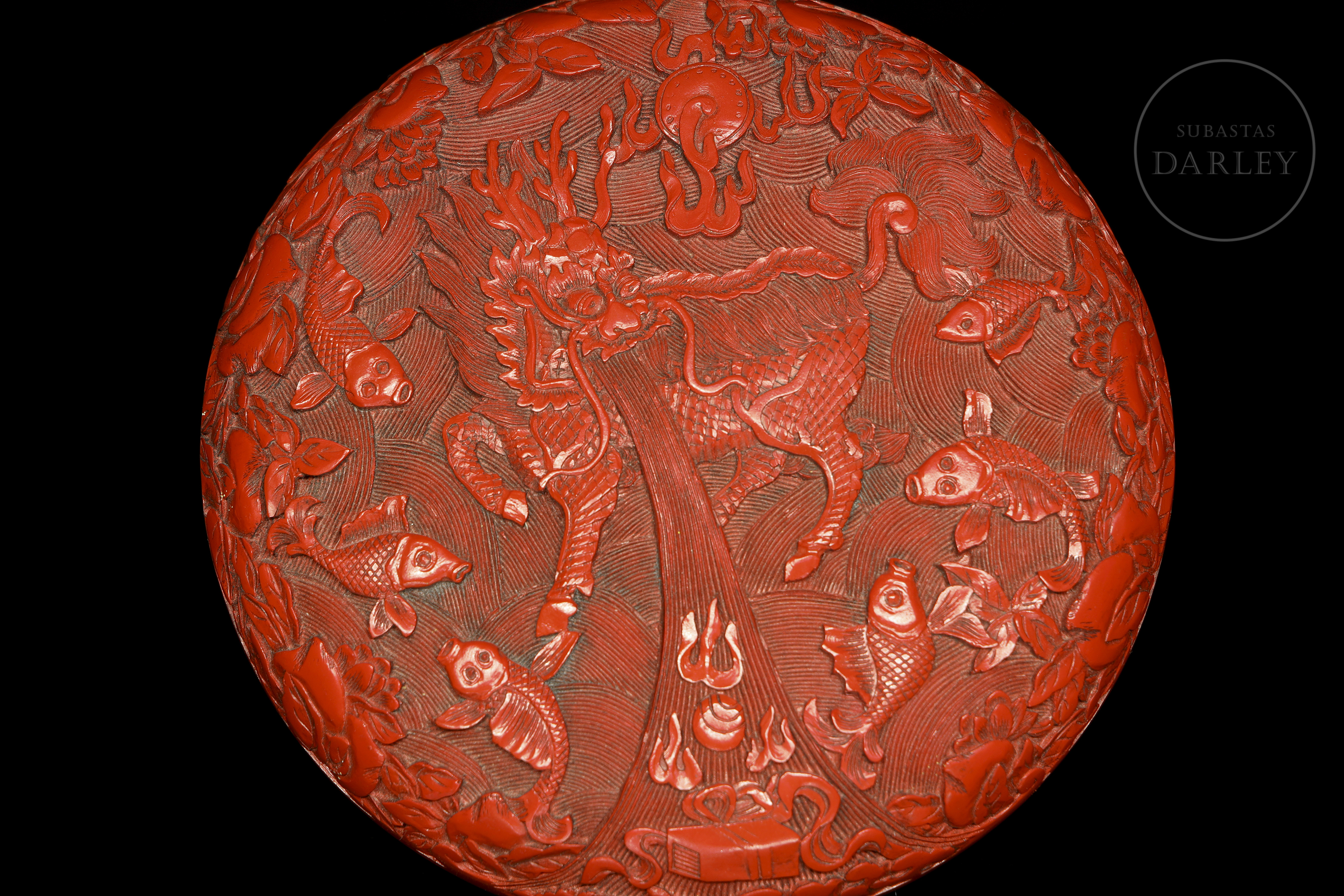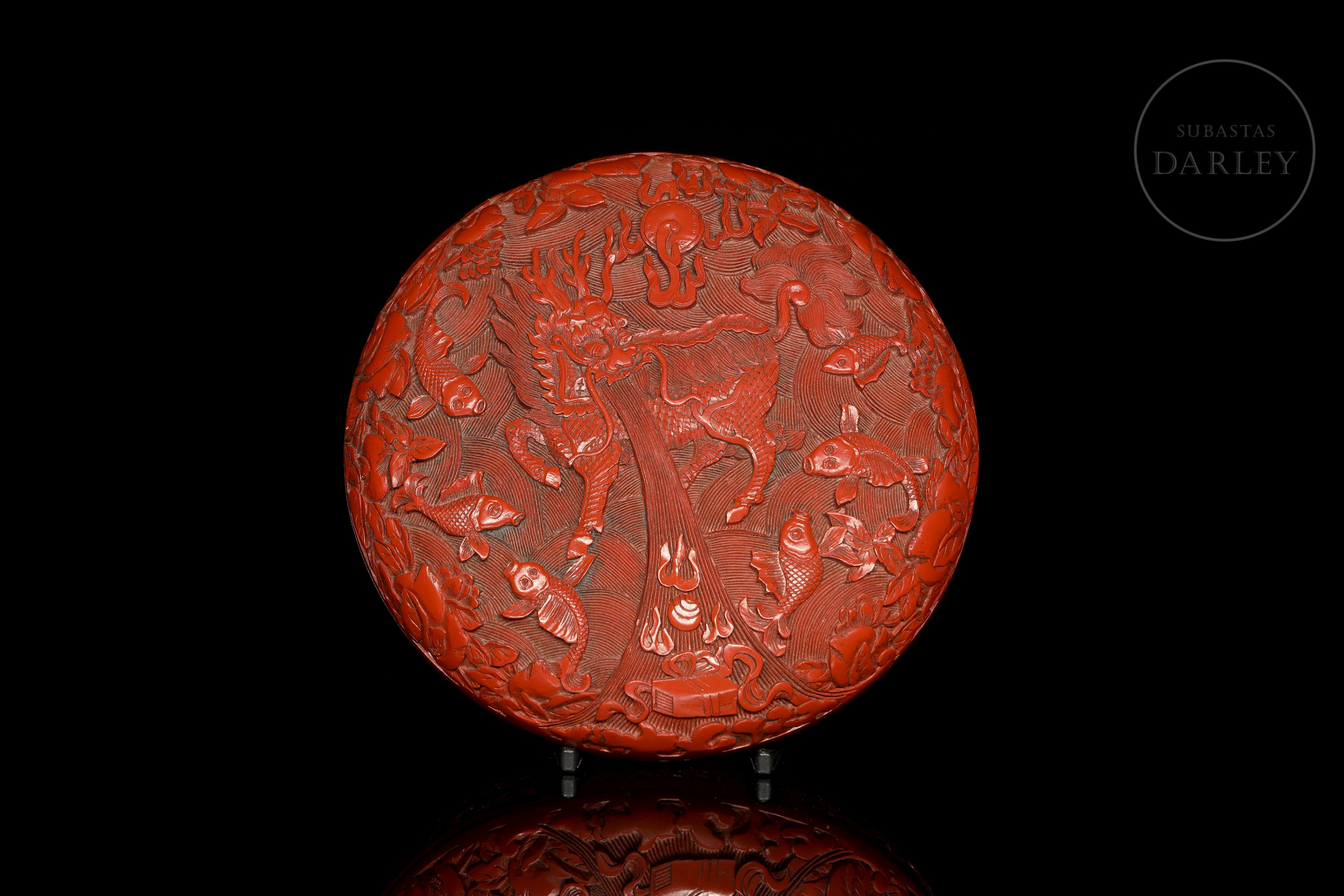 Caja circular con tapa de madera. Realizada mediante la técnica de lacado cinabrio tallado. Ambas caras están magistralmente decoradas; una de ellas con una escena de dos feroces leones que persiguen una esfera con brocados y cintas, en medio de un mar embravecido, rodeado de nubes y pequeñas flores. La otra muestra un feroz Qilin de imponente mirada rodeado de peces y frutos que forman un marco a su alrededor. El interior y la base contrastan por su acabado en laca negra lisa y brillante. Dinastía Qing (1644-1912), s. XVIII o posterior.