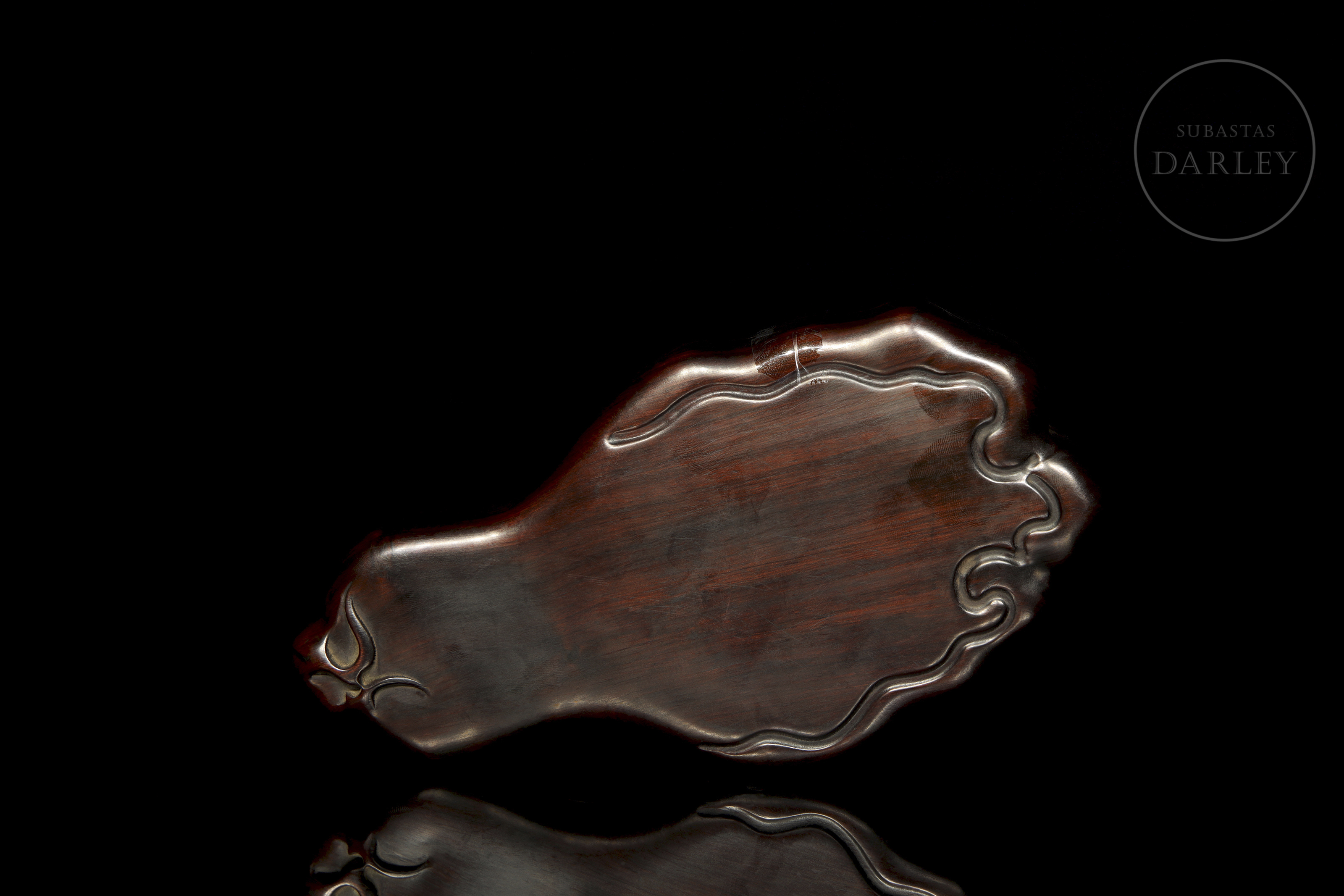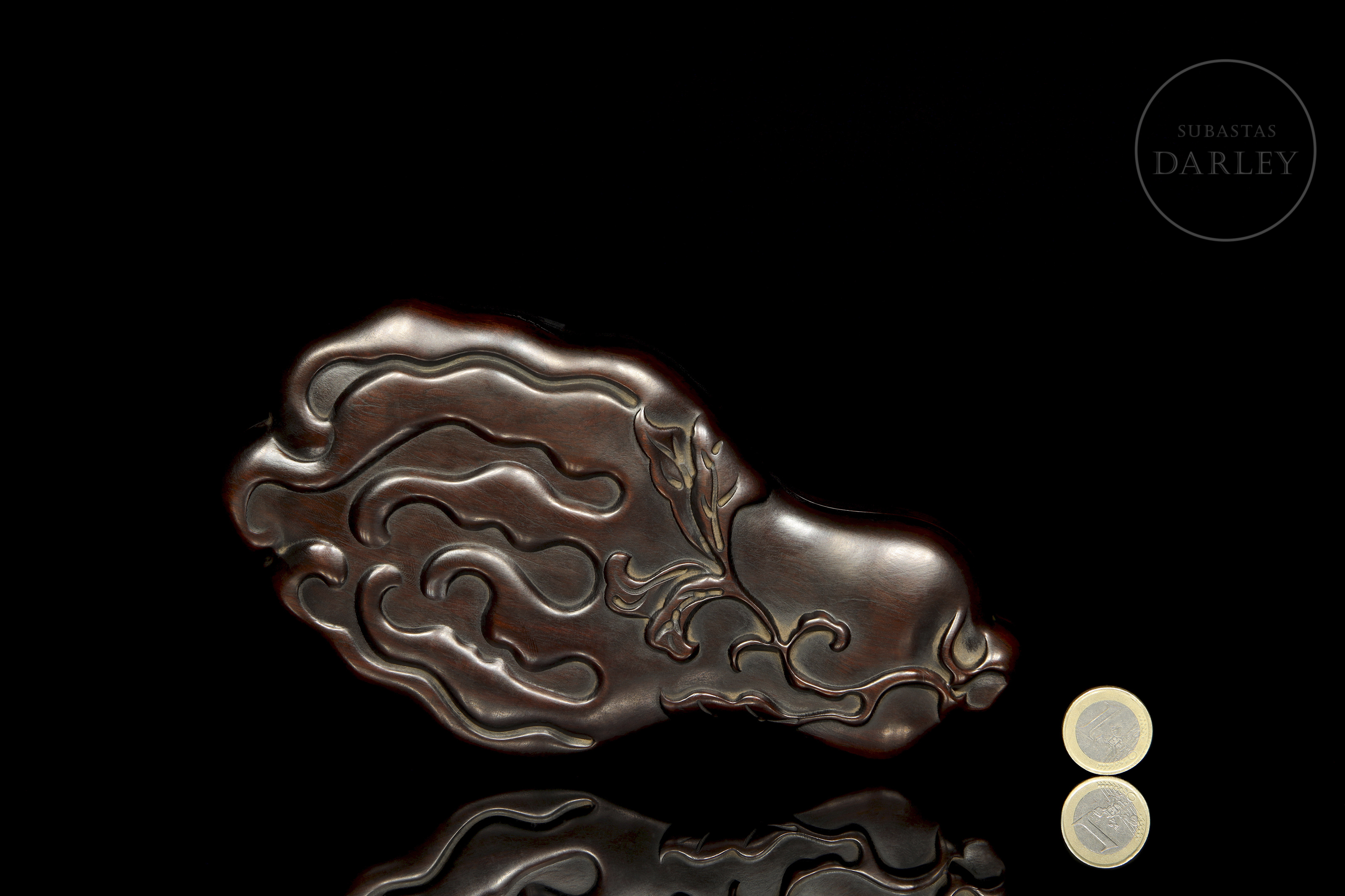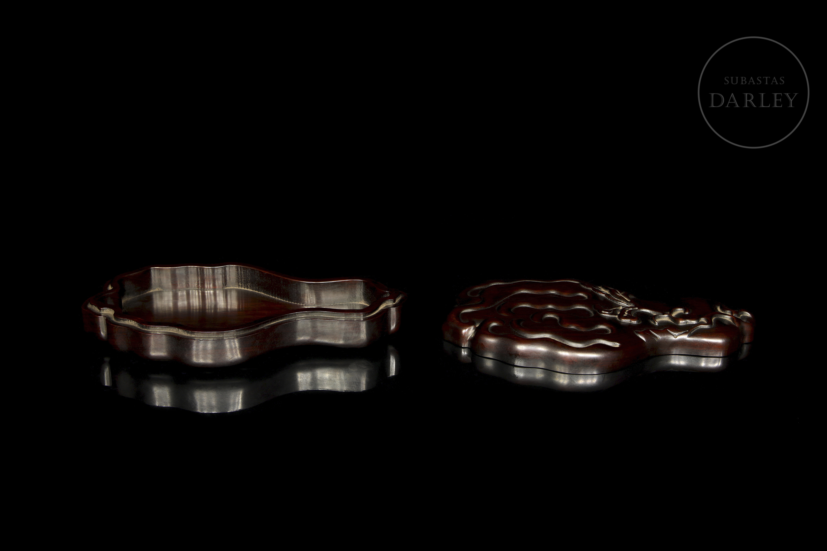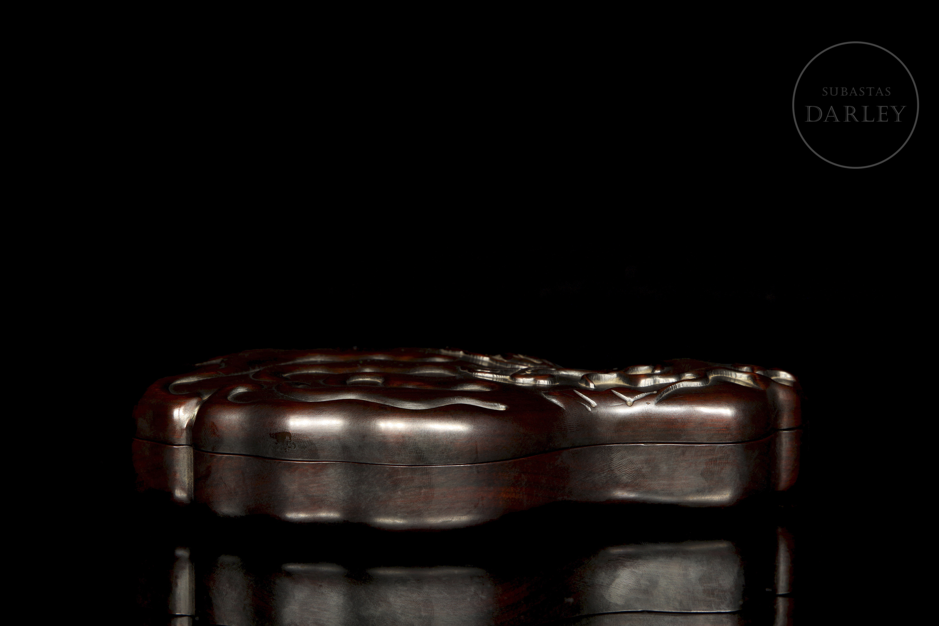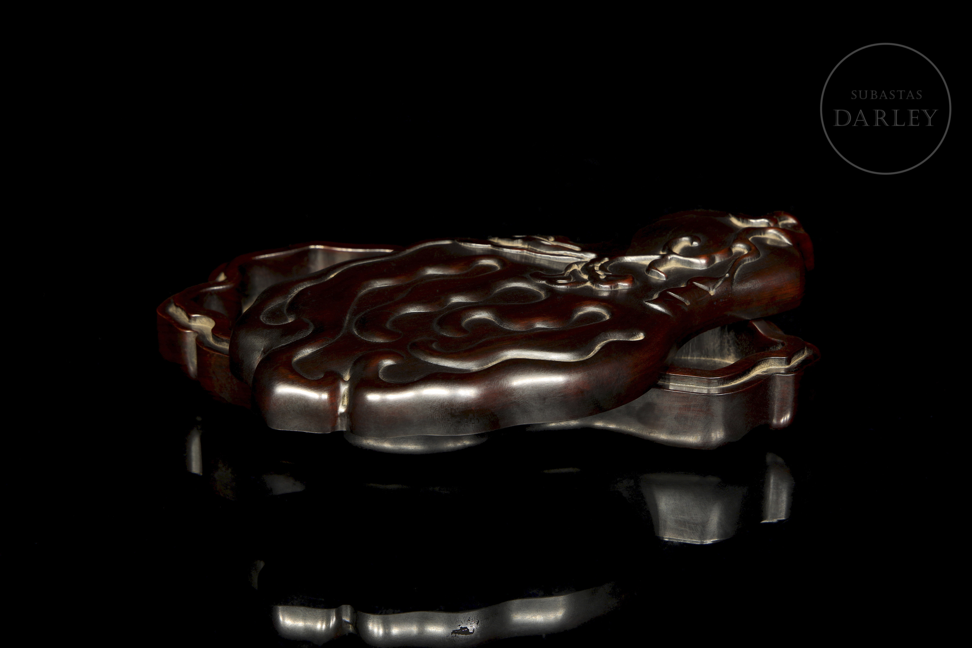 Caja de madera tallada con gran detalle en forma de raíz, conocida como "Mano de Buda", un símbolo de prosperidad. La superficie está profusamente decorada con un intrincado patrón en relieve de nudos, ramas y hojas entrelazadas. La madera, de una rica tonalidad oscura, presenta una pátina suave y lustrosa.