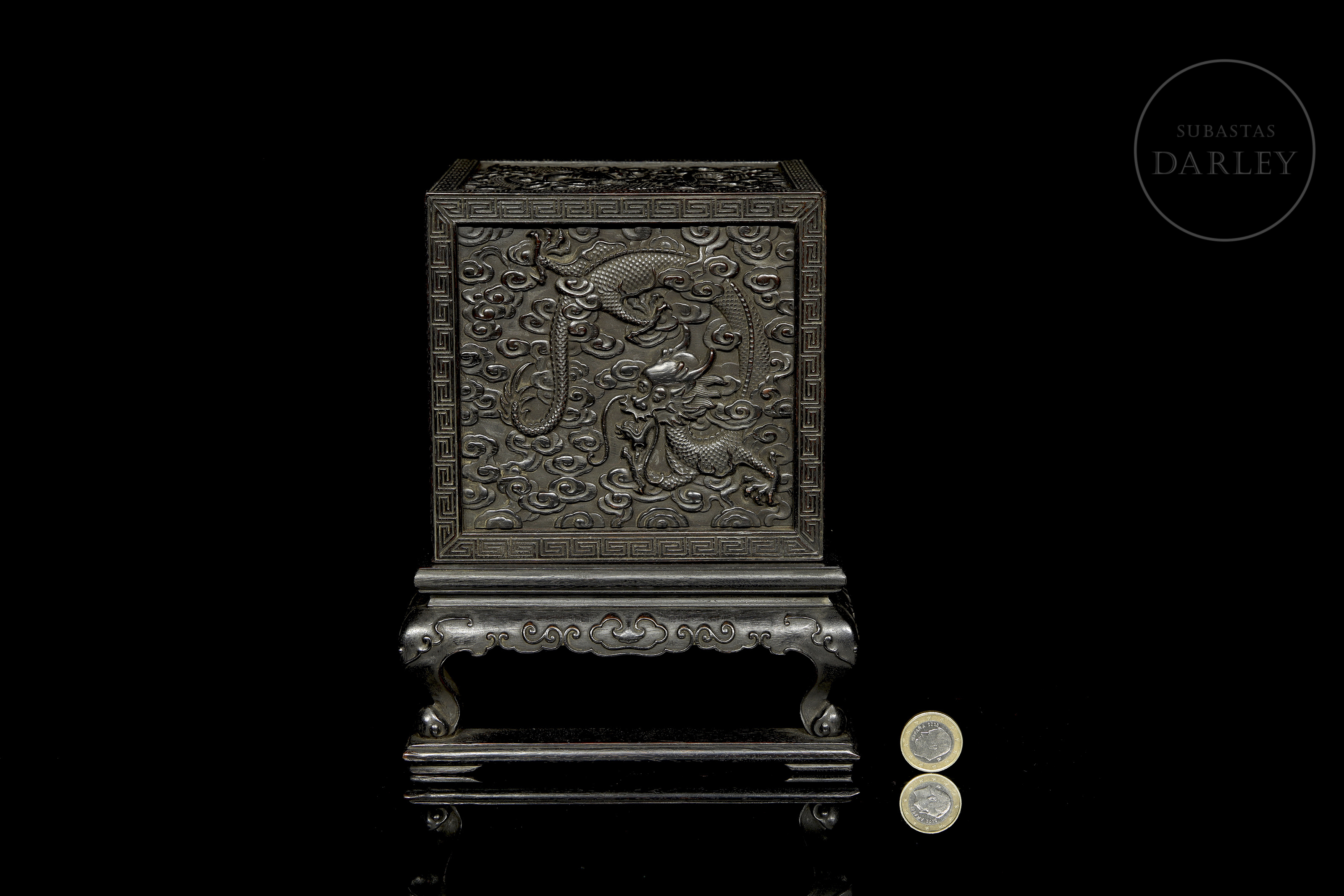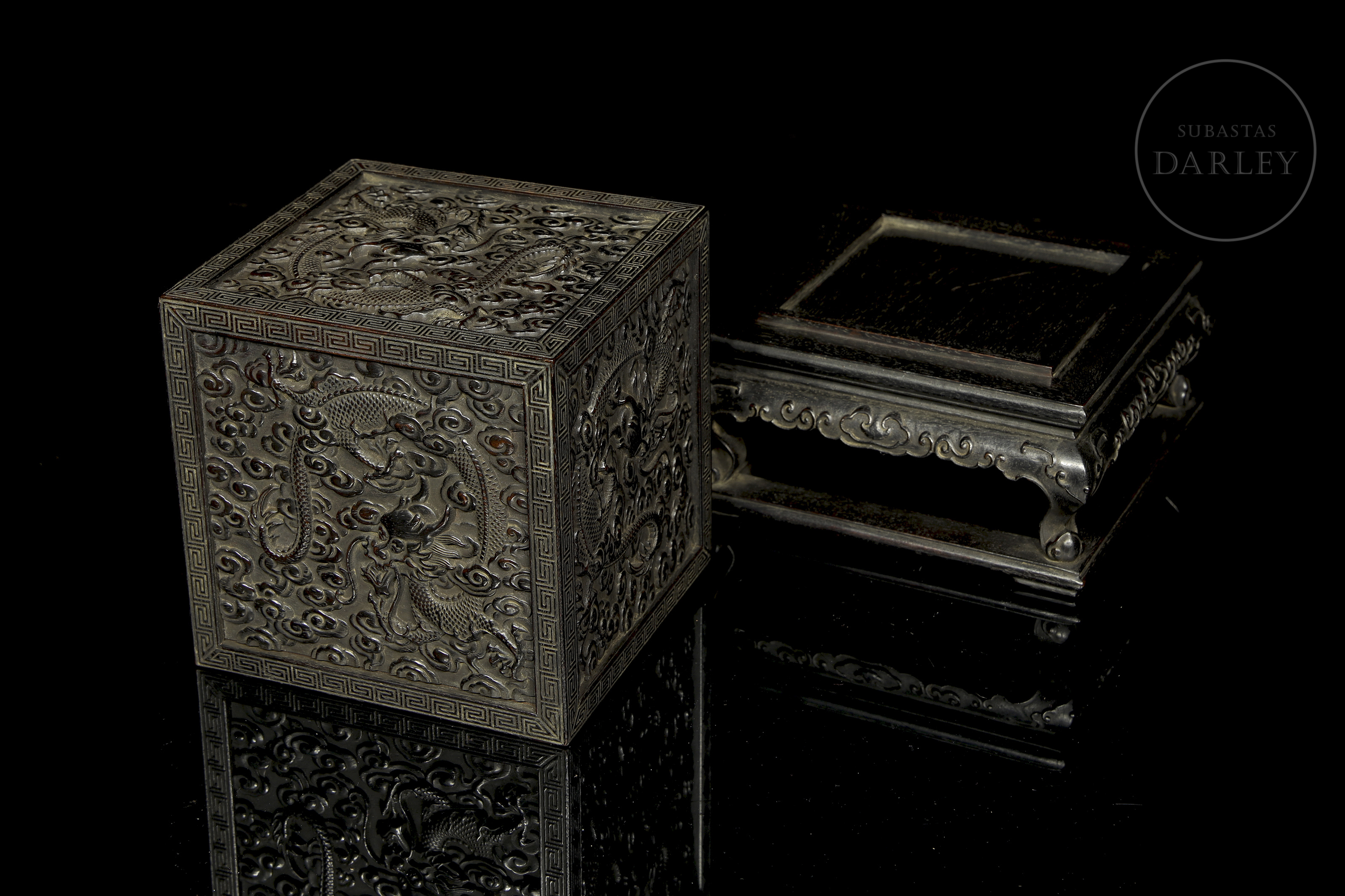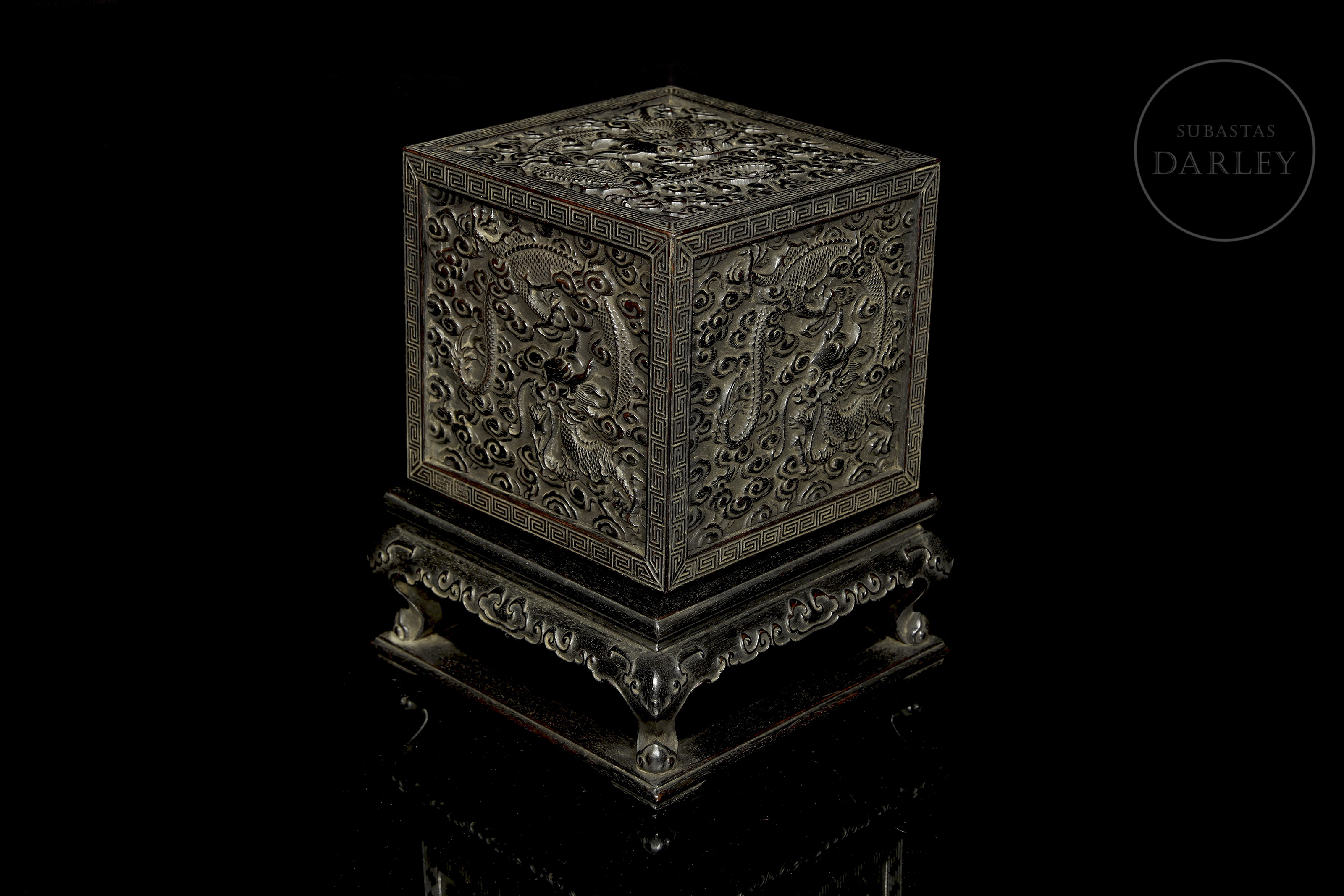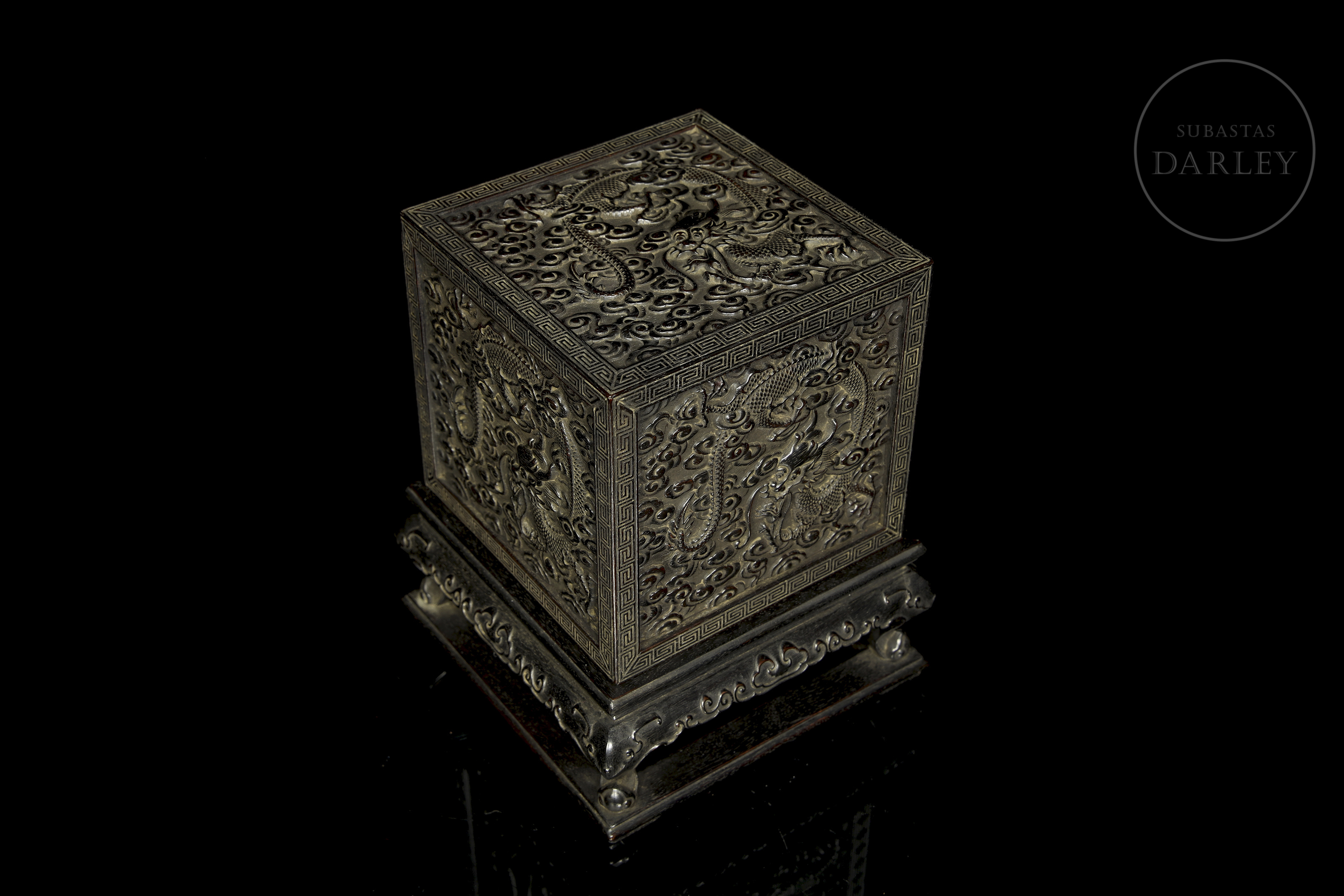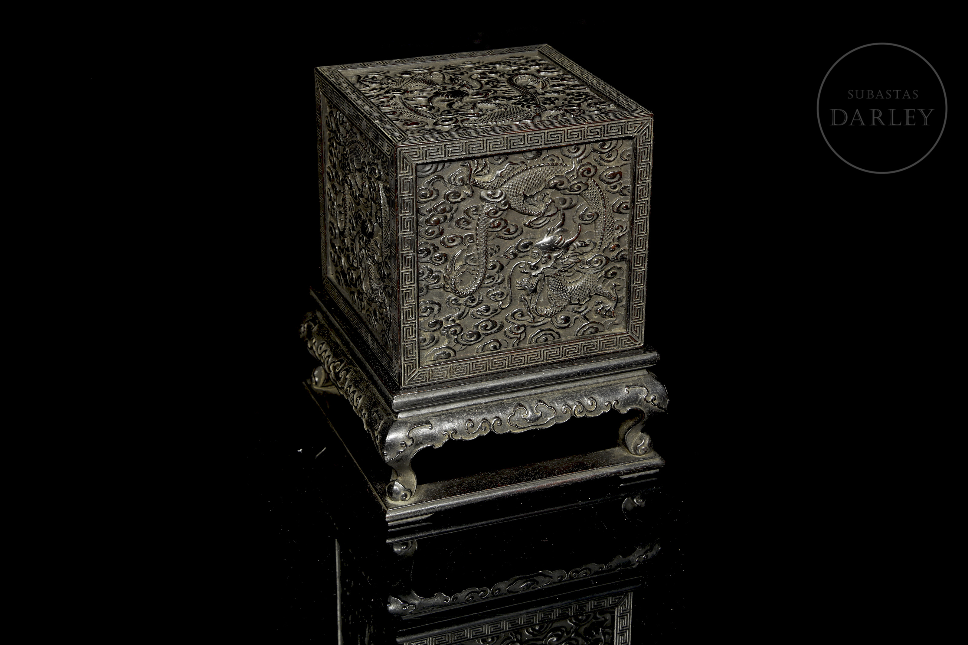 Realizada en madera de sándalo o zitan, de color oscuro. Posee un formato cúbico, concebido para albergar un sello de gran formato, y se encuentra íntegramente decorada en sus cinco caras visibles con una soberbia talla en bajorrelieve. El diseño muestra a varios dragones imperiales de cinco garras moviéndose sinuosamente entre densas volutas de nubes y llamas. Destaca por detalles minuciosos en las escamas, las melenas y las expresiones feroces, todo ello enmarcado por una elegante cenefa de grecas geométricas. Dinastía Qing (1644–1912).