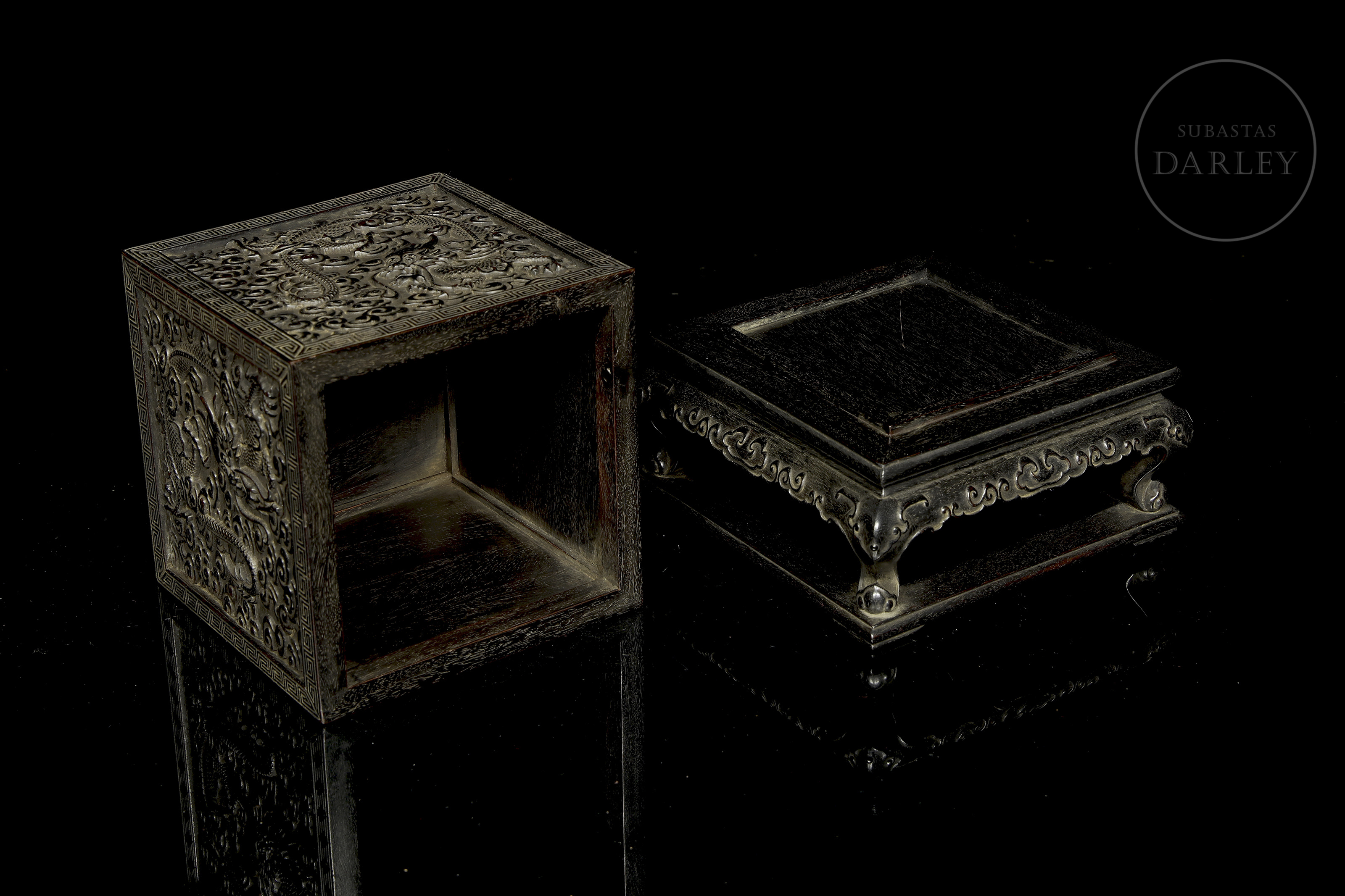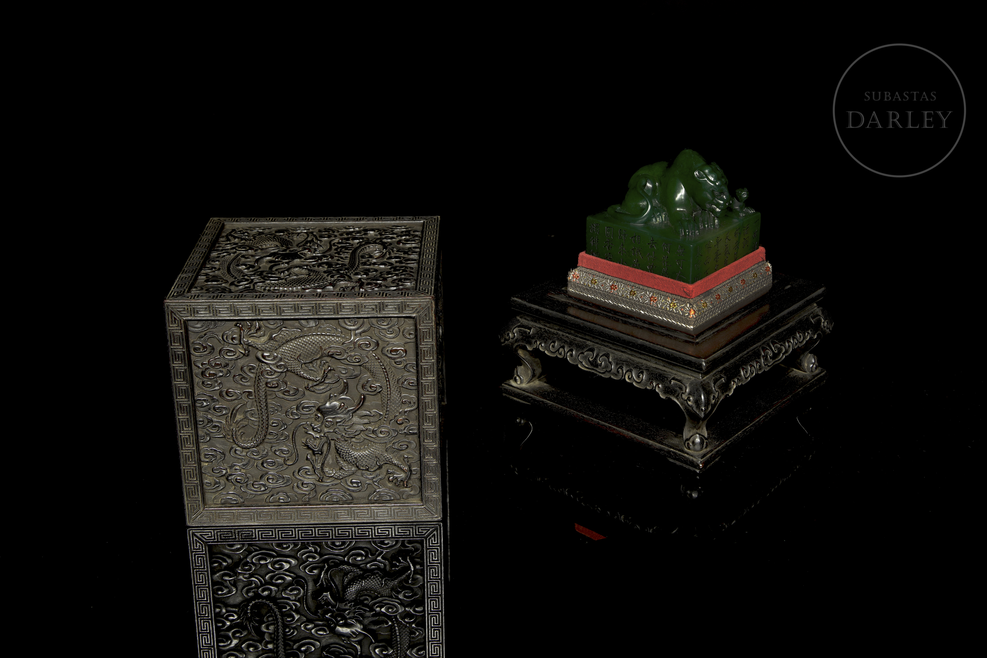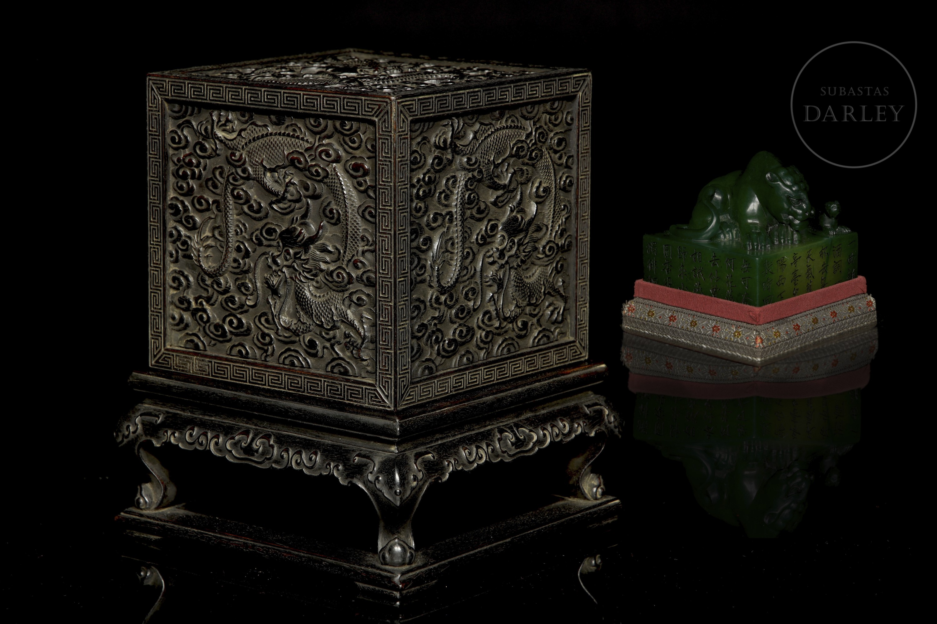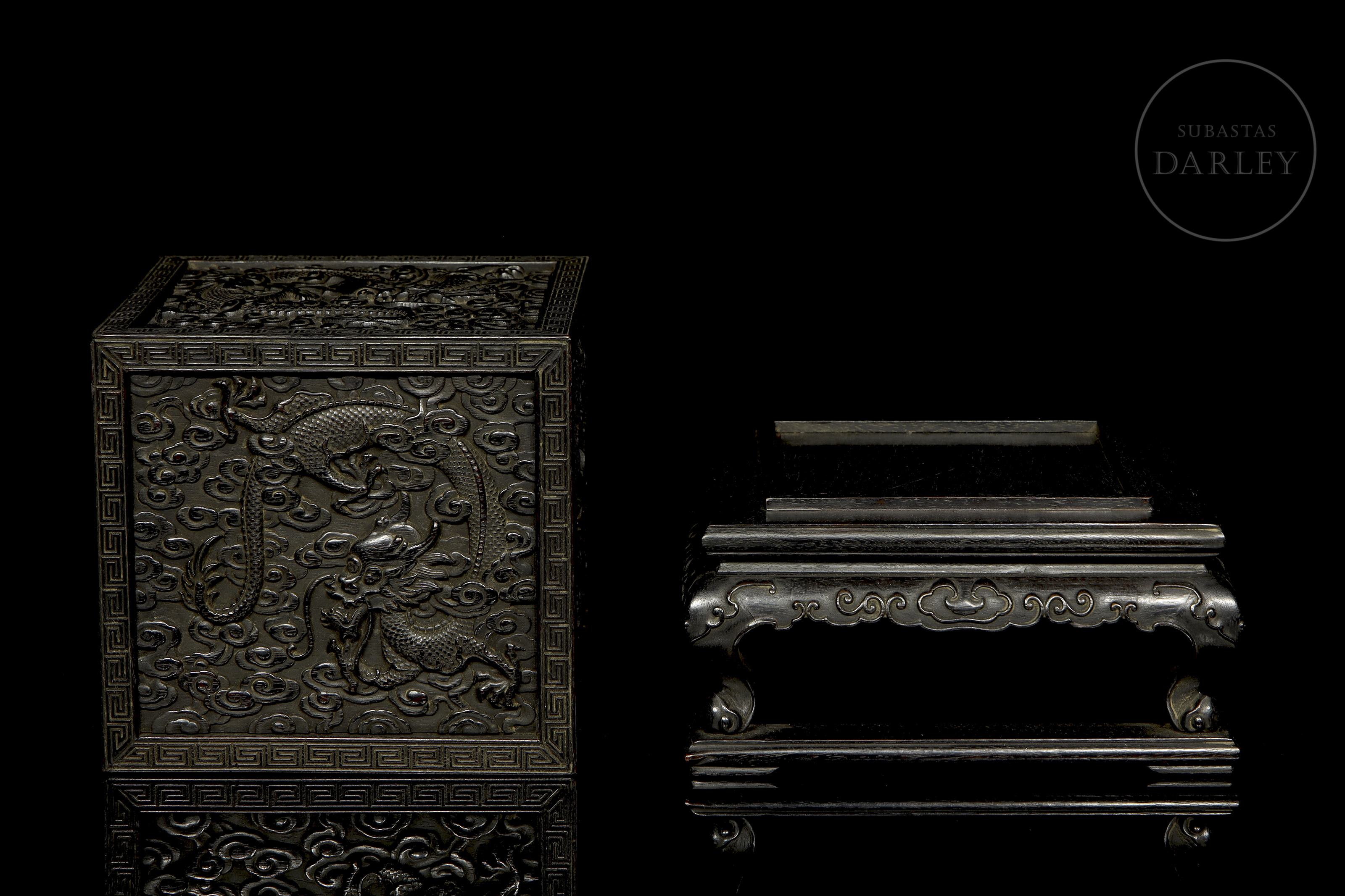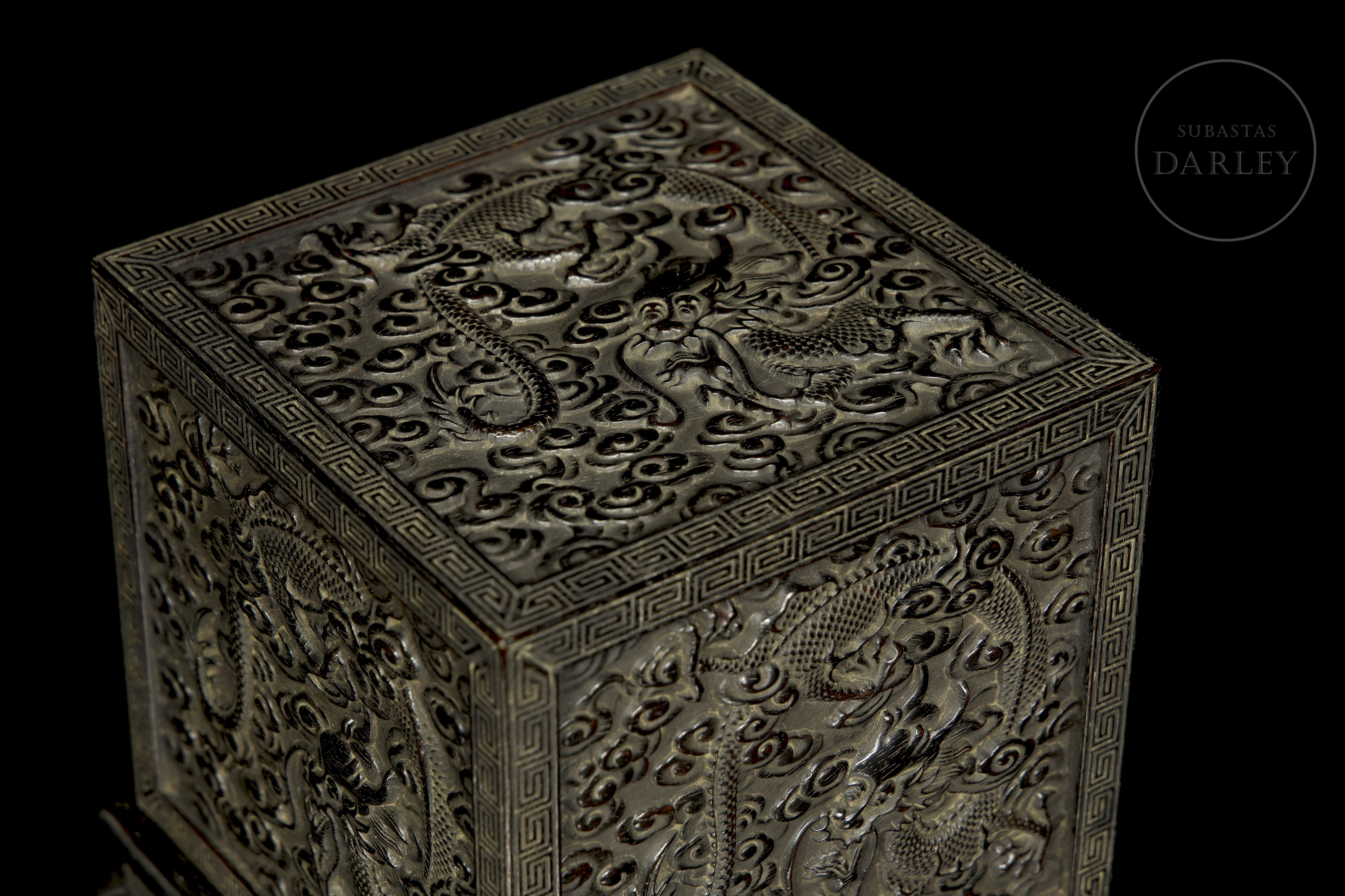 Realizada en madera de sándalo o zitan, de color oscuro. Posee un formato cúbico, concebido para albergar un sello de gran formato, y se encuentra íntegramente decorada en sus cinco caras visibles con una soberbia talla en bajorrelieve. El diseño muestra a varios dragones imperiales de cinco garras moviéndose sinuosamente entre densas volutas de nubes y llamas. Destaca por detalles minuciosos en las escamas, las melenas y las expresiones feroces, todo ello enmarcado por una elegante cenefa de grecas geométricas. Dinastía Qing (1644–1912).