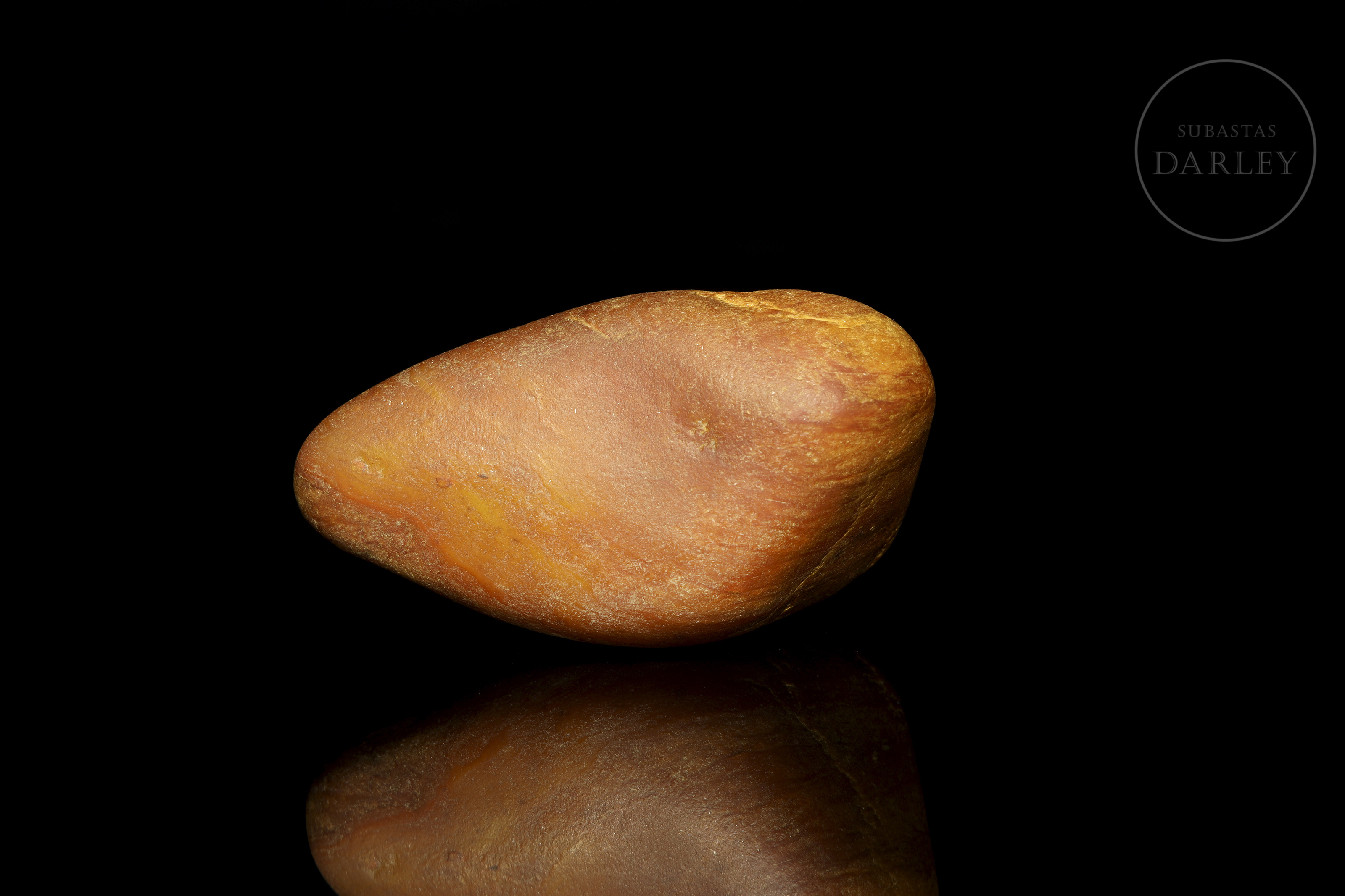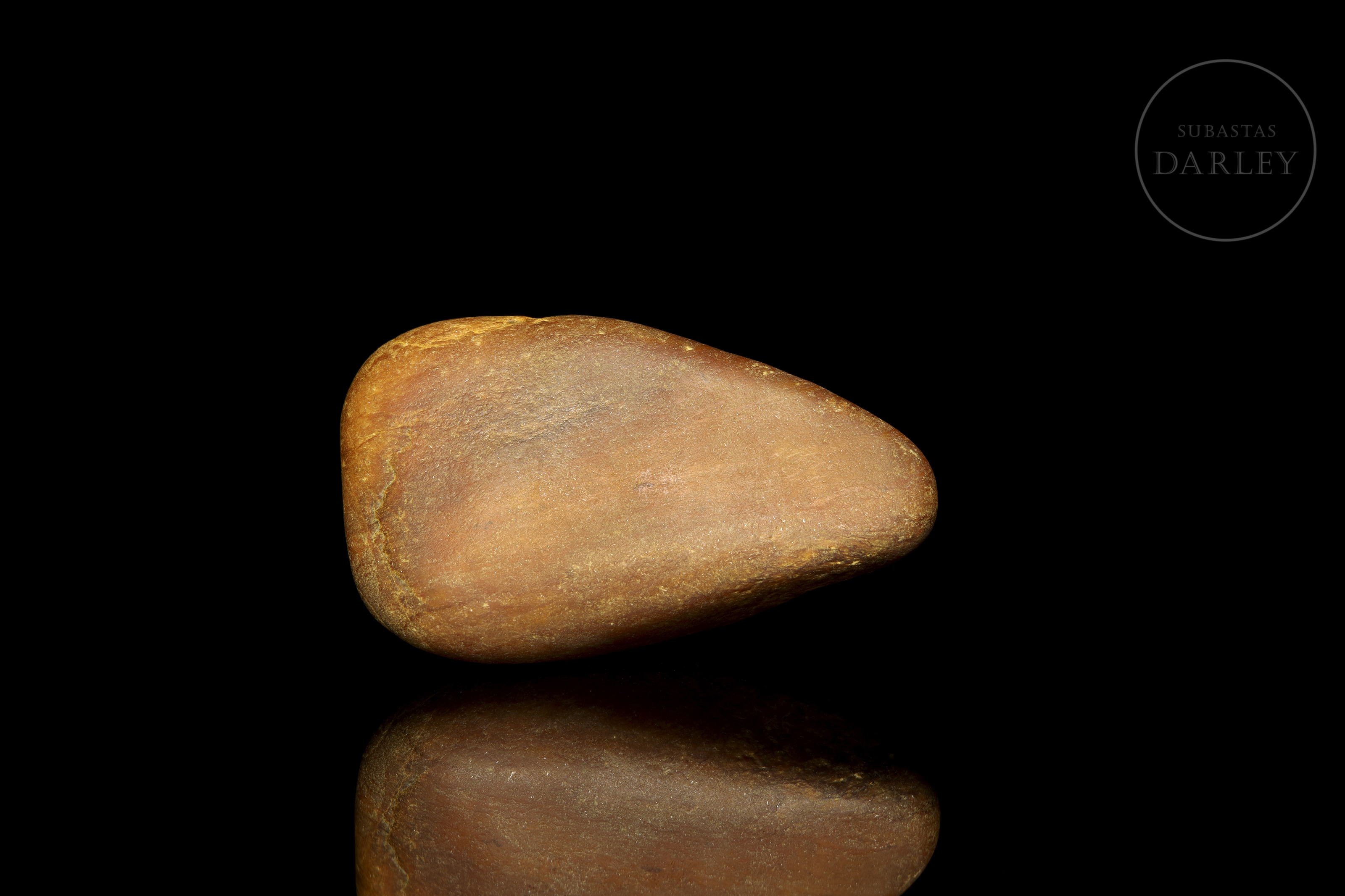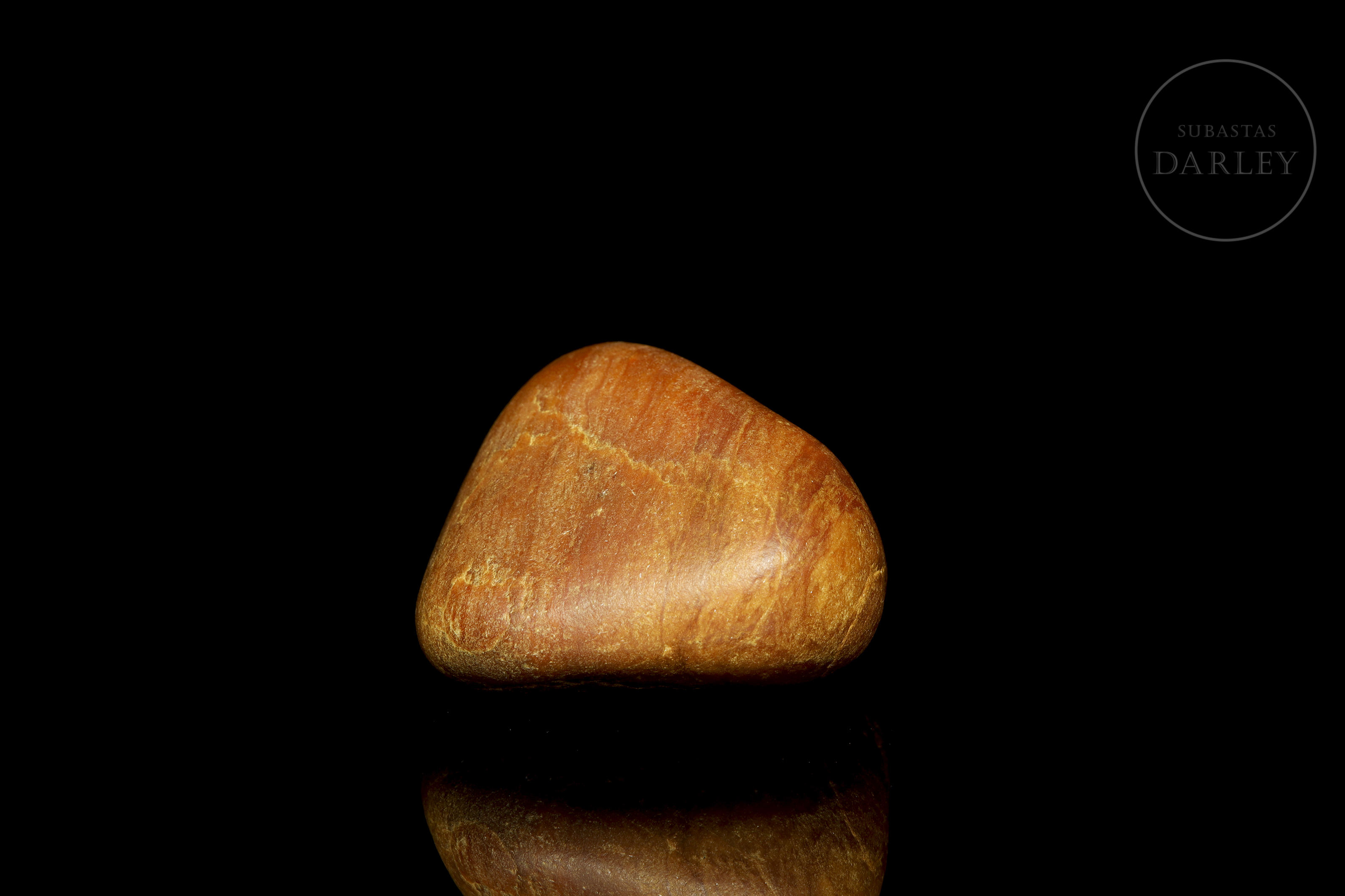 Canto rodado de jade de tonalidad anaranjada con matices rojizos y ocres, de forma irregular y superficies suavemente pulidas de manera natural. Presenta vetas y variaciones cromáticas propias de la piedra, que acentúan su carácter orgánico y único.