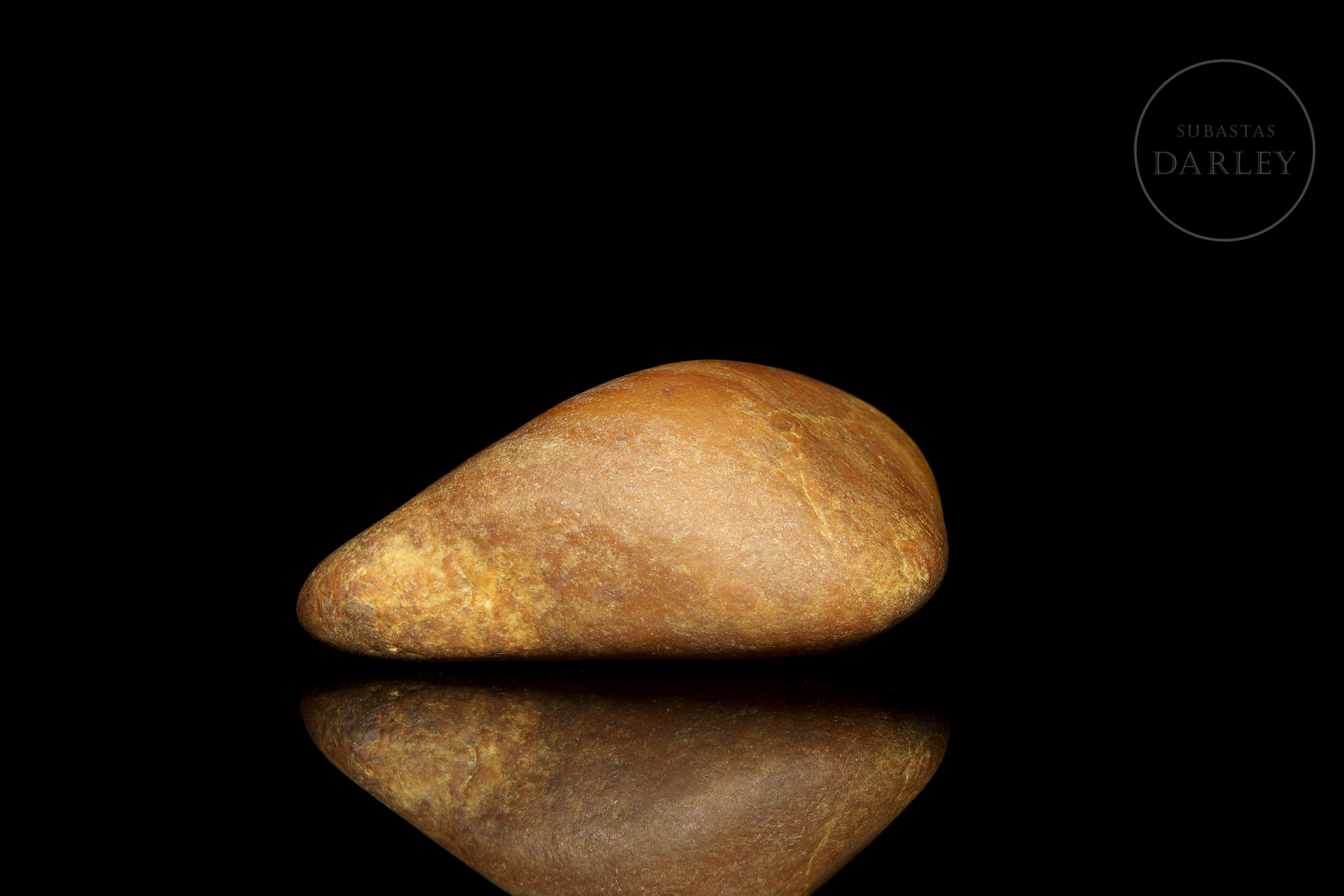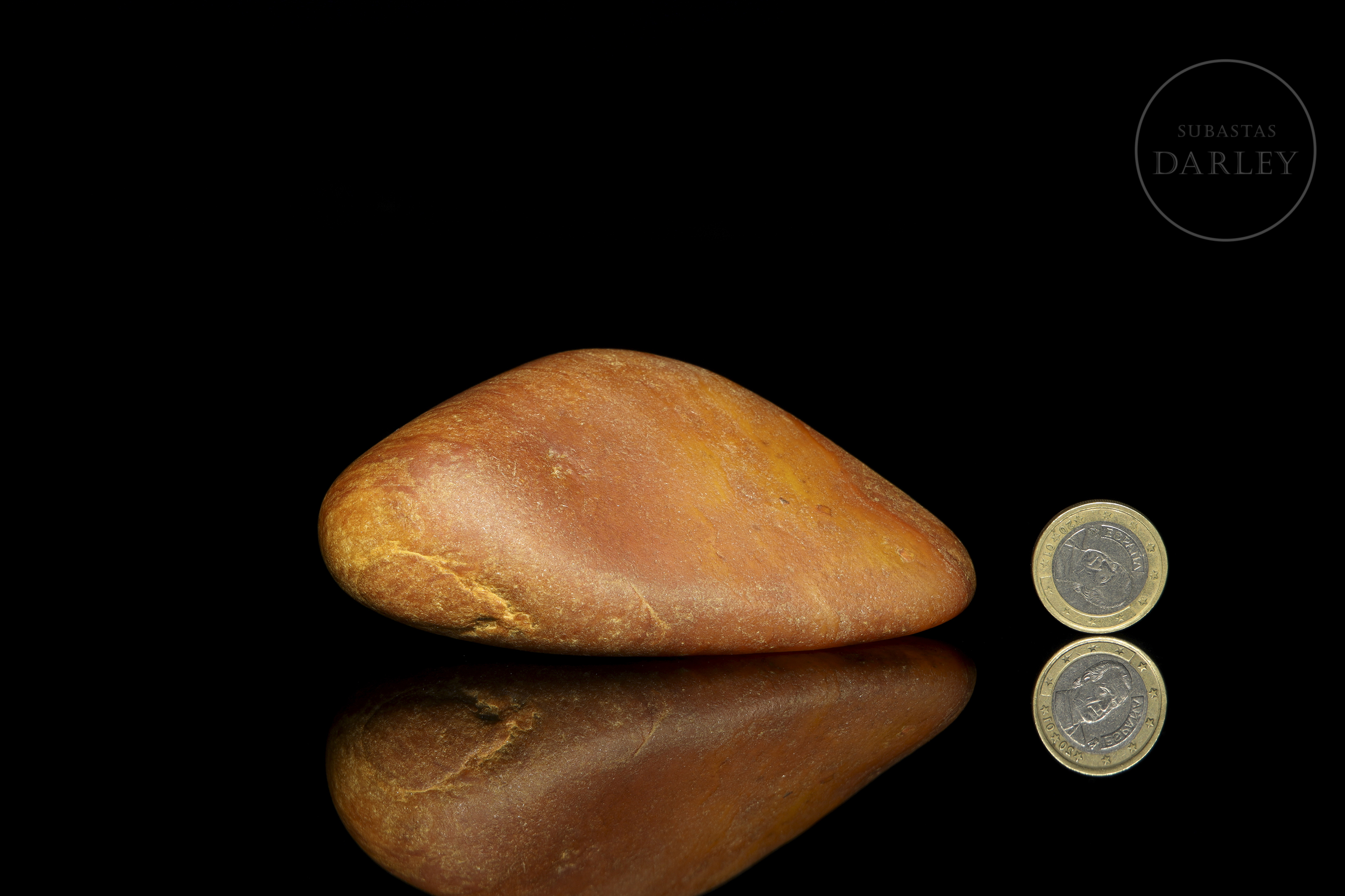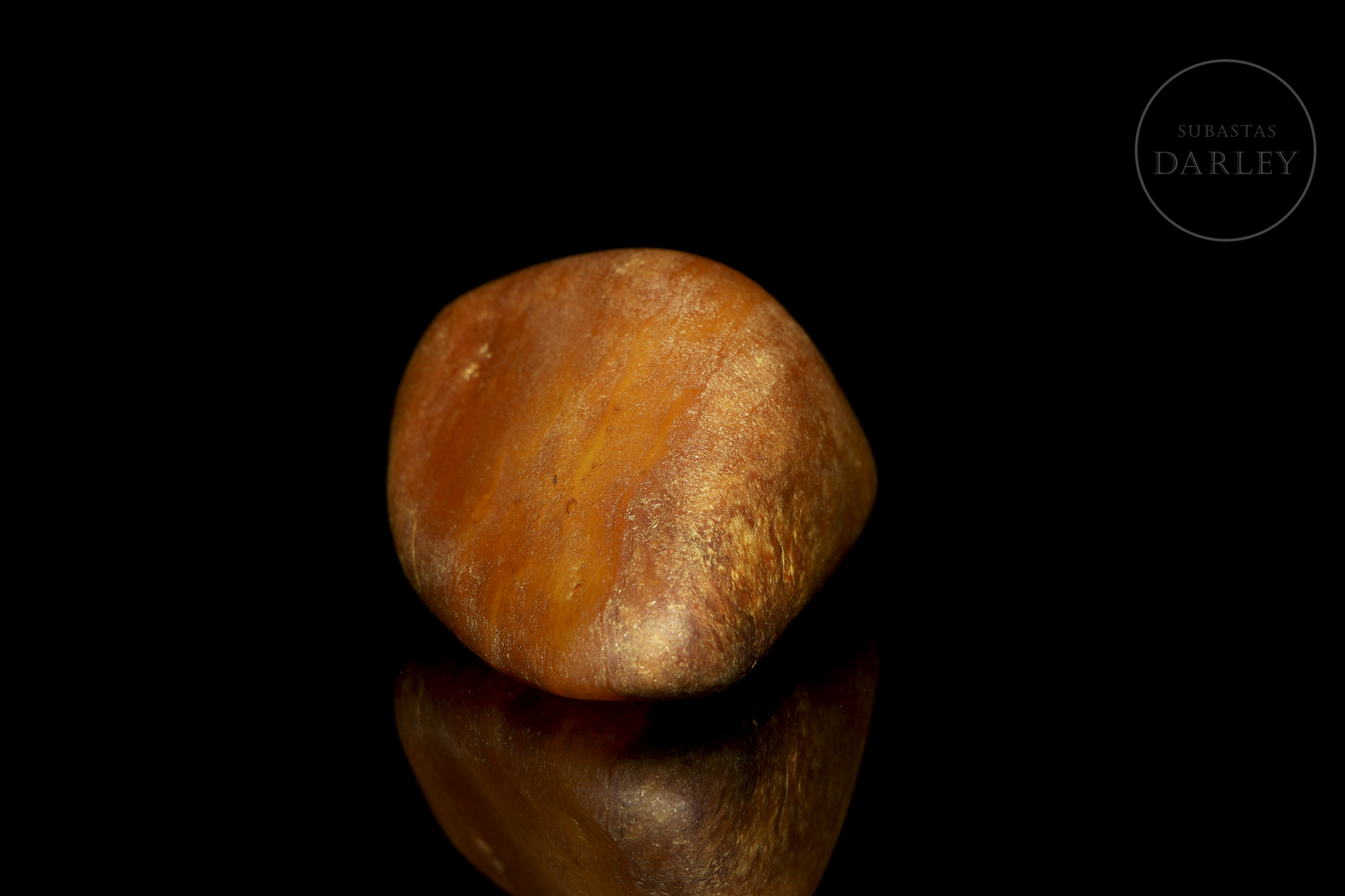 Canto rodado de jade de tonalidad anaranjada con matices rojizos y ocres, de forma irregular y superficies suavemente pulidas de manera natural. Presenta vetas y variaciones cromáticas propias de la piedra, que acentúan su carácter orgánico y único.