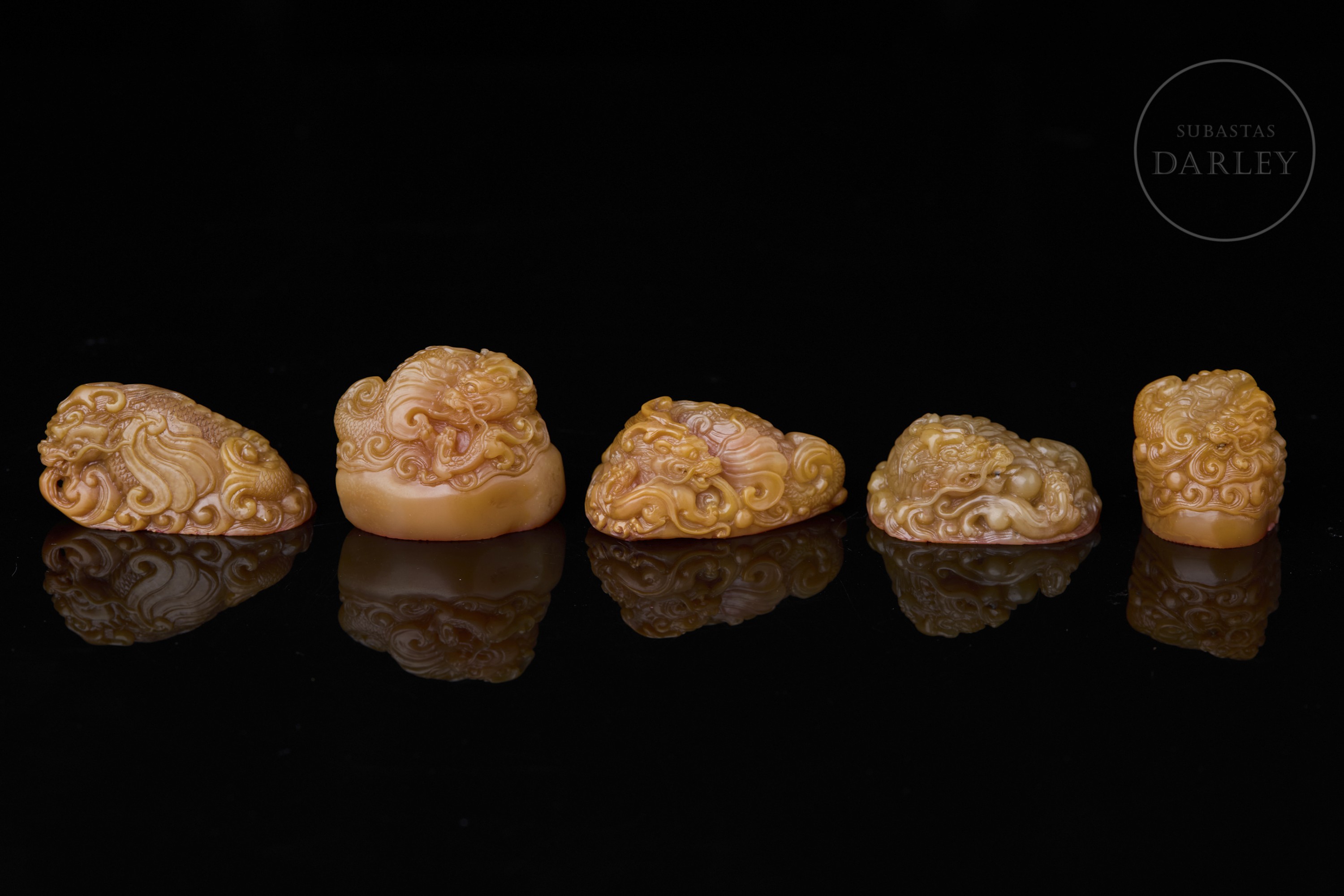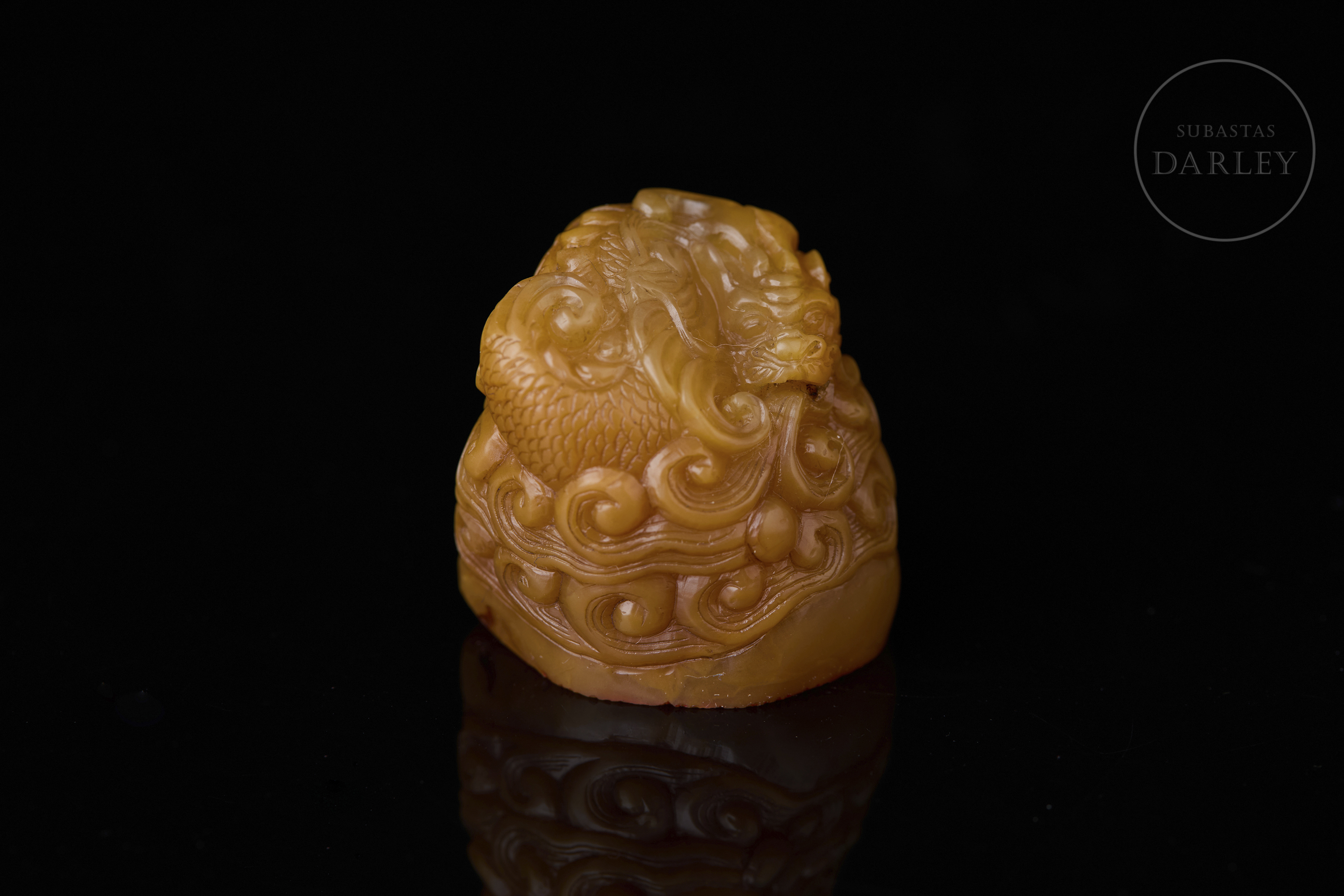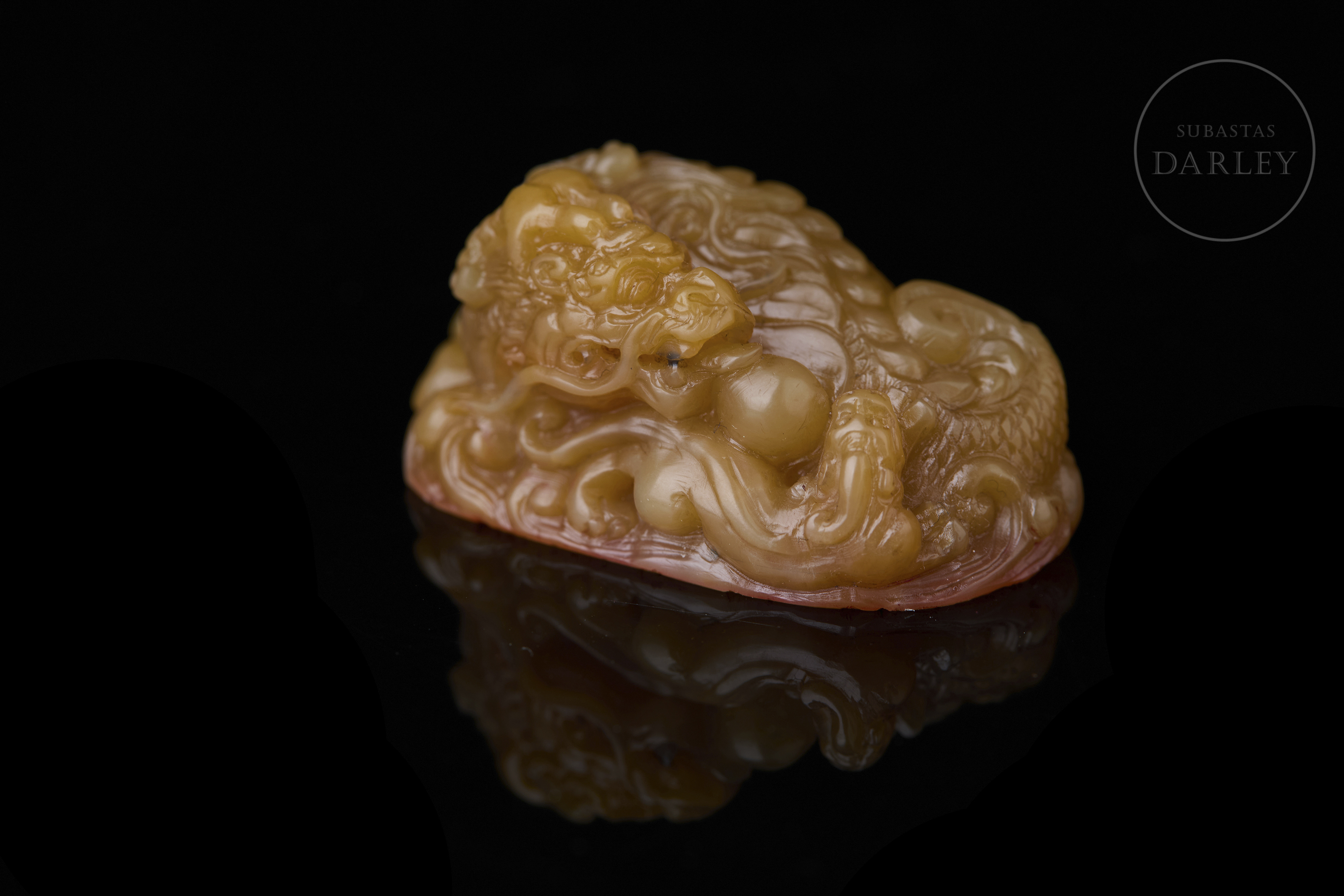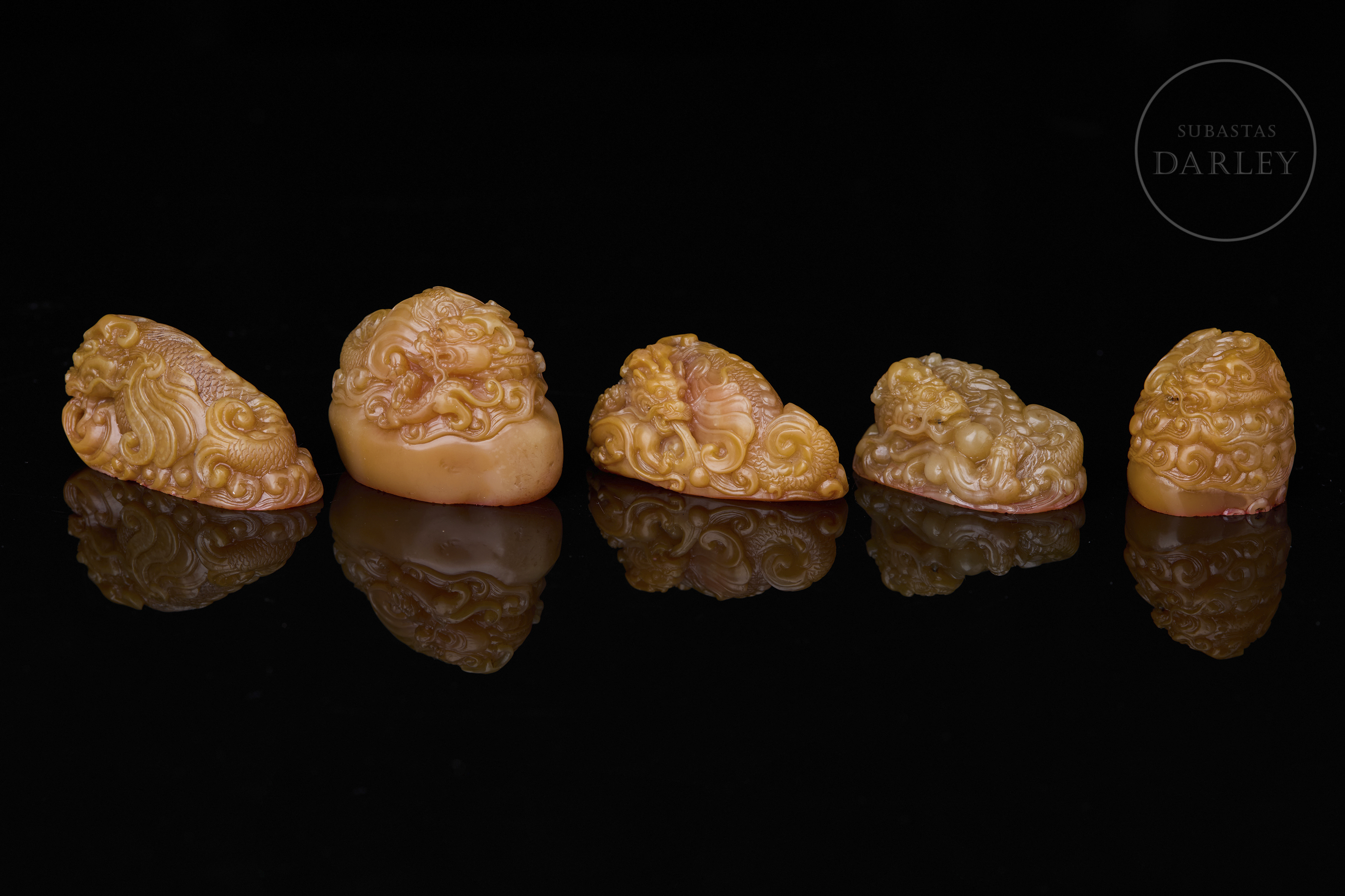 Piedra Shoushan tallada de tonalidad miel. Cada pieza presenta una forma orgánica e irregular, sobre la que se ha ejecutado una talla en bulto redondo y relieve. La decoración de los remates representa al dragón Chiwen, serpenteando entre nubes estilizadas y olas, con detalles incisos que definen escamas, melenas y rasgos faciales. La base de cada sello contiene caracteres grabados en estilo sigilar clásico. La obra se presenta en una caja original forrada en seda brocada. Dinastía Qing (1644–1911).