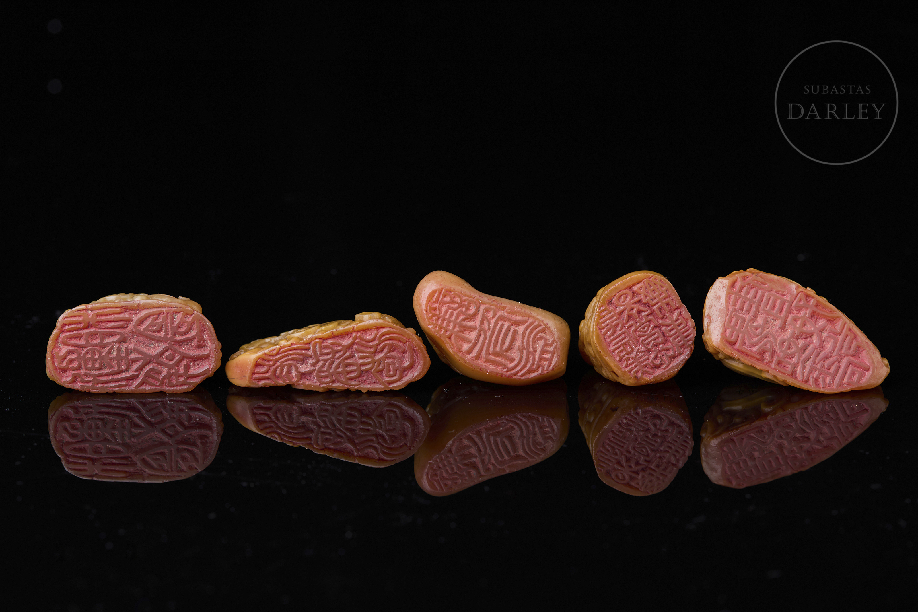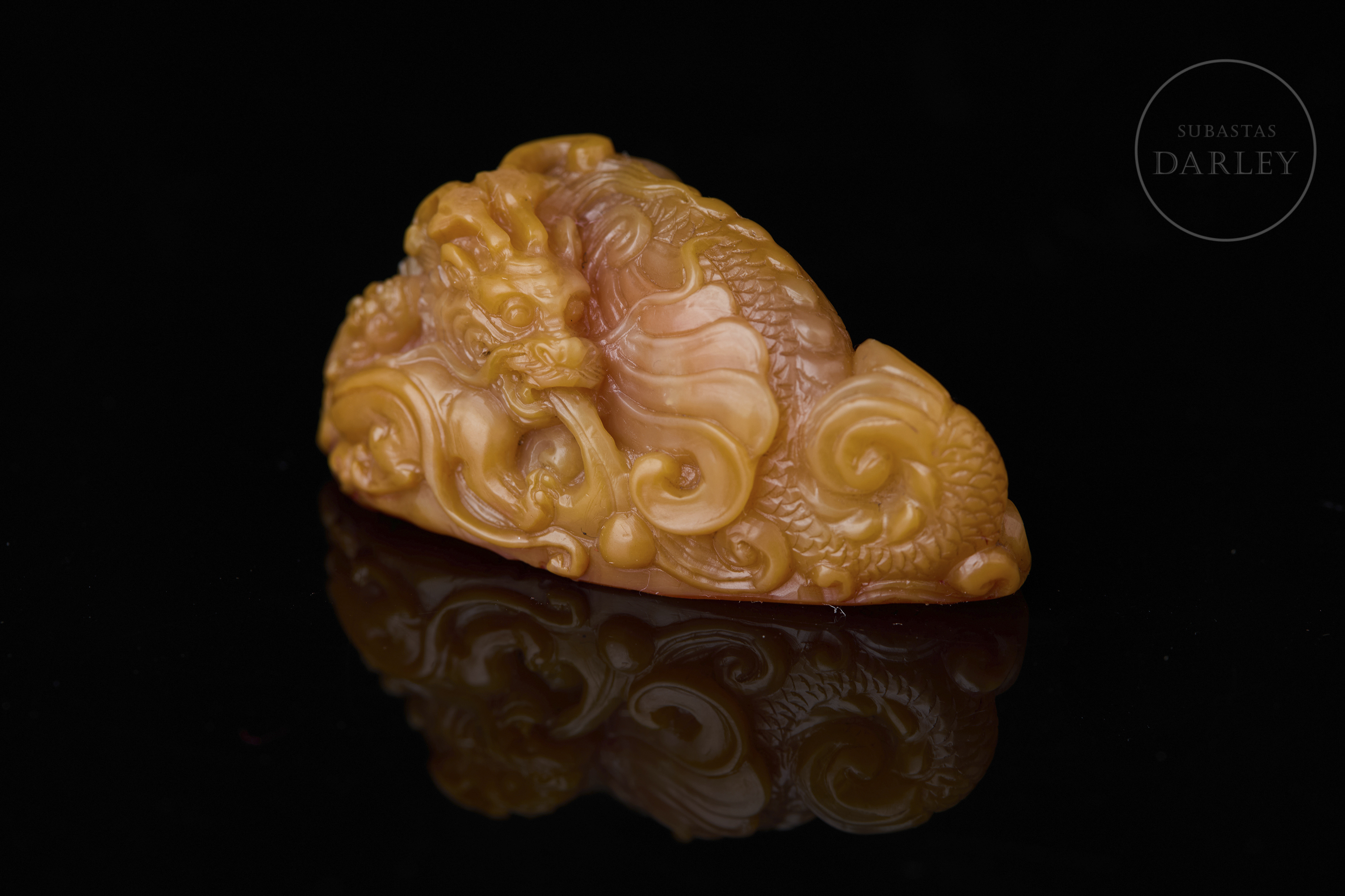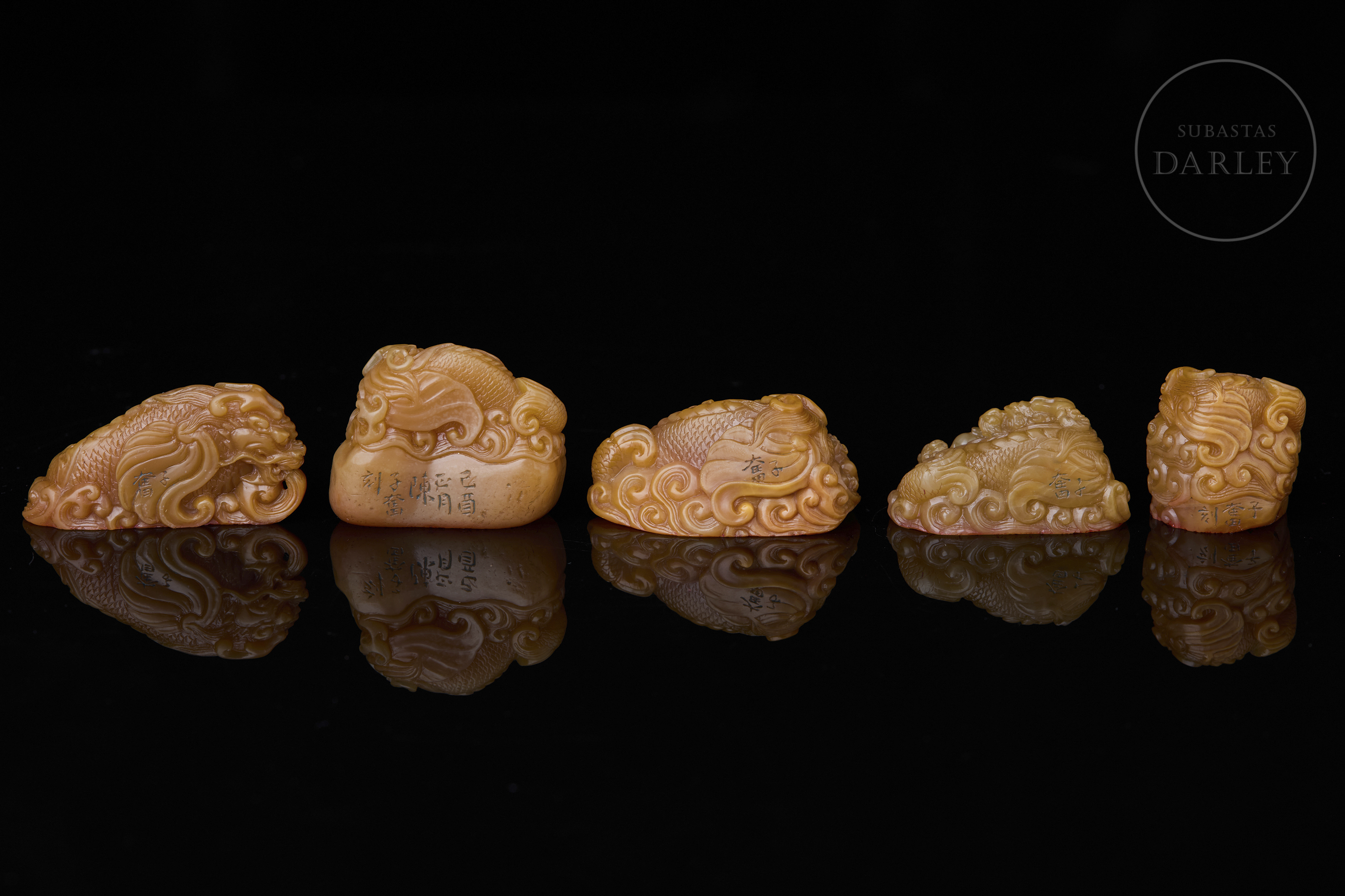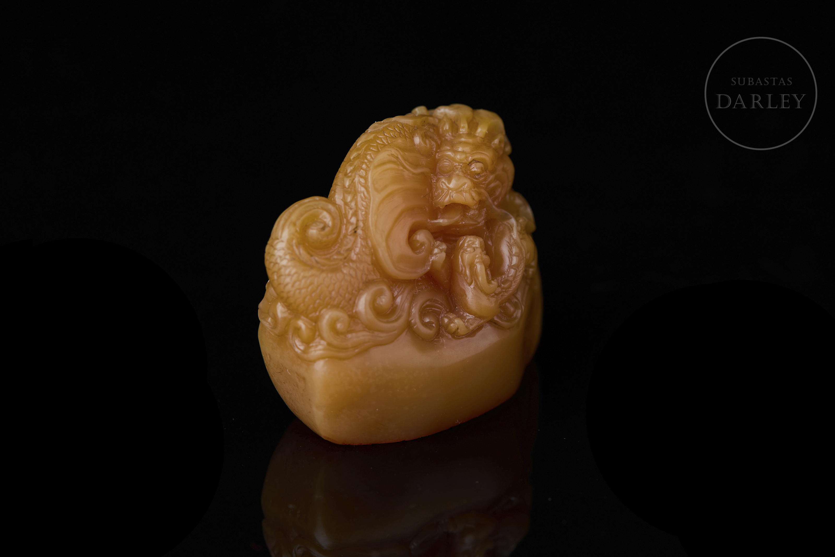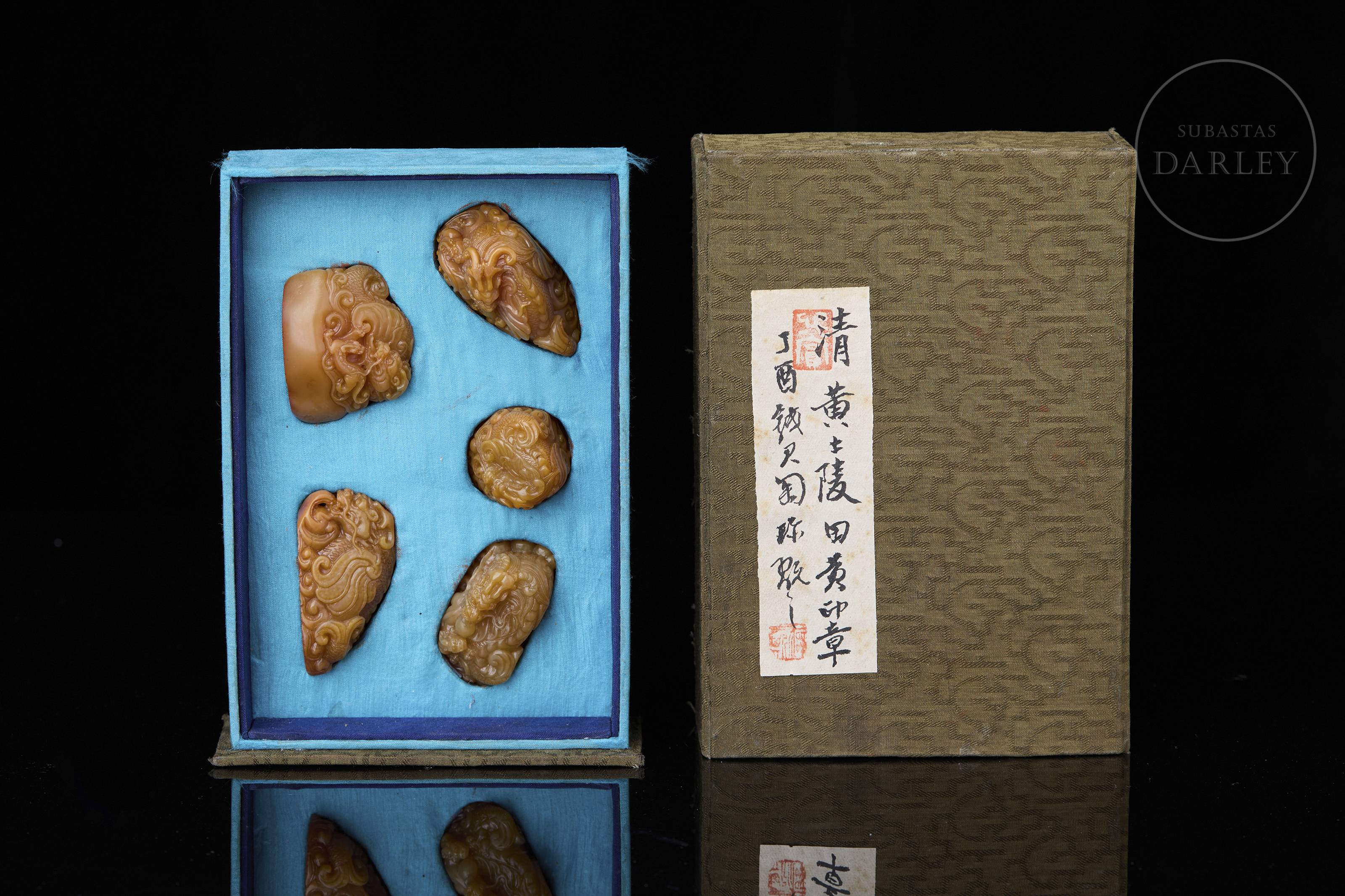 Piedra Shoushan tallada de tonalidad miel. Cada pieza presenta una forma orgánica e irregular, sobre la que se ha ejecutado una talla en bulto redondo y relieve. La decoración de los remates representa al dragón Chiwen, serpenteando entre nubes estilizadas y olas, con detalles incisos que definen escamas, melenas y rasgos faciales. La base de cada sello contiene caracteres grabados en estilo sigilar clásico. La obra se presenta en una caja original forrada en seda brocada. Dinastía Qing (1644–1911).