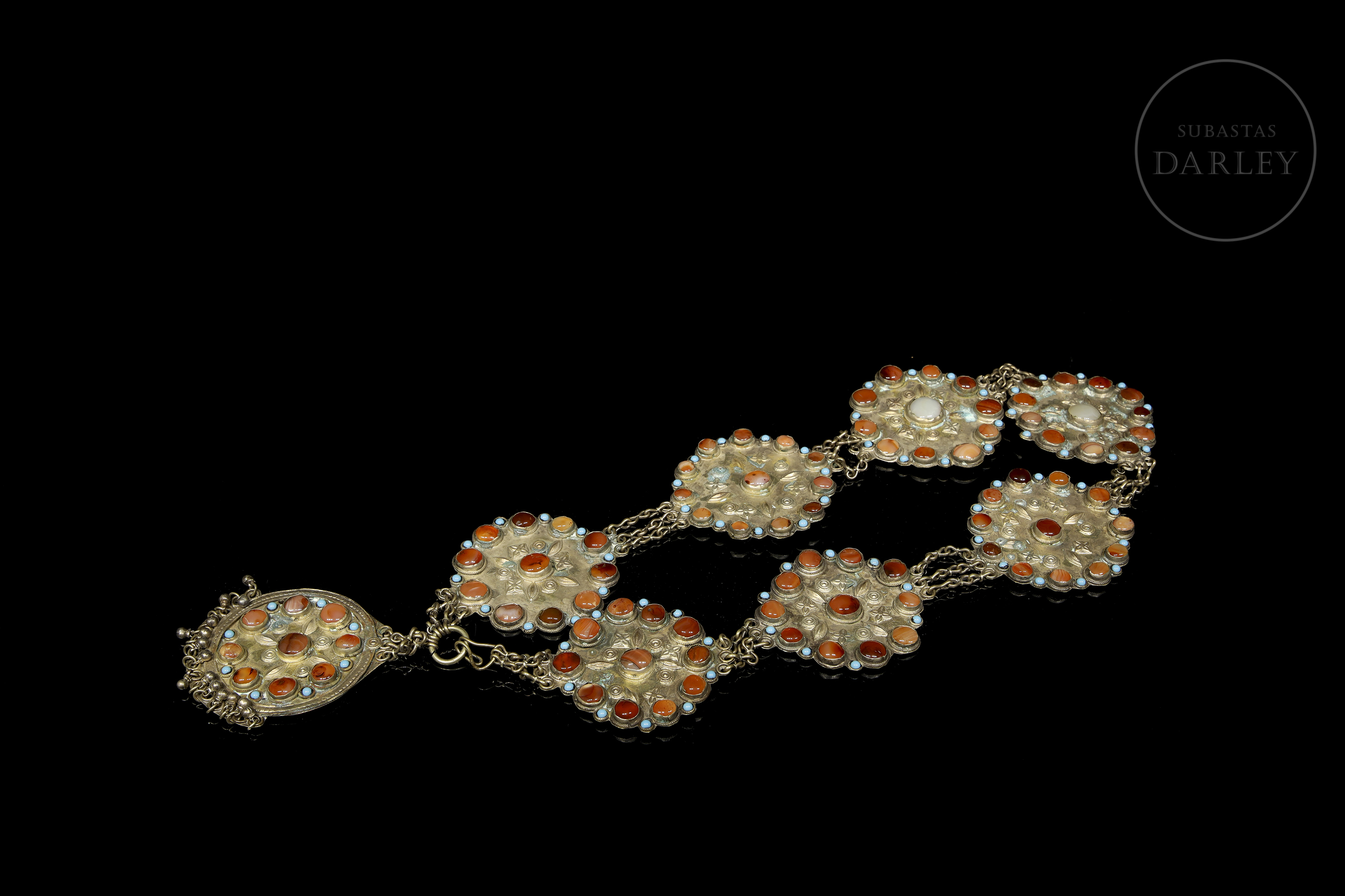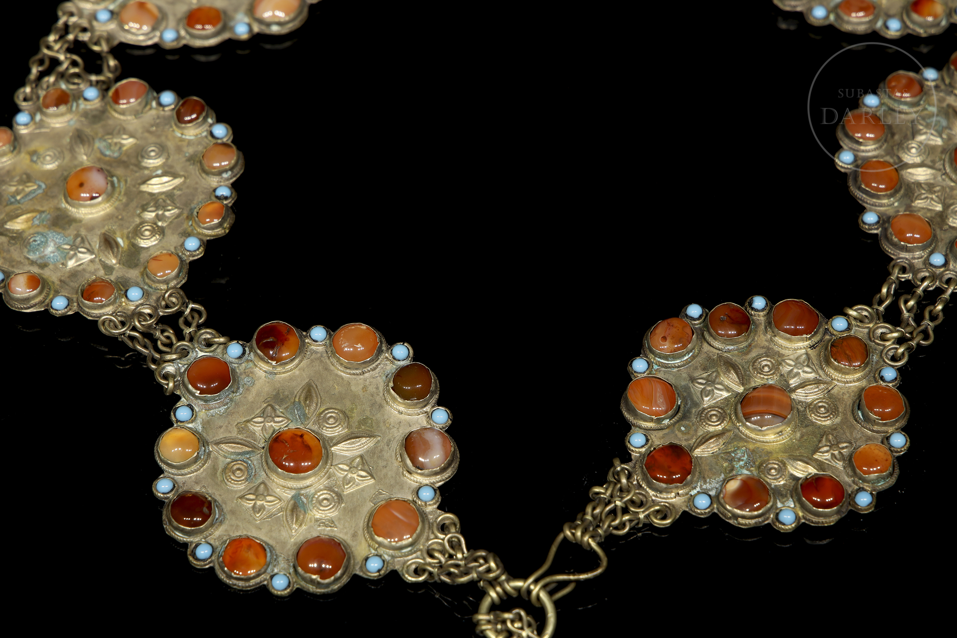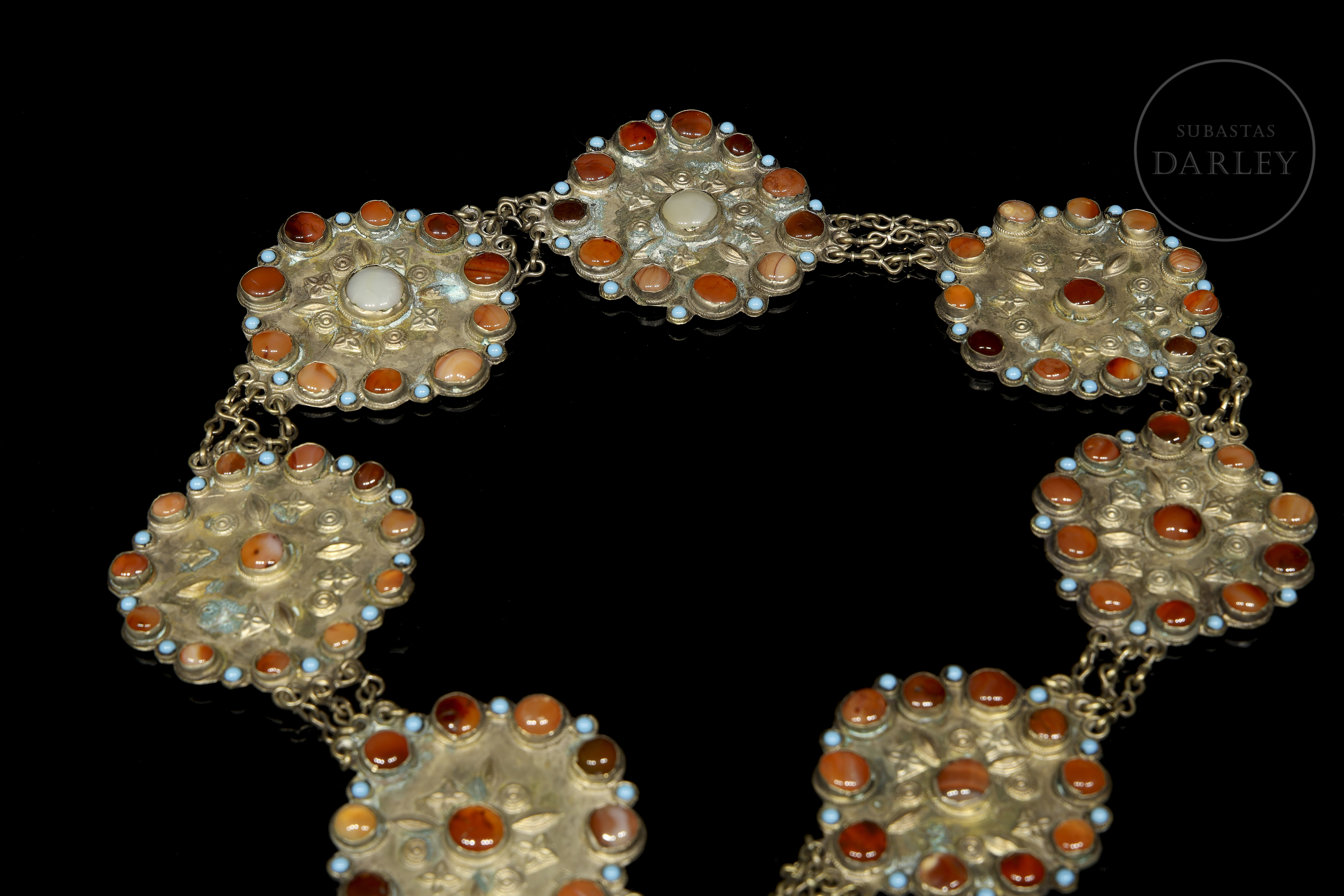 Cinturón de metal repujado, estructurado como una cadena formada por ocho placas lobuladas. Está adornado con elementos florales y geométricos repujados, que enmarcan piedras de color coral y turquesa en cabujón.