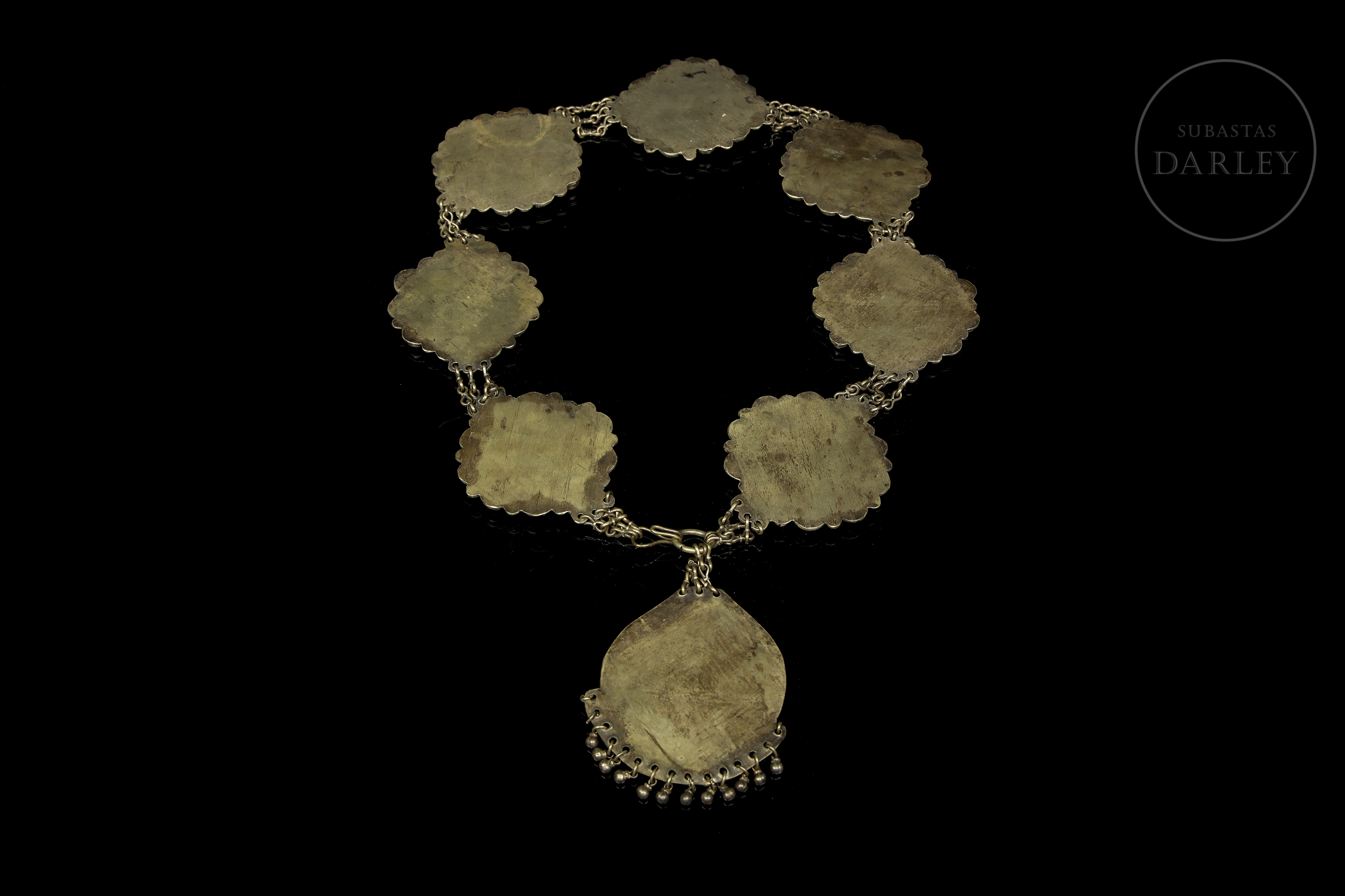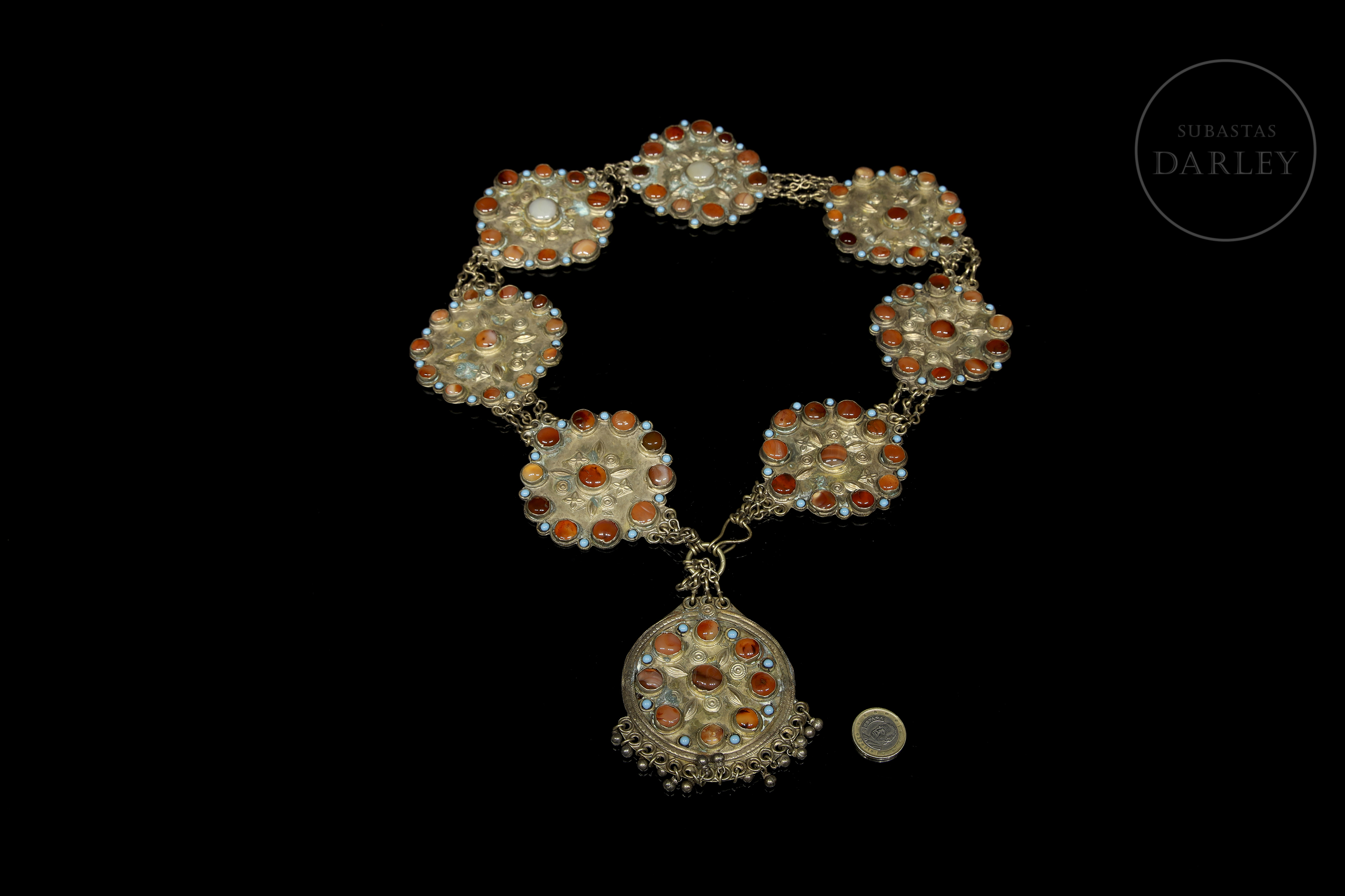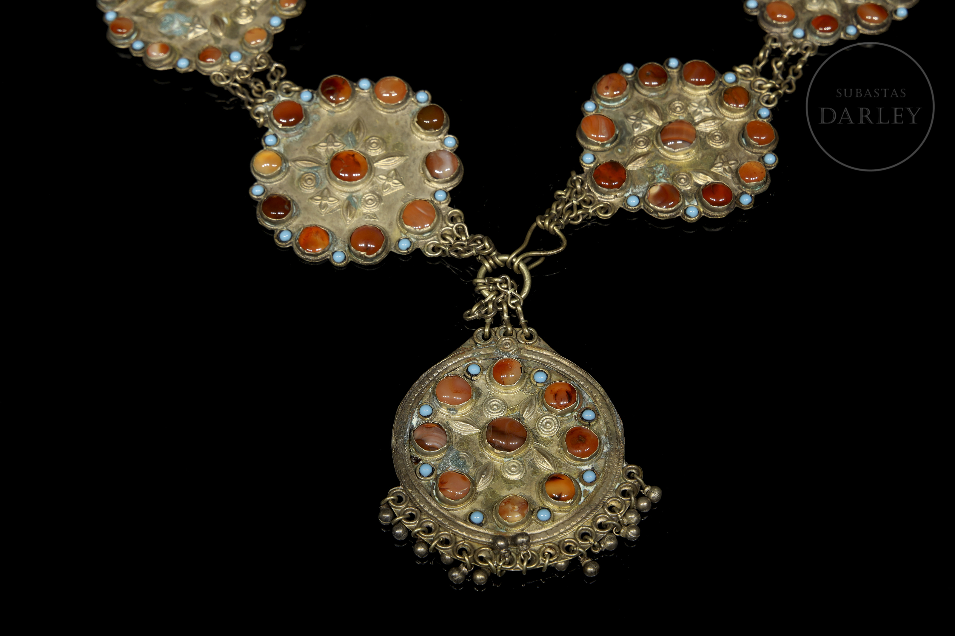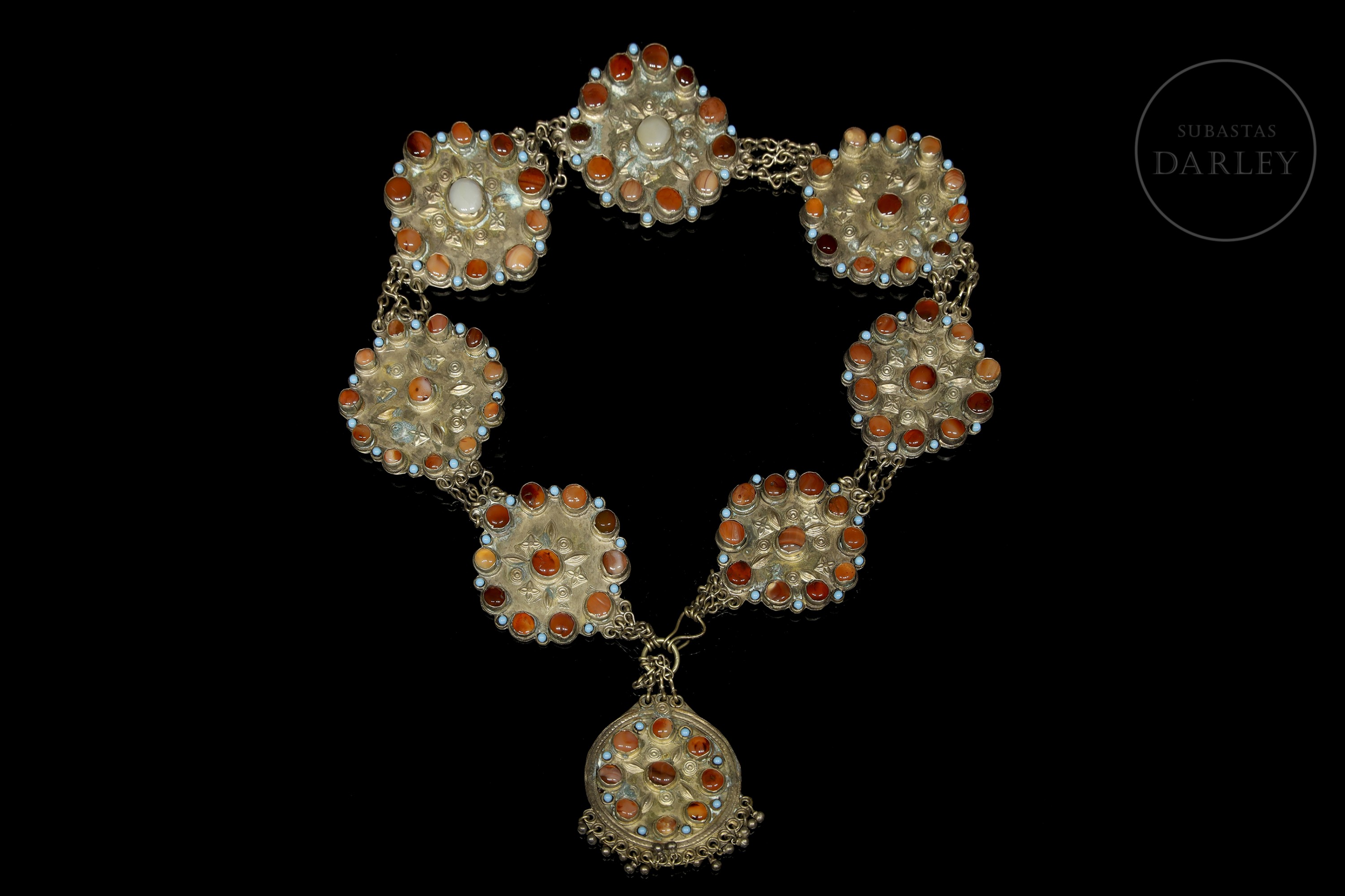 Cinturón de metal repujado, estructurado como una cadena formada por ocho placas lobuladas. Está adornado con elementos florales y geométricos repujados, que enmarcan piedras de color coral y turquesa en cabujón.