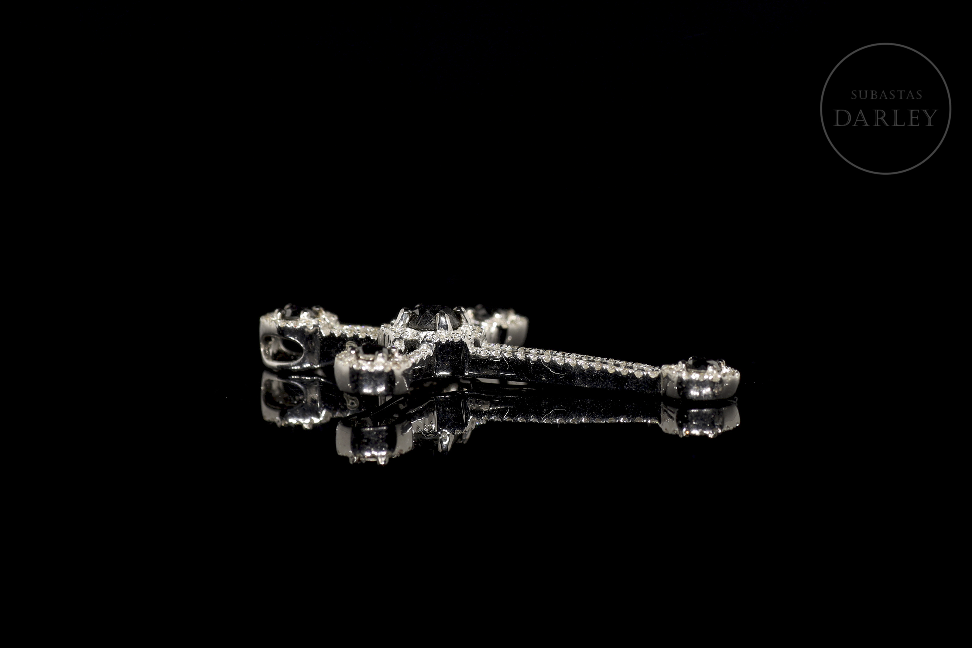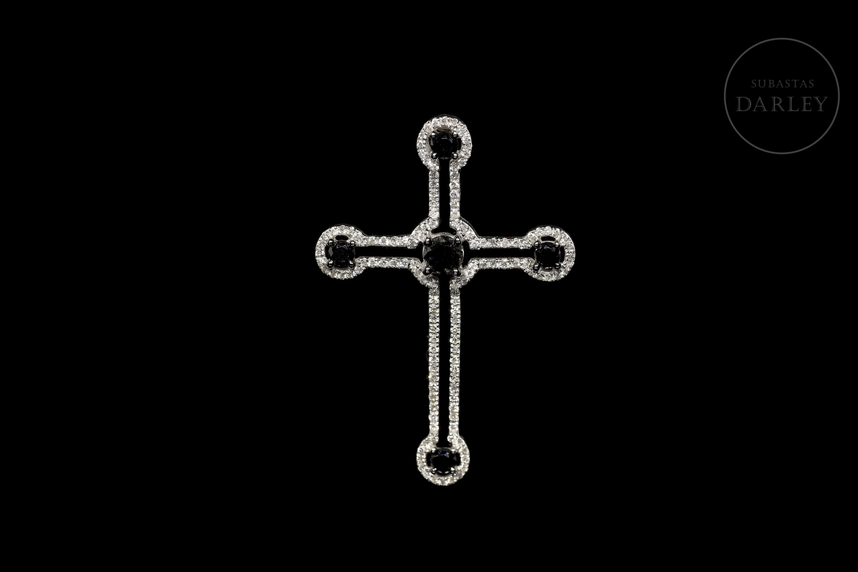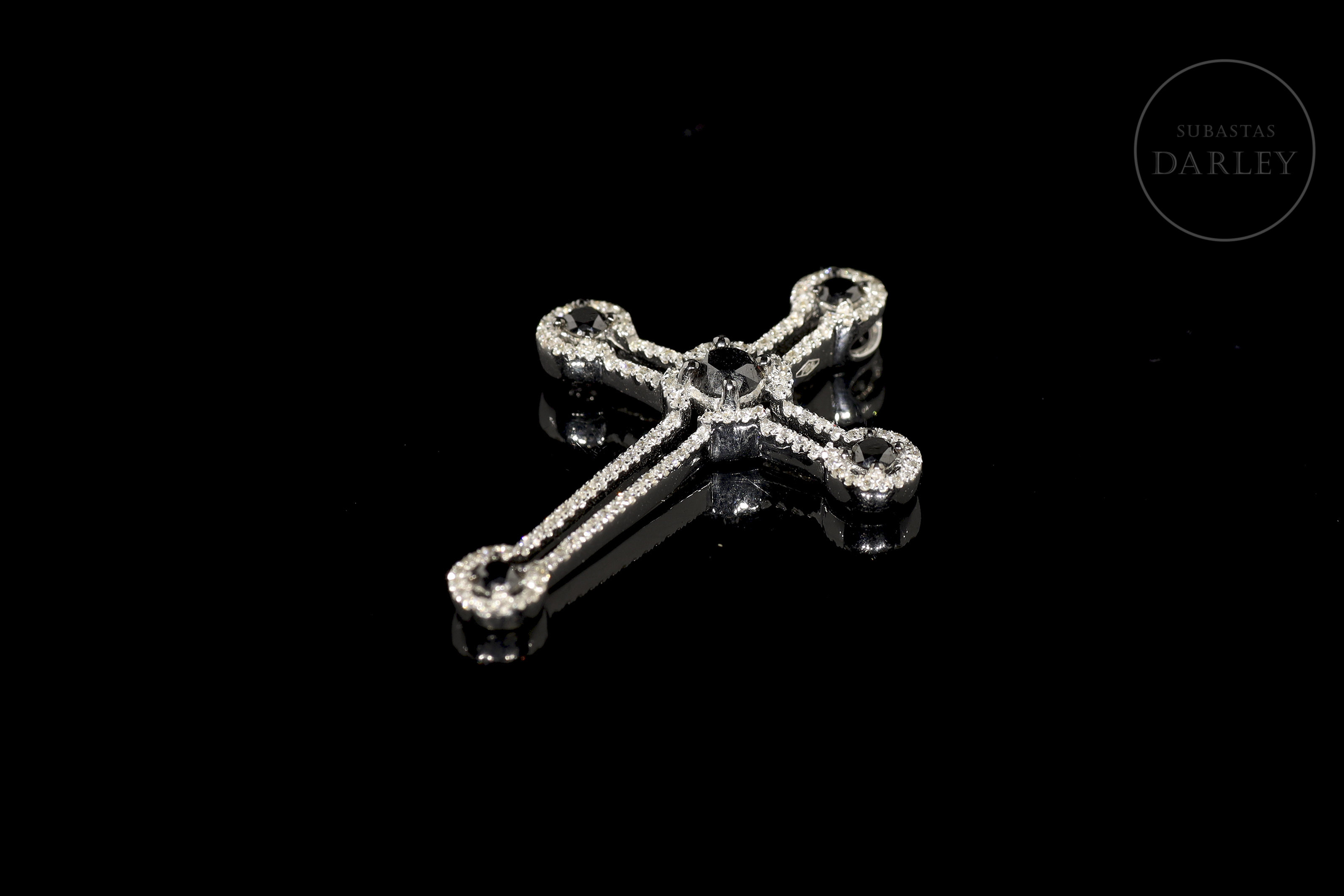 Colgante en oro blanco de 18 k en forma de cruz. El perfil se encuentra cubierto de u total de 132 diamantes, talla brillante, con un peso total de 0,57 ct. En el centro y extremos se disponen un total de 5 diamantes negros de mayor tamaño, talla brillante, y peso global 0,73 ct.