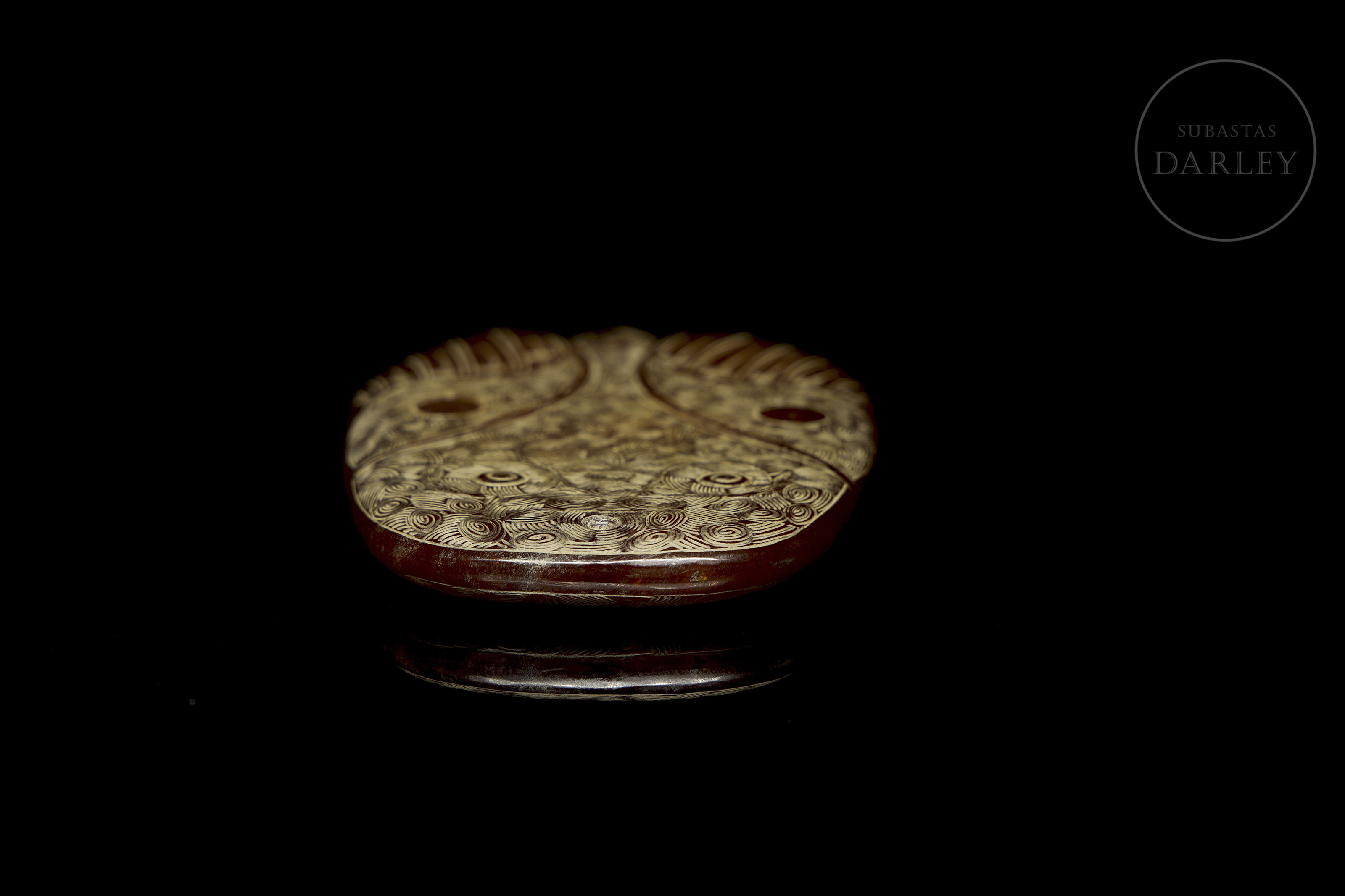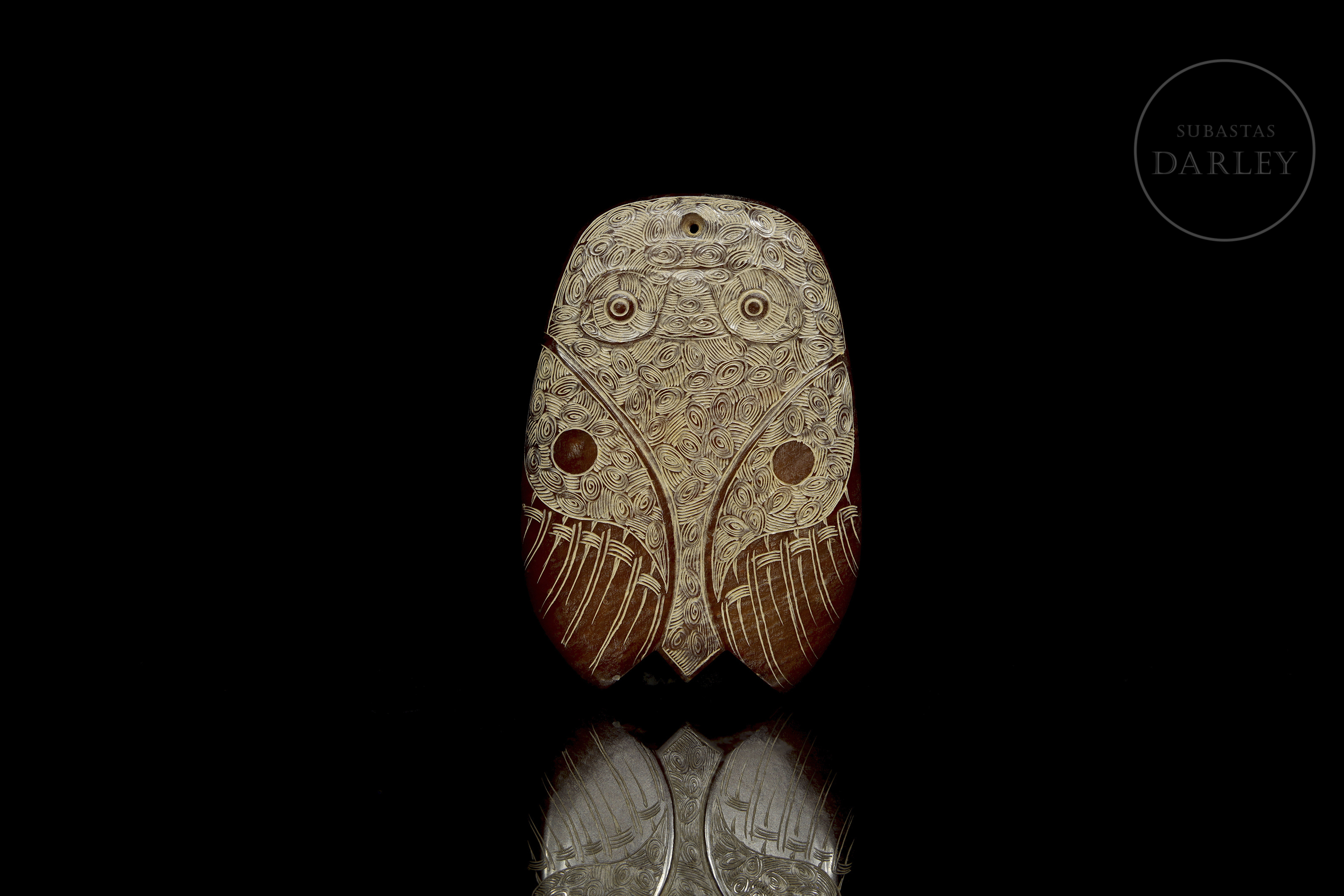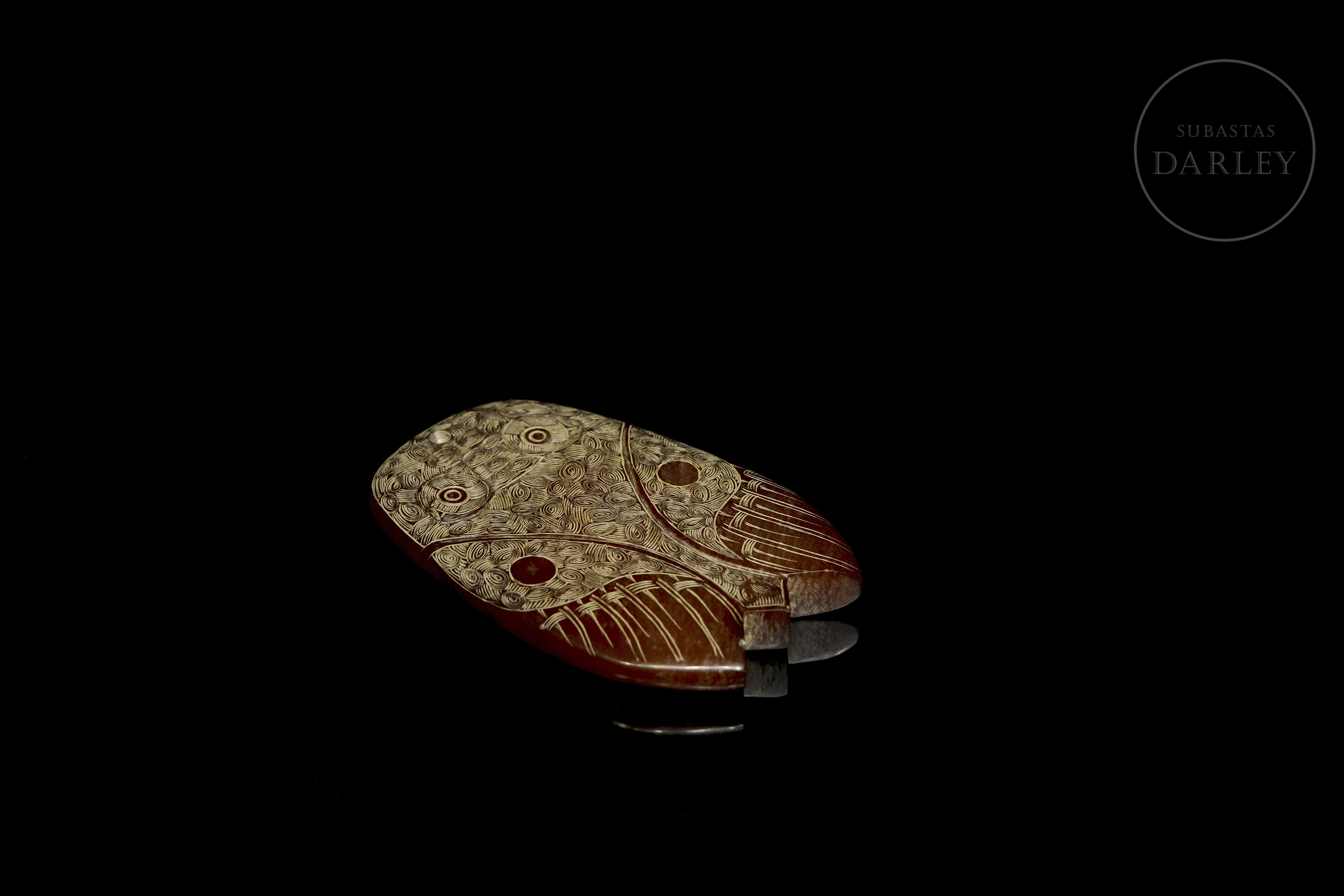 Amuleto o colgante de jade con la forma de una gran cigarra estilizada. Presenta una profunda alteración de tonos marrones y rojizos. La superficie está finamente grabada con un denso patrón de volutas en todo el cuerpo, que definen dos grandes ojos circulares. La parte de las alas está decorada con líneas paralelas incisas. Presenta una pequeña perforación superior para ser suspendido. Cultura Liangzhu (c. 3300–2200 a.C.)