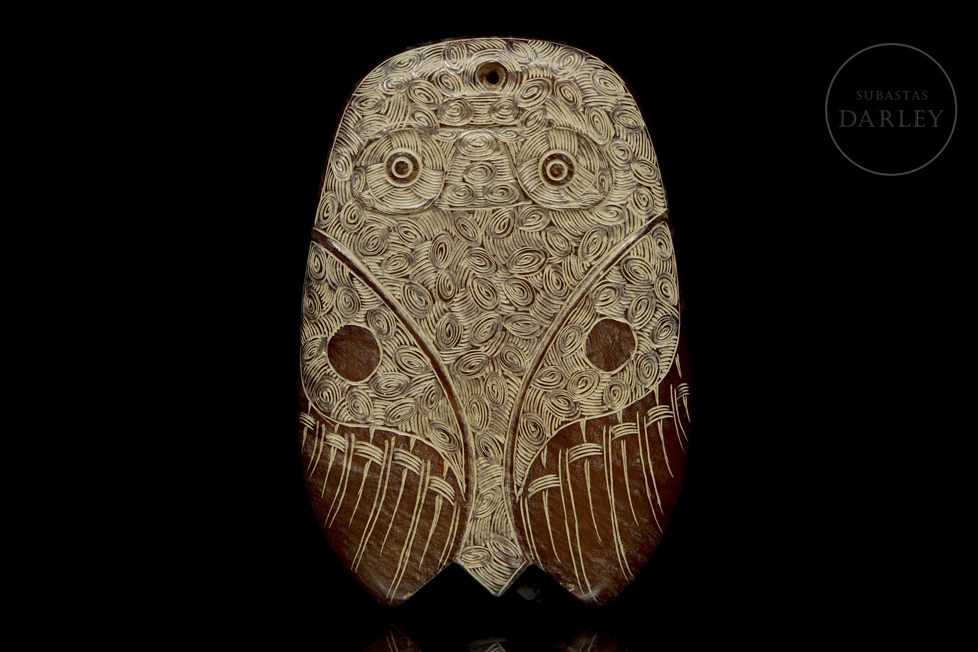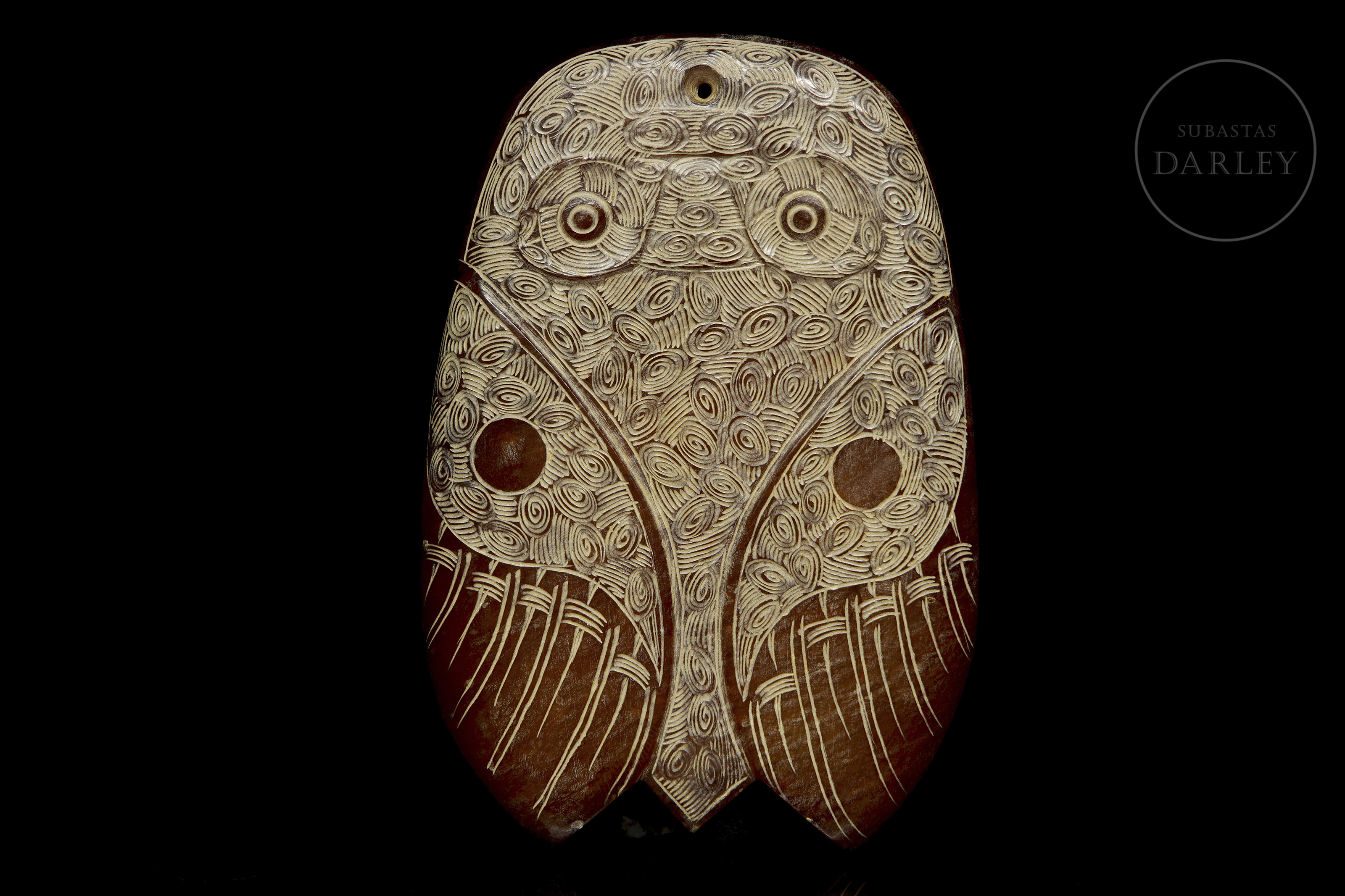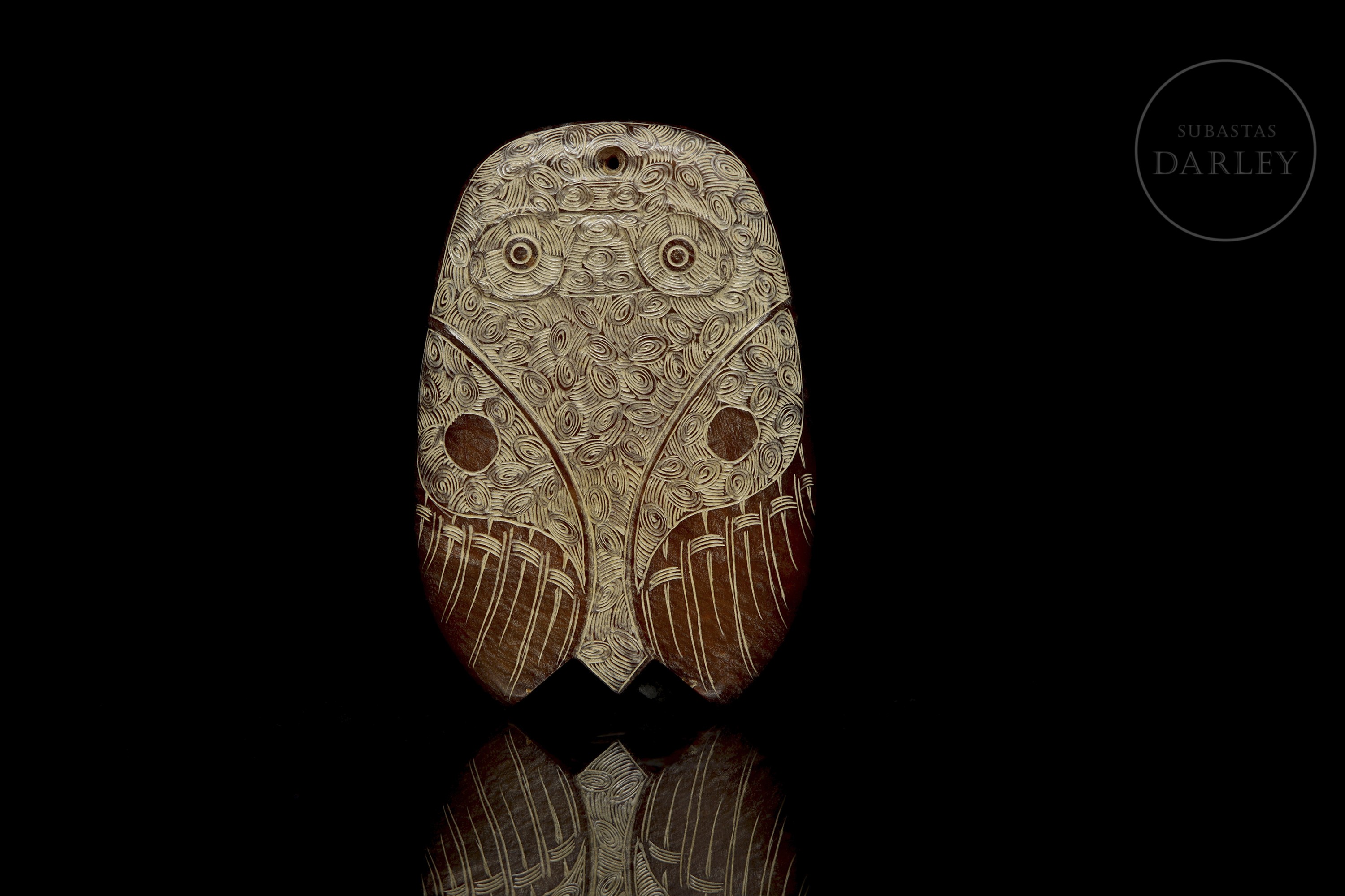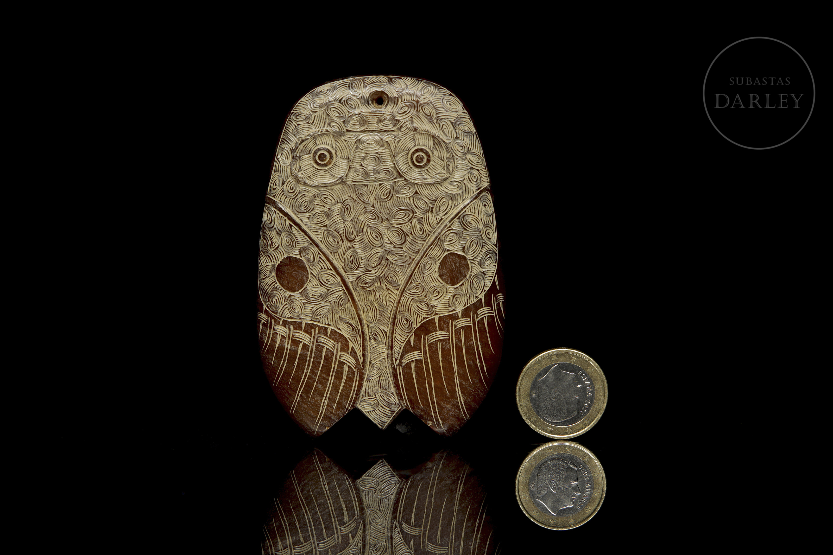Amuleto o colgante de jade con la forma de una gran cigarra estilizada. Presenta una profunda alteración de tonos marrones y rojizos. La superficie está finamente grabada con un denso patrón de volutas en todo el cuerpo, que definen dos grandes ojos circulares. La parte de las alas está decorada con líneas paralelas incisas. Presenta una pequeña perforación superior para ser suspendido. Cultura Liangzhu (c. 3300–2200 a.C.)