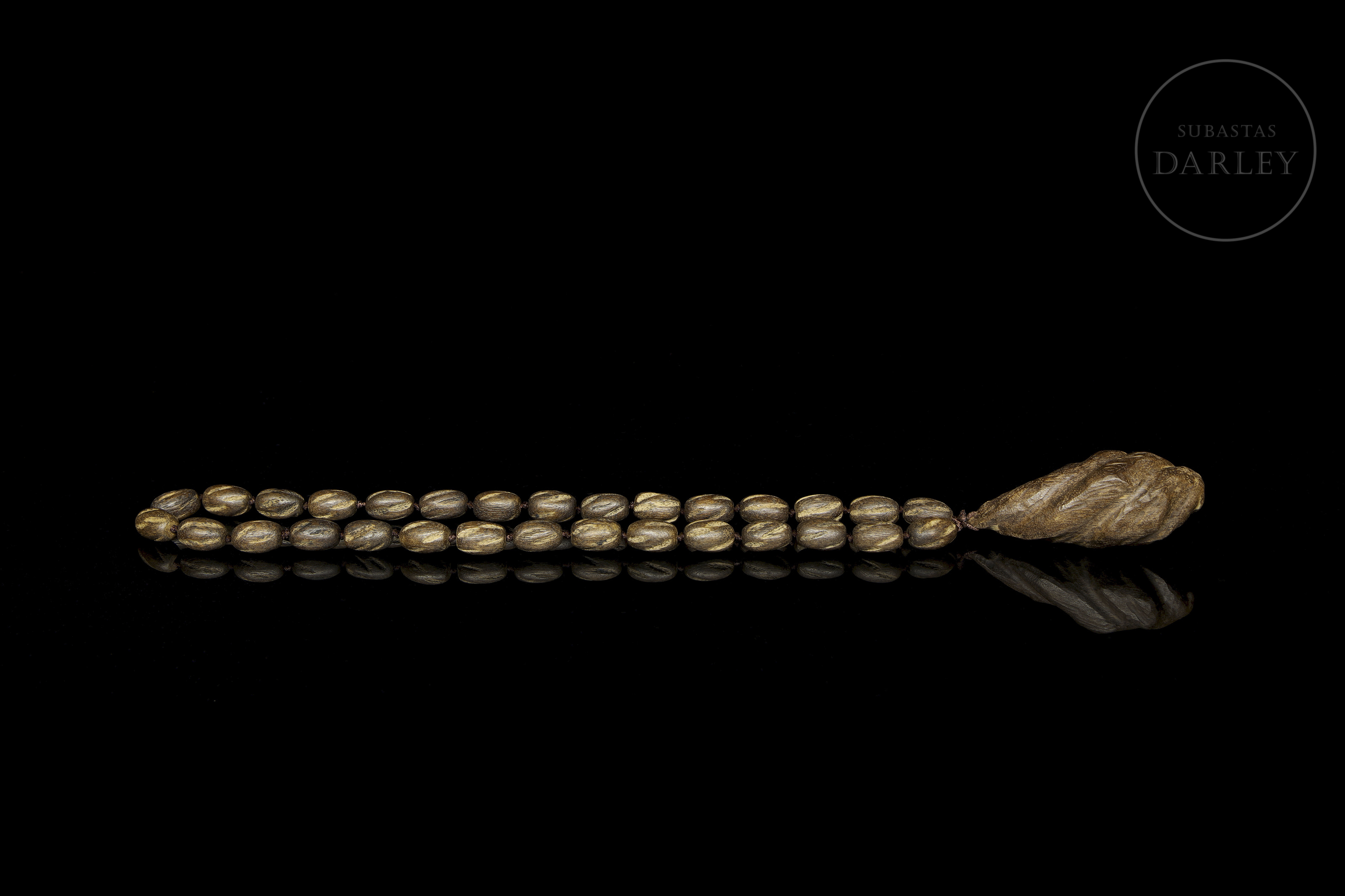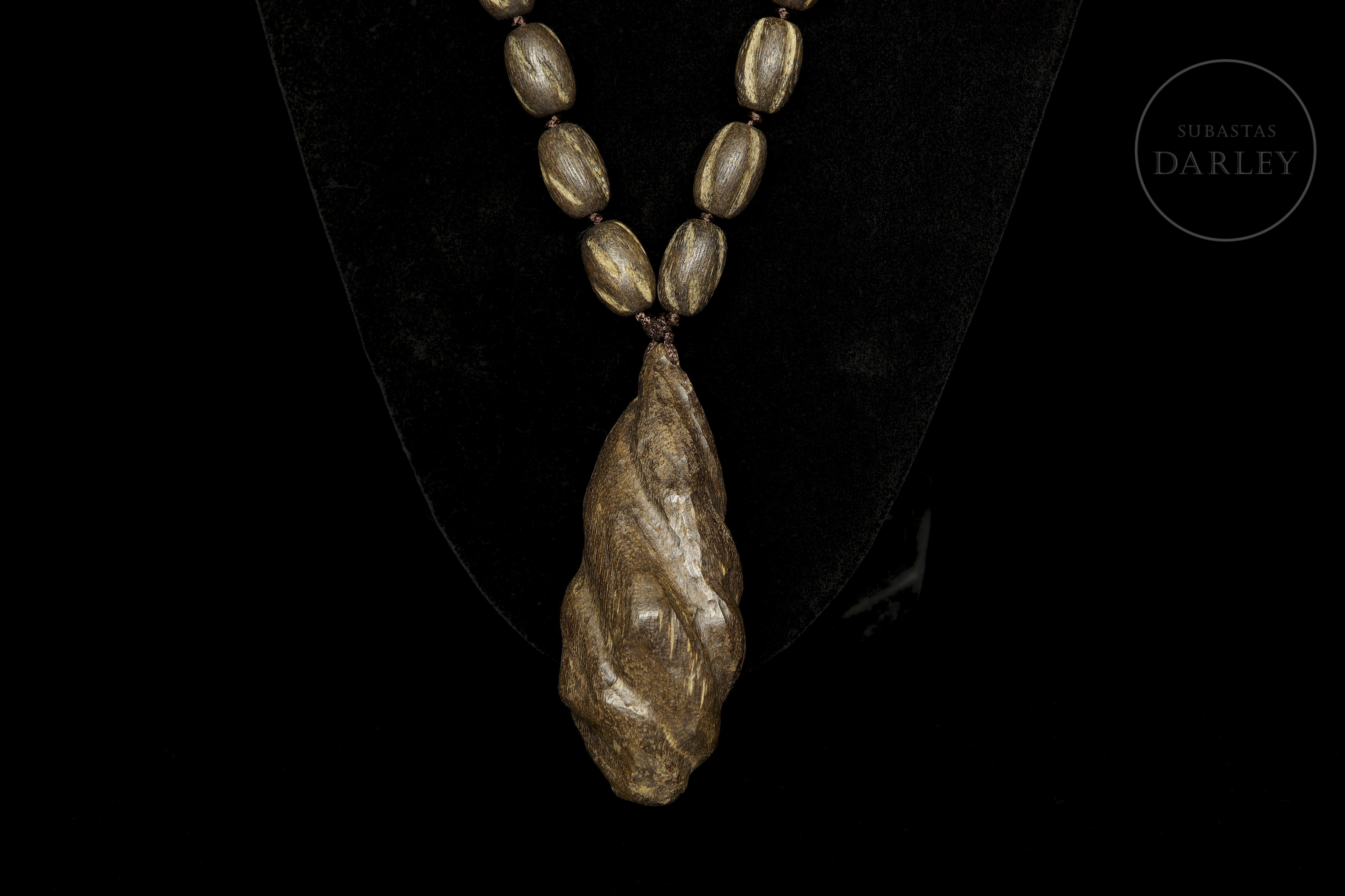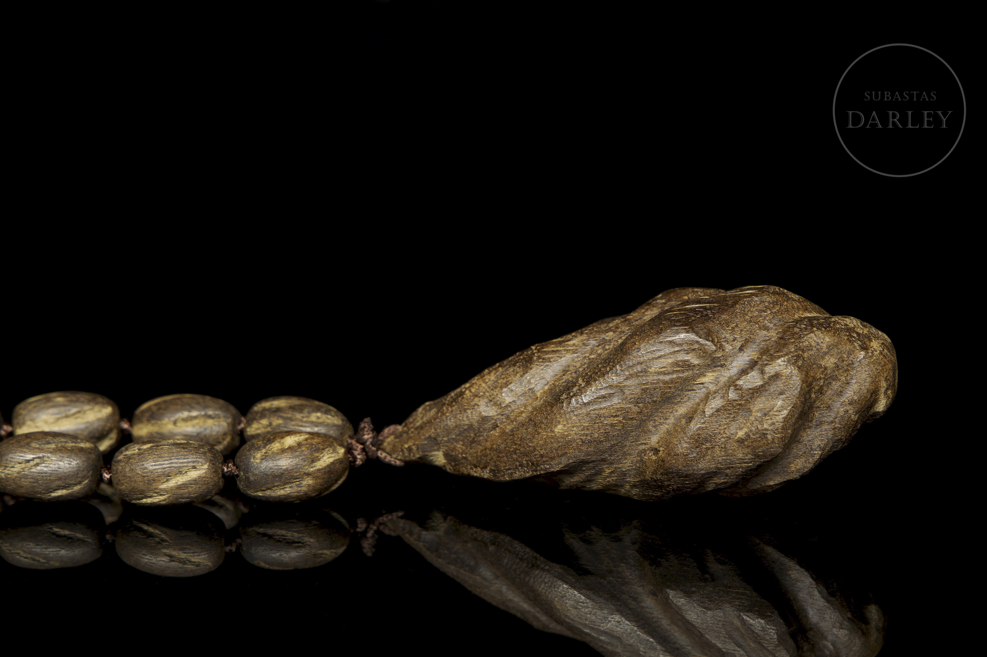 Colgante compuesto por 30 cuentas globulares de madera tallada de tono oscuro. El colgante se remata con una gran cuenta central, de formato alargado, que está finamente tallada con volúmenes helicoidales irregulares, similar a una flor cerrada.