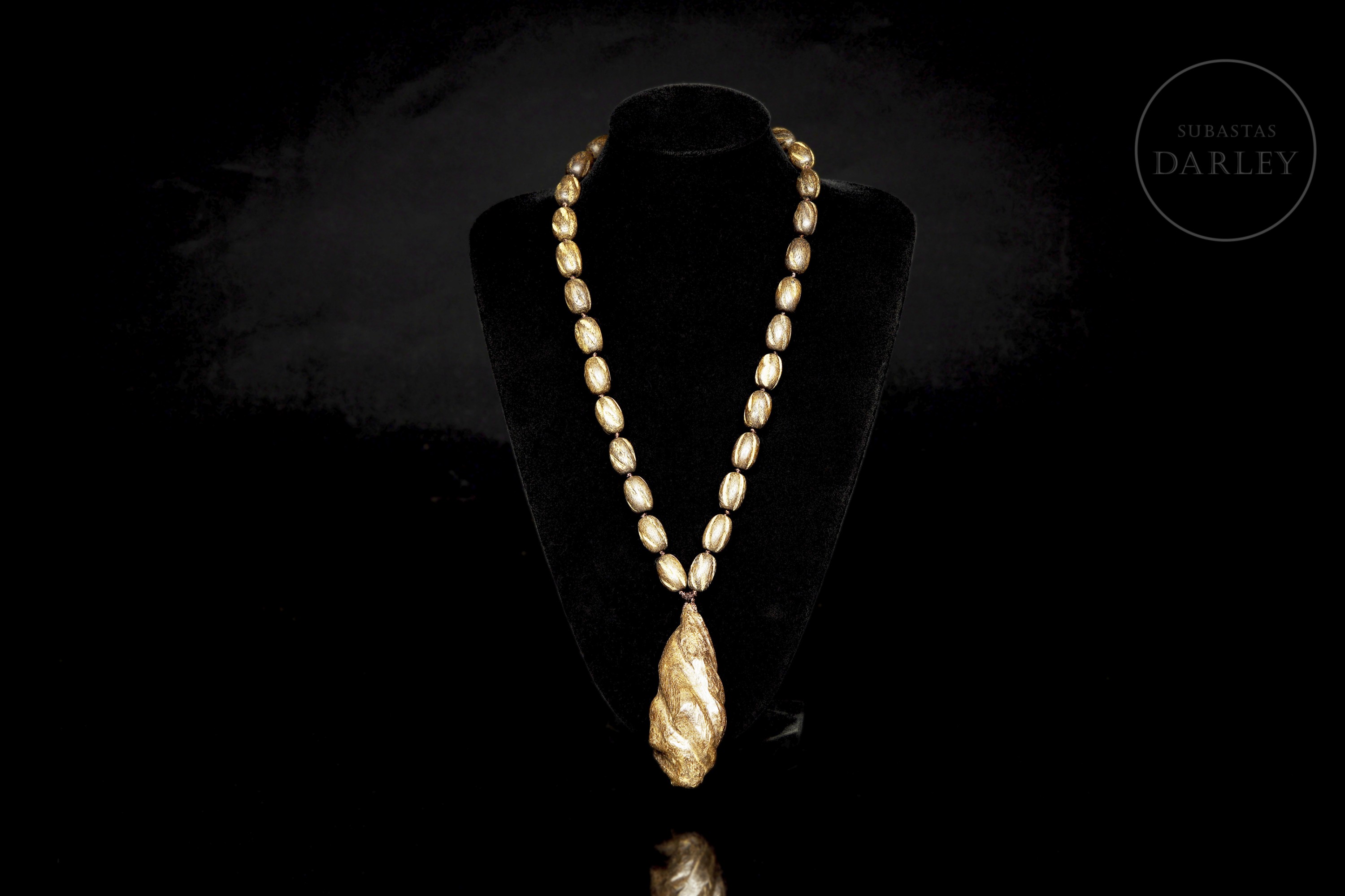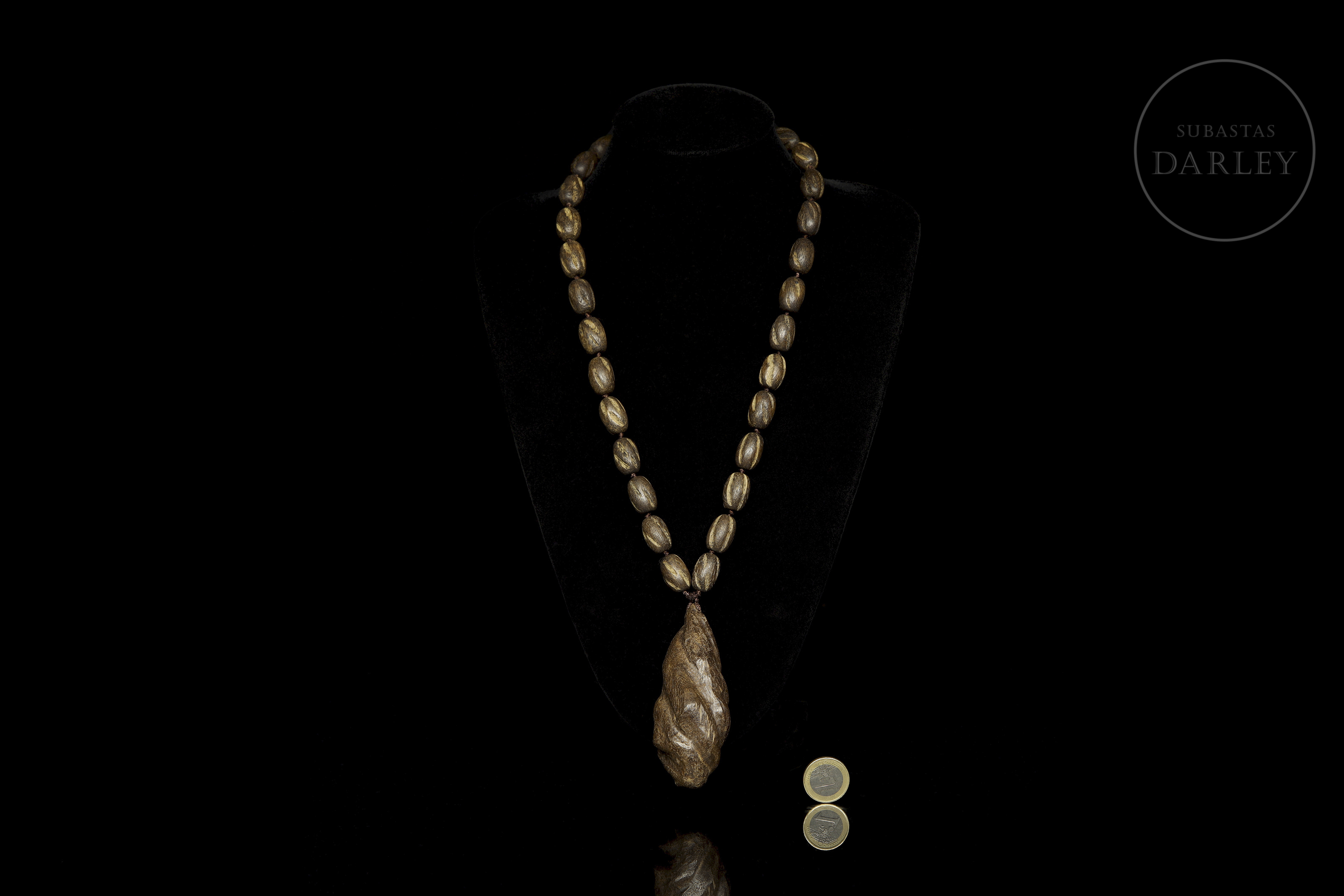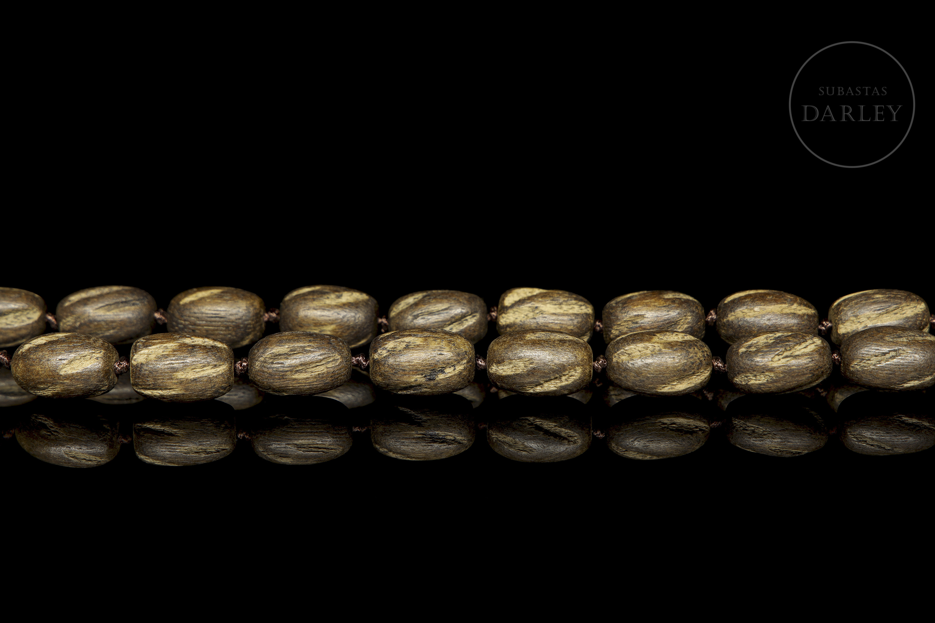 Colgante compuesto por 30 cuentas globulares de madera tallada de tono oscuro. El colgante se remata con una gran cuenta central, de formato alargado, que está finamente tallada con volúmenes helicoidales irregulares, similar a una flor cerrada.