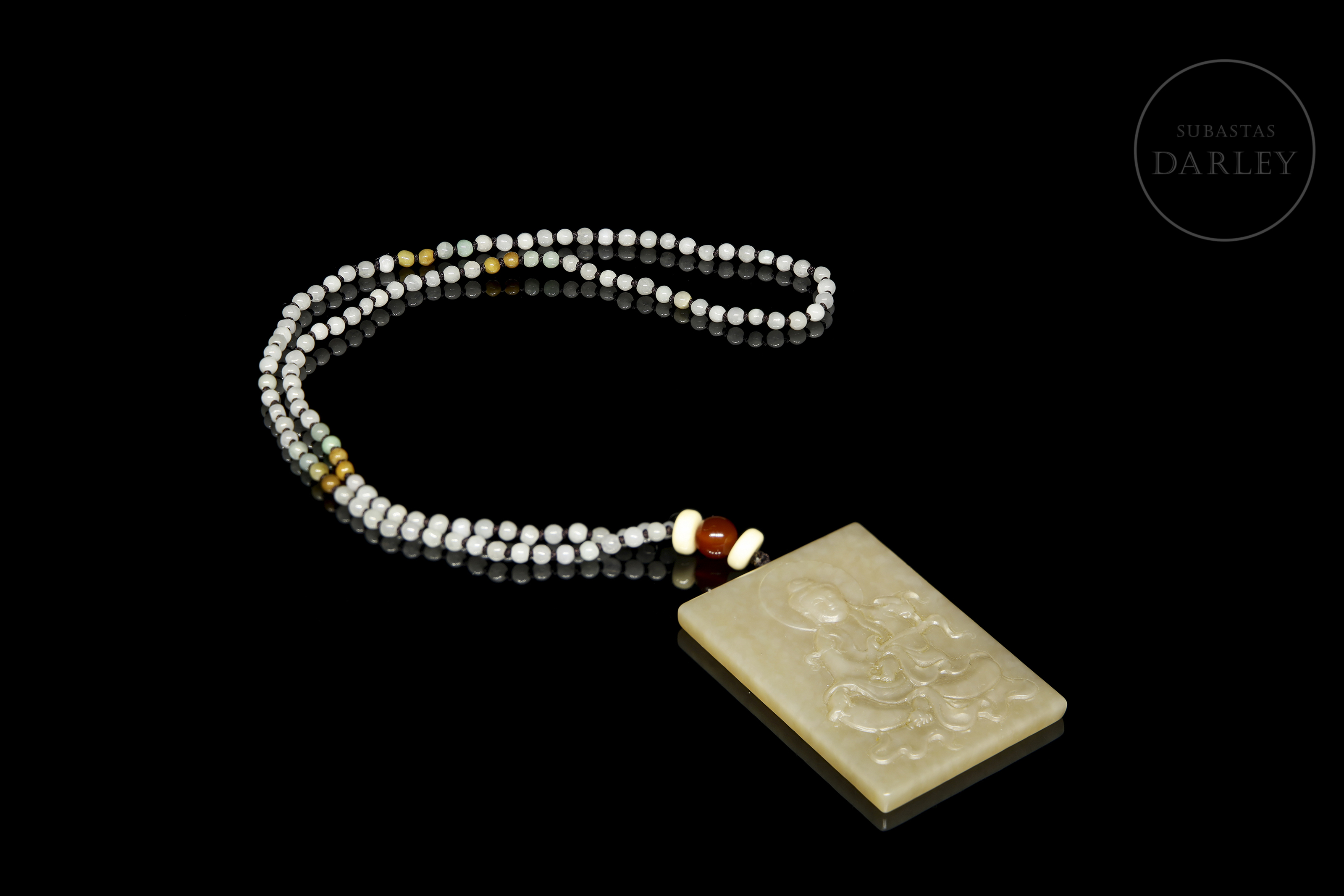 Collar conformado por pequeñas cuentas esféricas de piedra tallada y un colgante central de jade tallado, de color ocre, en forma rectangular, presidido por la imagen de Guanyin sentada en actitud serena, con el cuerpo cubierto por una fina túnica.