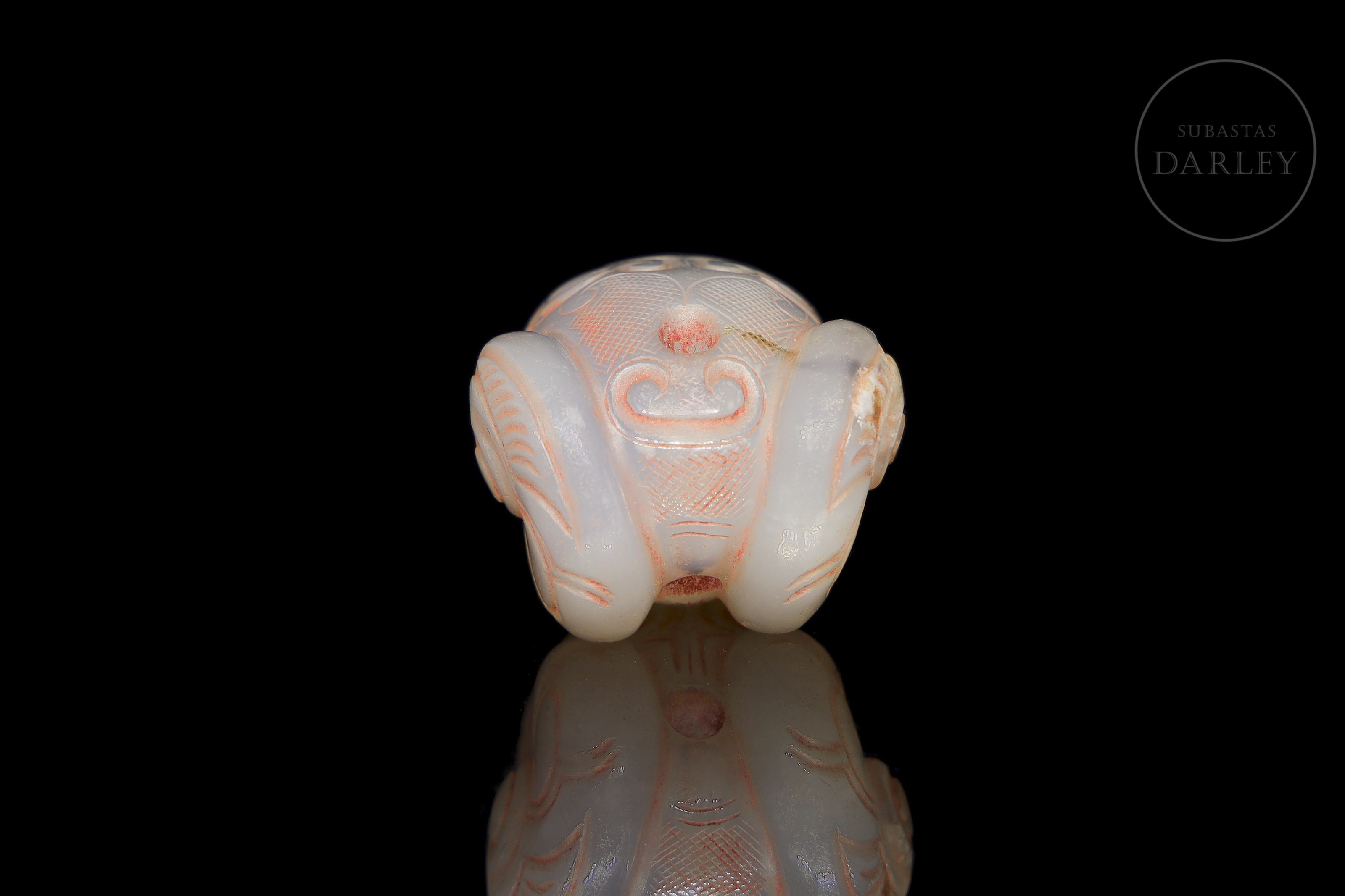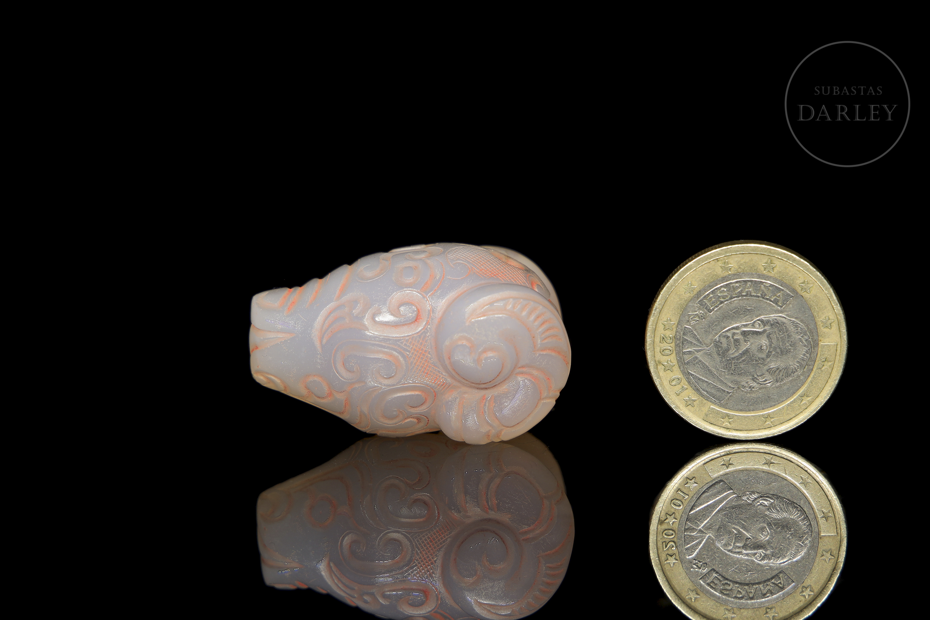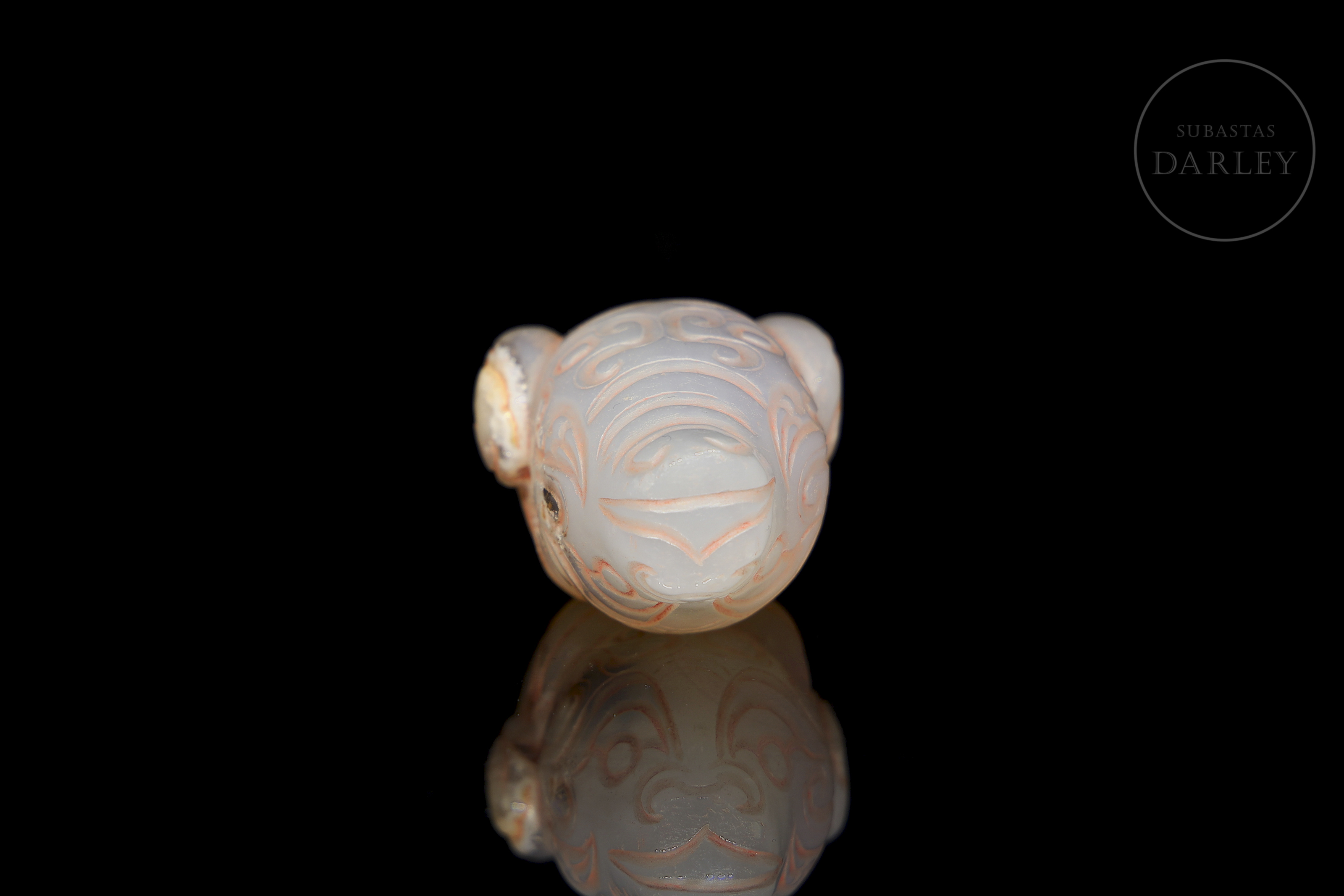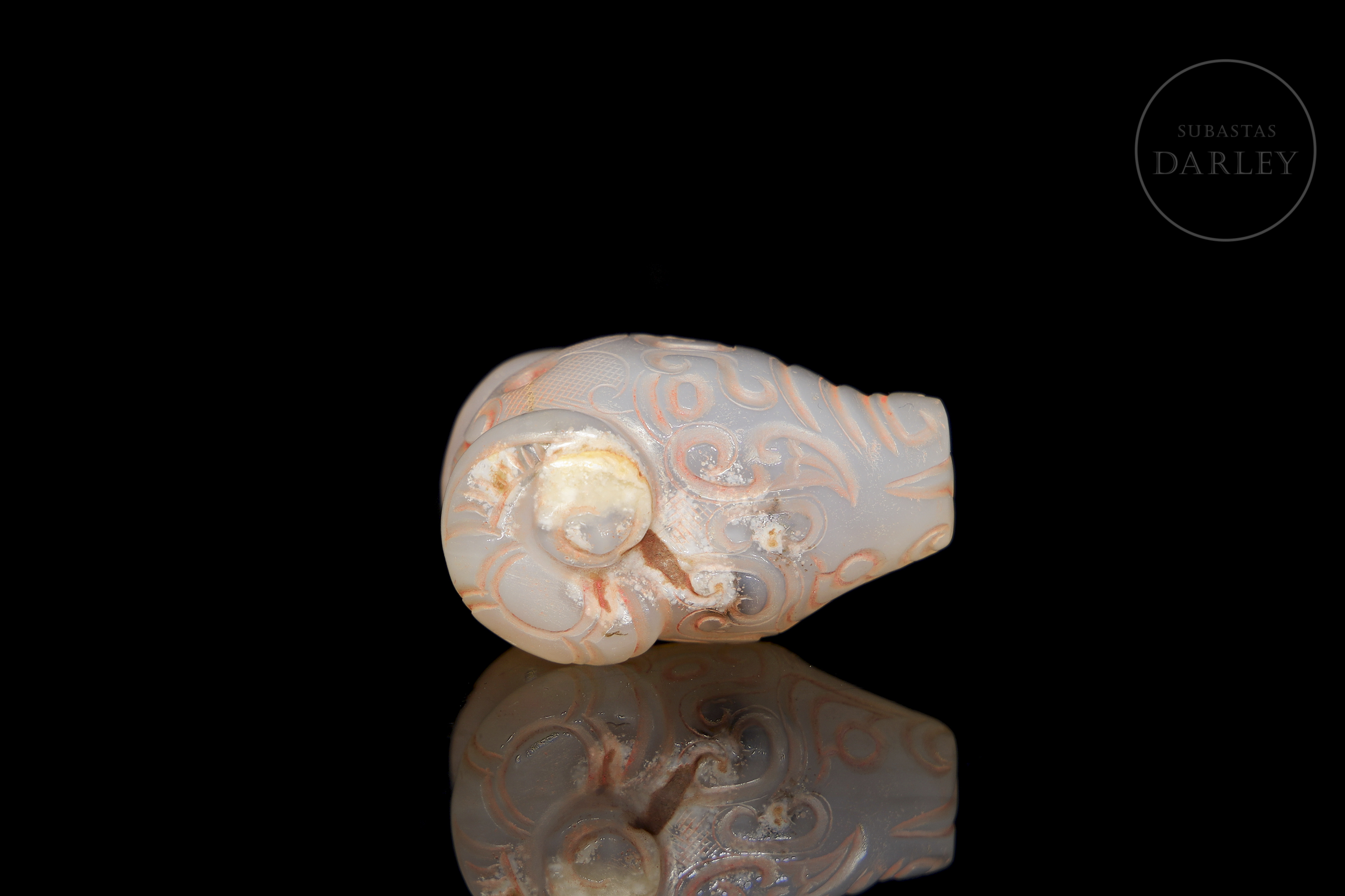 Realizado en ágata de una tonalidad blanca translúcida con sutiles vetas naturales. La pieza representa de forma estilizada la cabeza de un carnero, con cuernos grandes curvados. Destaca por su profusa ornamentación tallada en bajorrelieve con un patrón de volutas espirales y nubes, conservando restos de cinabrio. Dinastía Zhou del Este (770–256 a.C.) o posterior.