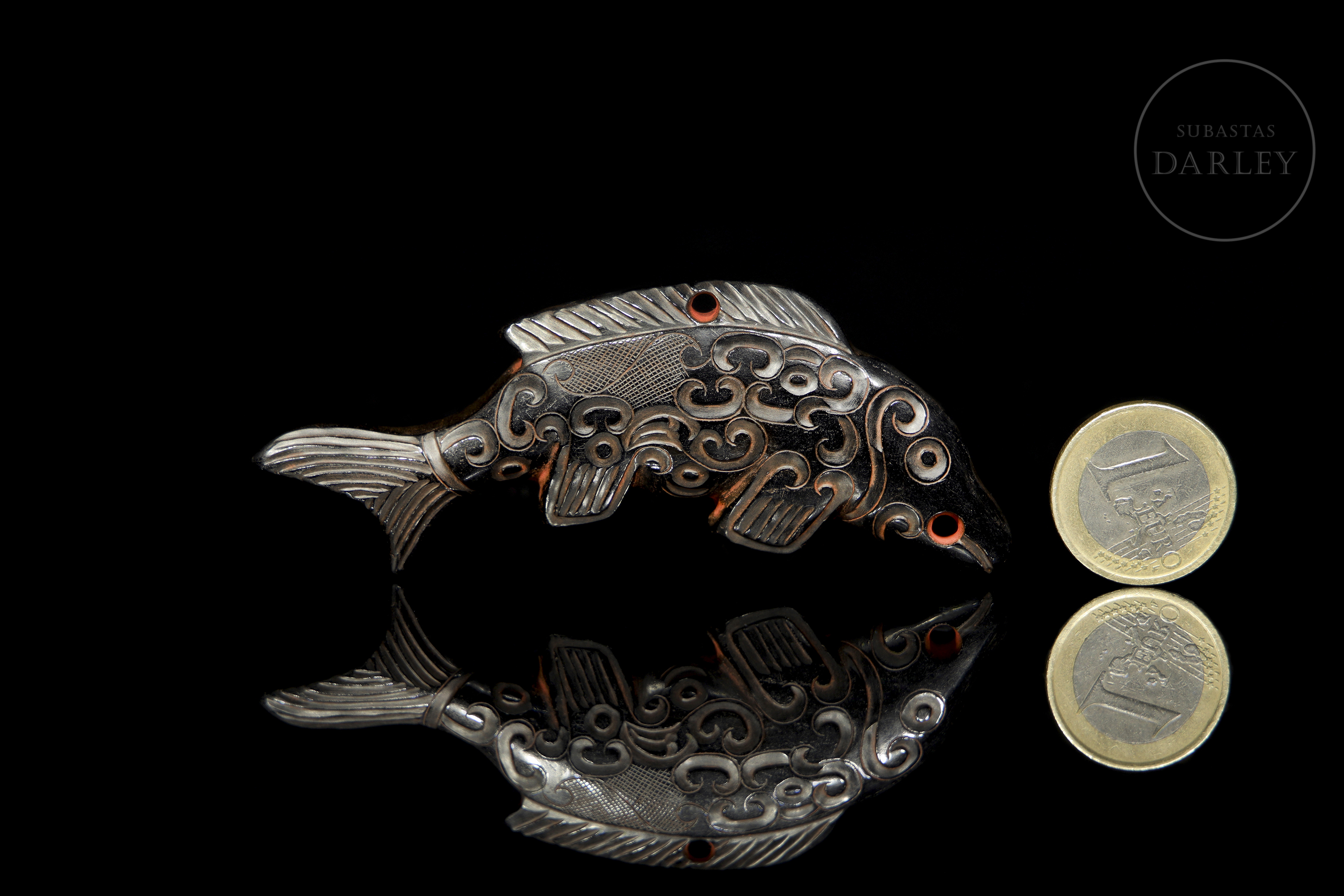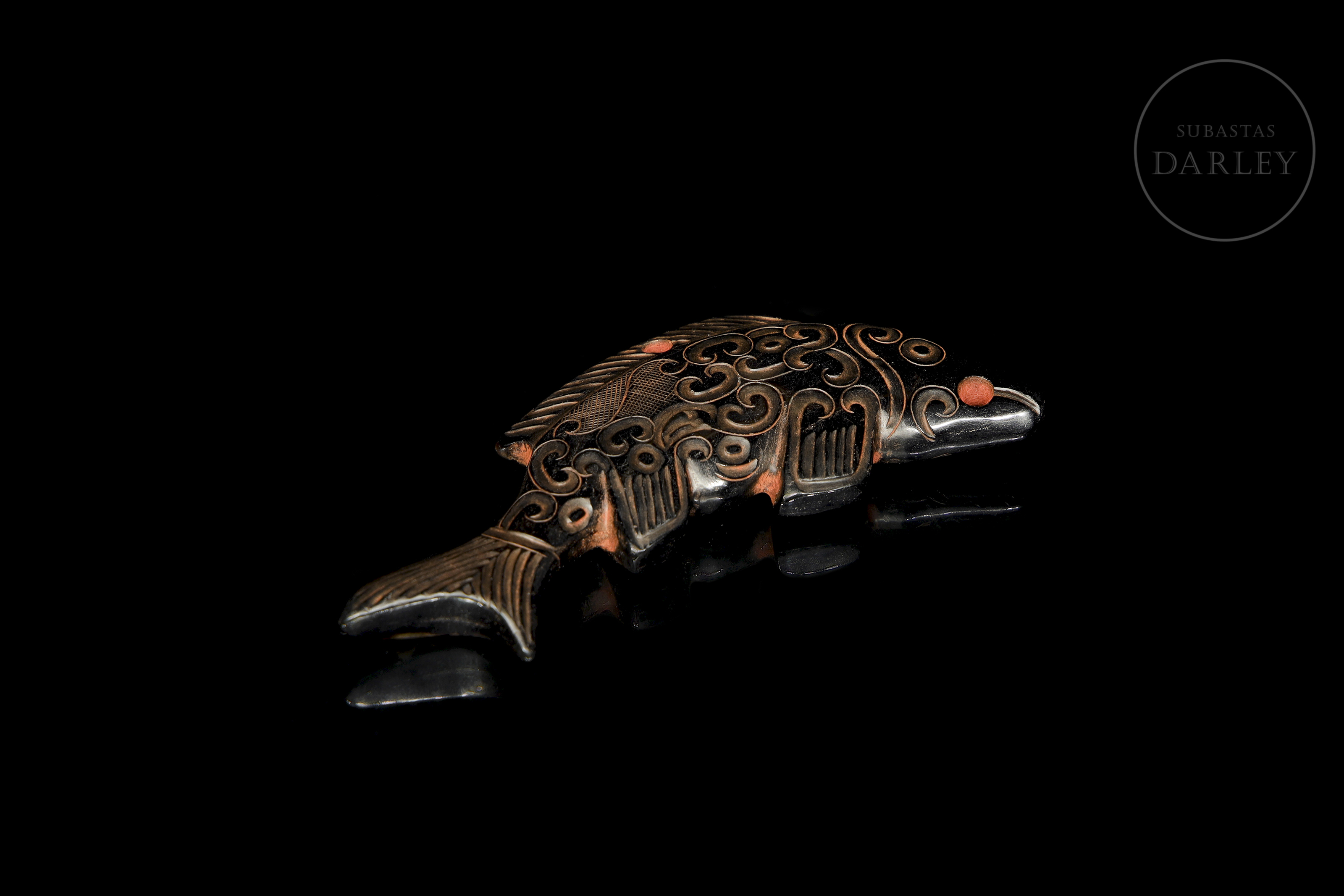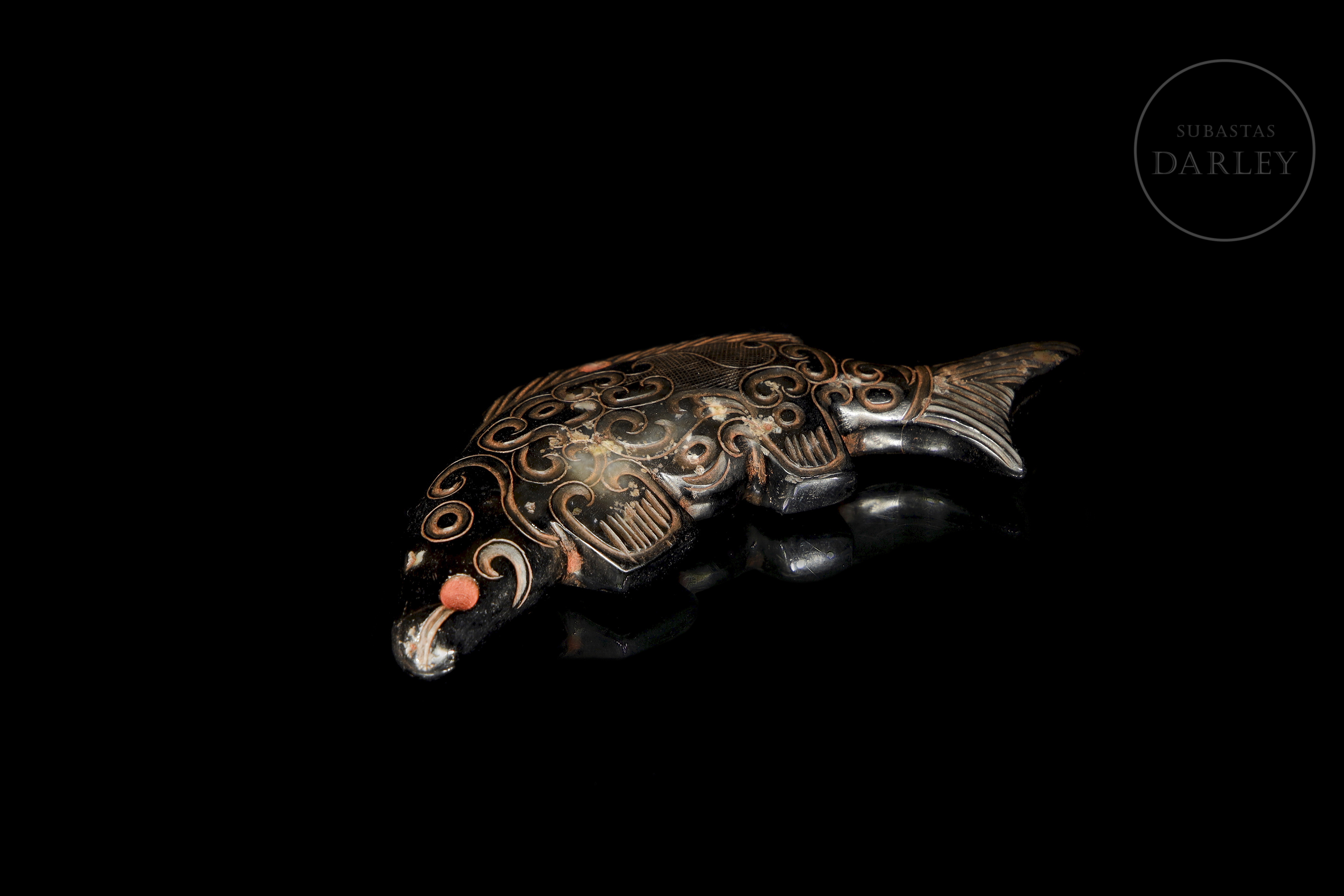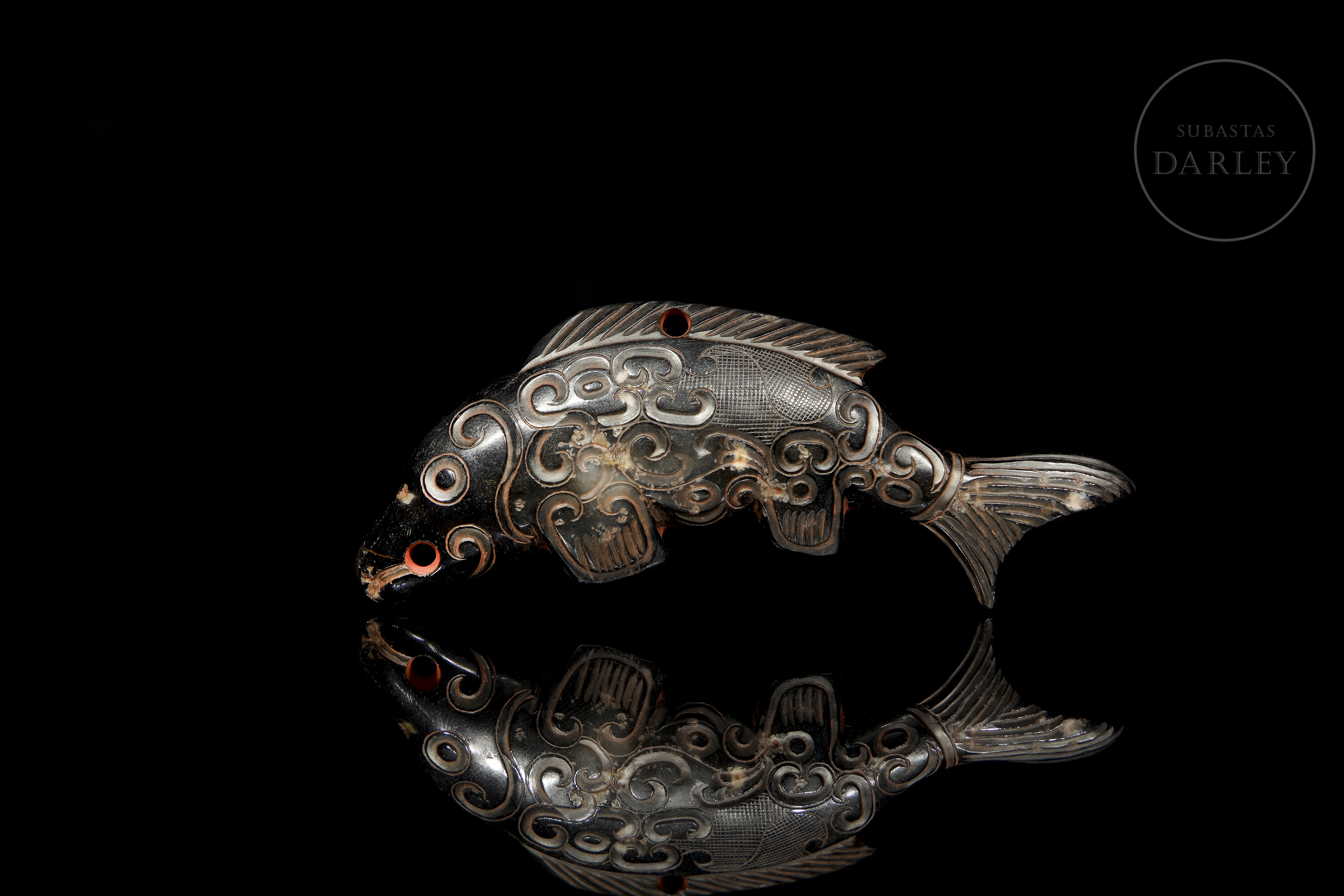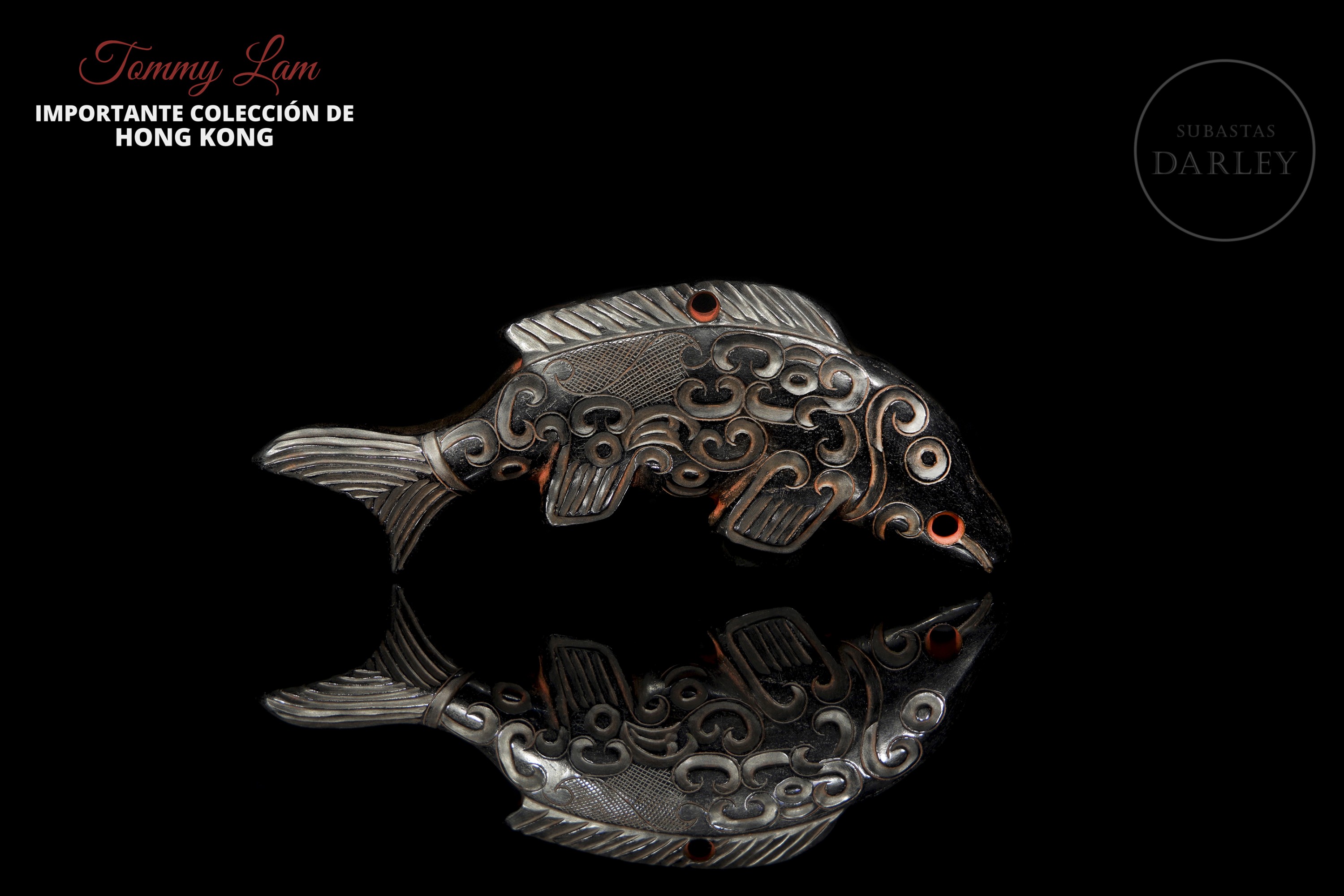 Ágata tallada, de una tonalidad negra profunda. Muestra pez de cuerpo dinámico y curvado en forma de arco. Se encuentra adornado por ambas caras por espirales arcaicas, roleos y finas incisiones que adornan las aletas. Muestra restos de lacre rojizo y pátina natural por envejecimiento. Dinastía Zhou del Este (770–256 a.C.) o posterior.