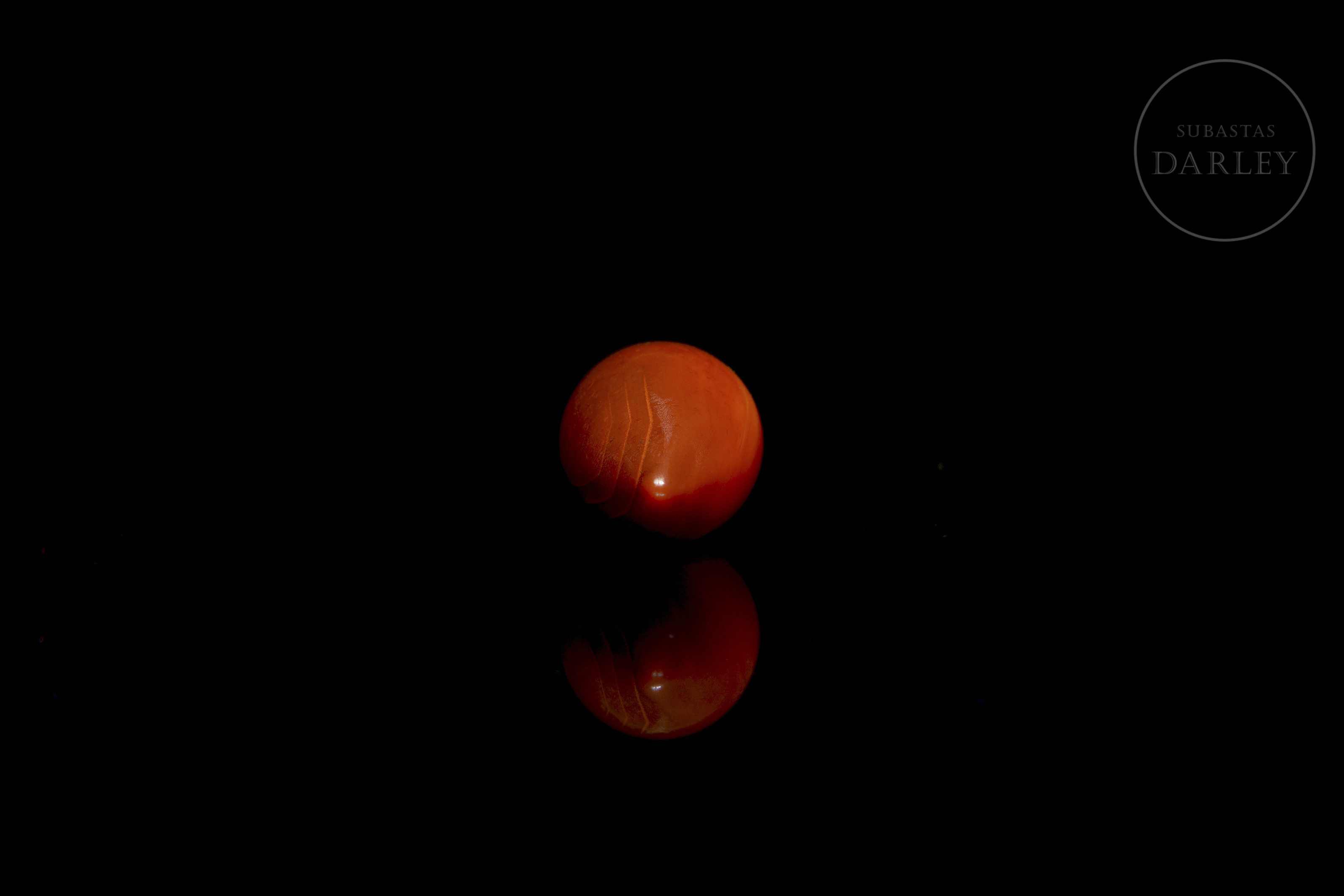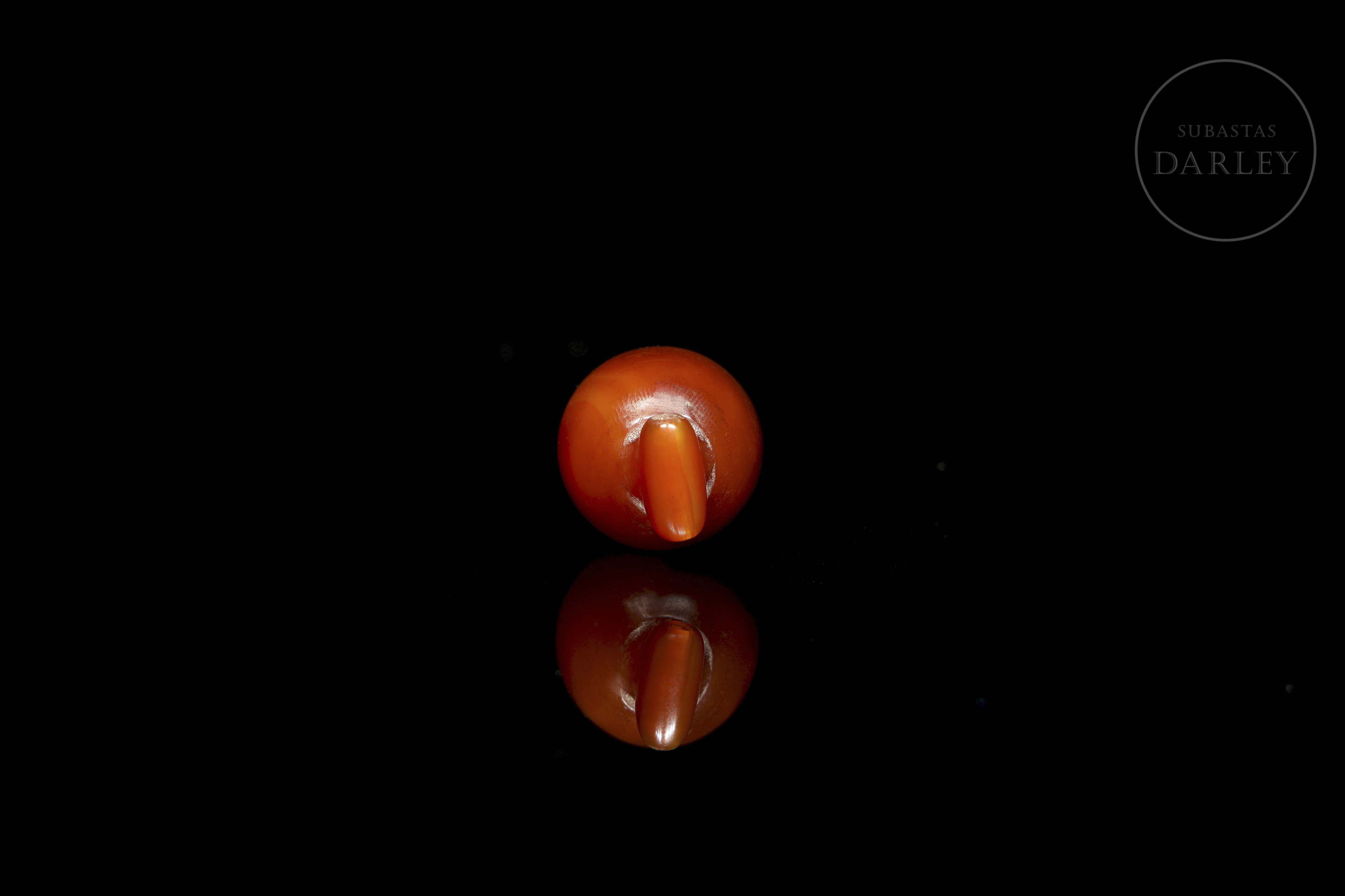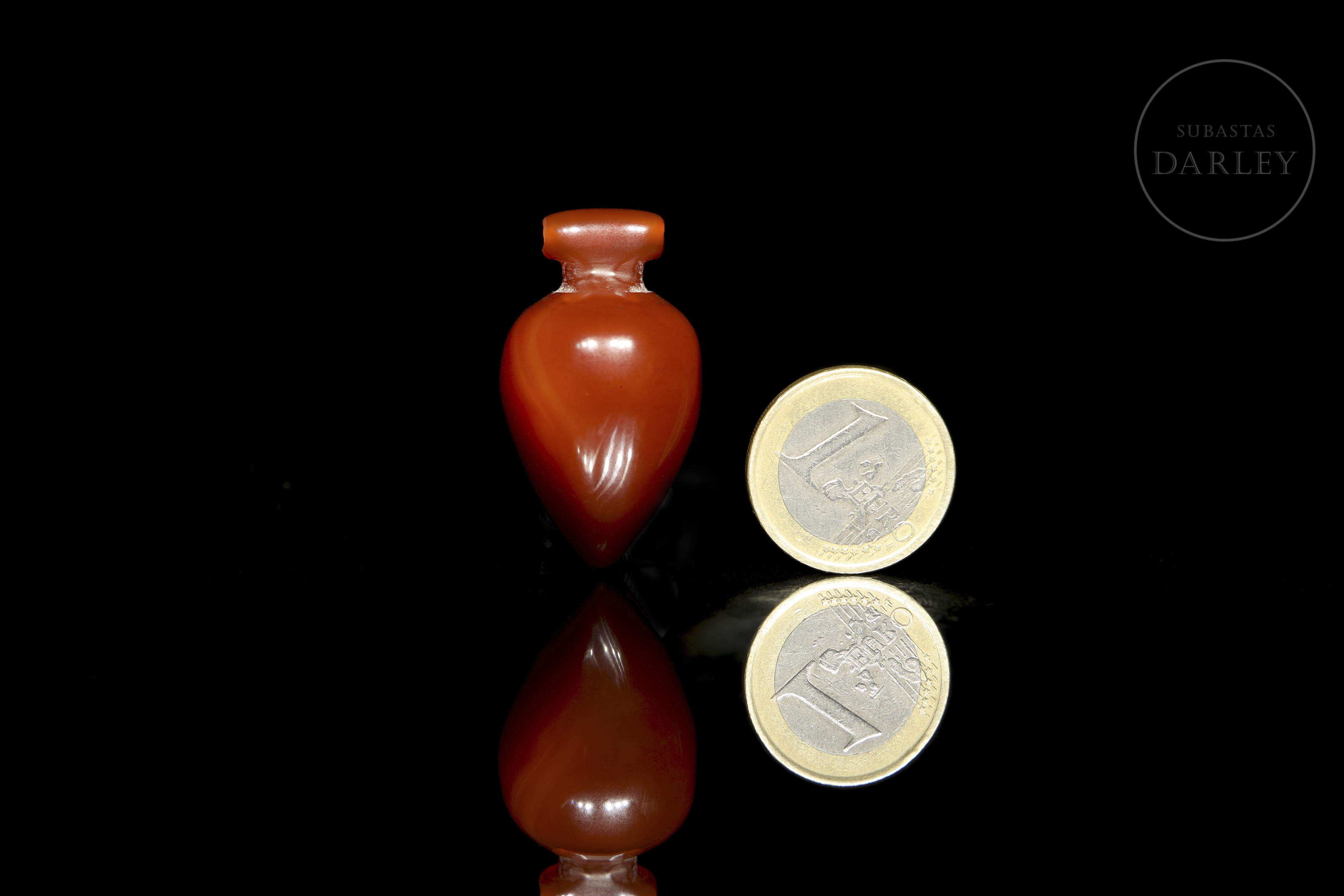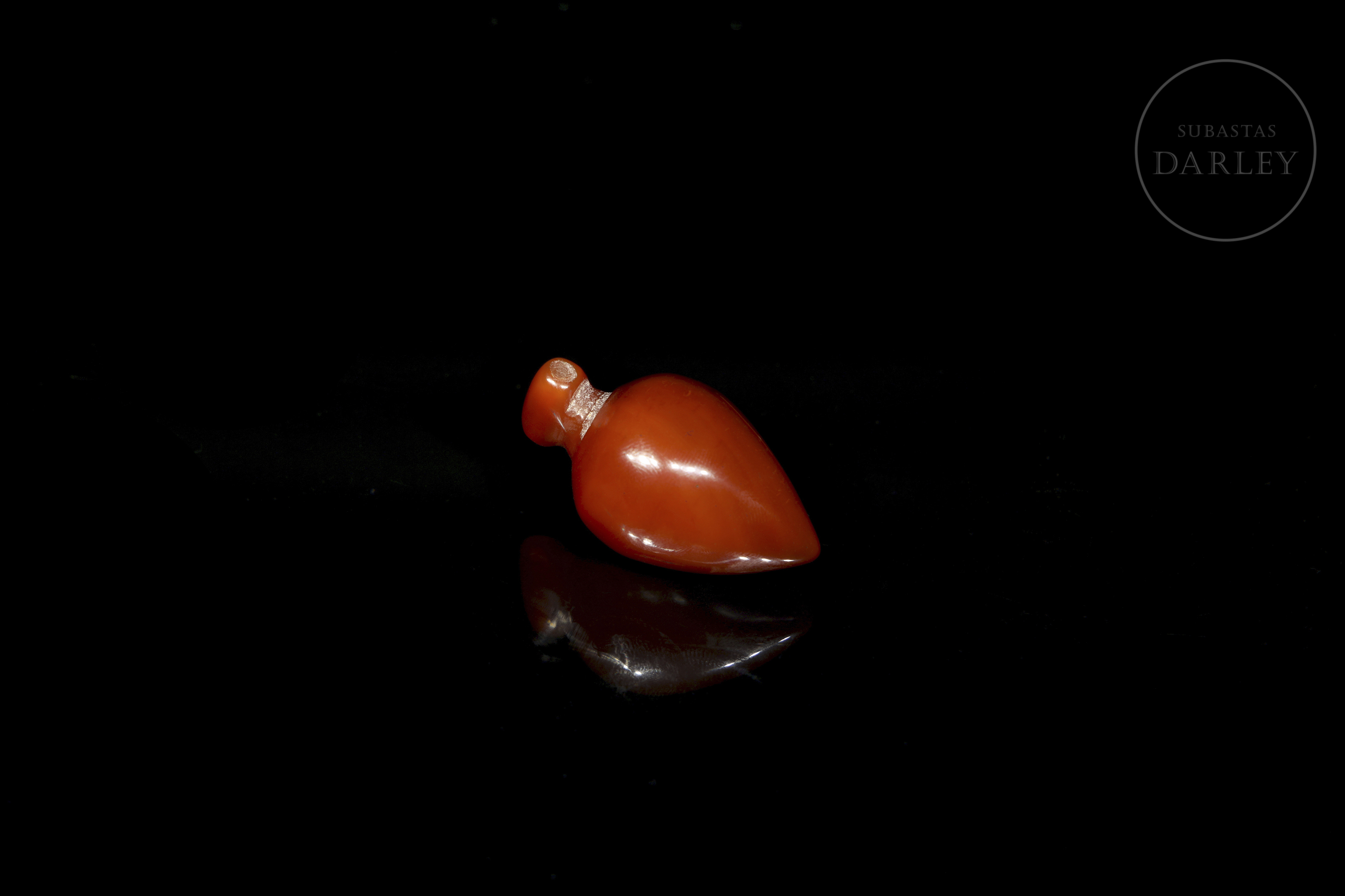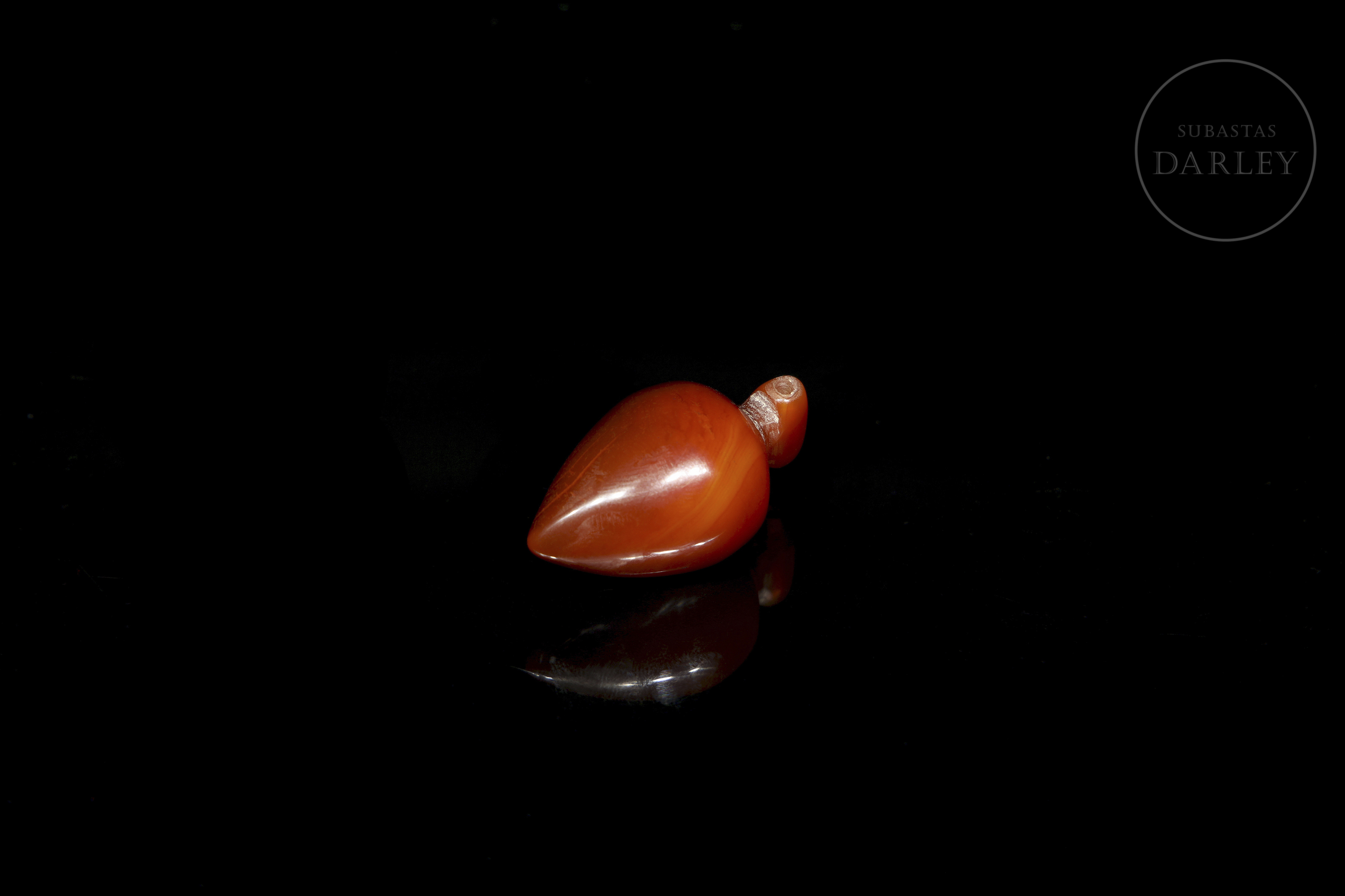 Colgante tallado y pulido de ágata roja, con forma de péndulo o gota estilizada. La pieza es sólida y presenta un cuerpo principal cónico, de bordes redondeados que termina en punta, con una sección superior rematada por un pequeño cuello y pomo tubular perforado para su uso como colgante. De intenso color rojo. Dinastía Liao (907–1125 d.C.).