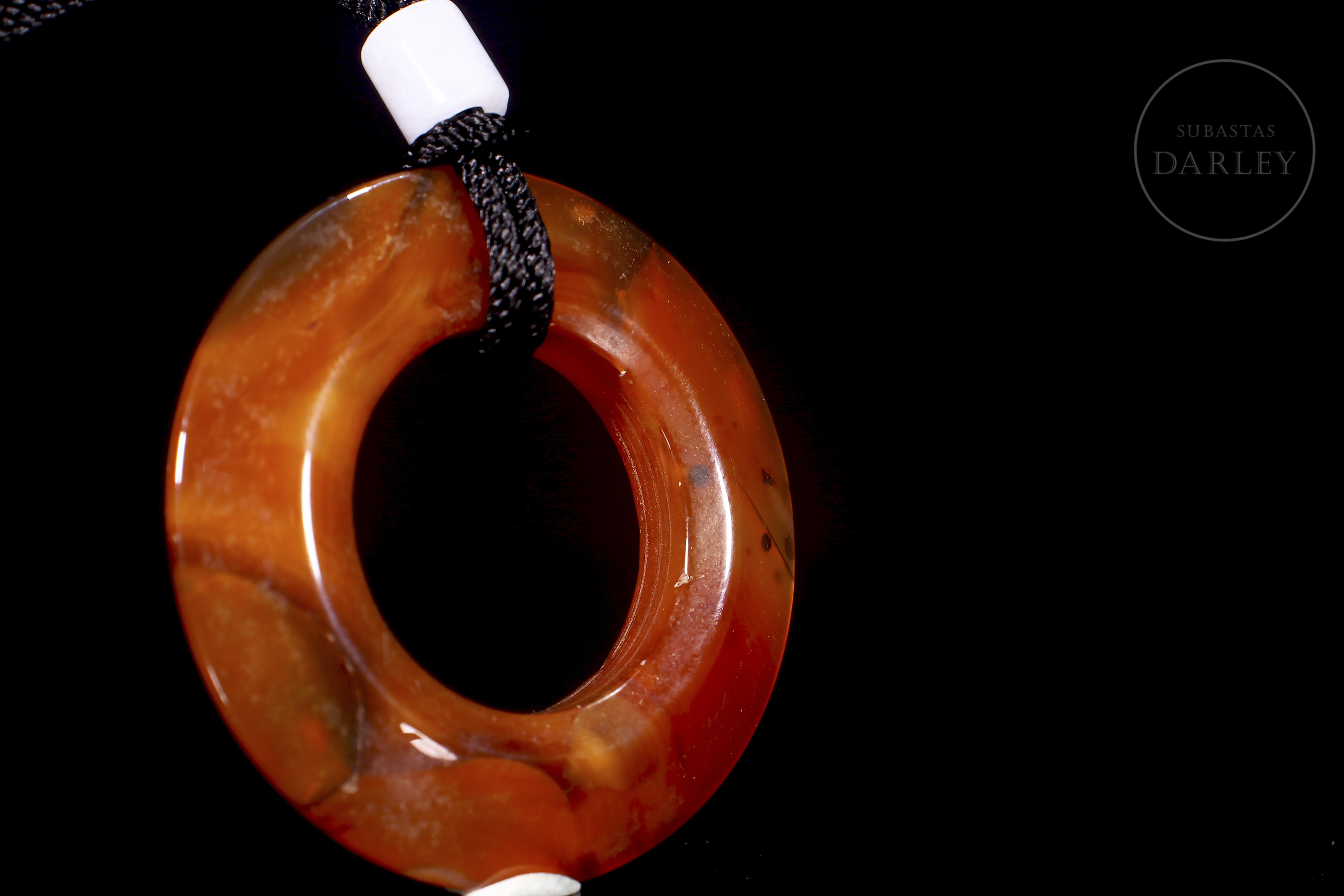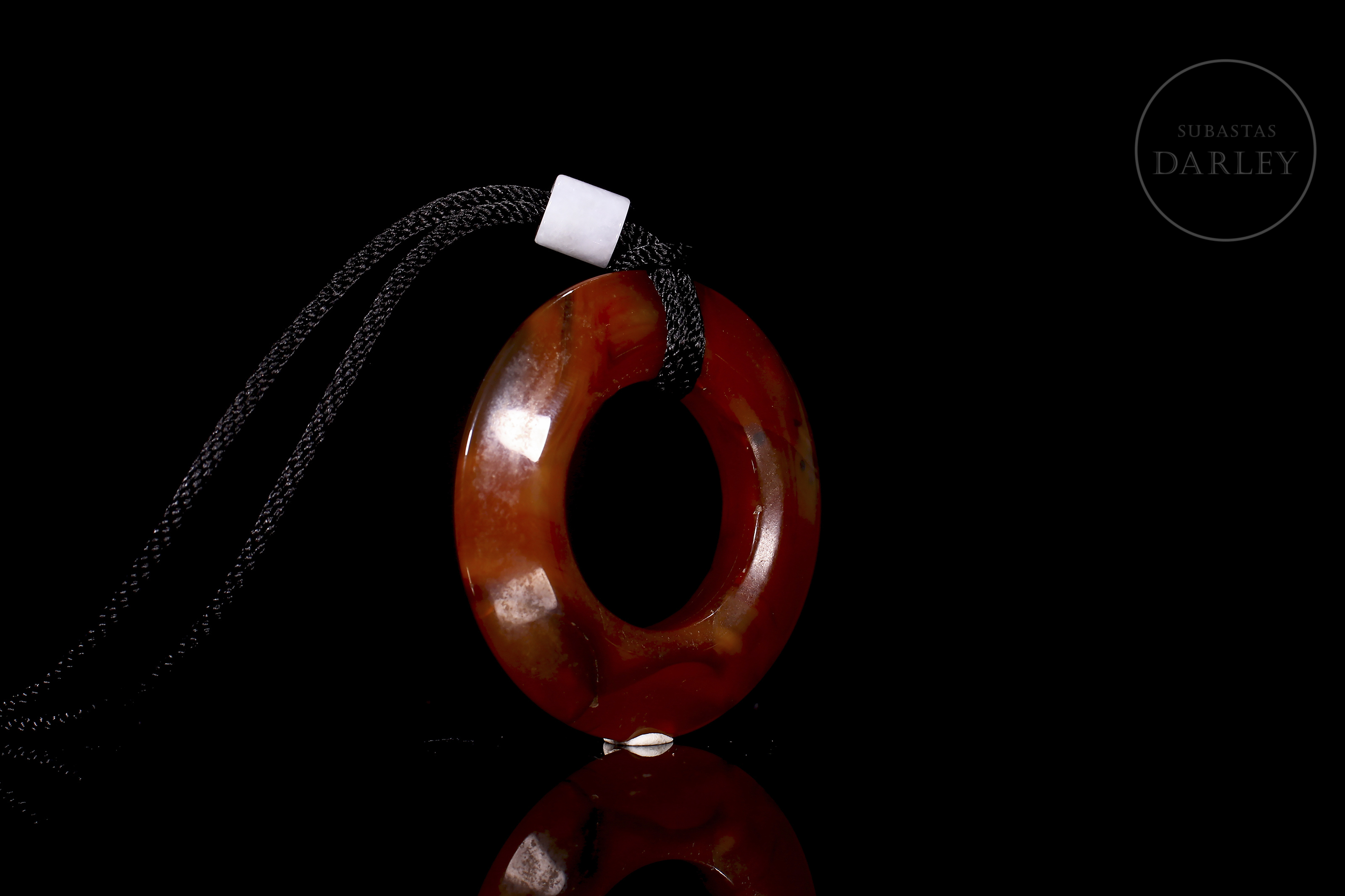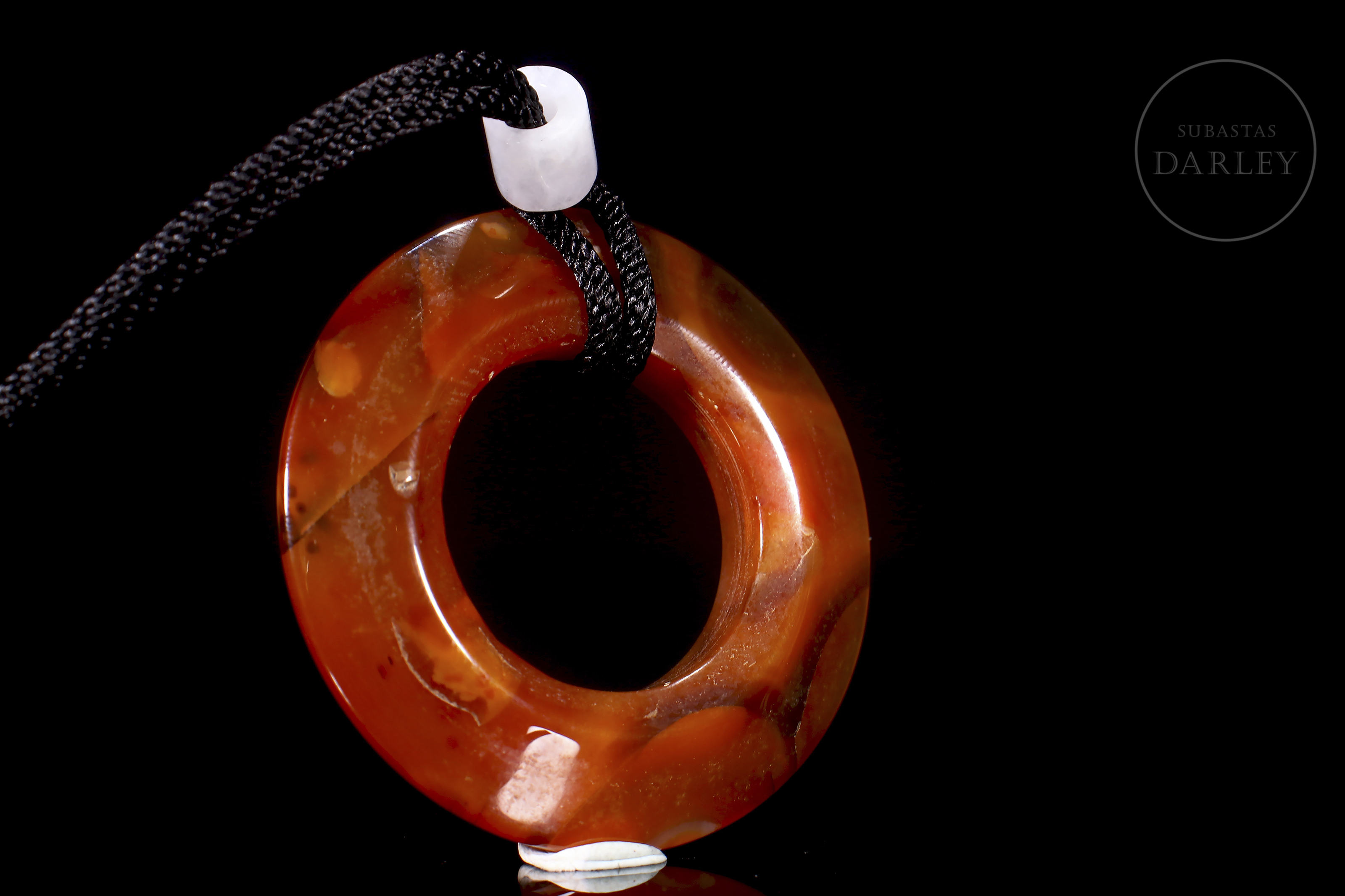 Colgante tallado de ágata de forma de disco con un orificio central, de perfil biselado y acabado traslúcido y pulido. El ágata es de color rojo intenso a naranja profundo, con zonas de color más oscuro, creando un efecto jaspeado. Se sujeta mediante un cordón negro trenzado con una cuenta de jade blanca.