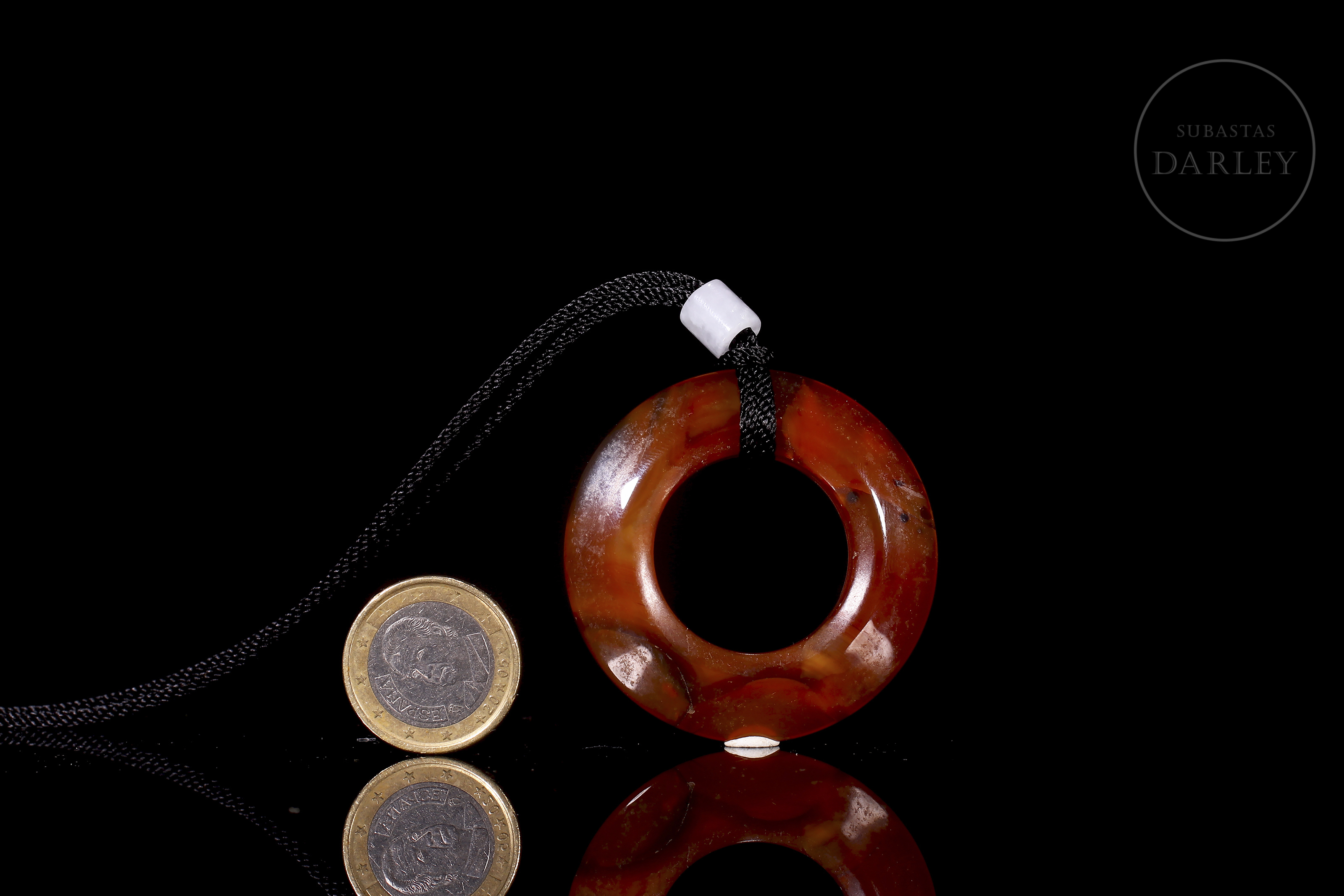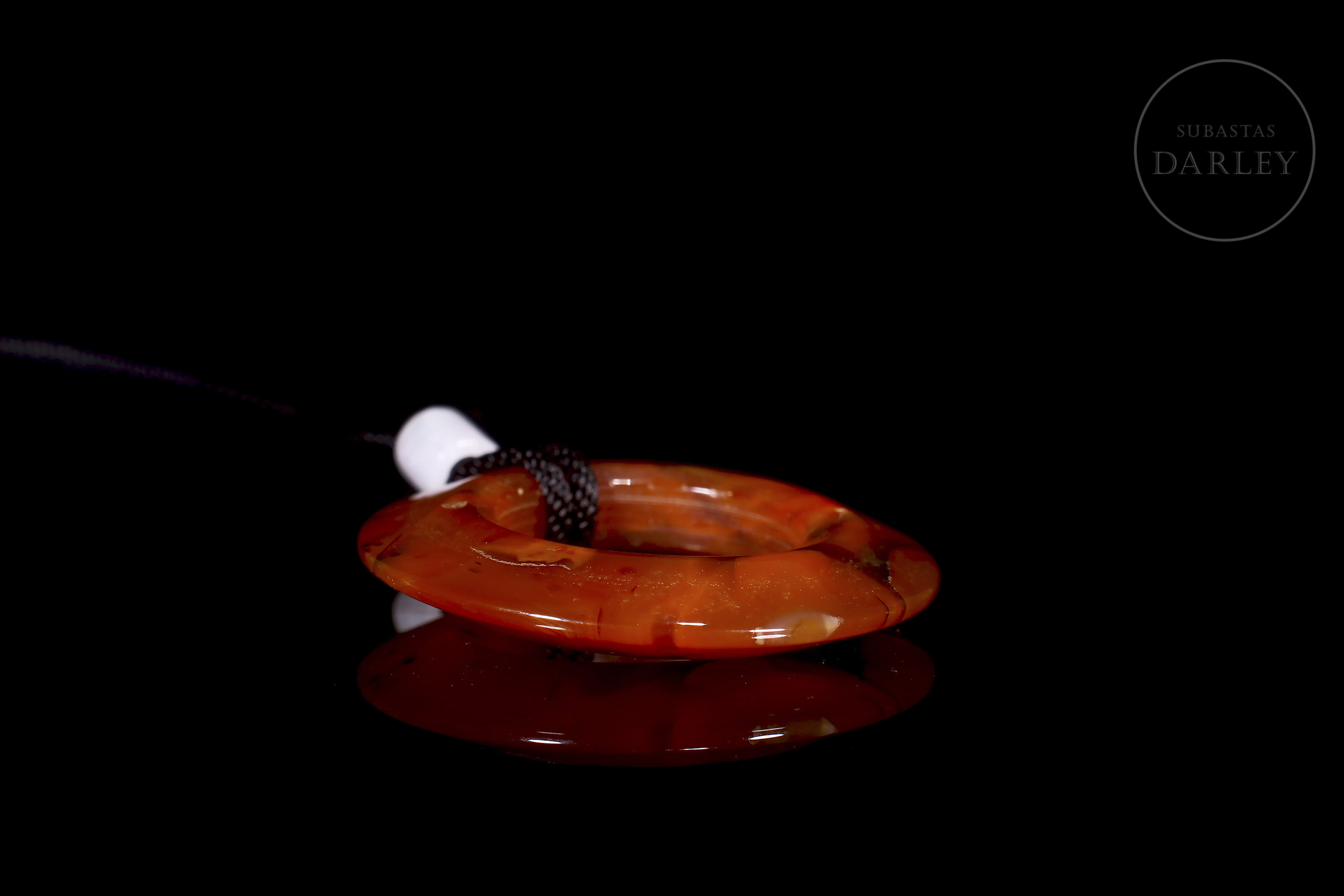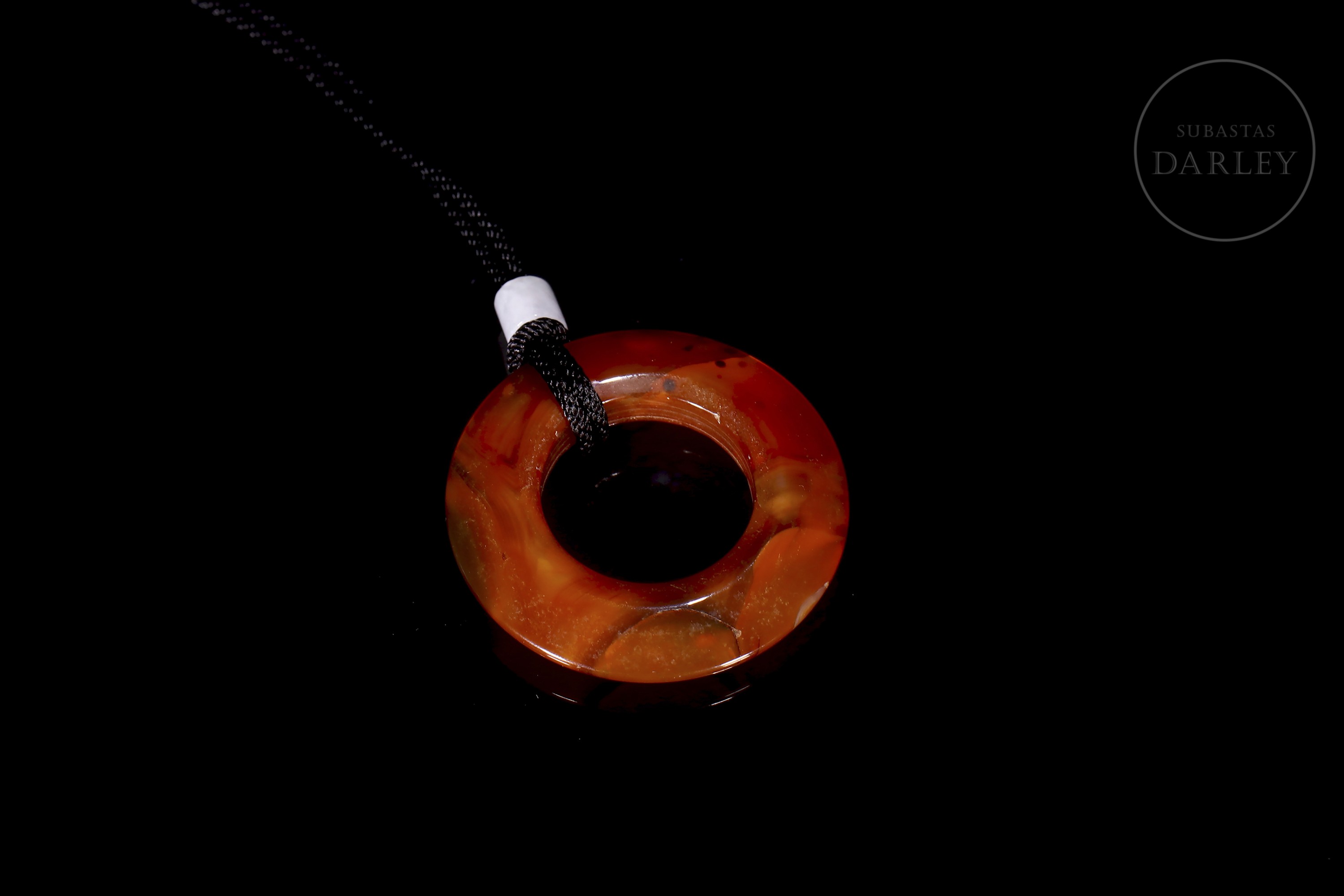 Colgante tallado de ágata de forma de disco con un orificio central, de perfil biselado y acabado traslúcido y pulido. El ágata es de color rojo intenso a naranja profundo, con zonas de color más oscuro, creando un efecto jaspeado. Se sujeta mediante un cordón negro trenzado con una cuenta de jade blanca.